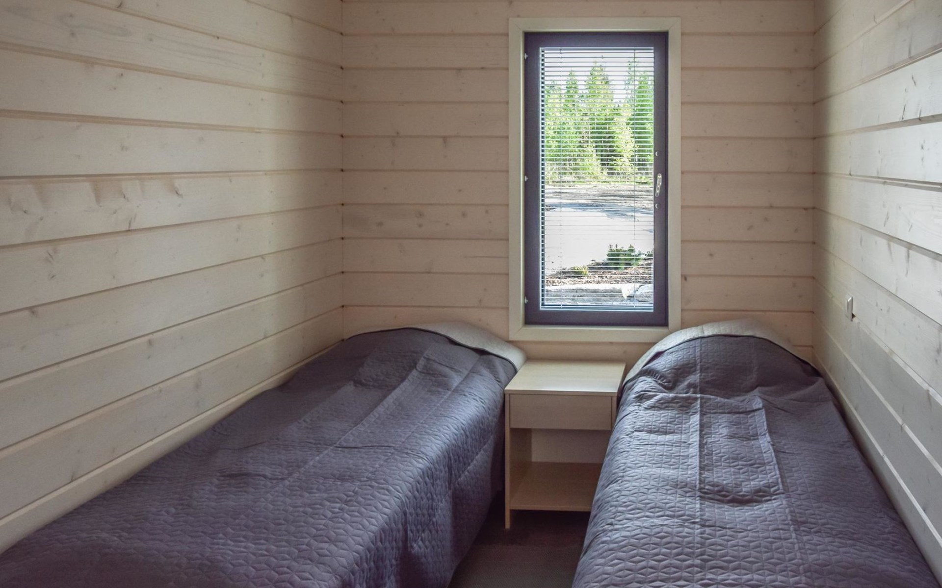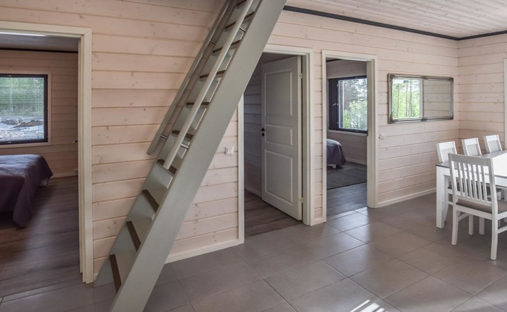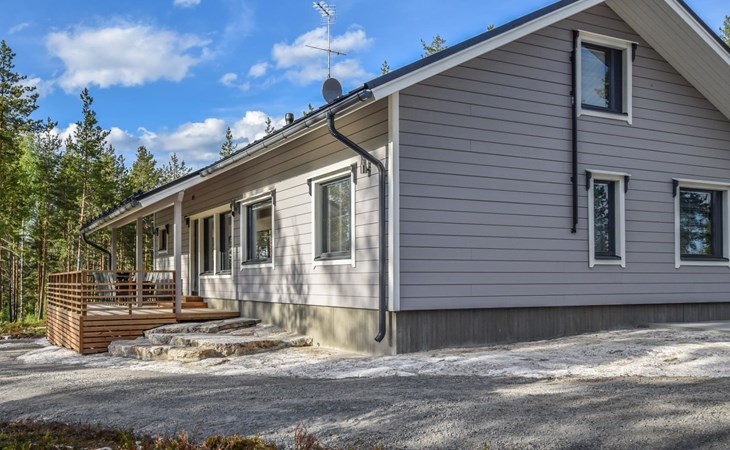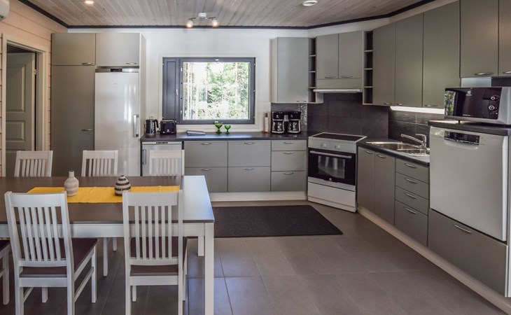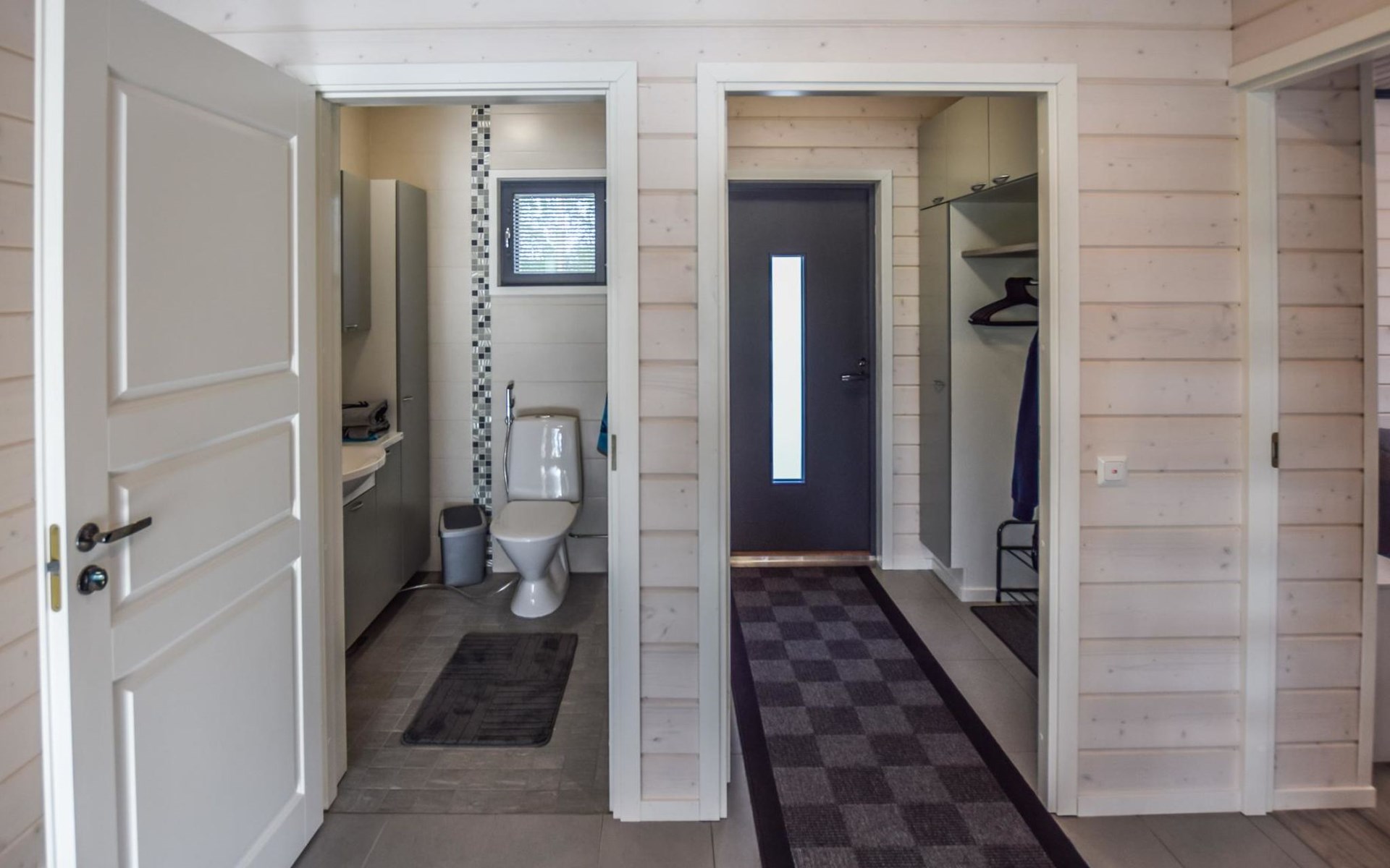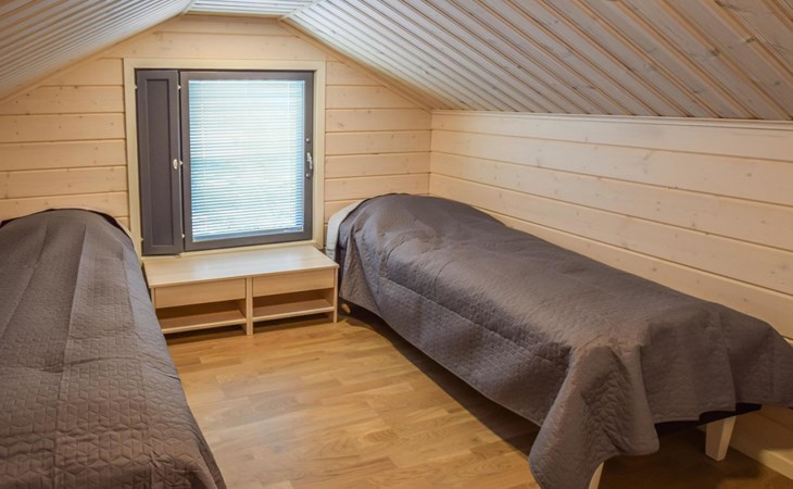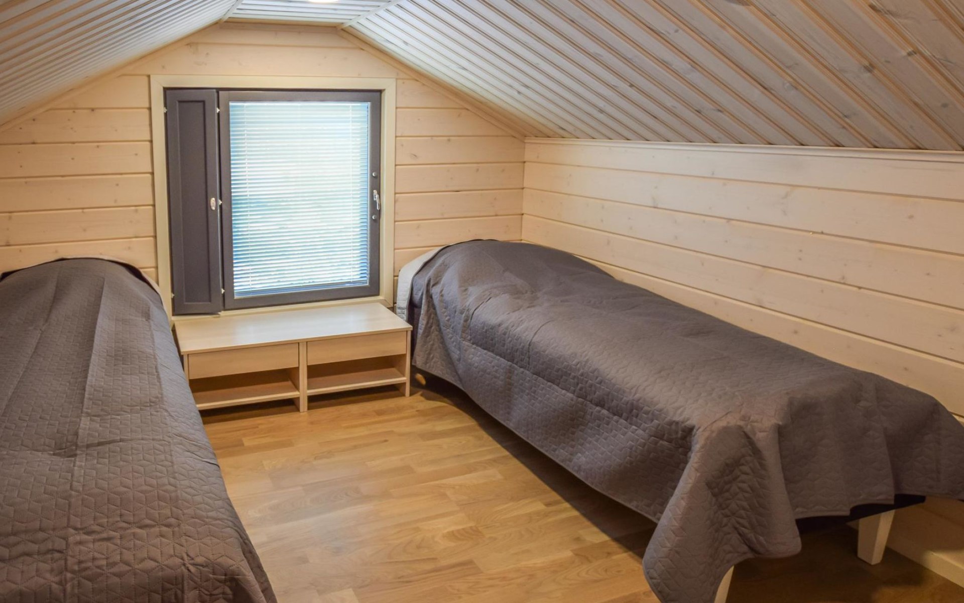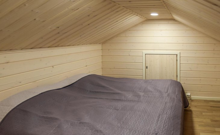 Wooden house 2017, kitchen, living room, bedroom 2 beds, second bedroom 2 beds, third bedroom 2 beds + a bed for child (low railing, length of the bed is about 150 cm), fourth bedroom 2 beds + baby travel cot, upstairs (steep stairs) two small bedrooms (max hight 192cm) 2 beds in each. Utility room, shower room with 2 showers, sauna (electric stove), covered terrace with 12-person dining table.