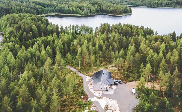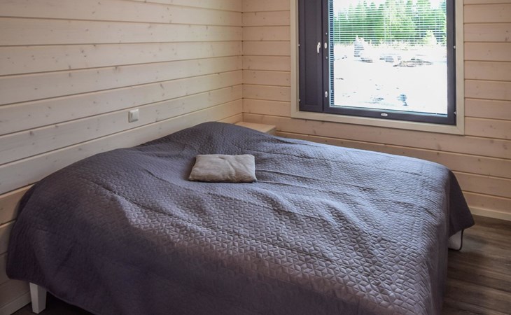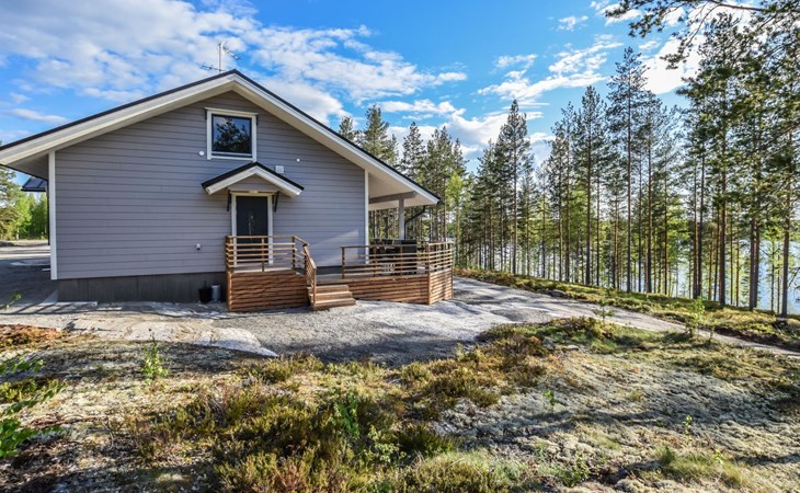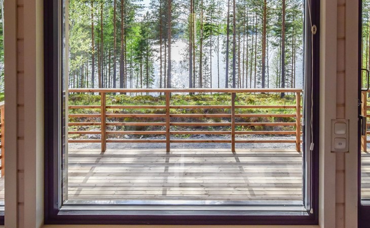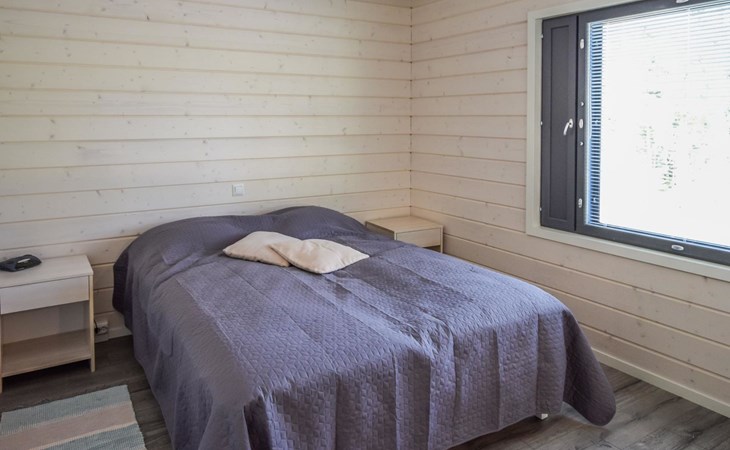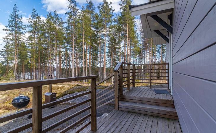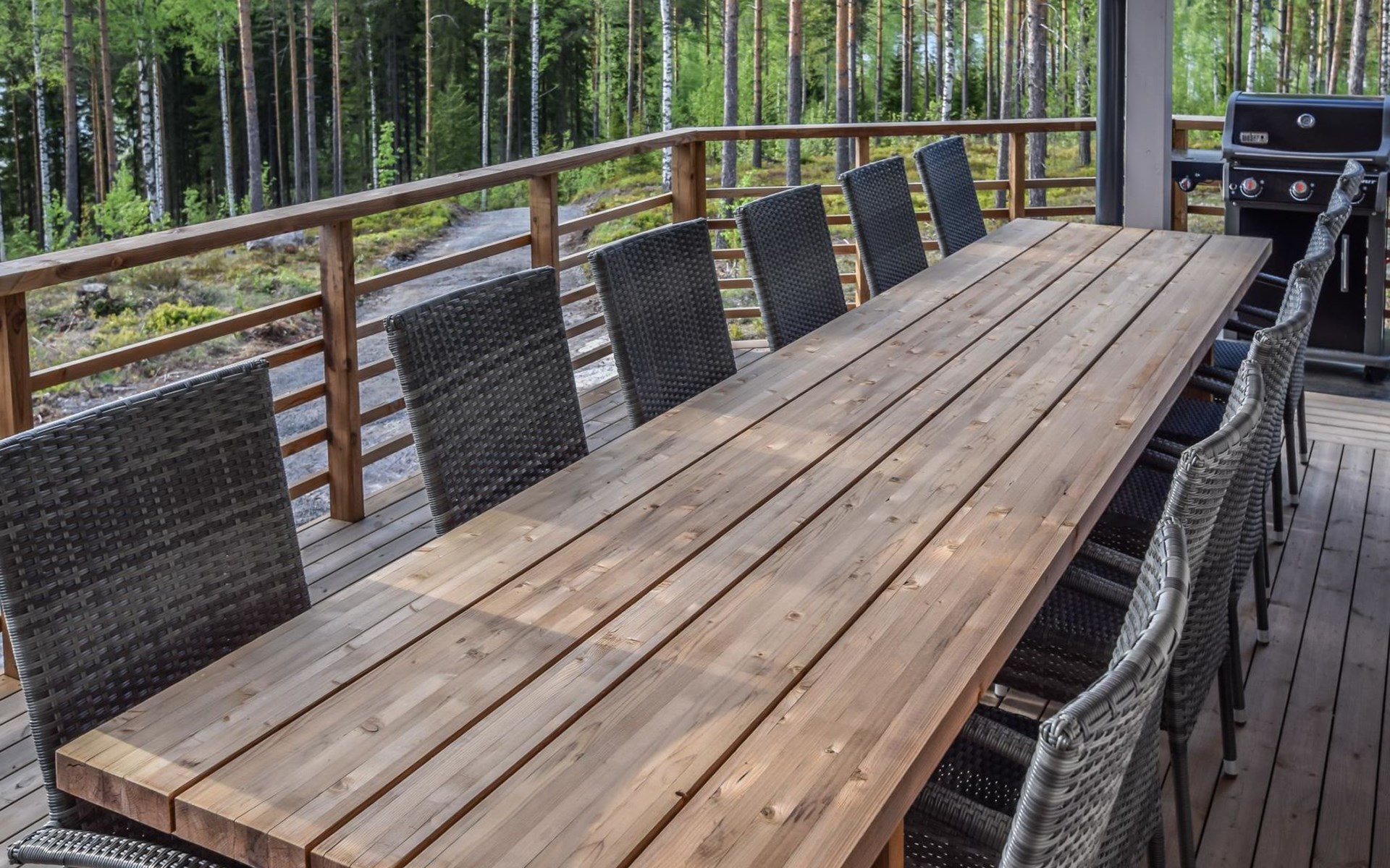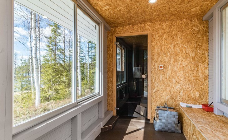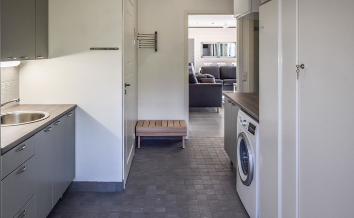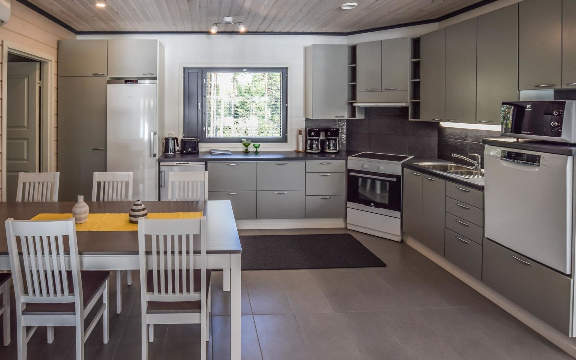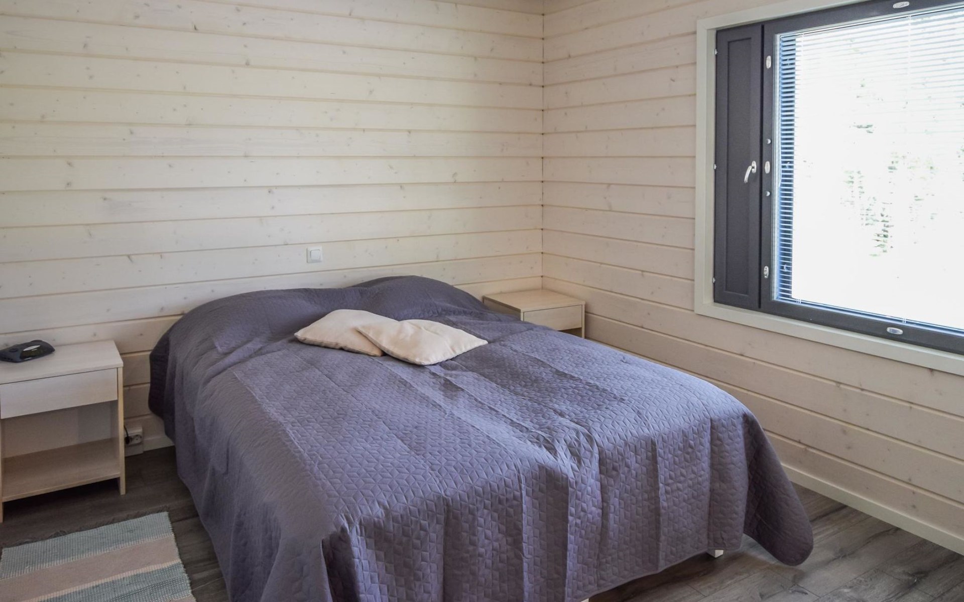 Wooden house 2017, kitchen, living room, bedroom 2 beds, second bedroom 2 beds, third bedroom 2 beds + a bed for child (low railing, length of the bed is about 150 cm), fourth bedroom 2 beds + baby travel cot, upstairs (steep stairs) two small bedrooms (max hight 192cm) 2 beds in each. Utility room, shower room with 2 showers, sauna (electric stove), covered terrace with 12-person dining table.