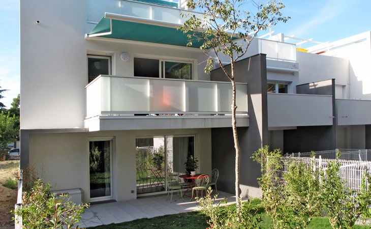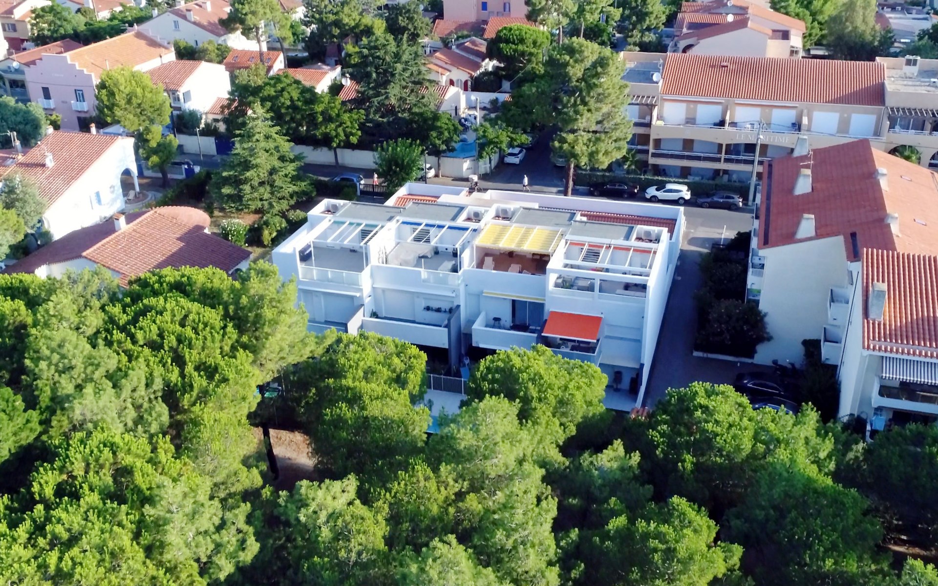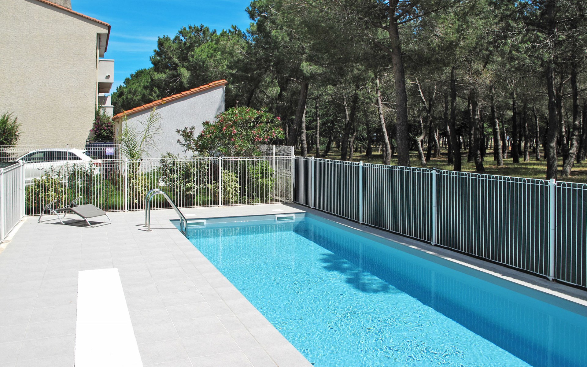 Small, beautiful residence "Les Pins Parasols", 3 storeys, built in 2015. 8 apartments in the residence. In the centre 600 m from the centre of Argelès-Plage, 24 km from the centre of Perpignan, in a central position, 250 m from the sea. For shared use: property with lawn, swimming pool fenced (8 x 3 m, depth 140 cm, seasonal availability: 16.May. - 19.Sep.). Shop 200 m, supermarket 500 m, bus stop "Rond-point des évadés" 3 km, sandy beach 250 m.