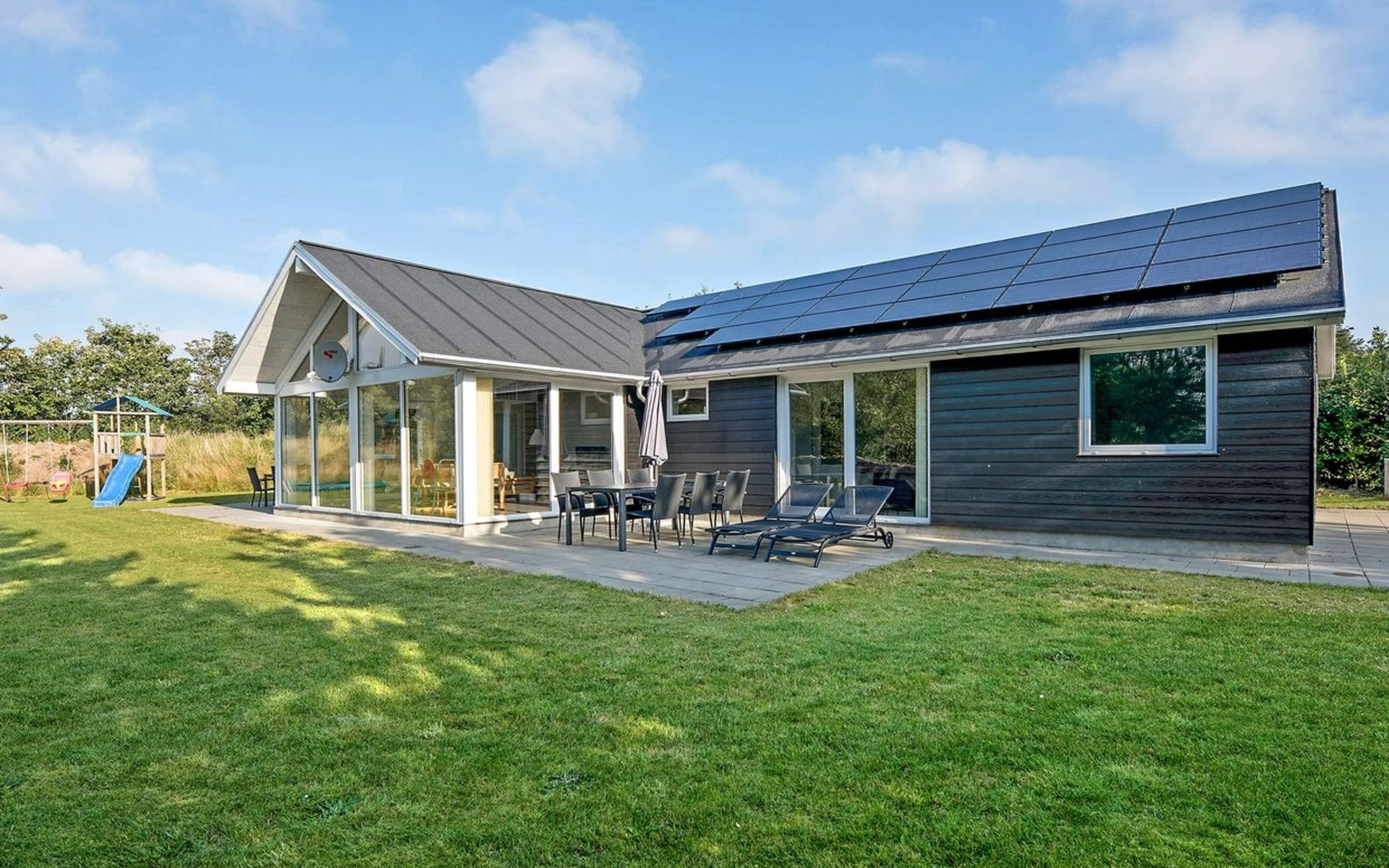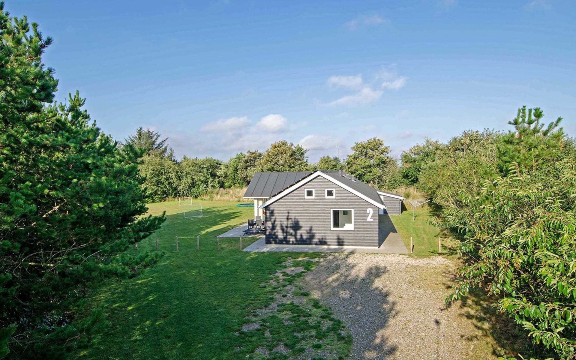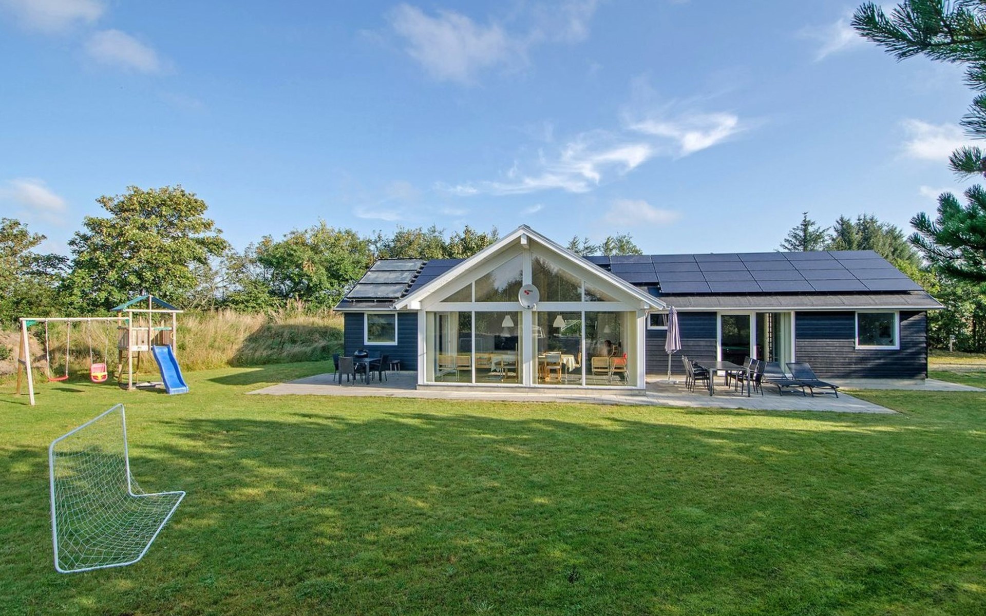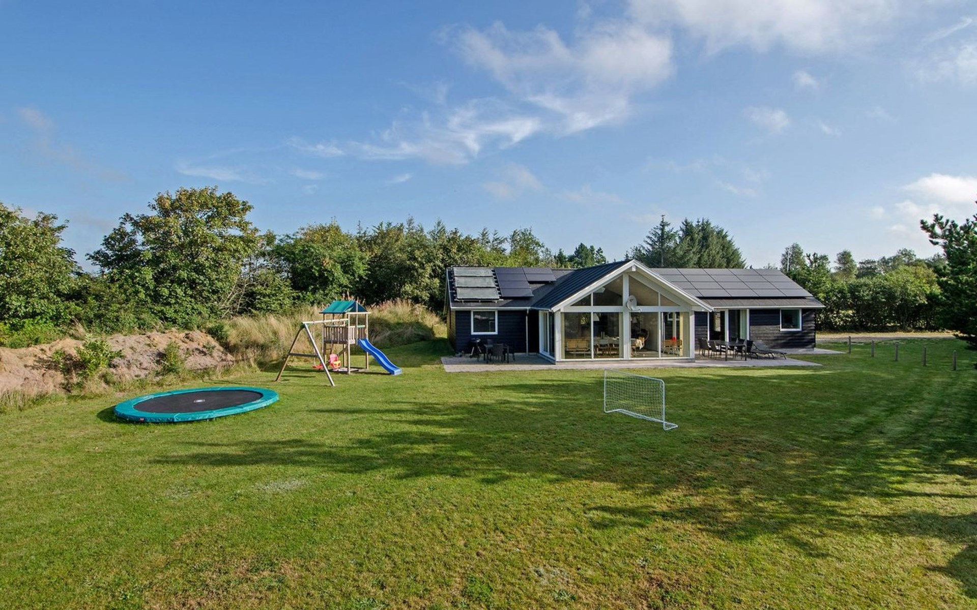 Single-family house, built in 2014. 12 km from the sea. Private: natural state property 1'661 m2. Children's playground (slide, swing). In the house: sauna, trampoline, washing machine, tumble dryer. Parking at the house. E-charging station. Grocery 600 m. The owner does not accept any youth groups.