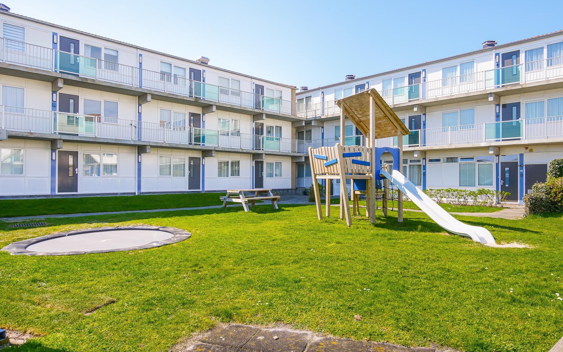 The apartment features a sunny terrace overlooking the dunes and a spacious green lawn. Children can enjoy a communal playground in the courtyard with a trampoline, slide, climbing frame, and swings — fun and safe.