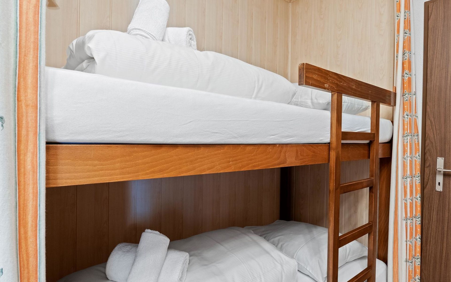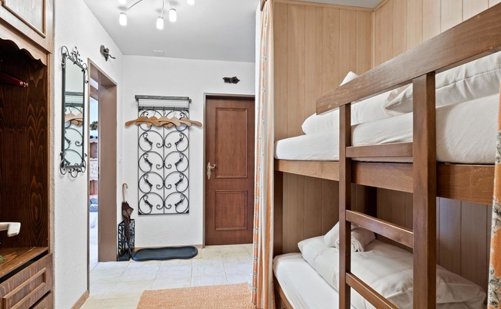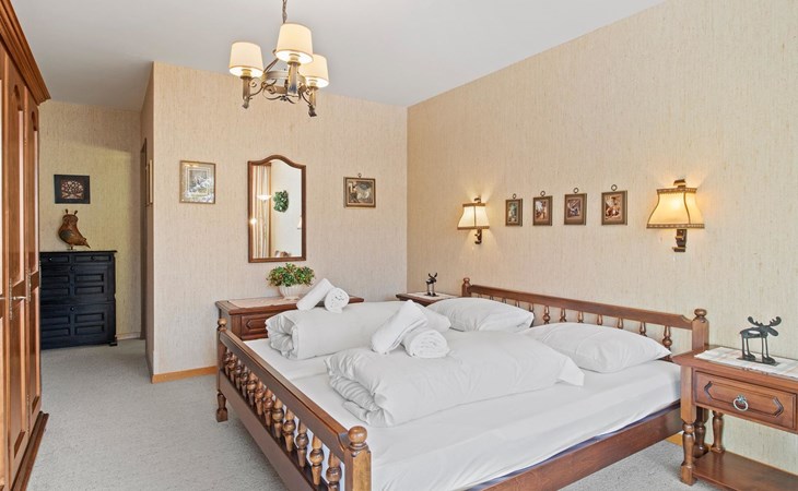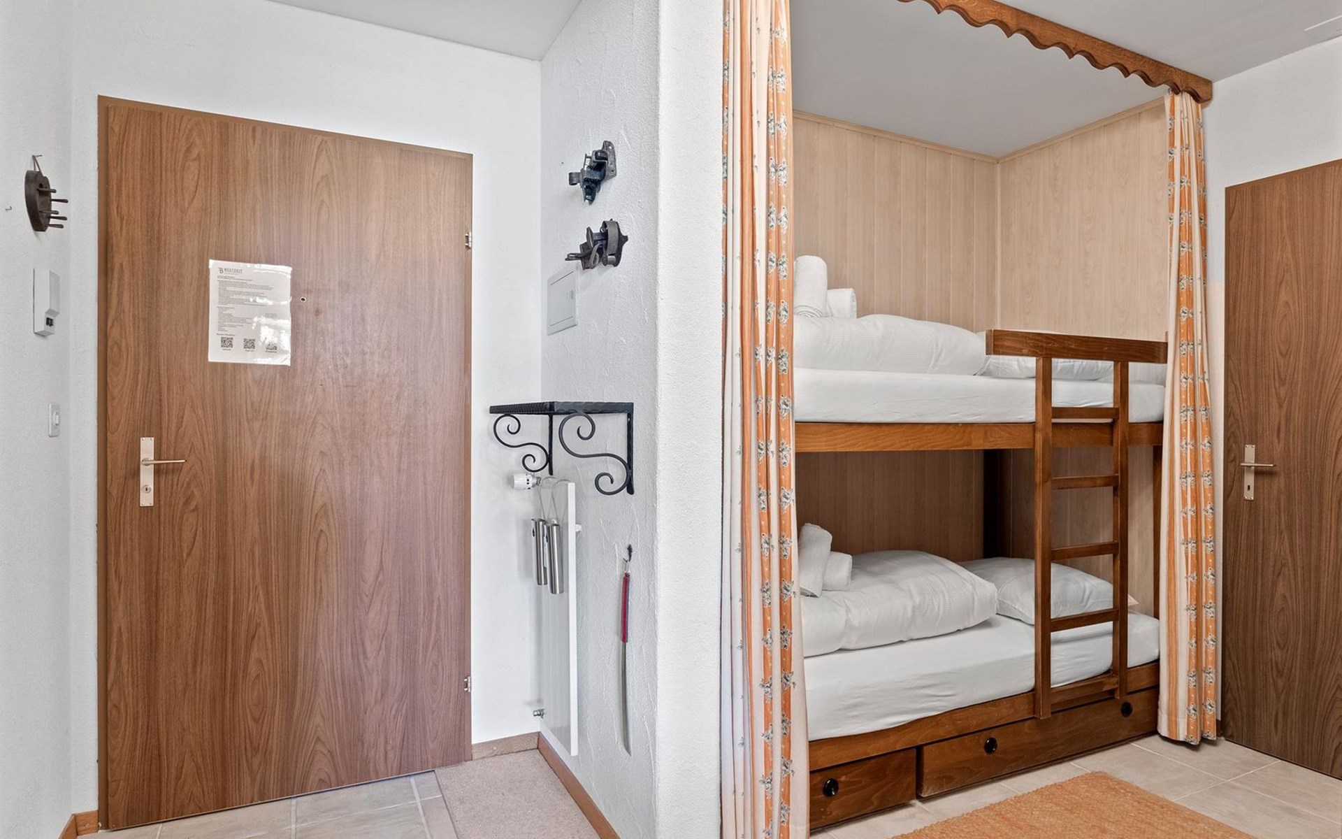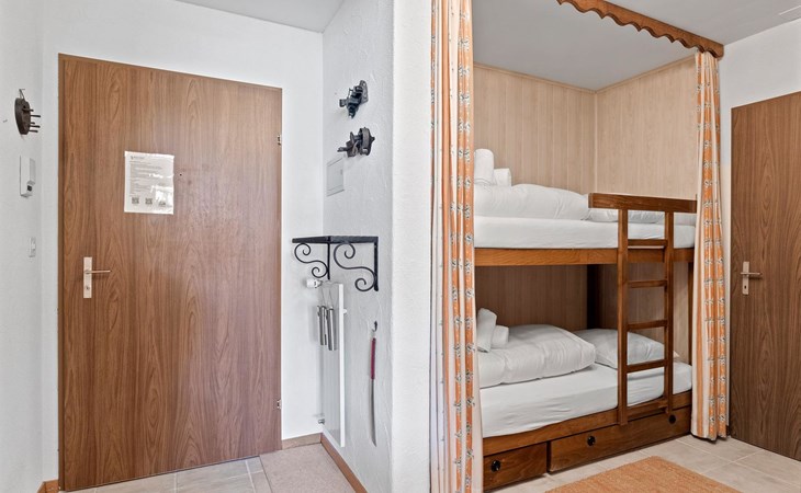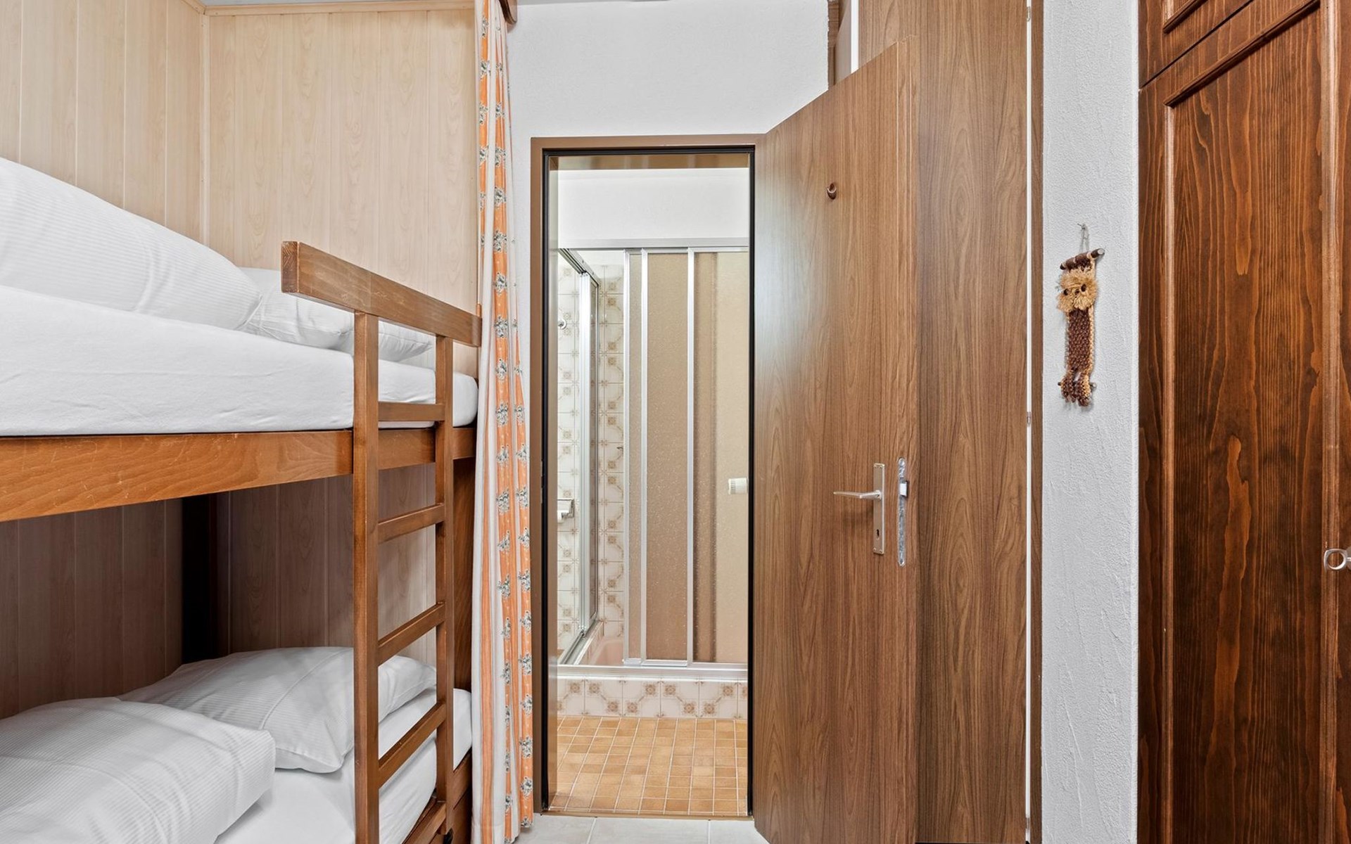 Triangle house D / 2nd floor / Lift / no wifi / 1 room with double bed / 1 bunk bed in the entrance area behind a curtain / 1 bathroom with WC and bathtub / 1 bathroom with WC and shower. The flat is very centrally located and a good starting point for hikes, bike tours or in winter direct access to the ski area.