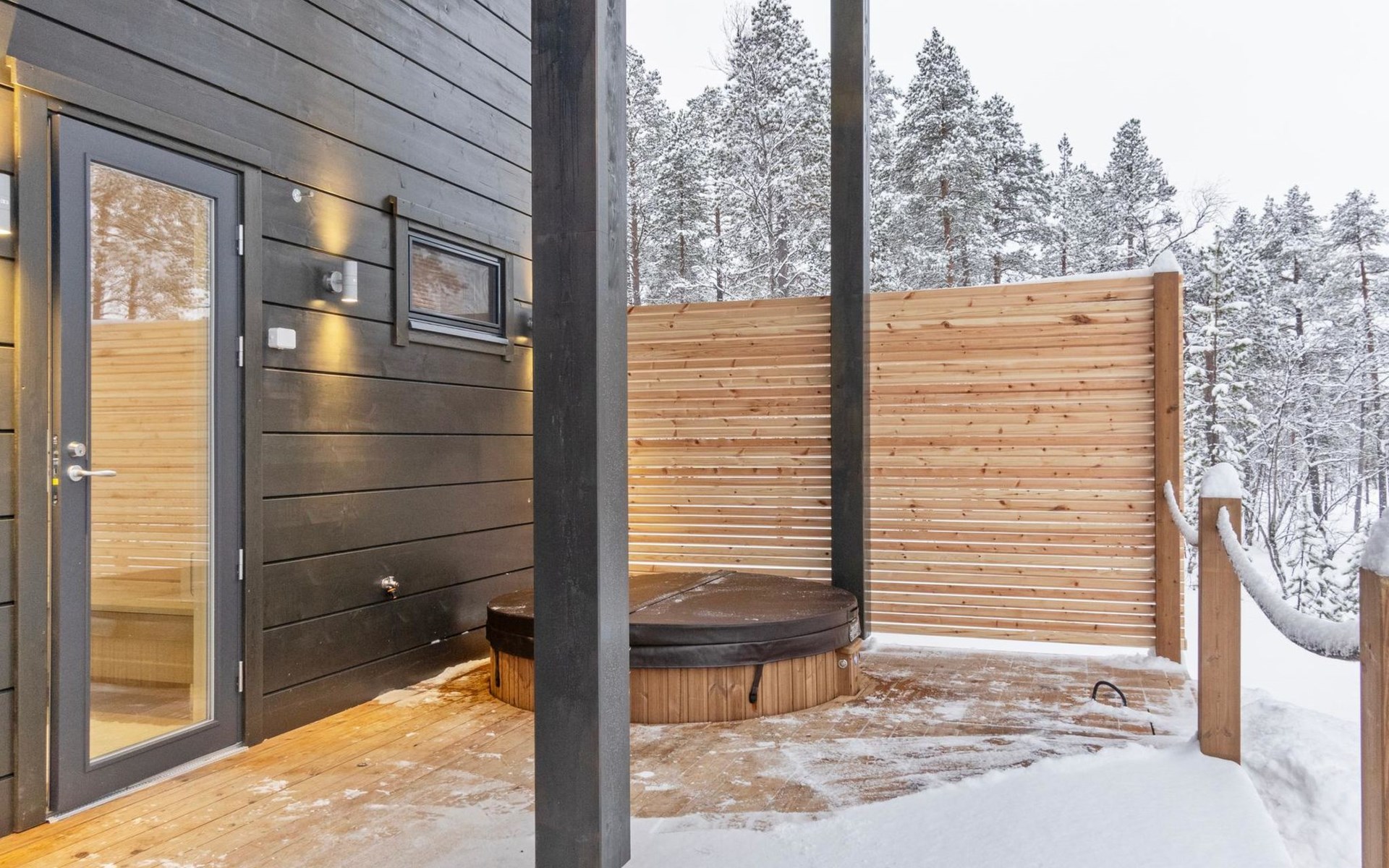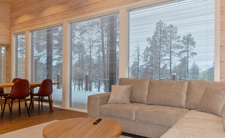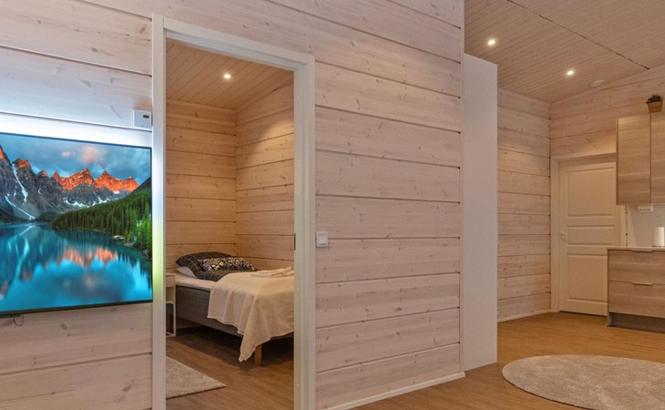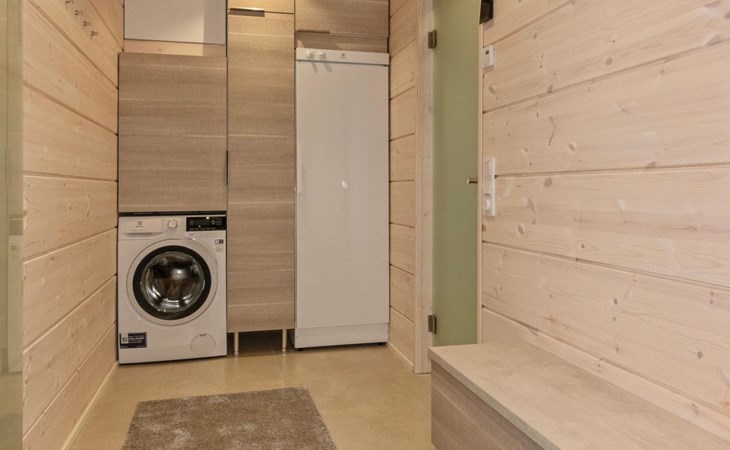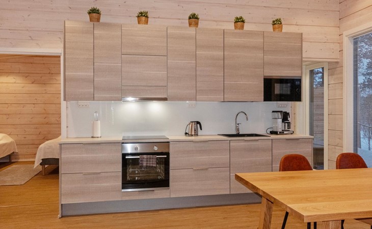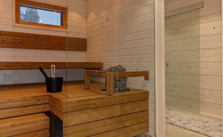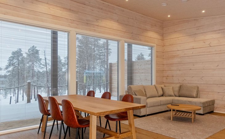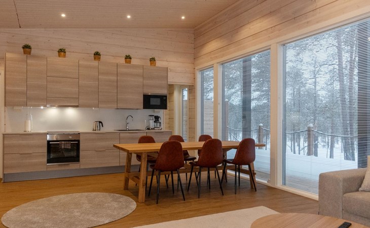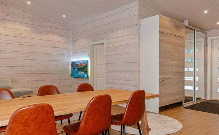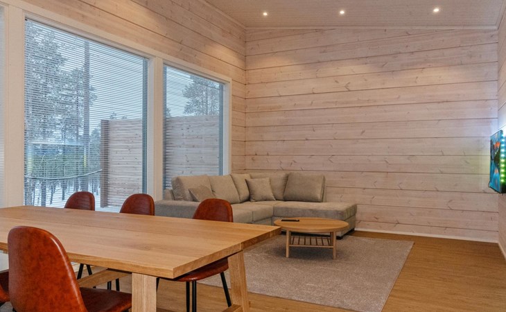 The log house was completed in 2024 and features a living room/kitchen with a sofa bed, two bedrooms each with two beds, a sauna, a bathroom, dressing room, separate WC, and a large covered terrace.