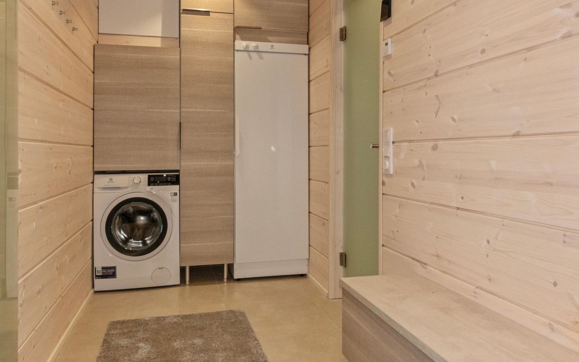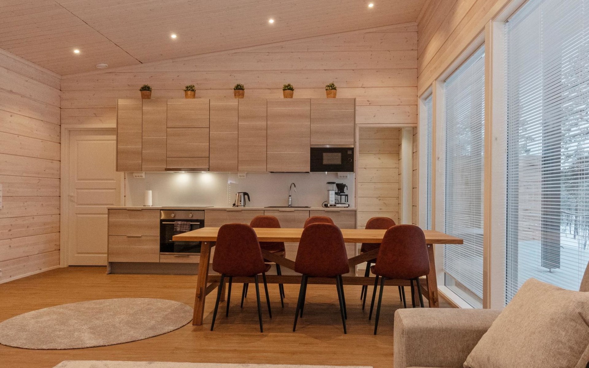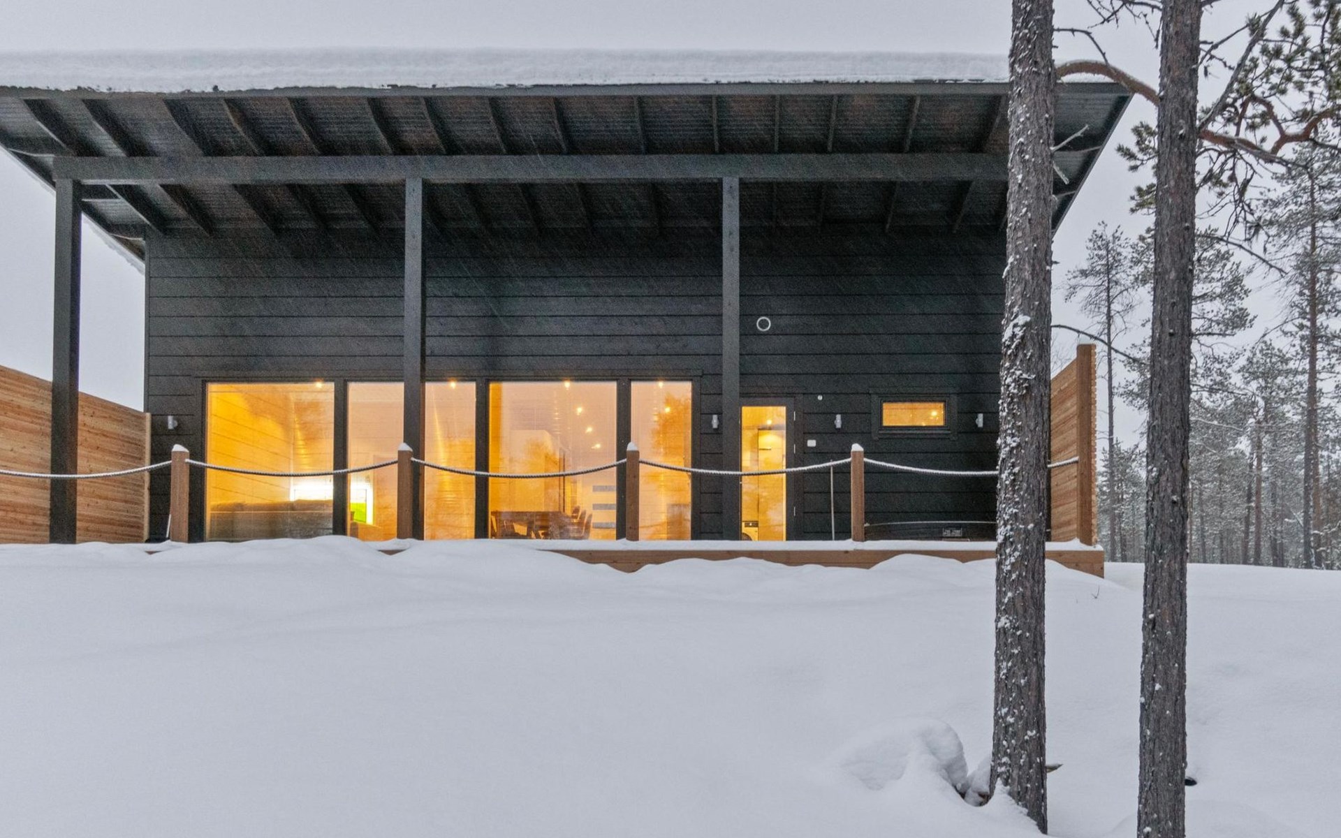 The log house was completed in 2024 and features a living room/kitchen with a sofa bed, two bedrooms each with two beds, a sauna, a bathroom, dressing room, separate WC, and a large covered terrace.