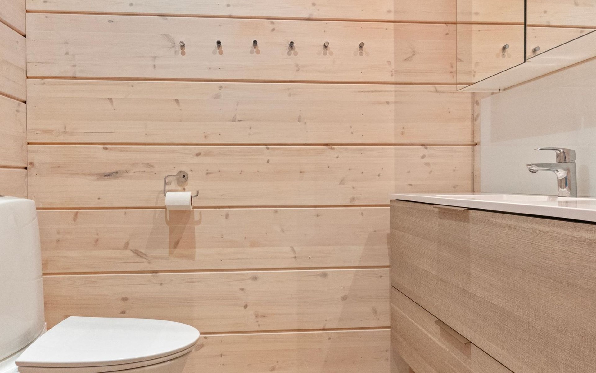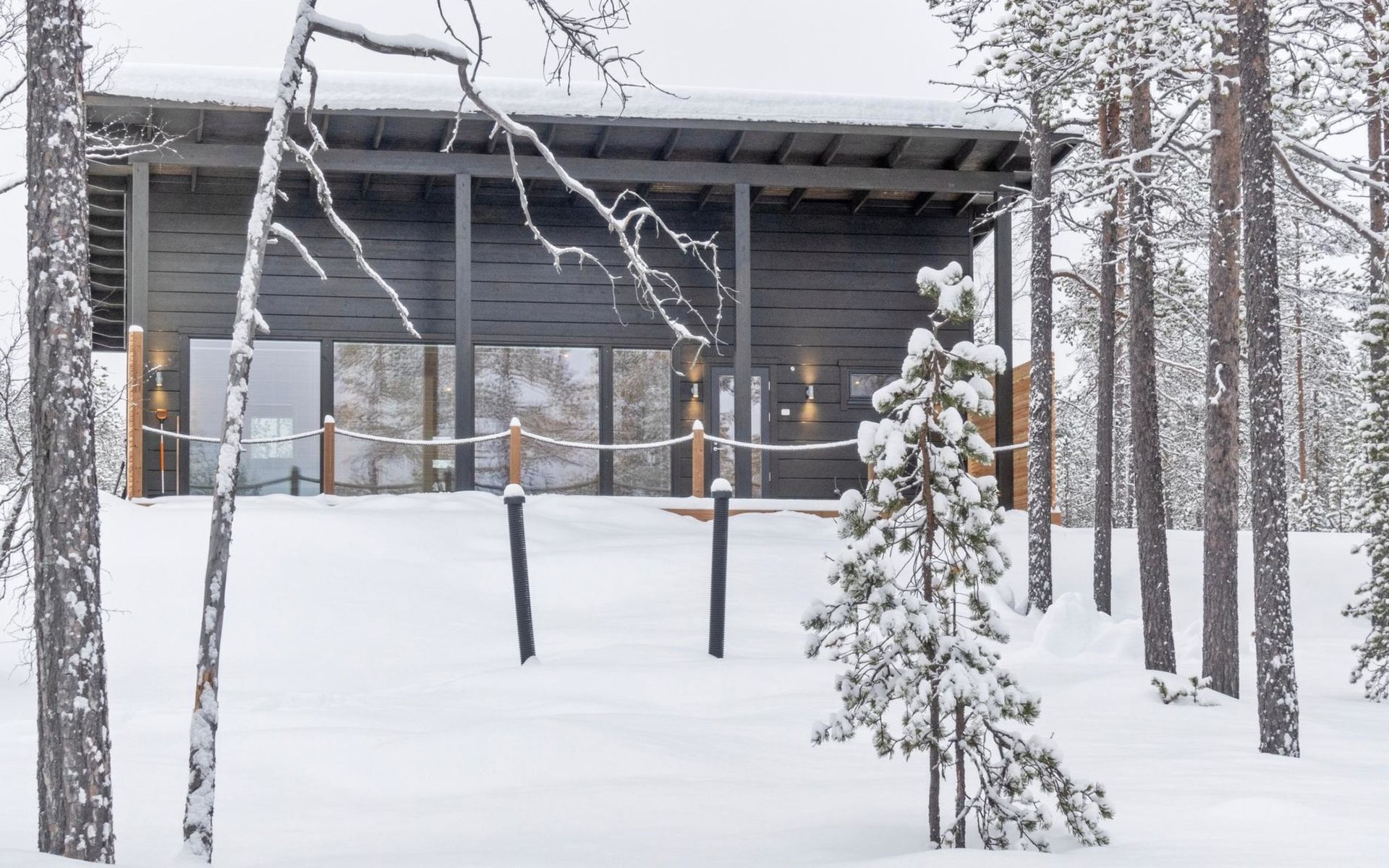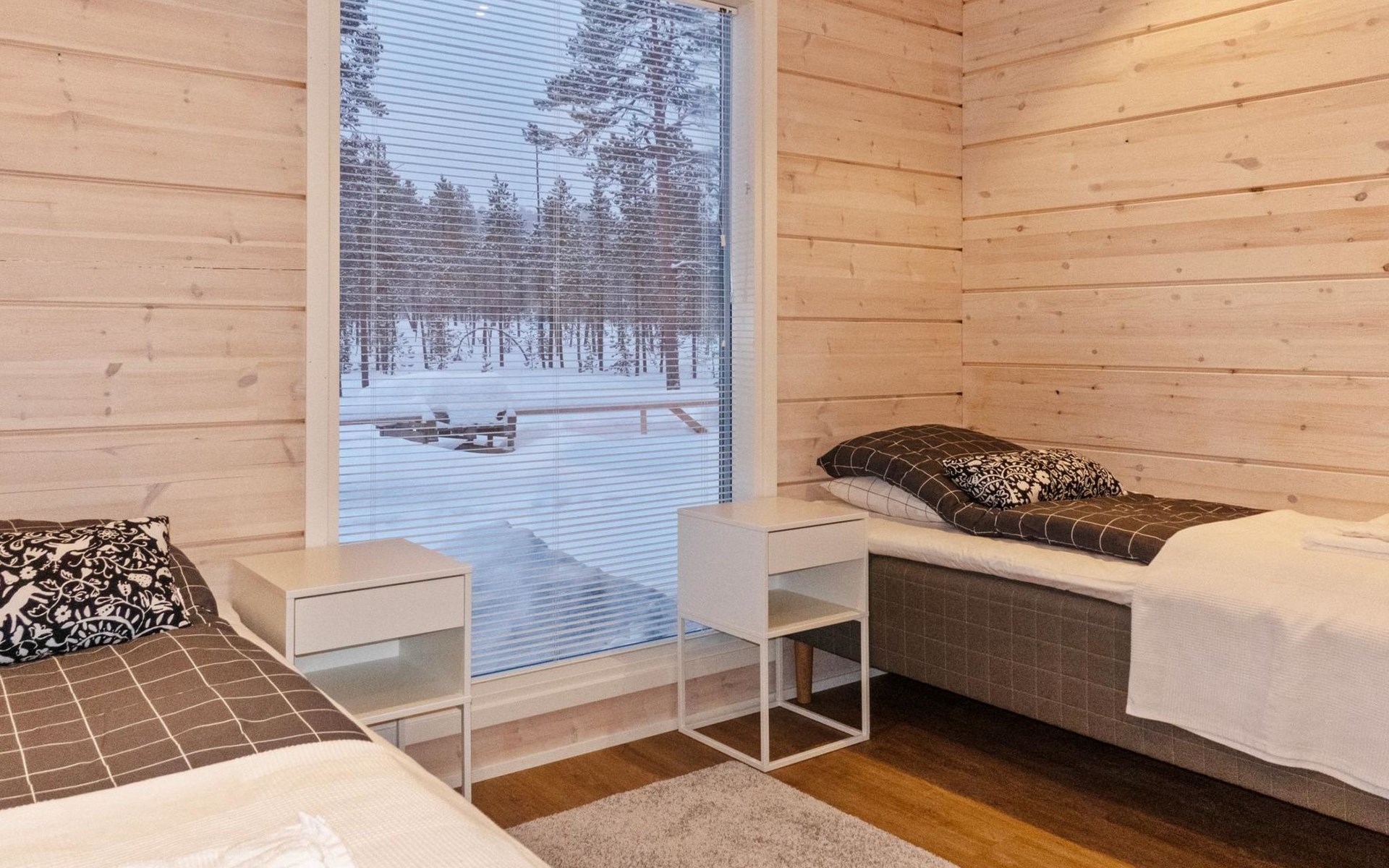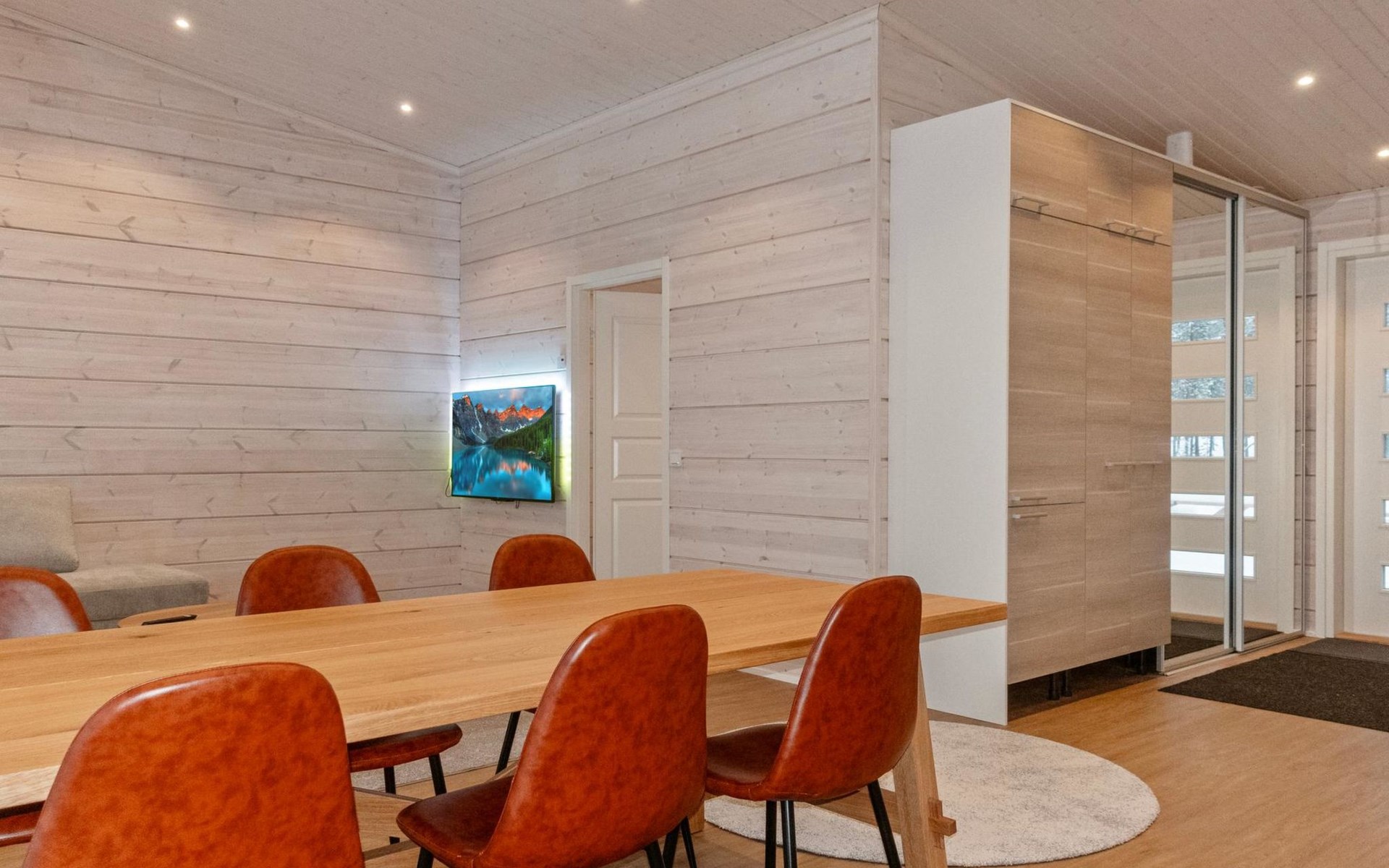The log house was completed in 2024 and features a living room/kitchen with a sofa bed, two bedrooms each with two beds, a sauna, a bathroom, dressing room, separate WC, and a large covered terrace.