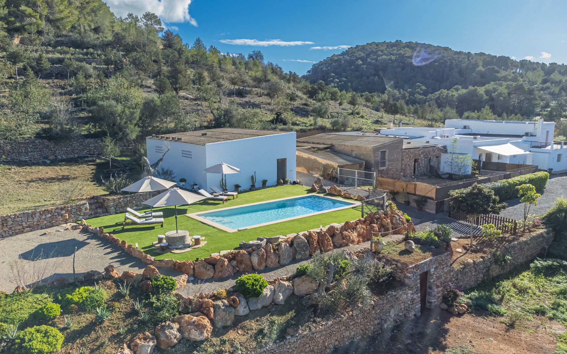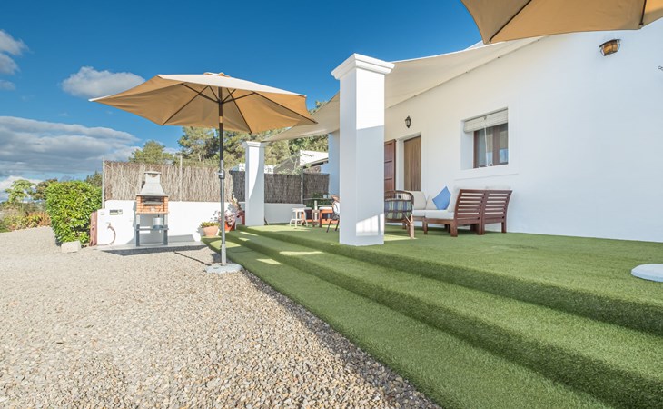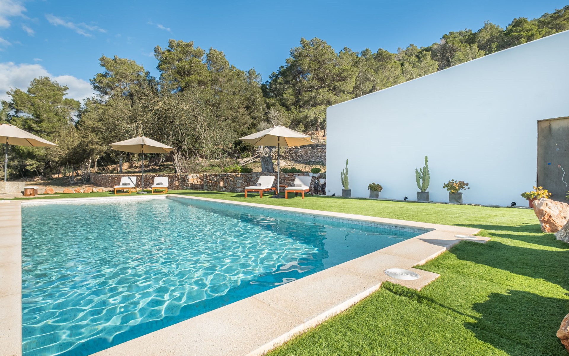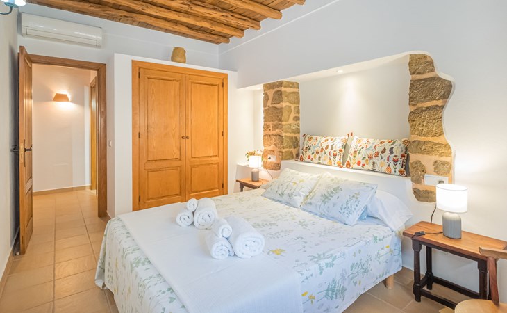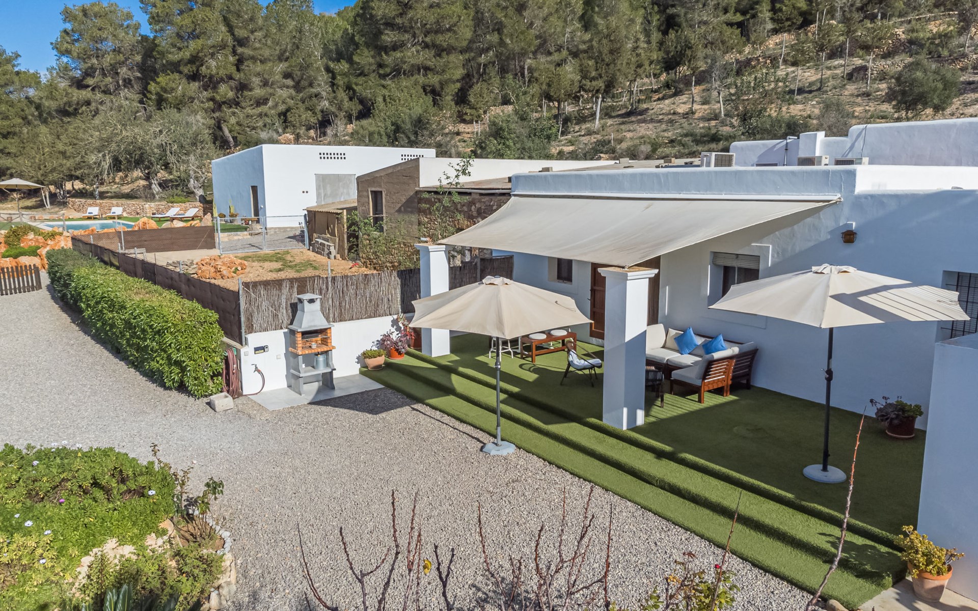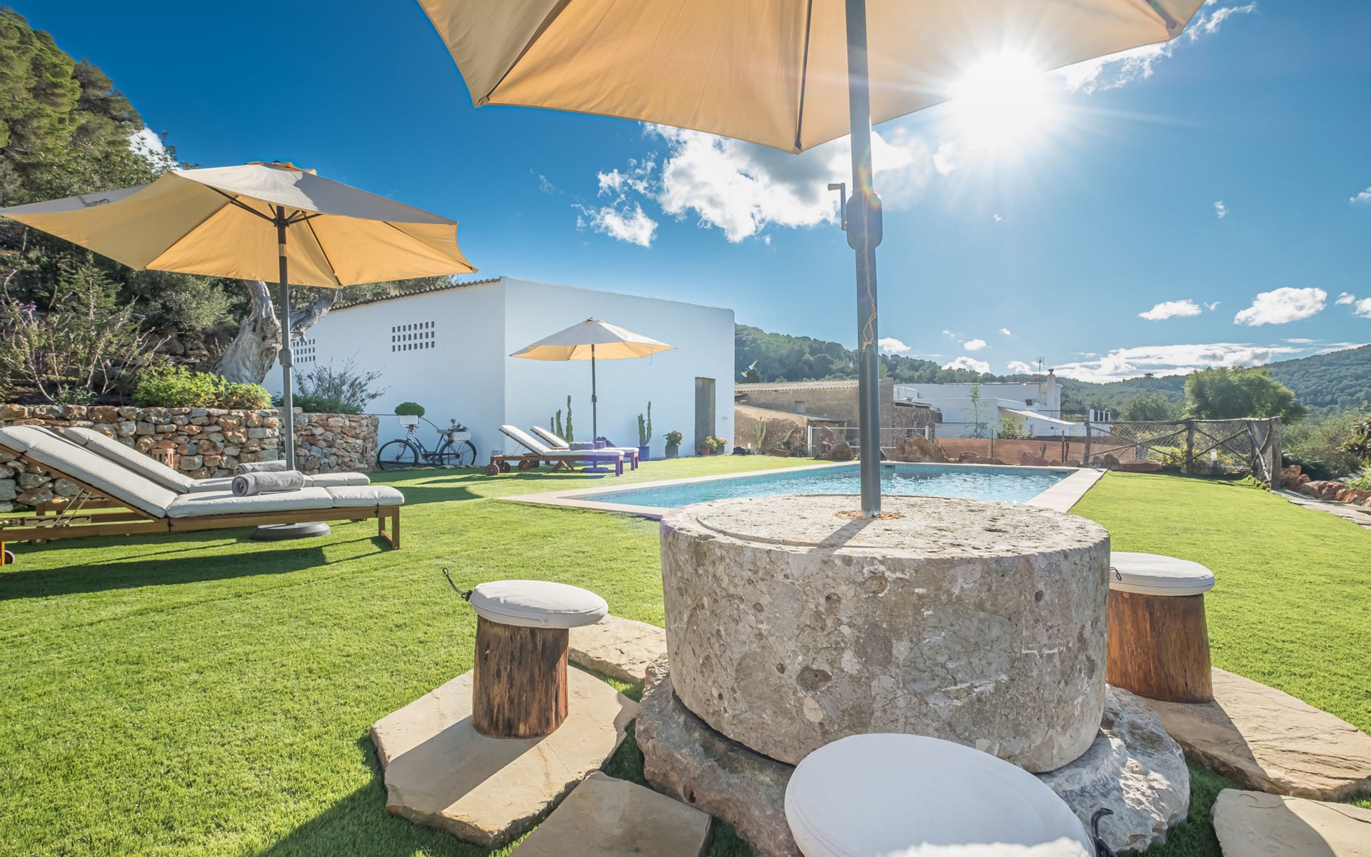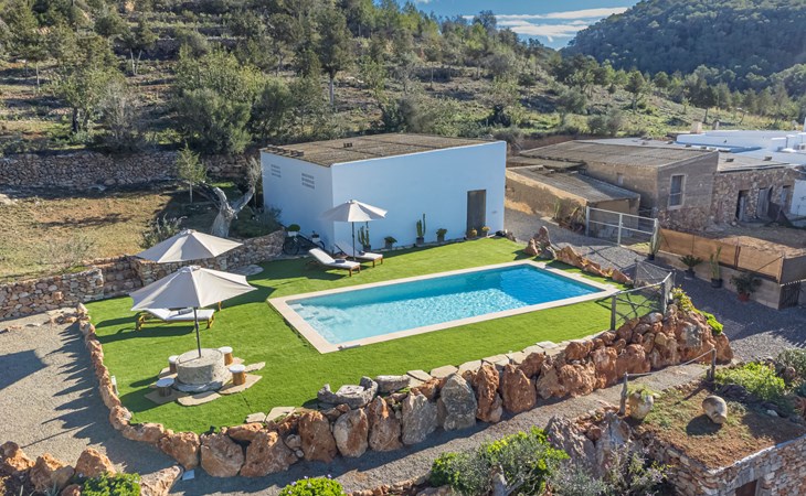 Very beautiful, comfortable farm estate "Can Verdal", renovated, surrounded by trees and fields. Outside the resort, 1 km from the centre of Sant Miquel de Balansat, Ibiza. In a quiet, sunny position, 4.9 km from the sea, in the countryside. Private: natural state property (fenced), beautiful, well-kept terraced garden with lawn and trees, swimming pool angular (9 x 4 m, depth 100 - 260 cm, seasonal availability: 01.Jan. - 31.Dec.). Outdoor shower, hot tub, patio, arbour, pergola, garden furniture, barbecue, pool maintenance by the owner/gardener. In the house: internet access, WiFi, air conditioning. Motor access (200 m via unmade road). Parking at the house on the premises. Supermarket 1.5 km, restaurant 1 km, bar 1 km, bakery 1.1 km, 15 minute walk to the centre, bus stop "EI-400,9-7" 1 km, sandy beach "Platja des Port de Sant Miquel" 4.9 km, shingle beach "Caló des Multons" 6.8 km. Sports harbour 17.5 km, golf course (18 hole) 18.5 km, tennis 2.7 km, sports centre 2.7 km, walking paths from the house 500 m, cycle lane 200 m. Nearby attractions: Pueblos: Sant Miquel,Sant Joan, Pueblos de Sant Llorenç - Sant Joan Bapt, Calas de Benirràs y Es Portitxol, Ibiza 18.5 km, Mirador d'es Vedrà 39 km, Santa Eulalia des Riu 17 km. Hiking paths: Port Sant Miquel - Torres des Molar(3KM), Sant Miquel - Santa Gertrudis (21KM). Please note: car recommended. Suitable for families, suitable for seniors. Object suitable for 4 adults. The owner does not accept any youth groups. On the estate animal husbandry. The owner lives on the same property. Animals in the neighbourhood. Airfield 25 km from the property.
