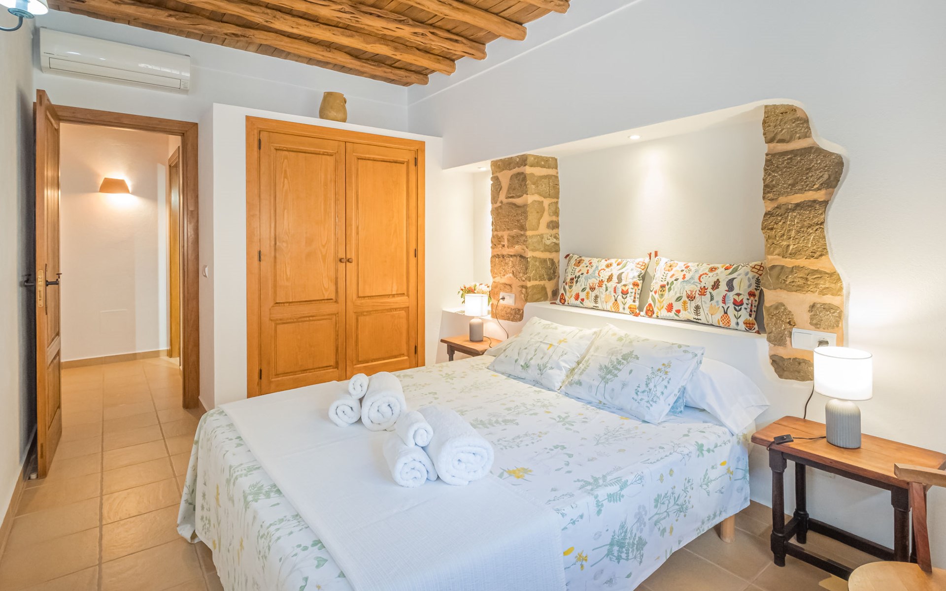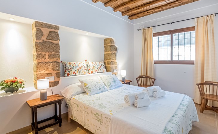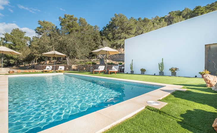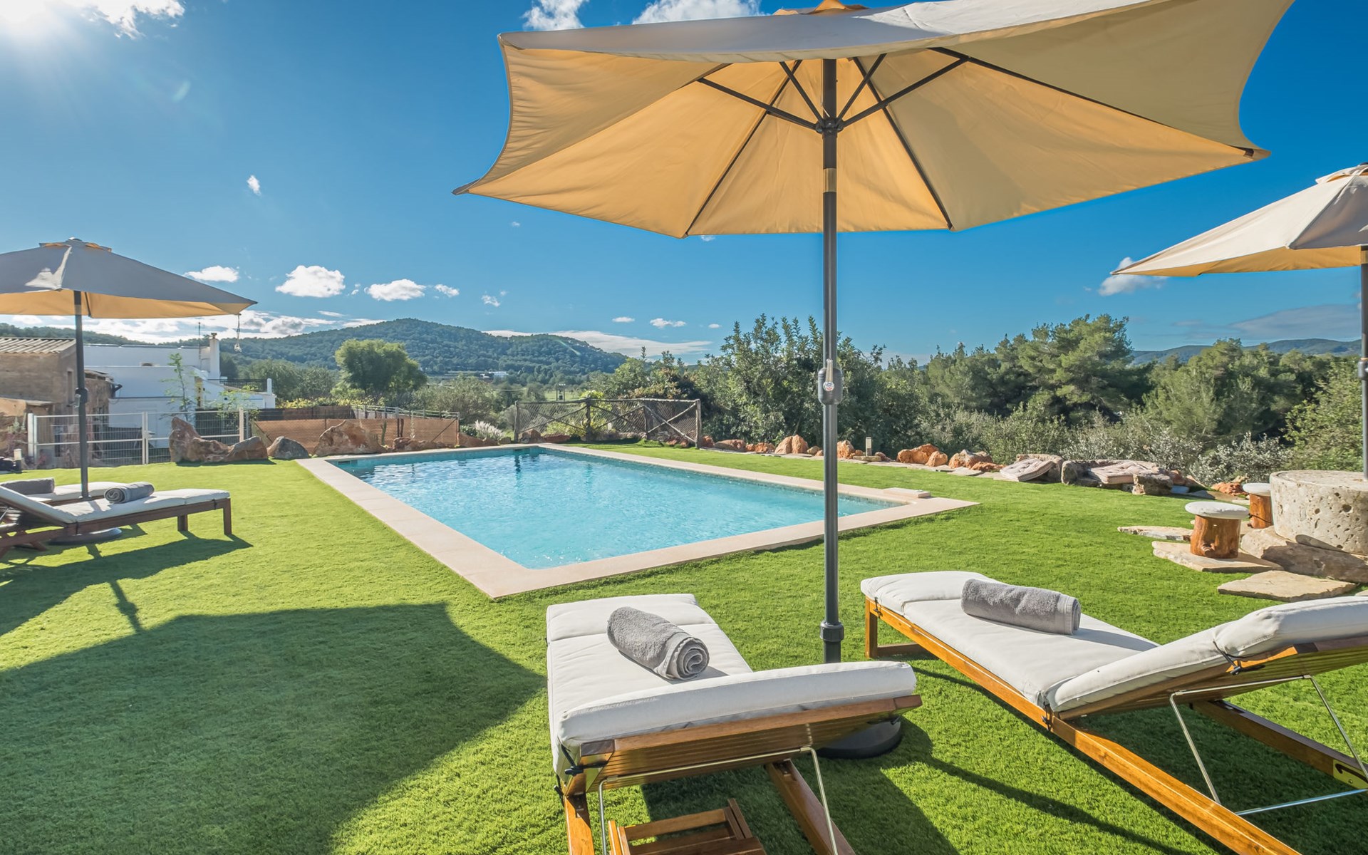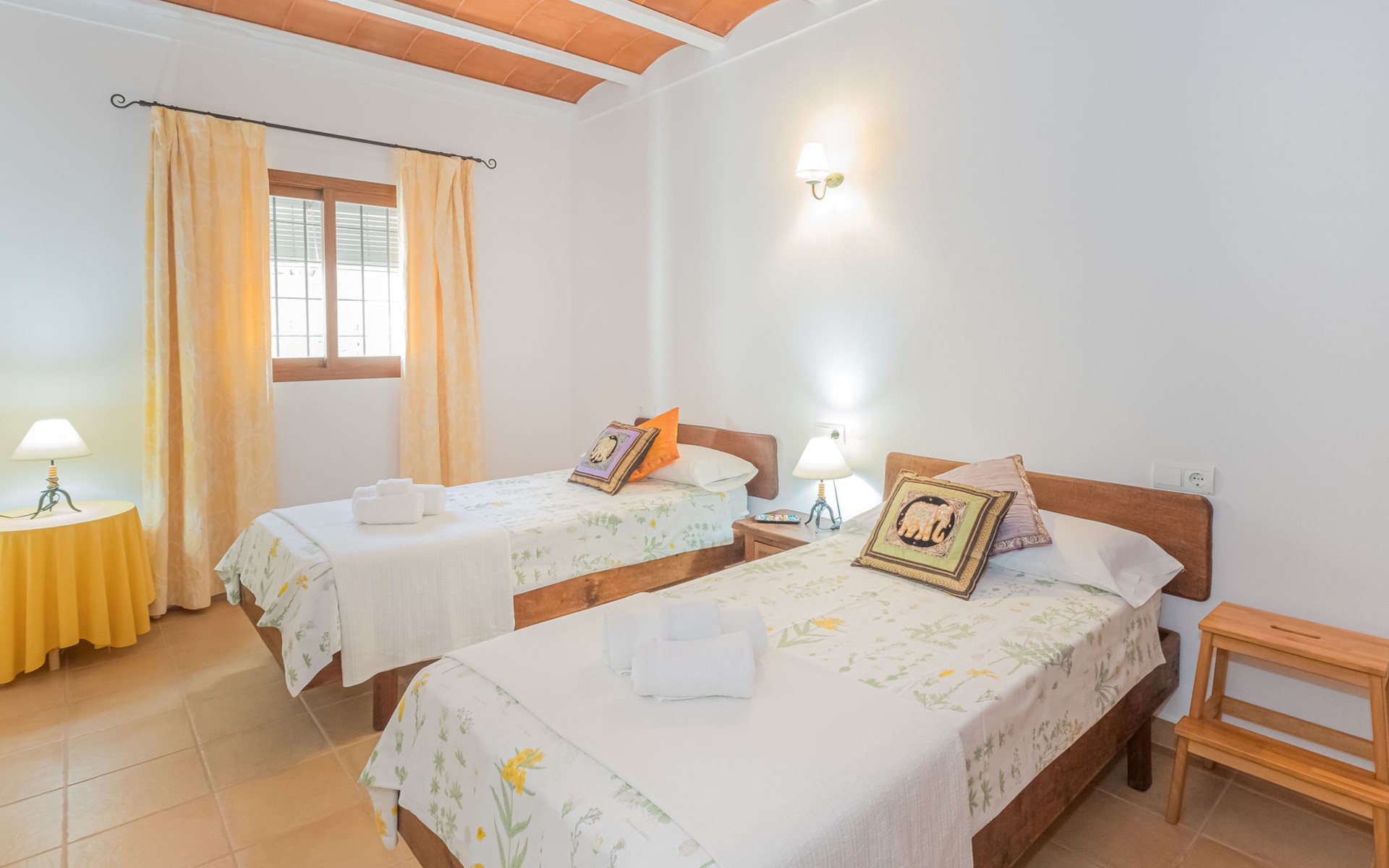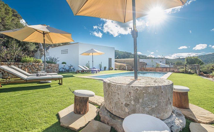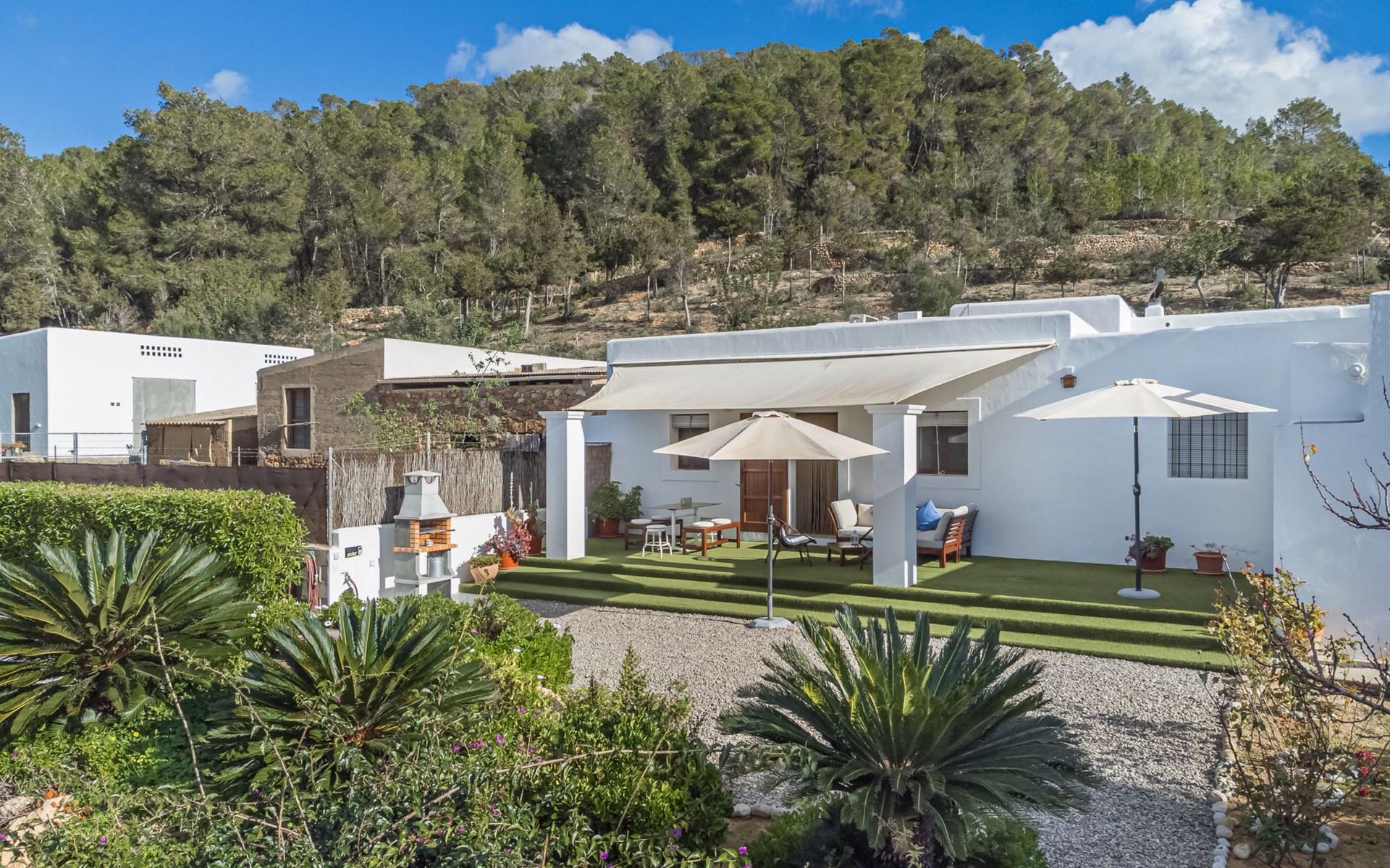 Very beautiful, comfortable farm estate "Can Verdal", renovated, surrounded by trees and fields. Outside the resort, 1 km from the centre of Sant Miquel de Balansat, Ibiza. In a quiet, sunny position, 4.9 km from the sea, in the countryside. Private: natural state property (fenced), beautiful, well-kept terraced garden with lawn and trees, swimming pool angular (9 x 4 m, depth 100 - 260 cm, seasonal availability: 01.Jan. - 31.Dec.). Outdoor shower, hot tub, patio, arbour, pergola, garden furniture, barbecue, pool maintenance by the owner/gardener. In the house: internet access, WiFi, air conditioning. Motor access (200 m via unmade road). Parking at the house on the premises. Supermarket 1.5 km, restaurant 1 km, bar 1 km, bakery 1.1 km, 15 minute walk to the centre, bus stop "EI-400,9-7" 1 km, sandy beach "Platja des Port de Sant Miquel" 4.9 km, shingle beach "Caló des Multons" 6.8 km. Sports harbour 17.5 km, golf course (18 hole) 18.5 km, tennis 2.7 km, sports centre 2.7 km, walking paths from the house 500 m, cycle lane 200 m. Nearby attractions: Pueblos: Sant Miquel,Sant Joan, Pueblos de Sant Llorenç - Sant Joan Bapt, Calas de Benirràs y Es Portitxol, Ibiza 18.5 km, Mirador d'es Vedrà 39 km, Santa Eulalia des Riu 17 km. Hiking paths: Port Sant Miquel - Torres des Molar(3KM), Sant Miquel - Santa Gertrudis (21KM). Please note: car recommended. Suitable for families, suitable for seniors. Object suitable for 4 adults. The owner does not accept any youth groups. On the estate animal husbandry. The owner lives on the same property. Animals in the neighbourhood. Airfield 25 km from the property.