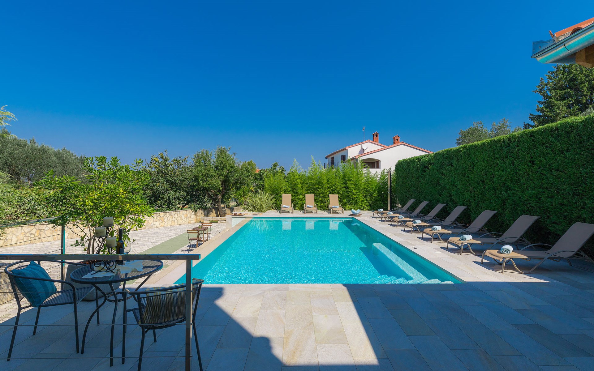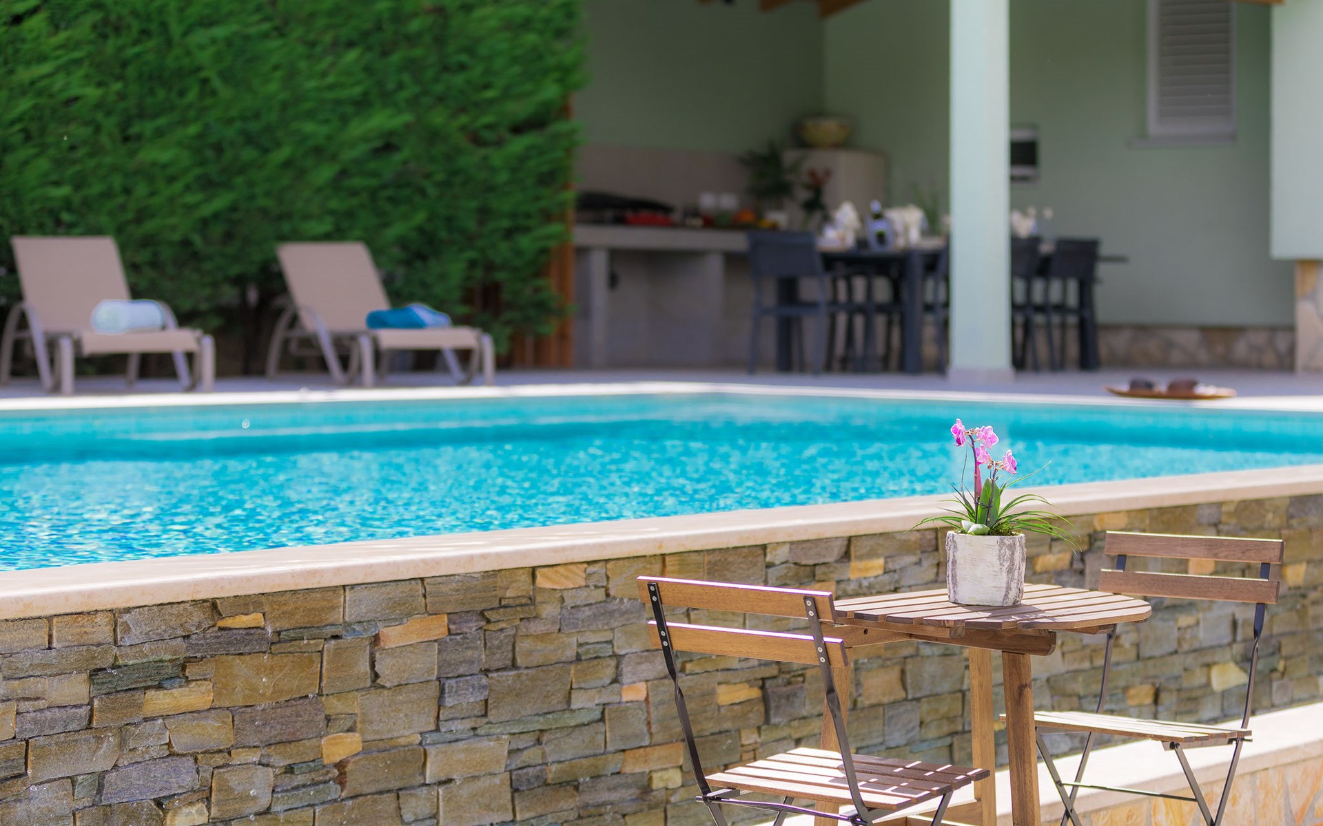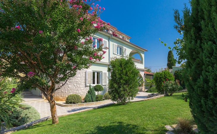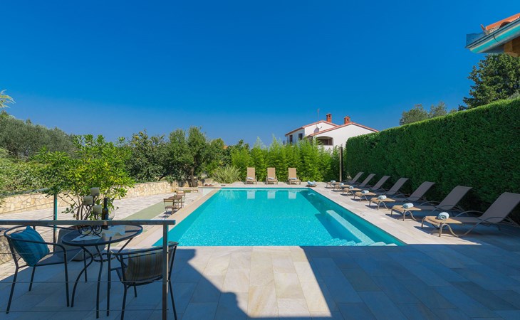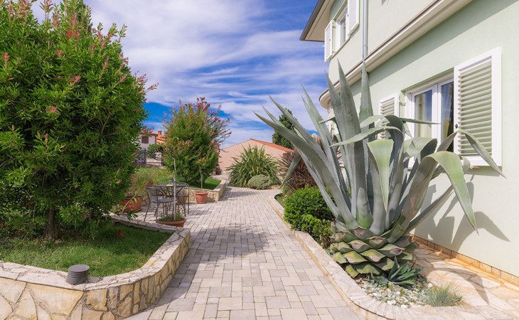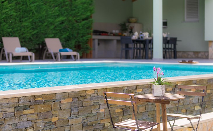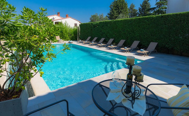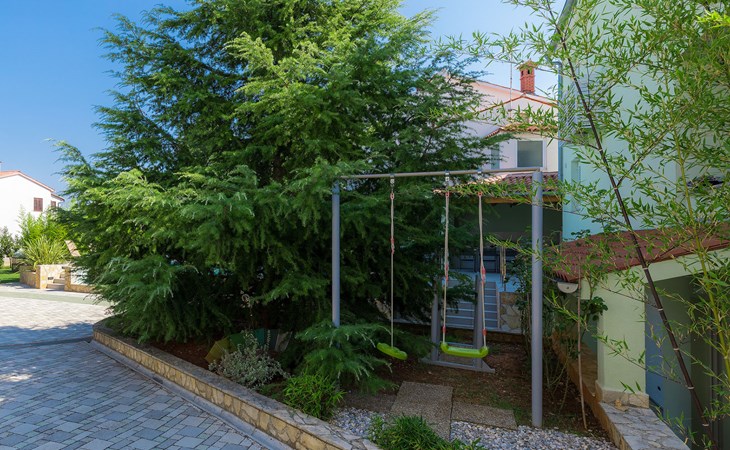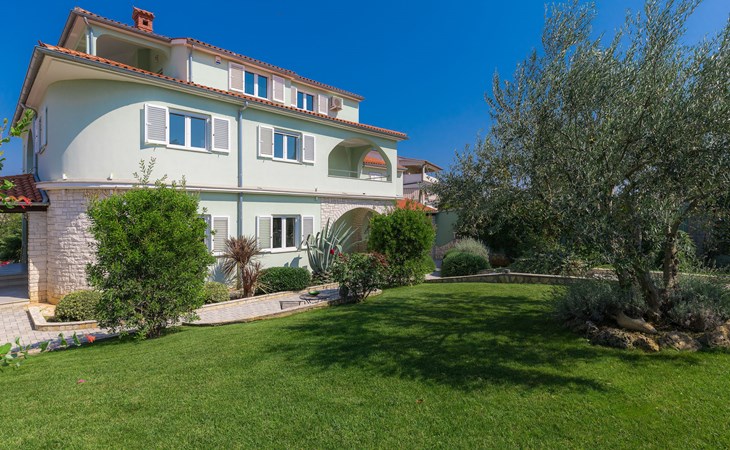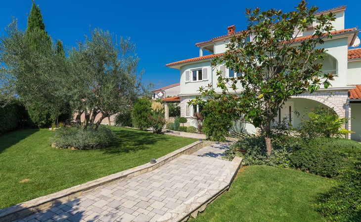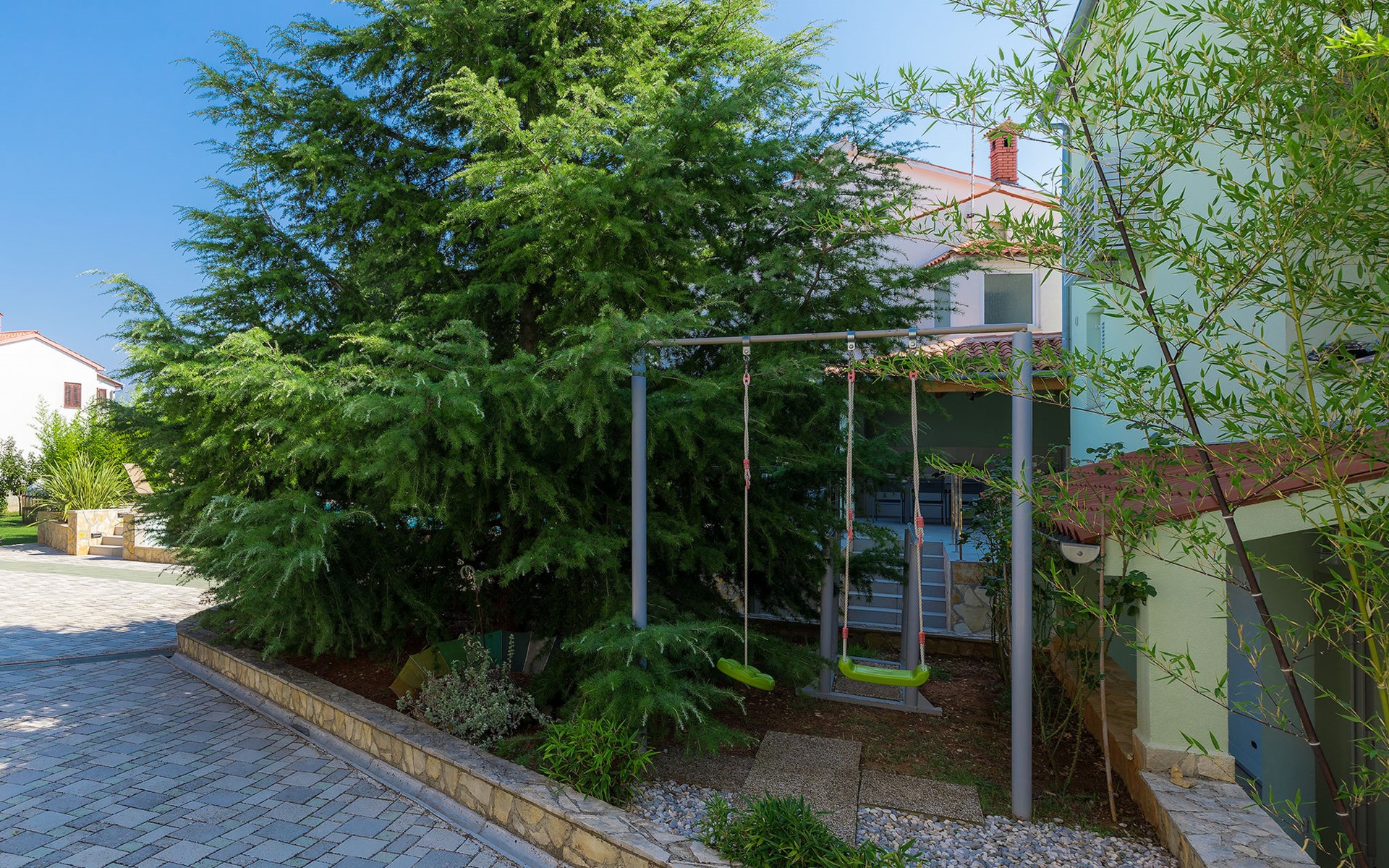 Štinjan 5 km from Pula: Beautiful villa "Salamander", 3 storeys. 3 km from the centre of Fažana, in a sunny position, 1 km from the sea, 1 km from the beach. Private: property 1'300 m2 (fenced) with wildlife garden and flowers, beautiful garden to relax, swimming pool angular (9 x 5 m, depth 140 cm, seasonal availability: 09.May. - 03.Oct.) with internal staircase and salt-electrolysis pool-cleaning system. Shower/WC in the pool area, outdoor shower, terrace (20 m2), garden furniture, children's playground (swing). In the house: internet access, washing machine. Parking (for 2 cars) at the house on the premises. Shop 500 m, restaurant 200 m, bus stop 150 m, pebble beach 1 km, public bathing area 1 km. Golf course (18 hole) 5 km, sailing school 5 km, tennis 500 m, riding stable 4 km, walking paths from the house 500 m, cycle lane 550 m. The owner does not accept any youth groups. Please note: airfield 15 km from the property. Swimming pool with hydromassage. Private:outdoor kitchen (2 hot plates, fridge).