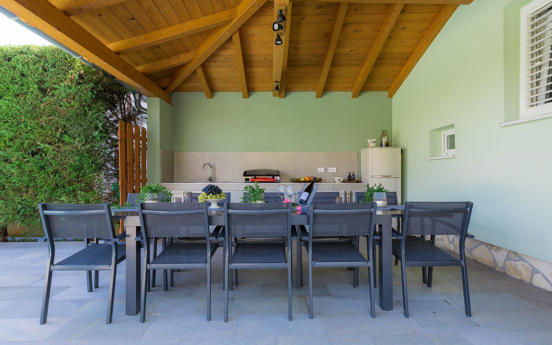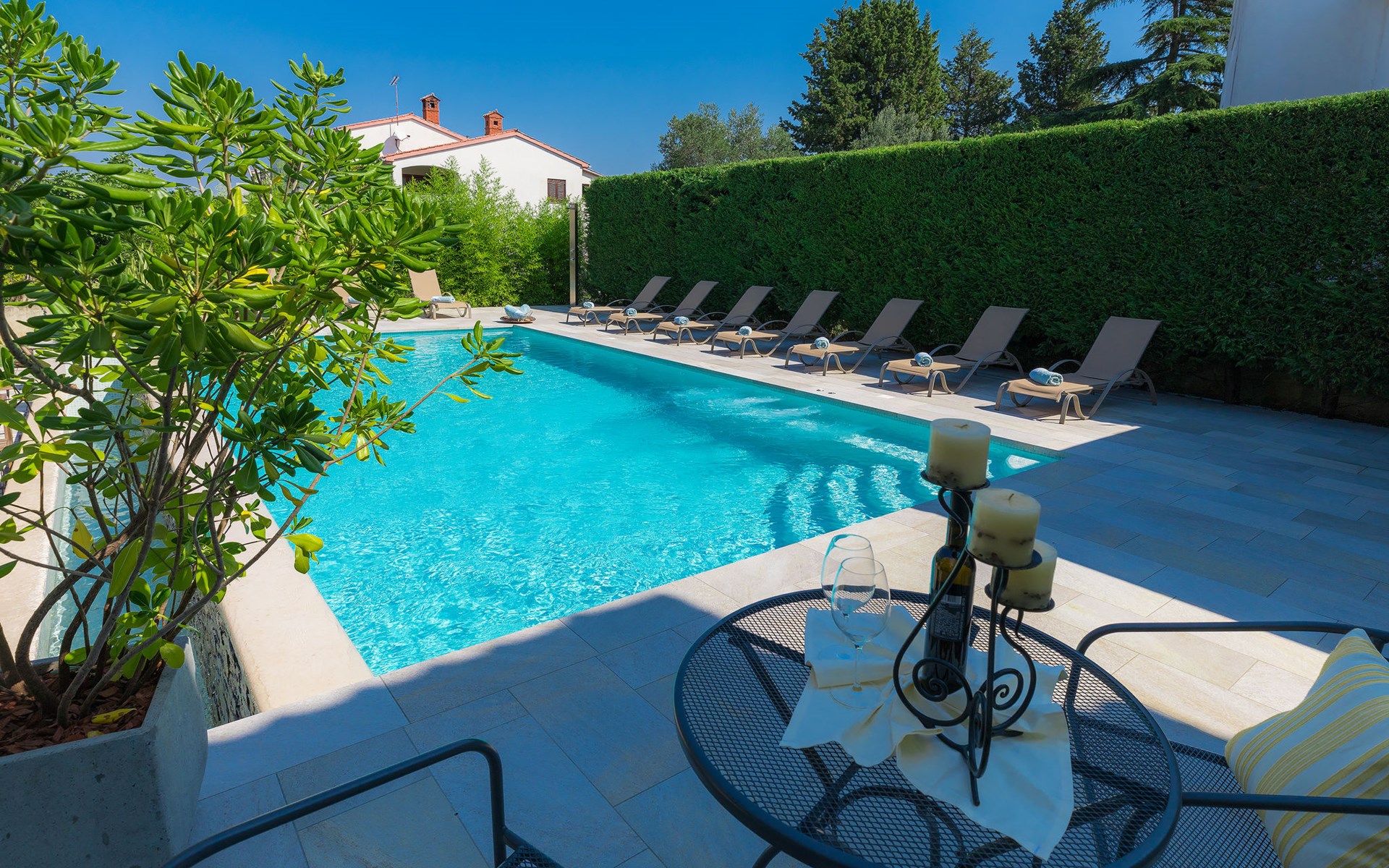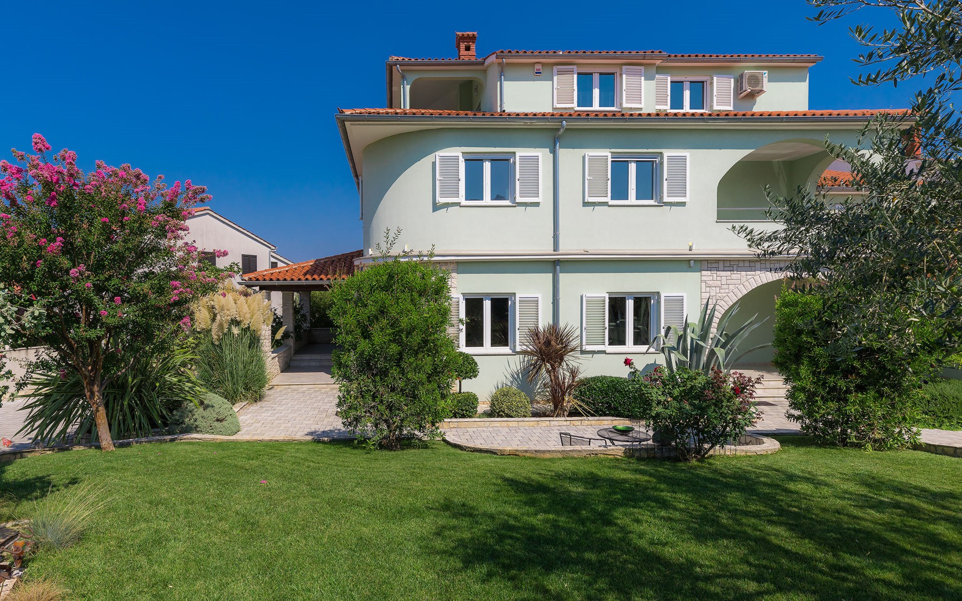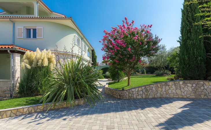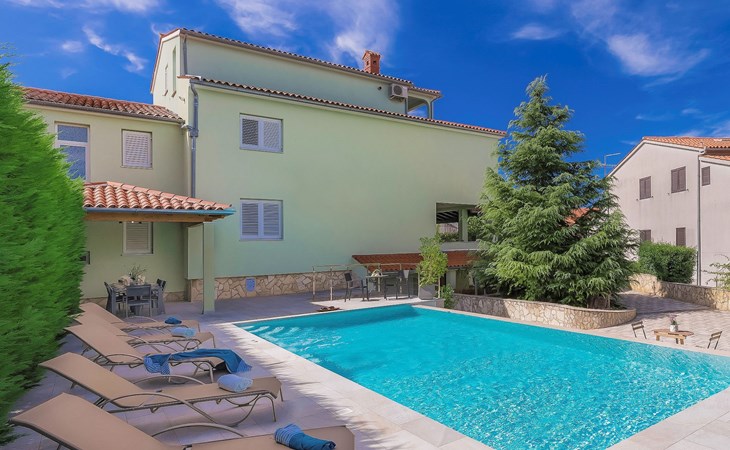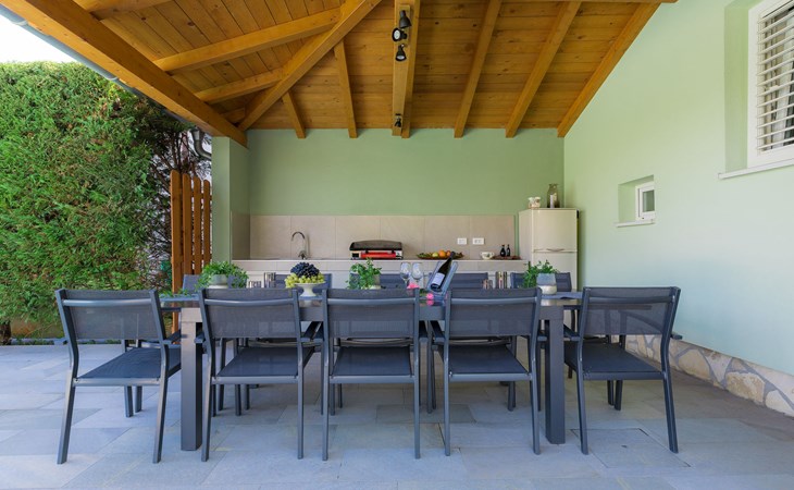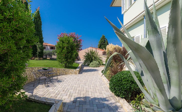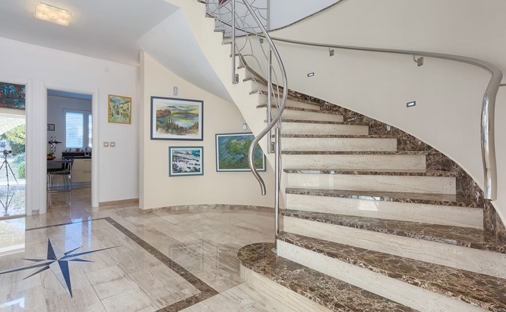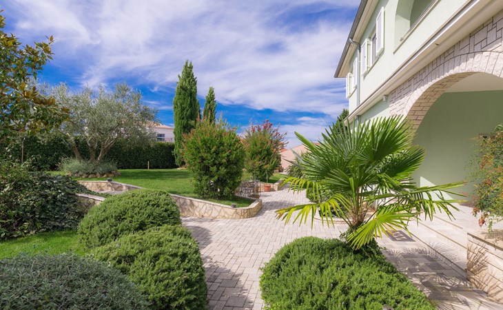 Štinjan 5 km from Pula: Beautiful villa "Salamander", 3 storeys. 3 km from the centre of Fažana, in a sunny position, 1 km from the sea, 1 km from the beach. Private: property 1'300 m2 (fenced) with wildlife garden and flowers, beautiful garden to relax, swimming pool angular (9 x 5 m, depth 140 cm, seasonal availability: 09.May. - 03.Oct.) with internal staircase and salt-electrolysis pool-cleaning system. Shower/WC in the pool area, outdoor shower, terrace (20 m2), garden furniture, children's playground (swing). In the house: internet access, washing machine. Parking (for 2 cars) at the house on the premises. Shop 500 m, restaurant 200 m, bus stop 150 m, pebble beach 1 km, public bathing area 1 km. Golf course (18 hole) 5 km, sailing school 5 km, tennis 500 m, riding stable 4 km, walking paths from the house 500 m, cycle lane 550 m. The owner does not accept any youth groups. Please note: airfield 15 km from the property. Swimming pool with hydromassage. Private:outdoor kitchen (2 hot plates, fridge).