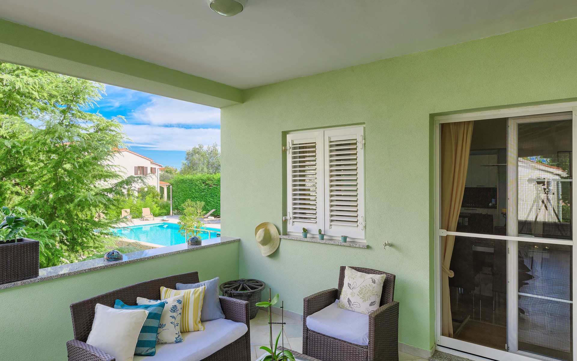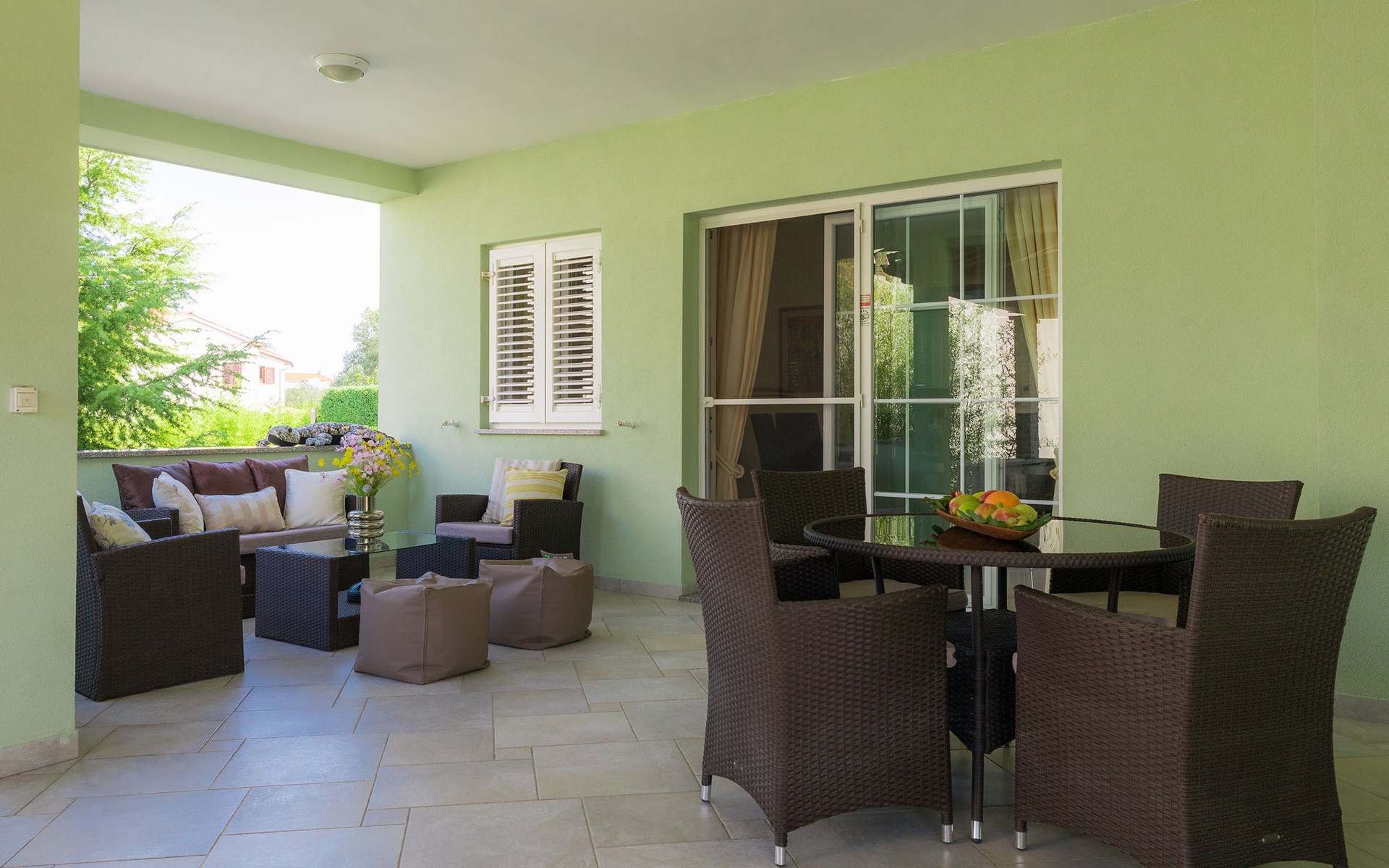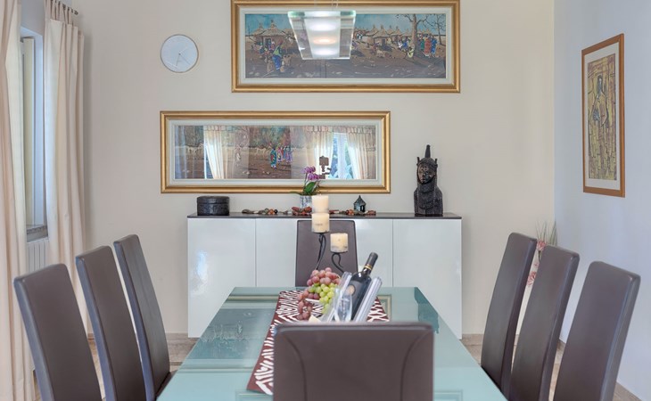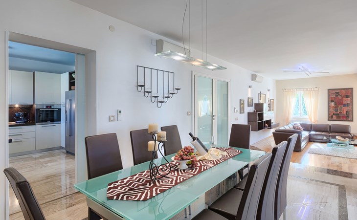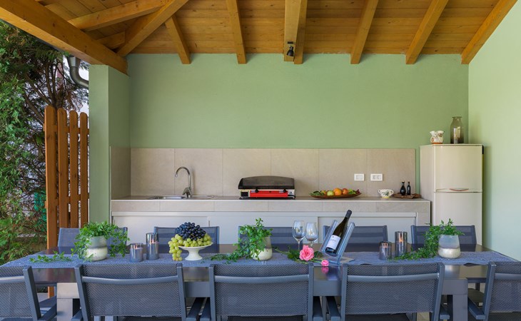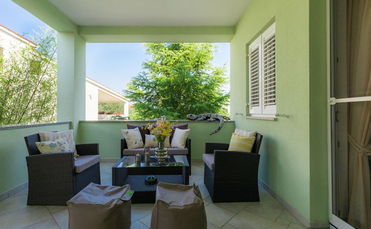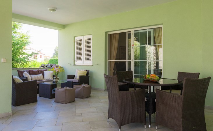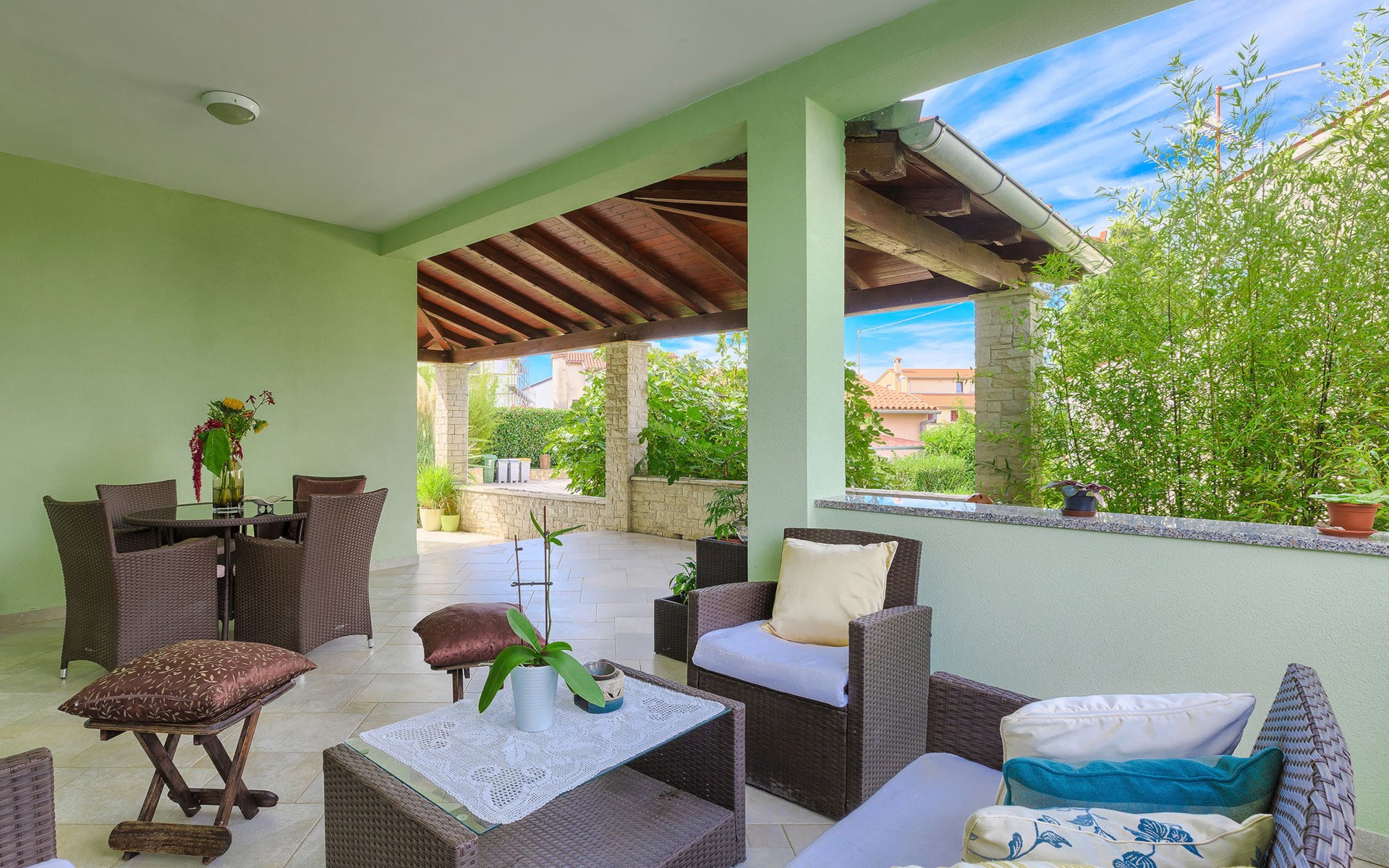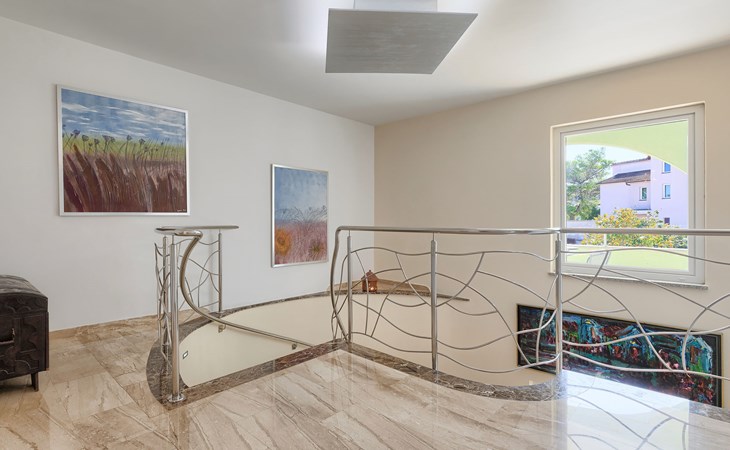 Štinjan 5 km from Pula: Beautiful villa "Salamander", 3 storeys. 3 km from the centre of Fažana, in a sunny position, 1 km from the sea, 1 km from the beach. Private: property 1'300 m2 (fenced) with wildlife garden and flowers, beautiful garden to relax, swimming pool angular (9 x 5 m, depth 140 cm, seasonal availability: 09.May. - 03.Oct.) with internal staircase and salt-electrolysis pool-cleaning system. Shower/WC in the pool area, outdoor shower, terrace (20 m2), garden furniture, children's playground (swing). In the house: internet access, washing machine. Parking (for 2 cars) at the house on the premises. Shop 500 m, restaurant 200 m, bus stop 150 m, pebble beach 1 km, public bathing area 1 km. Golf course (18 hole) 5 km, sailing school 5 km, tennis 500 m, riding stable 4 km, walking paths from the house 500 m, cycle lane 550 m. The owner does not accept any youth groups. Please note: airfield 15 km from the property. Swimming pool with hydromassage. Private:outdoor kitchen (2 hot plates, fridge).