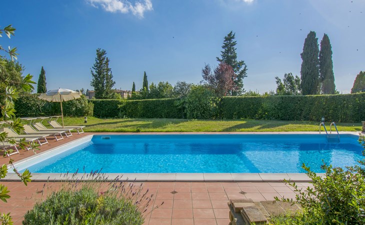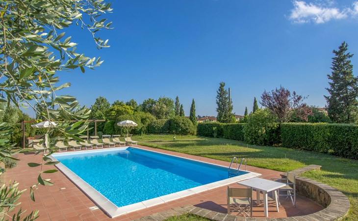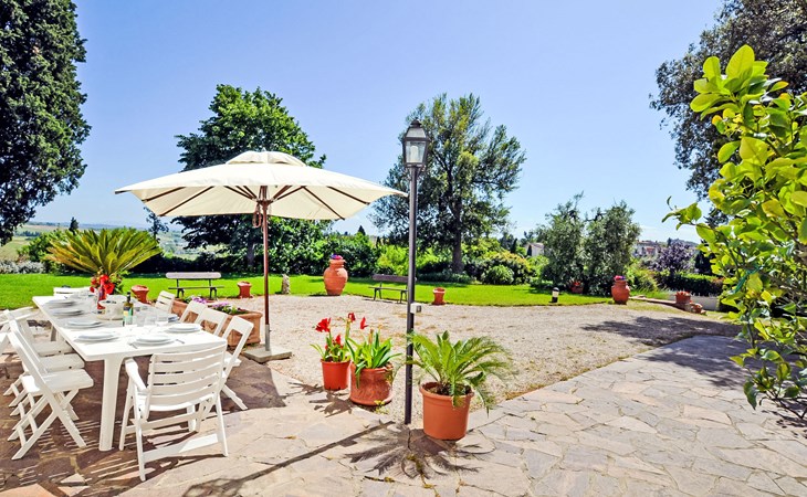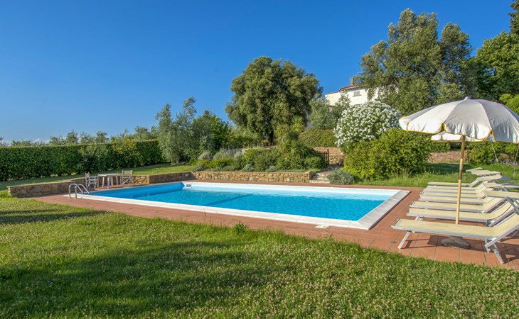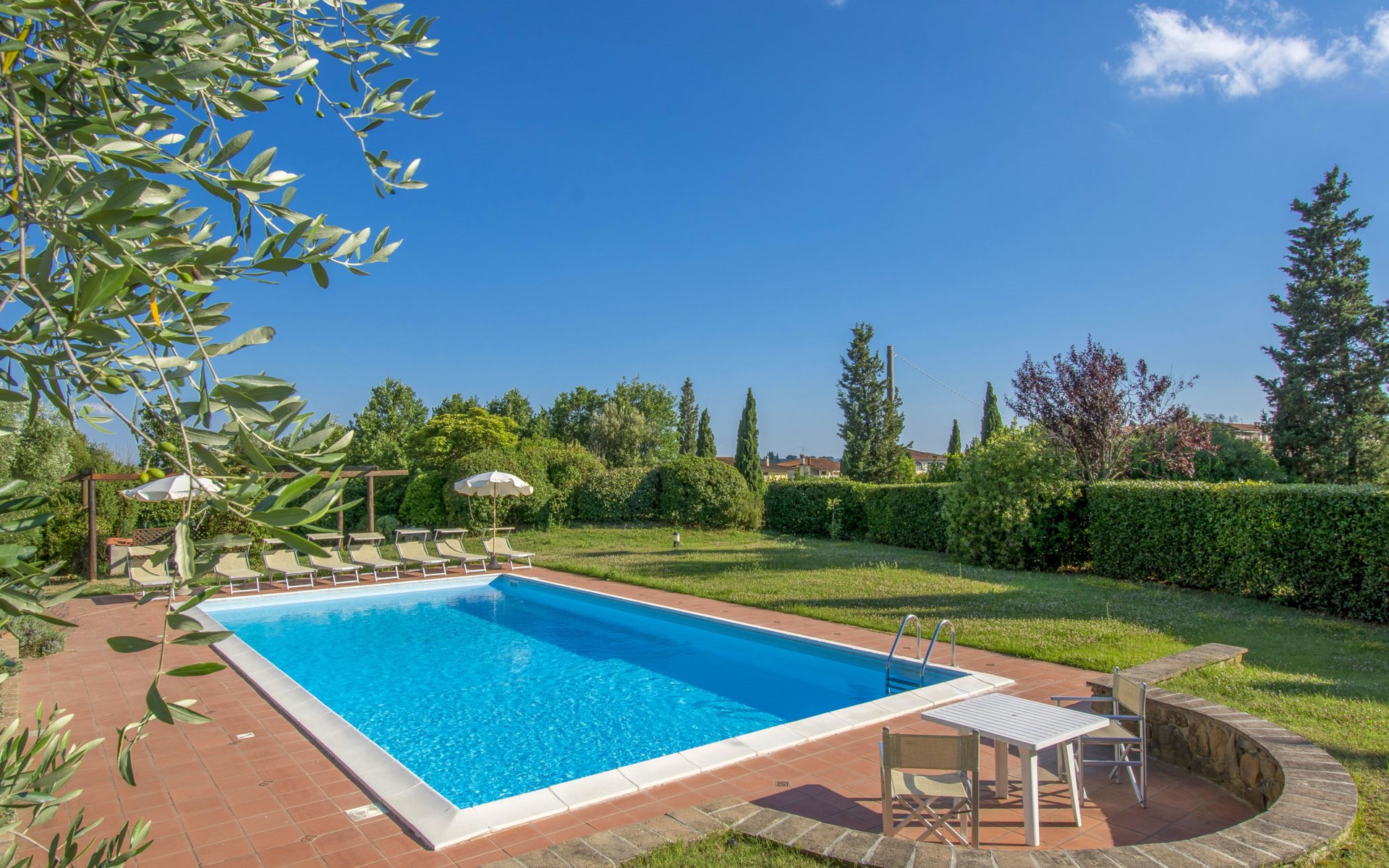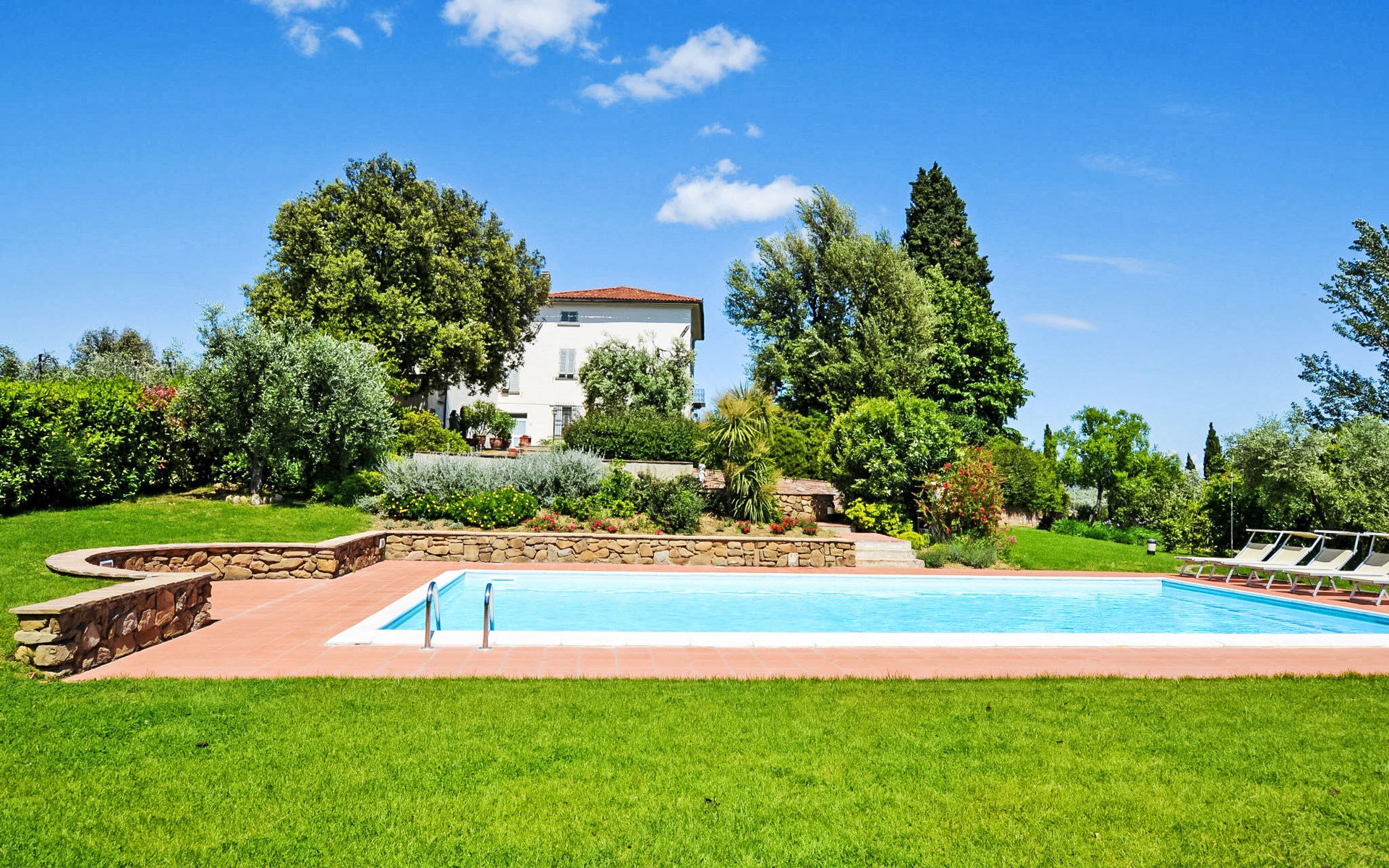 Beautiful villa "di Vinci", renovated, surrounded by fields and vineyards. Outside the resort, on top of a hill. For shared use: property. Private: large, well-kept garden with lawn and flowers, swimming pool (6 x 12 m, depth 140 - 170 cm, seasonal availability: 29.Mar. - 25.Oct.). Outdoor shower, pergola, terrace, garden furniture, barbecue. In the house: internet access, heating to be paid on the spot, heating available only from 29.Mar. - 15.Apr.. Linen change weekly. Room cleaning on request (extra). Cook on request (extra). Parking. Bus stop 200 m, railway station "Empoli" 12 km, sandy beach 50 km. Golf course 5 km, tennis 10 km, riding stable 2 km. Nearby attractions: Pisa 40 km, Firenze 45 km, San Miniato 15 km. Please note: the owner lives on the same property.