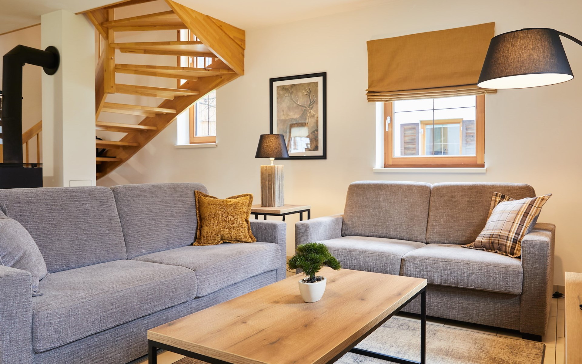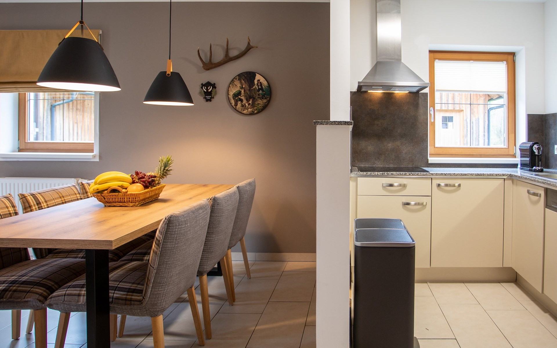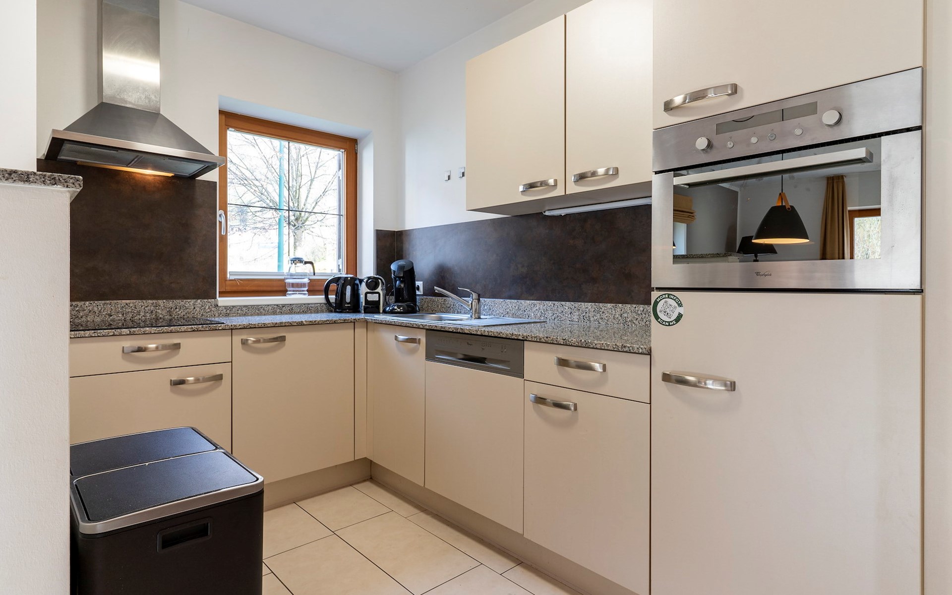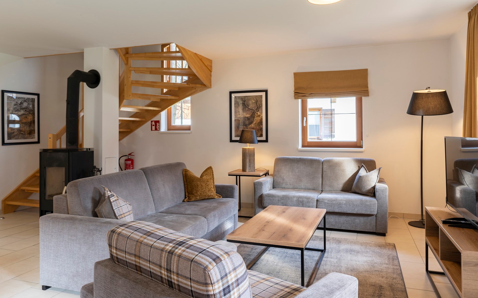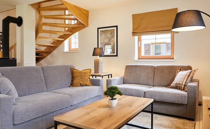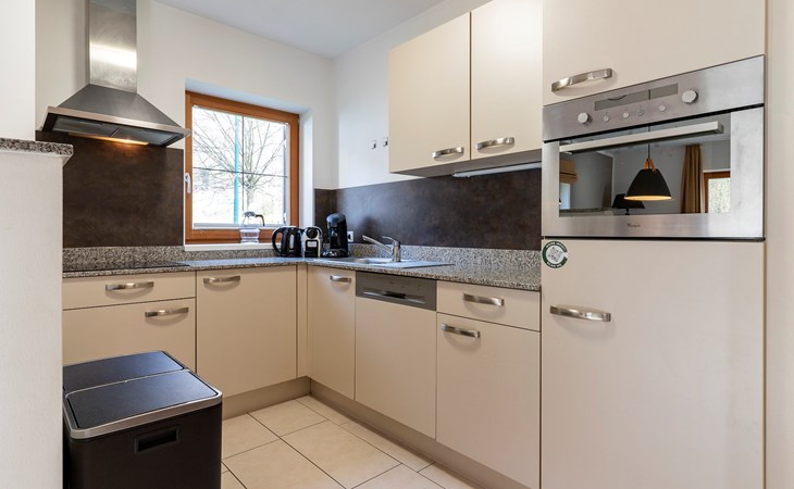 The spacious lounge features a seating area with television. Here you can also sit in front of a cosy fireplace and relax. There is also a dining area with dining table. The kitchen is fully equipped and includes a fridge, combi-oven, dishwasher, kettle, induction hob and a Nespresso machine. From the lounge, there is access to the patio with outdoor furniture.