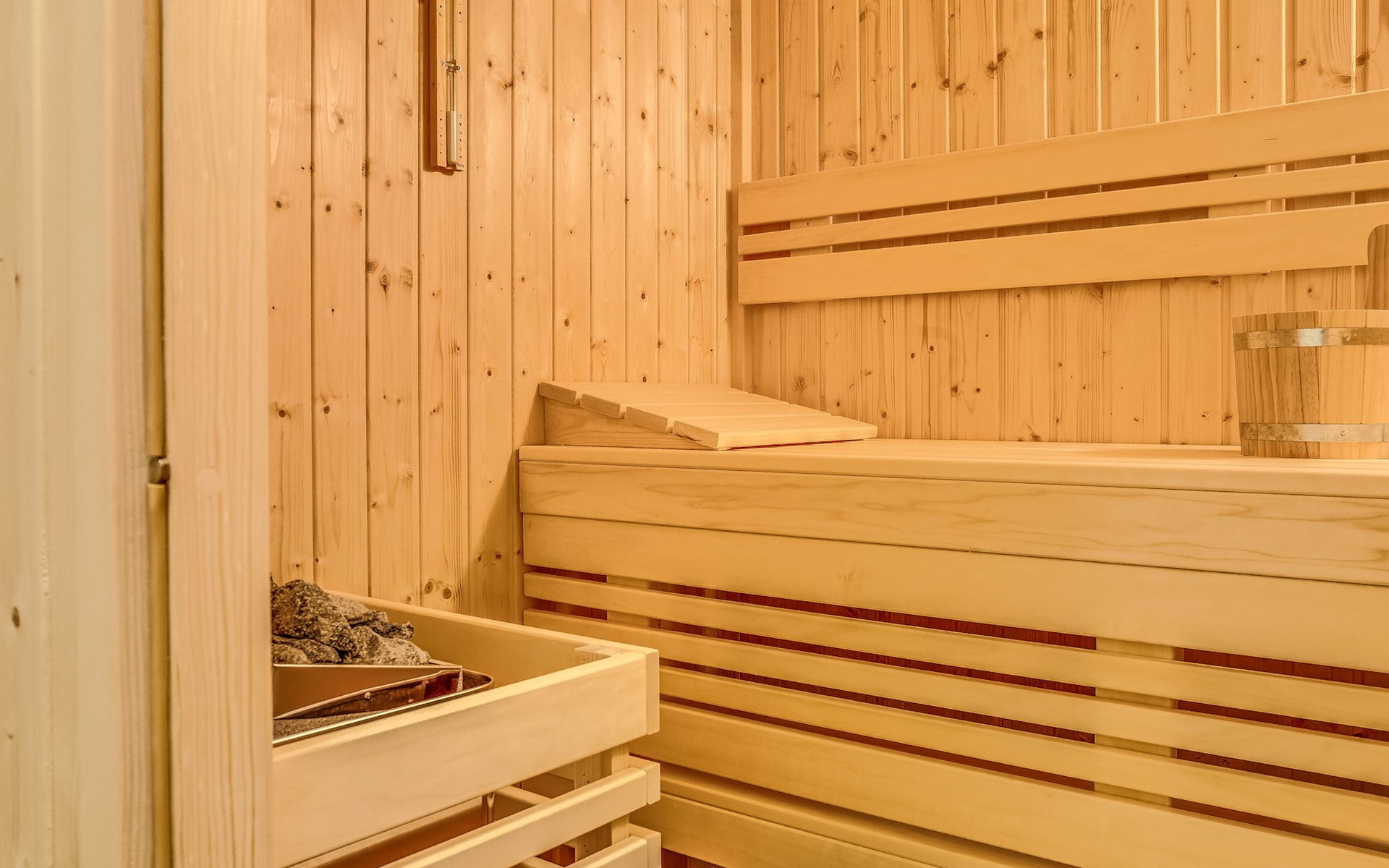 The ground floor features a twin bedroom. The bathroom has a bath, shower, washbasin and toilet. The ground floor also has a sauna with shower room.