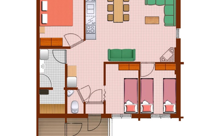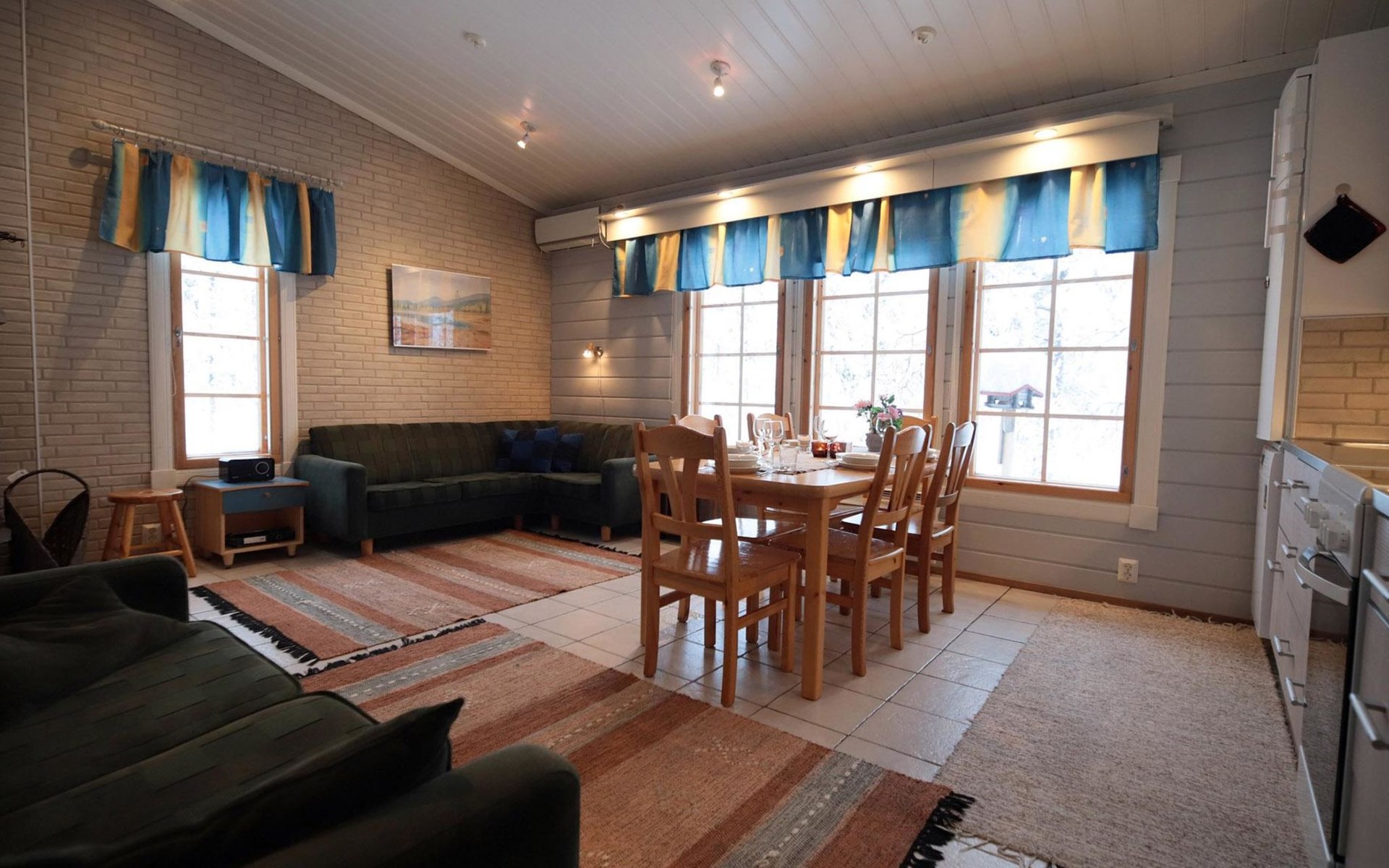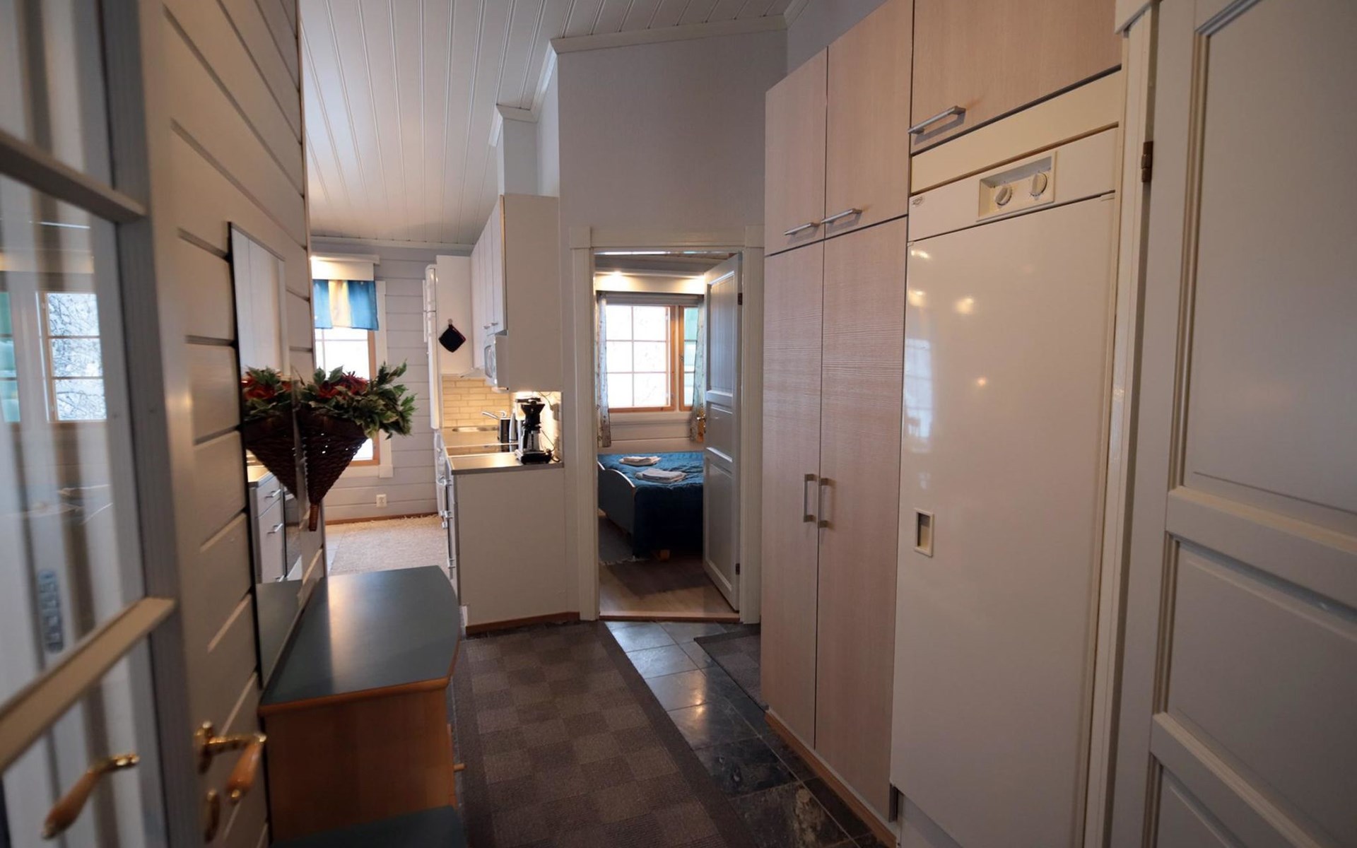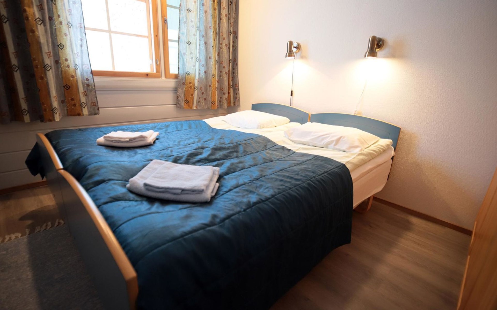 Sleeping accommodation consists of three bedrooms. Two of the bedrooms have two 80 cm wide beds per room. One bedroom has an 80 cm wide bed, under which you can pull out another bed.