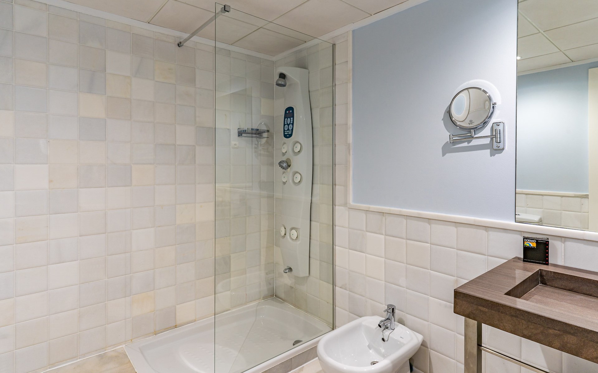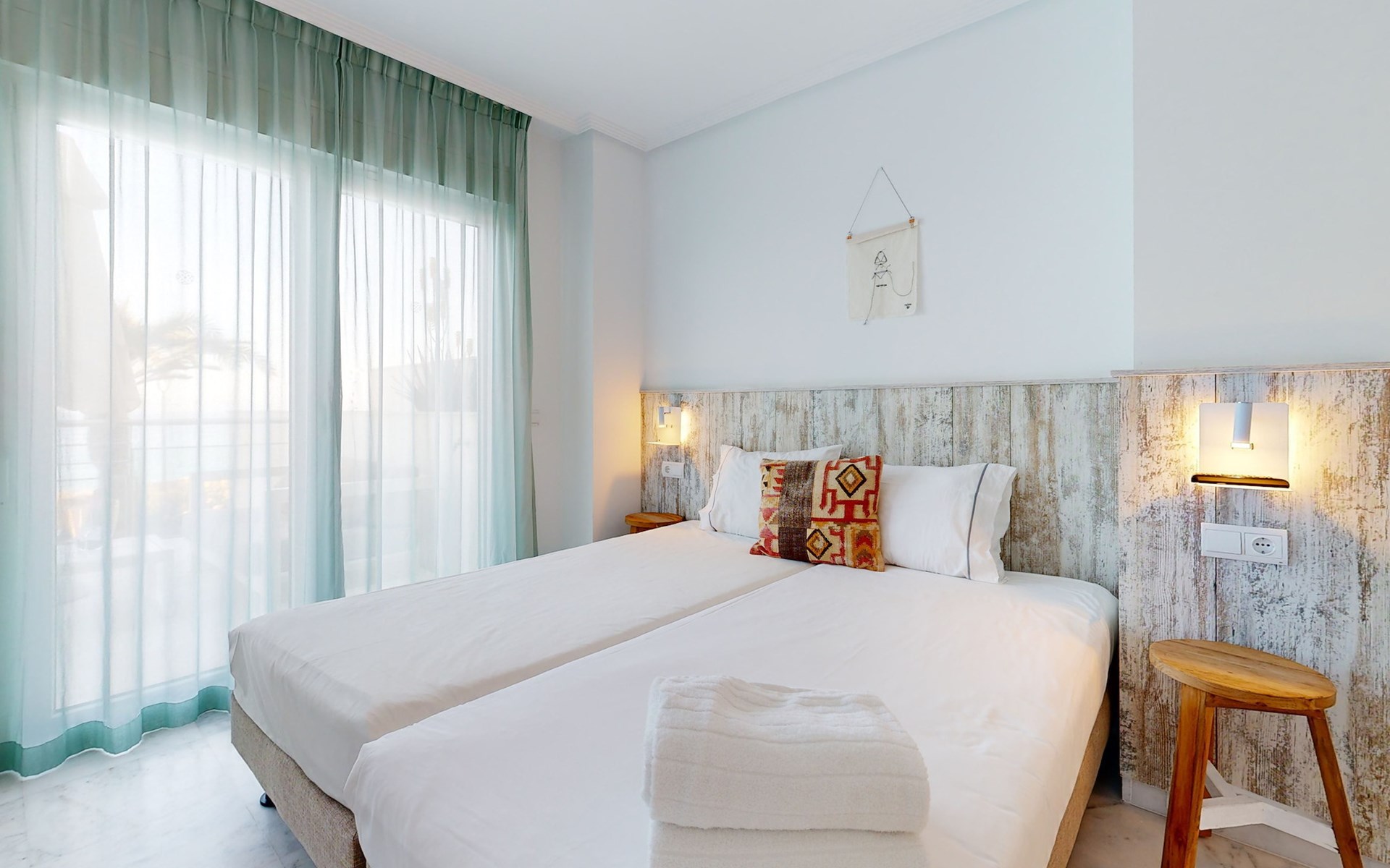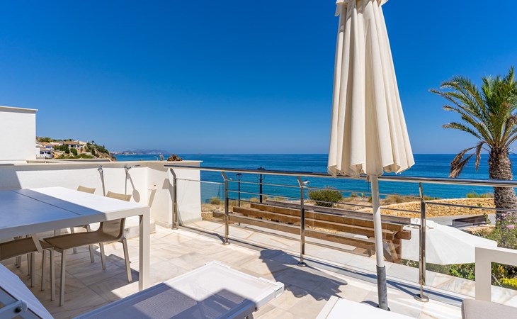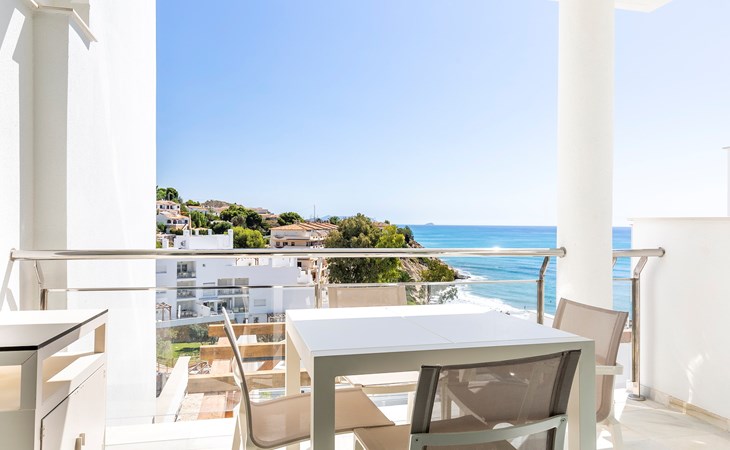The bedroom has two single beds and has an ensuite bathroom with shower, toilet, bidet and washbasin. The luxury apartment has a terrace or balcony, equipped with outdoor furniture. From here, you can enjoy views of the Mediterranean Sea.