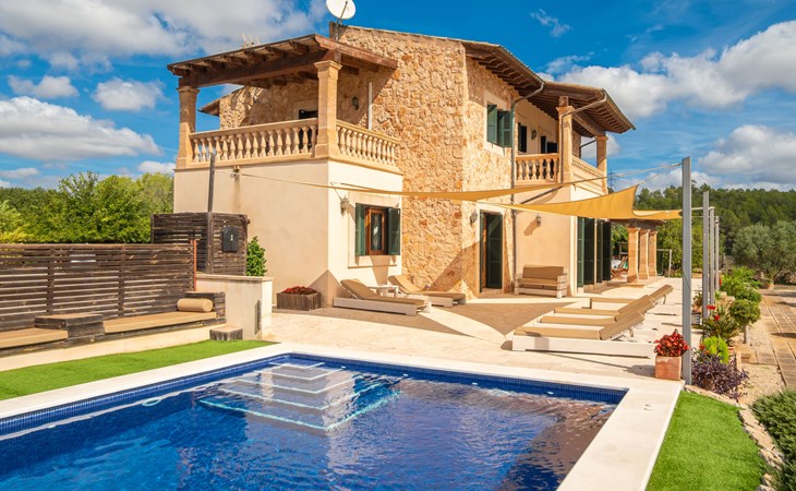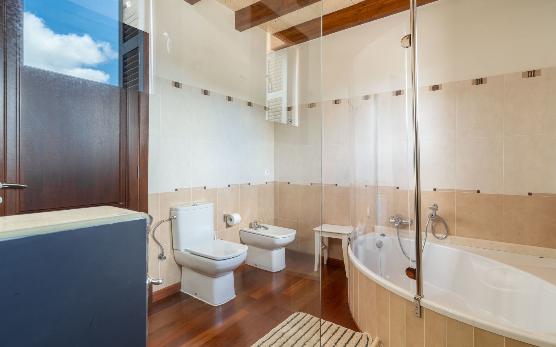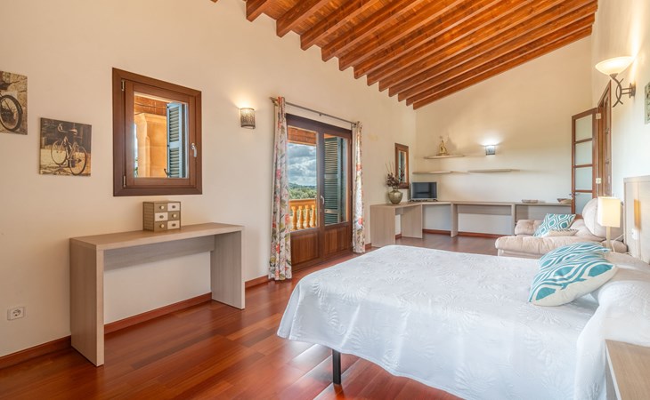 Porreras 10 km from Campos: Large, modern, comfortable farm estate "Son Mainou", 2 storeys, surrounded by fields. Outside the resort, 3.5 km from the centre of Porreres, in a quiet, sunny position, 19 km from the sea, 20 km from the beach, in the countryside. Private: natural state property (fenced), garden with wildlife garden and trees, swimming pool angular (10 x 5 m, depth 120 - 180 cm, seasonal availability: 01.Jan. - 31.Dec.). Outdoor shower, table tennis, patio, arbour, pergola, garden furniture, barbecue, children's playground (slide, swing), pool maintenance by the owner/gardener. In the house: internet access, WiFi, hot tub, table tennis, laundry, washing machine, tumble dryer. Parking at the house on the premises. Supermarket 3.4 km, restaurant 3.3 km, bar 3.3 km, bakery 3.4 km, 35 minute walk to the centre, bus stop "Ronda de l'Estació 1 (43006)" 3.5 km, sandy beach "Arenal de Sa Rà pita - Es Trenc" 25 km. Sports harbour 20.6 km, golf course (18 hole) 29 km, cycle lane 150 m. Nearby attractions: Palma City 43 km, Pueblos de Porreres-Campos-Felanitx, Colonia Sant Jordi 23 km, Portopetro 32 km, Santuario de Lluc 52 km, Santuario de Montision 3.9 km. Hiking paths: Serra de Tramuntana. Please note: car recommended, no lift. Suitable for families. Object suitable for 6 adults. The owner does not accept any youth groups. On the estate animal husbandry. Airfield 40 km from the property. The tap water has no drinking water quality.