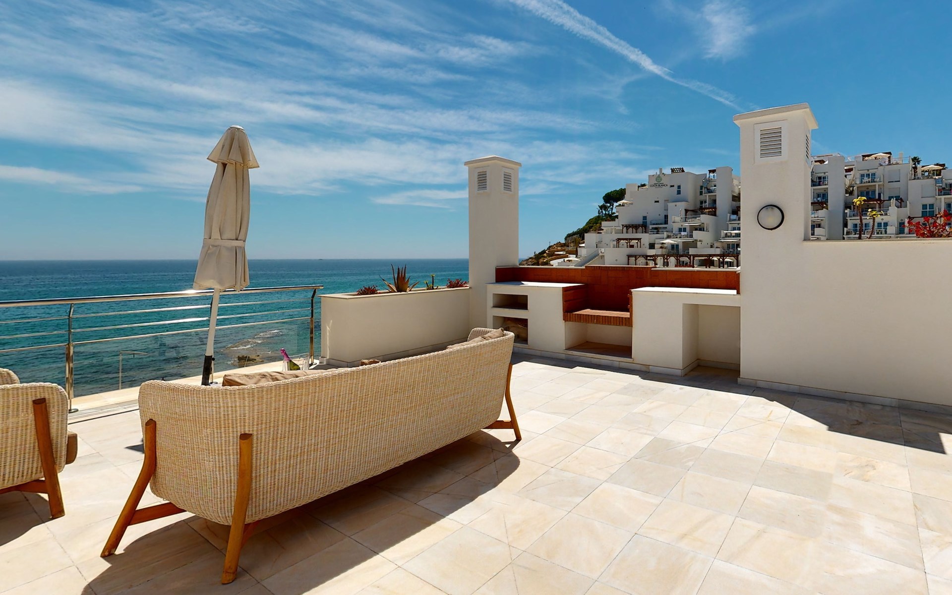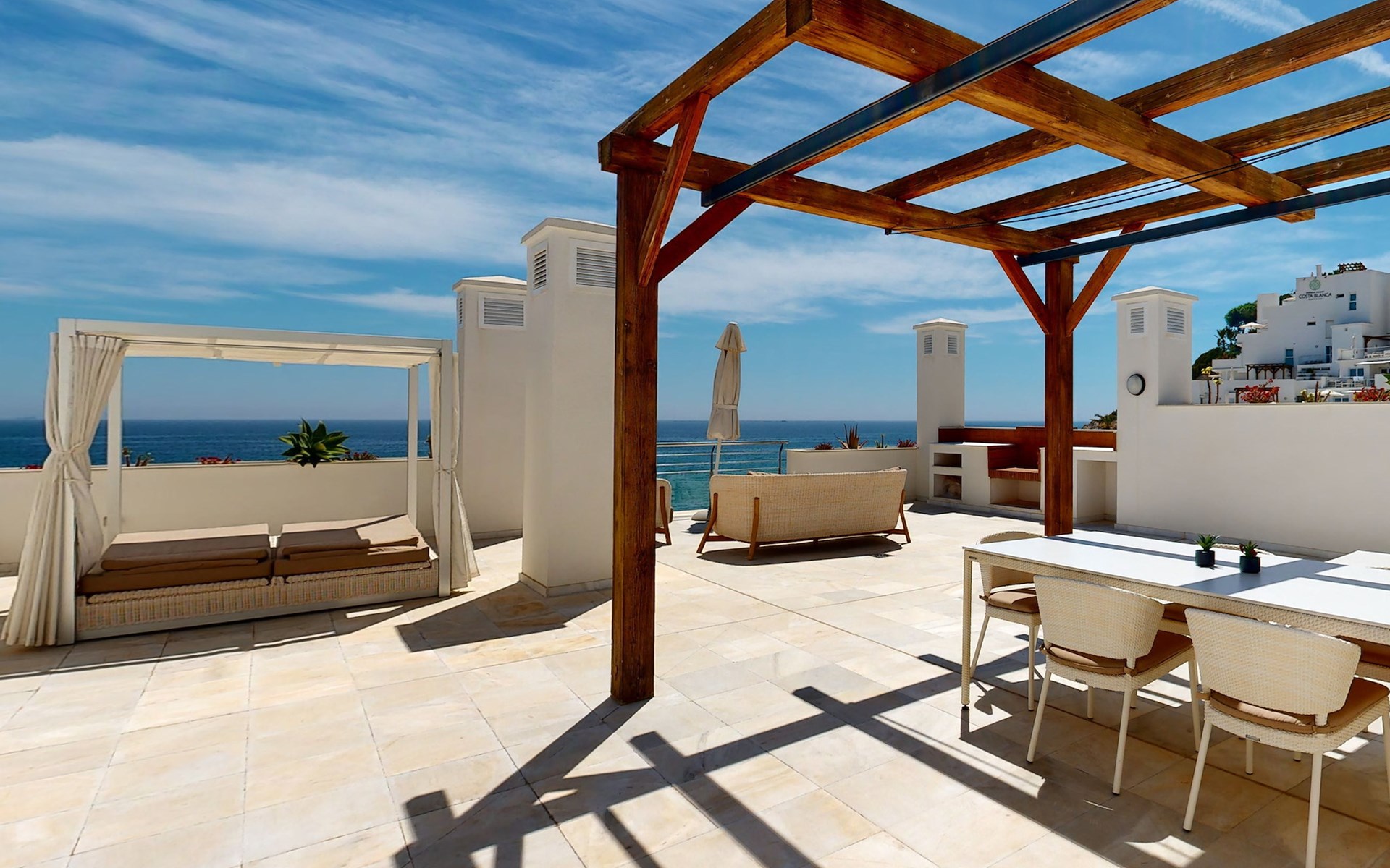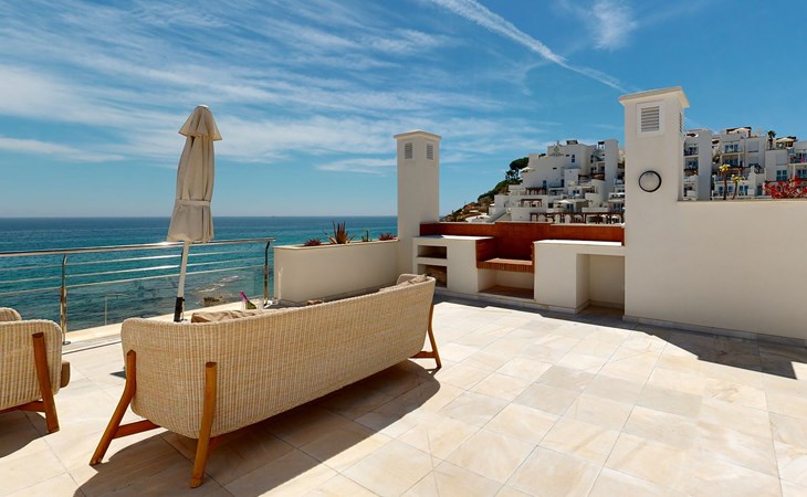 The apartment has two bedrooms, each with two single beds. One bedroom has an adjoining bathroom with bath or shower, toilet, bidet and washbasin. One of the bathroom has a whirlpool bath. From the lounge and master bedroom, there is access to a very spacious terrace with outdoor furniture and a pergola. From this spacious terrace, there are impressive panoramic views over Cala Lanuza and the Mediterranean.