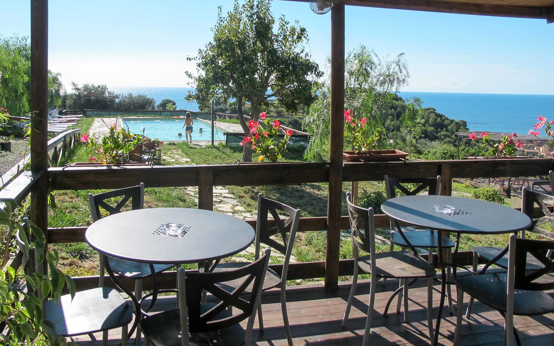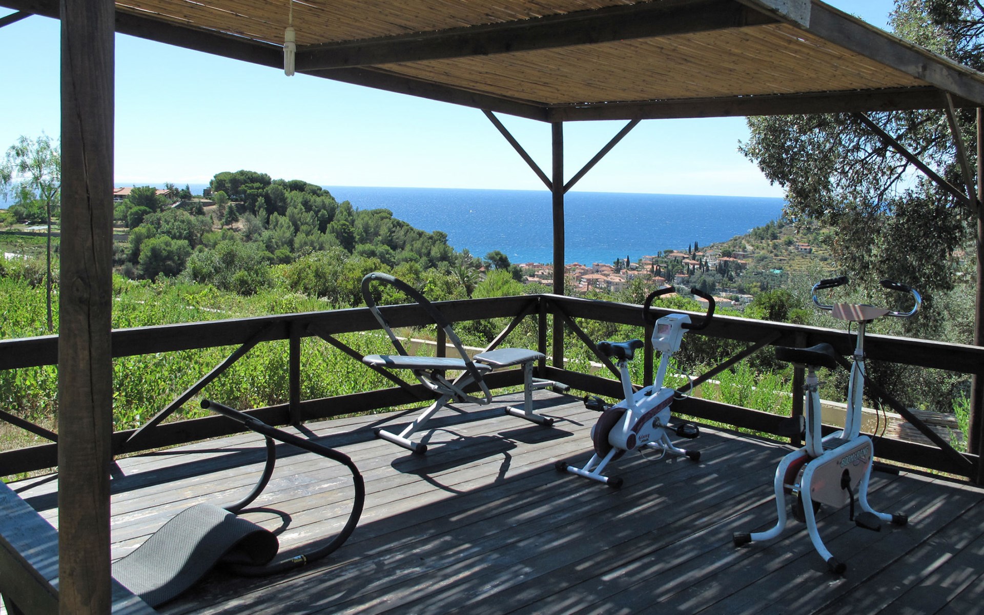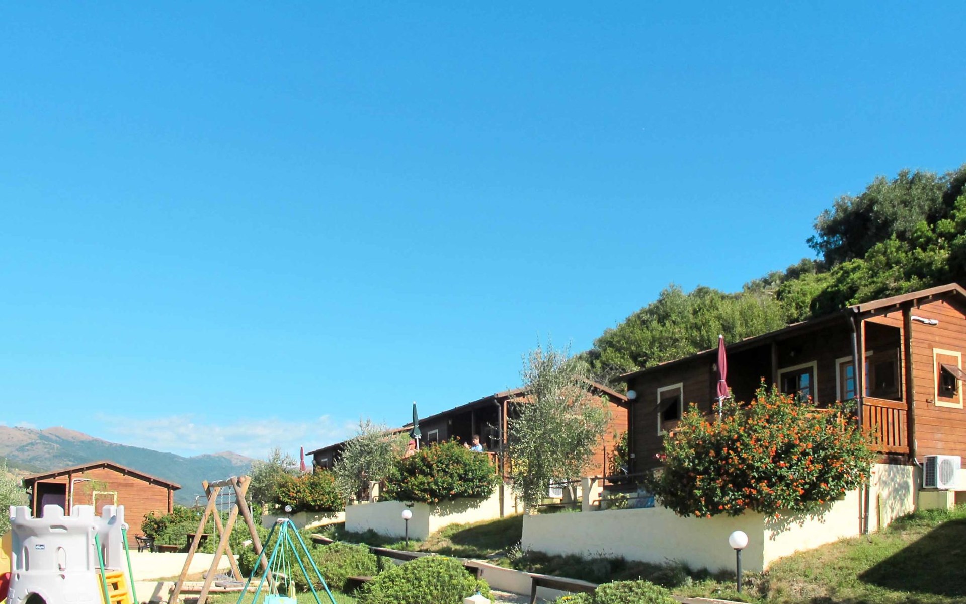 Small, beautiful resort "Le Terrazze del Geco", surrounded by fields and vineyards. 6 houses in the residence. Above San Lorenzo al Mare 1 km from the centre of San Lorenzo al Mare, 7 km from the centre of Imperia, 20 km from the centre of San Remo, in a sunny position on a slope, 1.5 km from the sea. For shared use: natural state property 3'600 m2 with lawn and plants, lawn for sunbathing, swimming pool (15 x 6 m, depth 140 cm, seasonal availability: 01.Jan. - 31.Dec.) with salt-electrolysis pool-cleaning system. Shower/WC in the pool area, outdoor shower, pergola, children's playground (slide, swing). In the complex: table tennis, table football, washing machine (for shared use). Steep, narrow motor access (500 m via unmade road). Parking (for 6 cars) on the premises. Supermarket 1 km, bus stop 7.6 km, sandy beach "San Lorenzo al Mare" 1.5 km. Local sale of farm products.