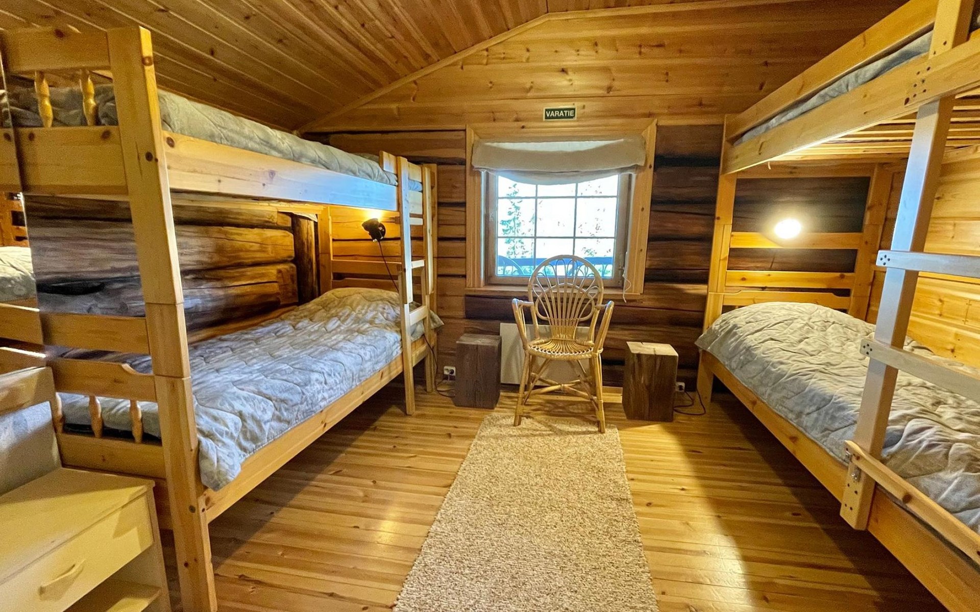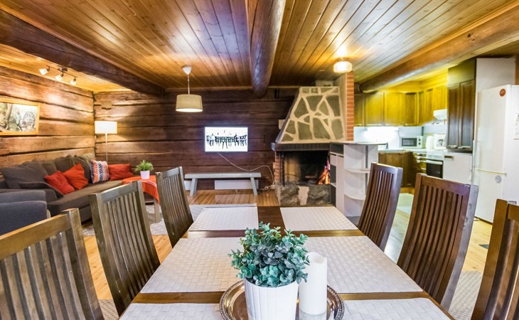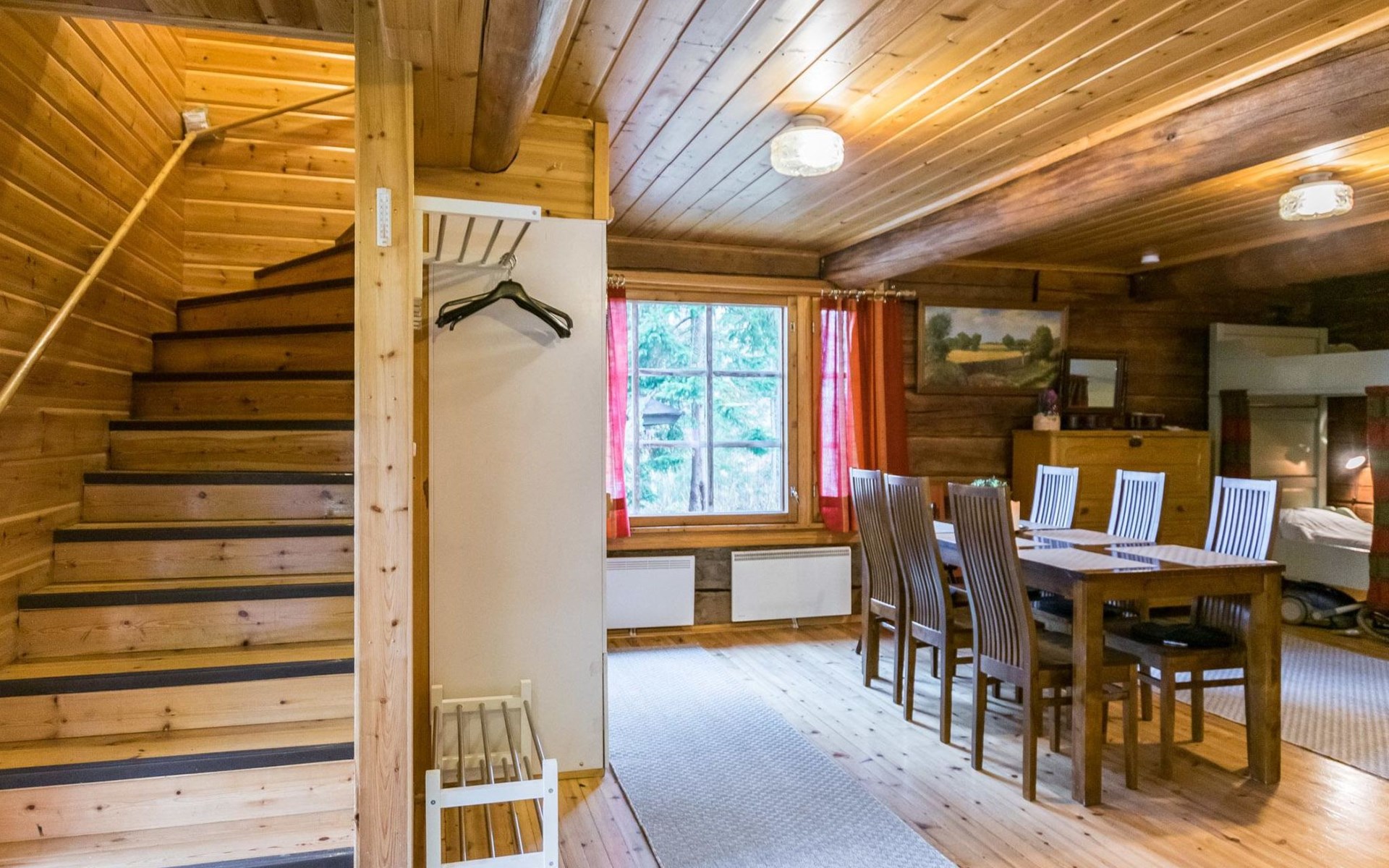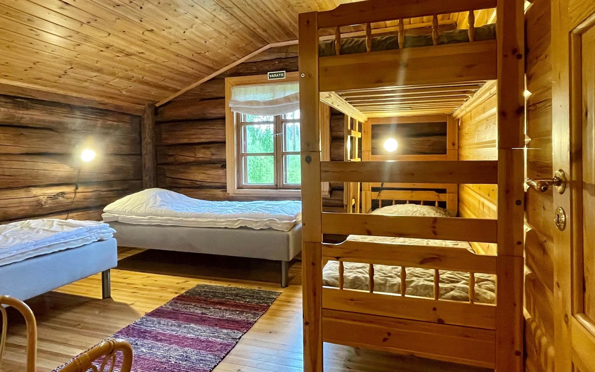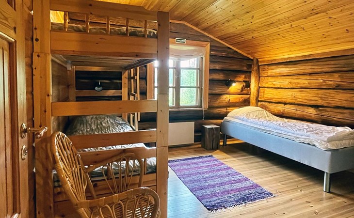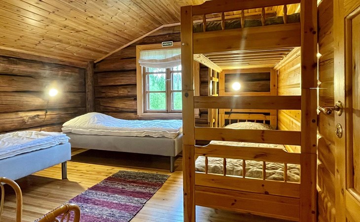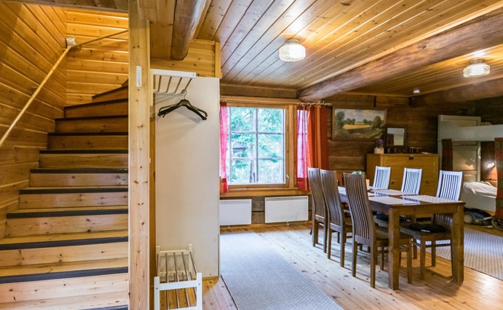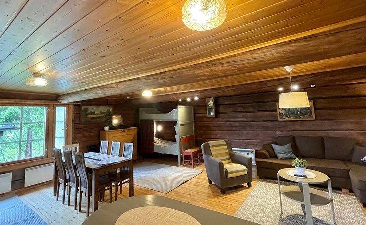 Log-built cabin on two floors, built in 1991, spacious living room, WC, another WC upstairs with shower, three bedrooms. Bedroom 1: three beds, bedroom 2: two beds and one extra bed (upper bed of bunk bed), bedroom 3: two beds. The cabin has more beds, however, the maximum number of guests is eight people. Other beds are for alternative use.