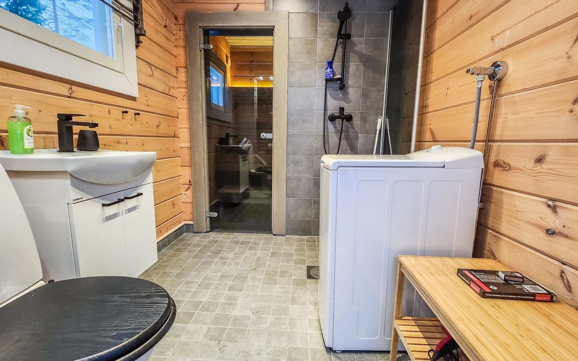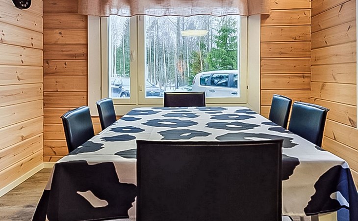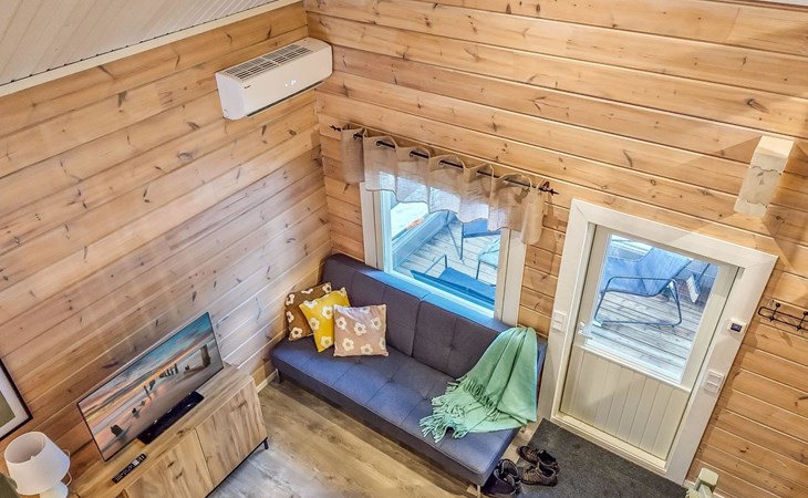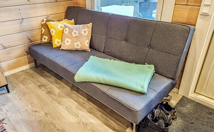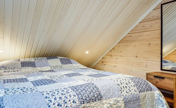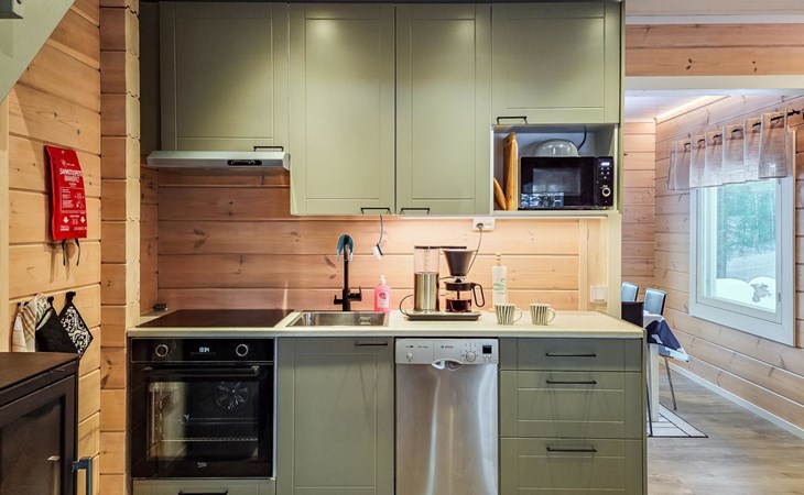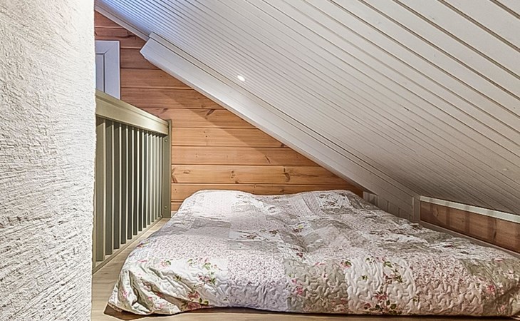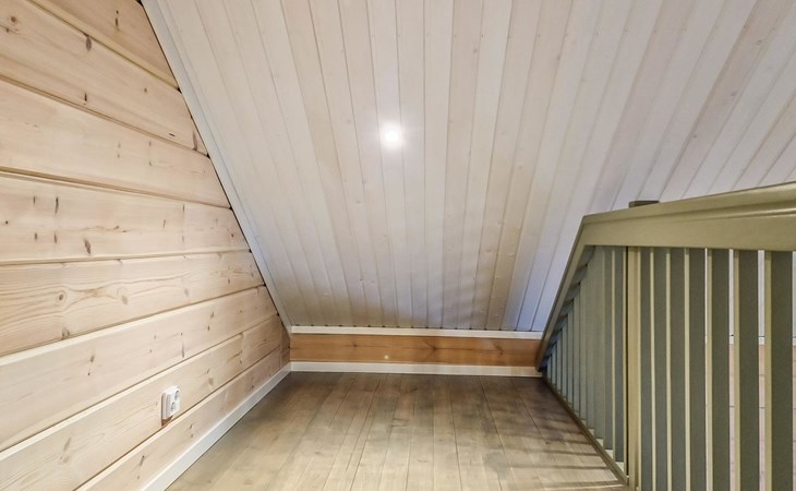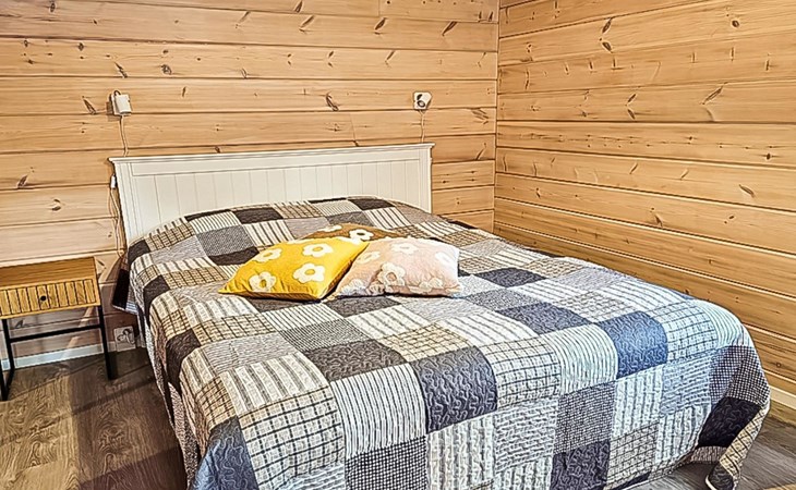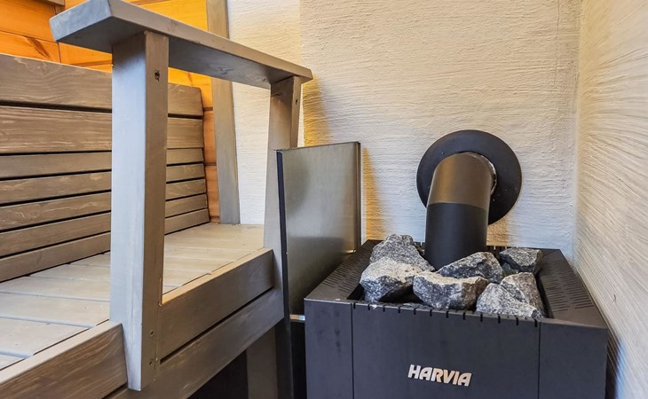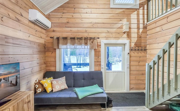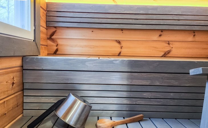The cabin features two bedrooms, one on the ground floor and another on the upper floor, both furnished with double beds. The living room/kitchen includes a sofa bed that accommodates two guests. Additionally, the loft has a 140 cm wide mattress. However, the cabin is rented out for a maximum of 6 guests. The wood-heated sauna provides a soothing and relaxing steam experience. The dressing room includes a WC and a washing machine.