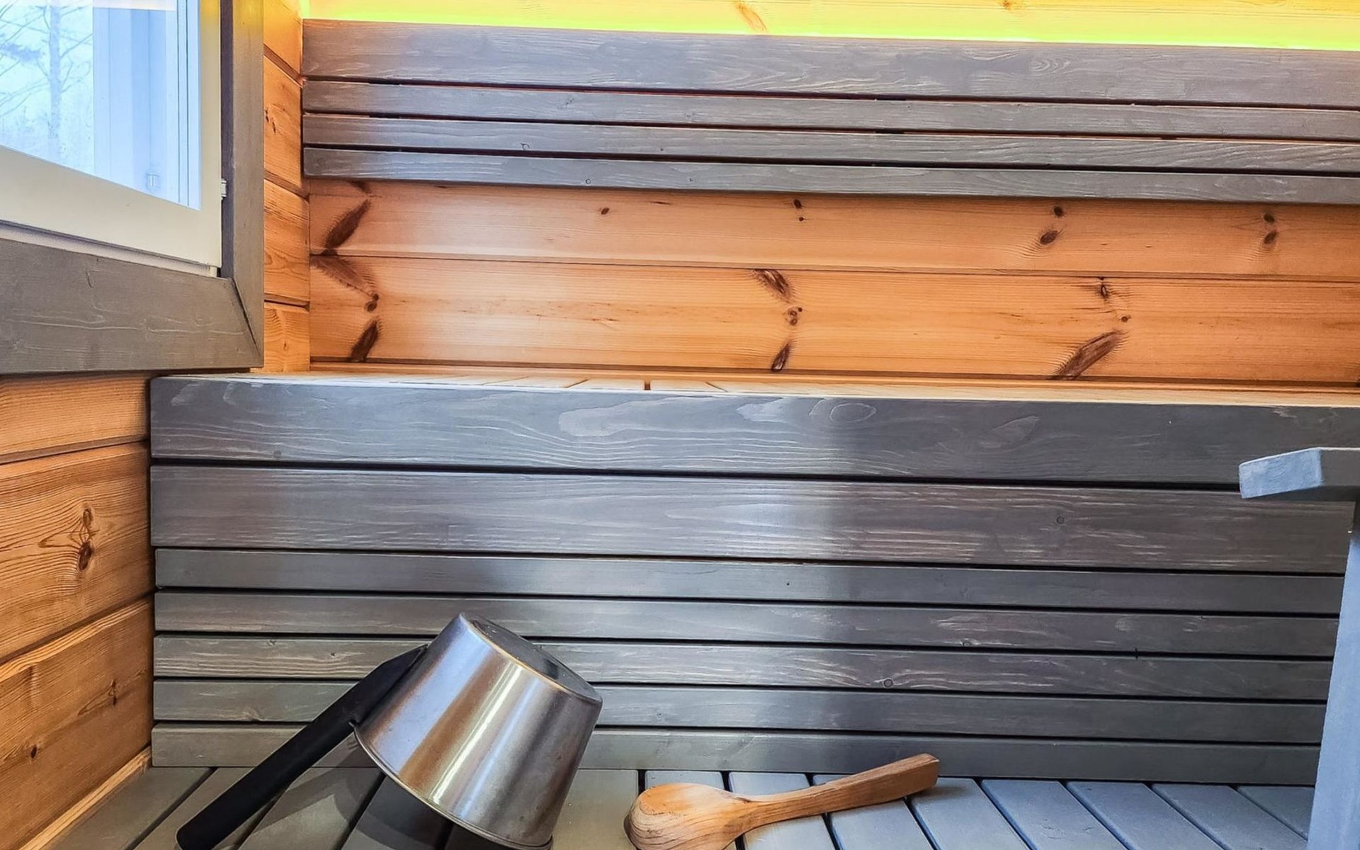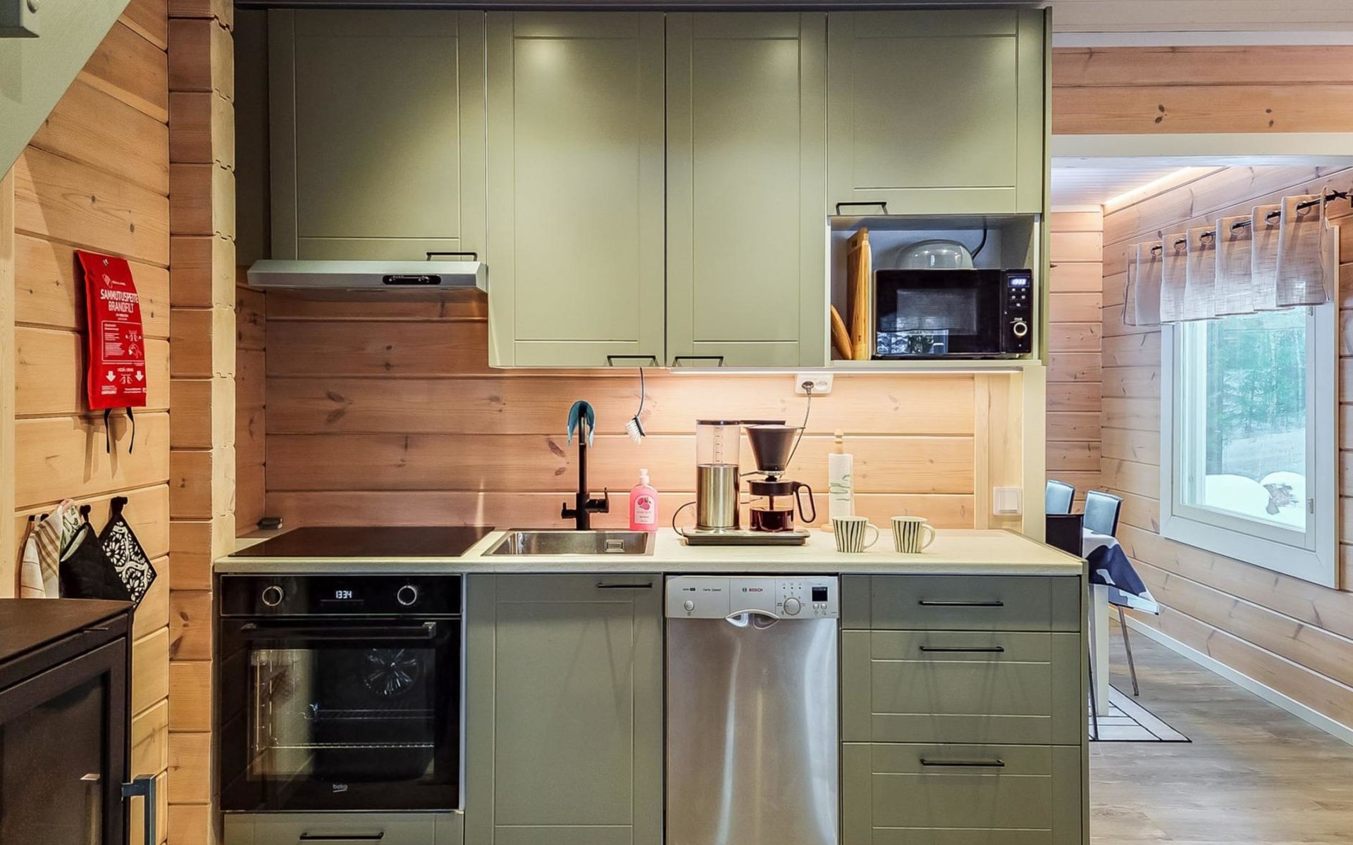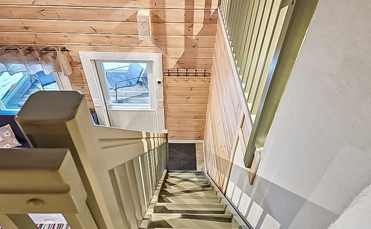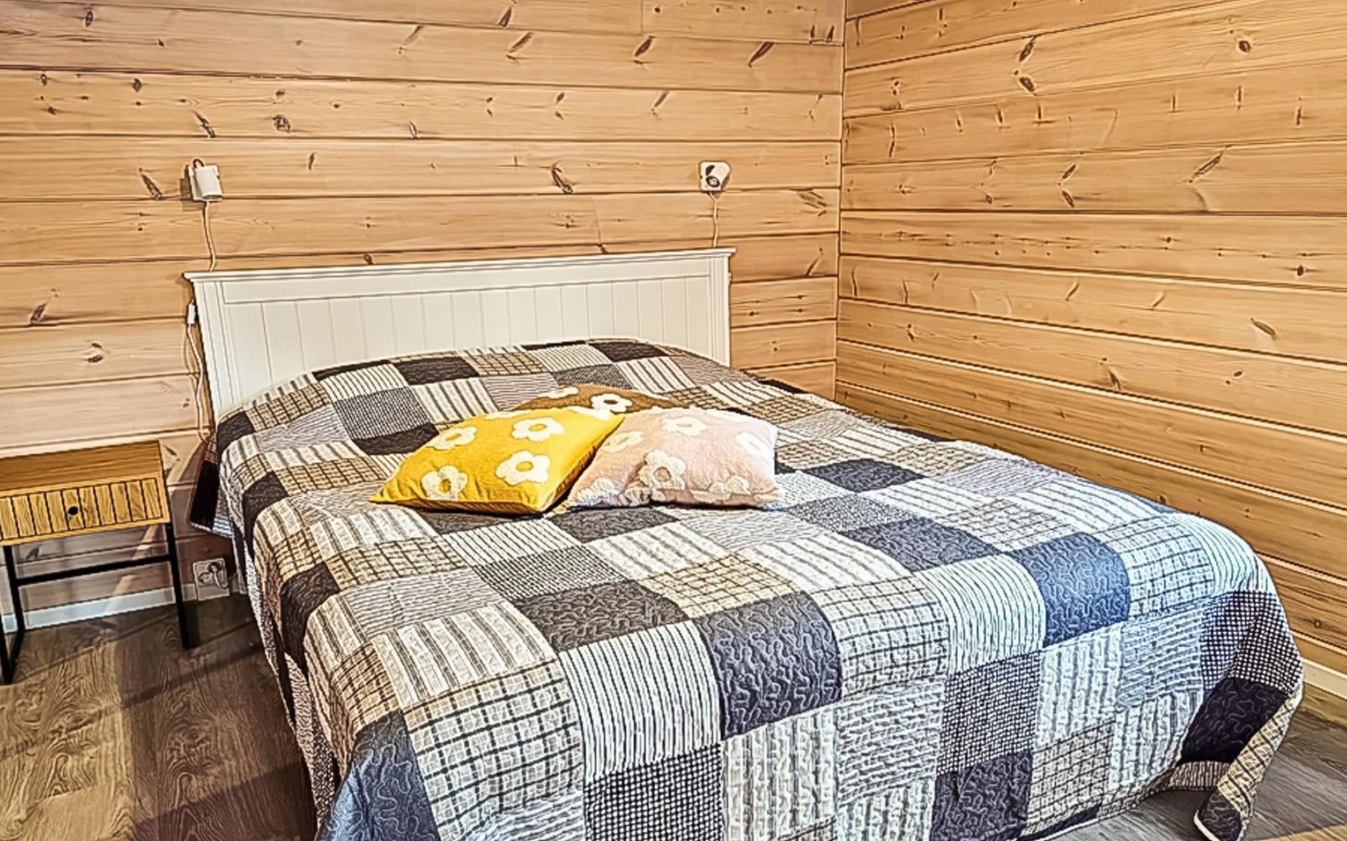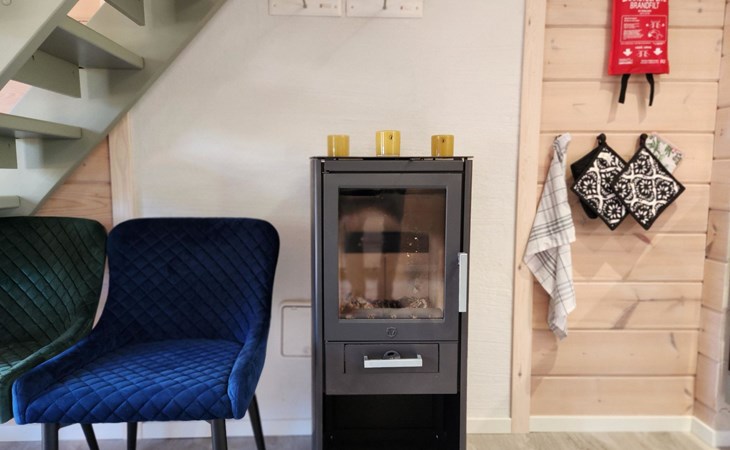 The cabin features two bedrooms, one on the ground floor and another on the upper floor, both furnished with double beds. The living room/kitchen includes a sofa bed that accommodates two guests. Additionally, the loft has a 140 cm wide mattress. However, the cabin is rented out for a maximum of 6 guests. The wood-heated sauna provides a soothing and relaxing steam experience. The dressing room includes a WC and a washing machine.