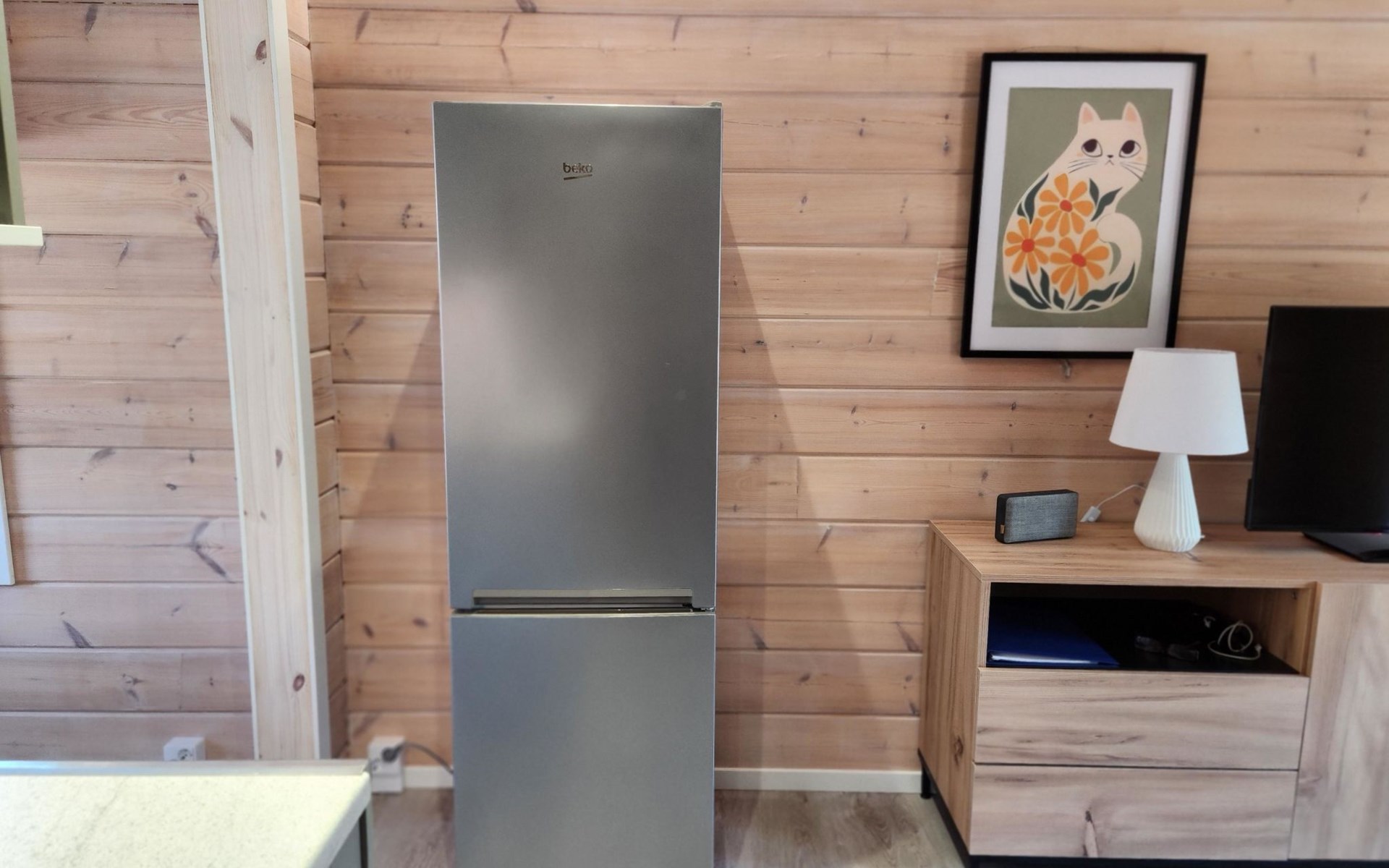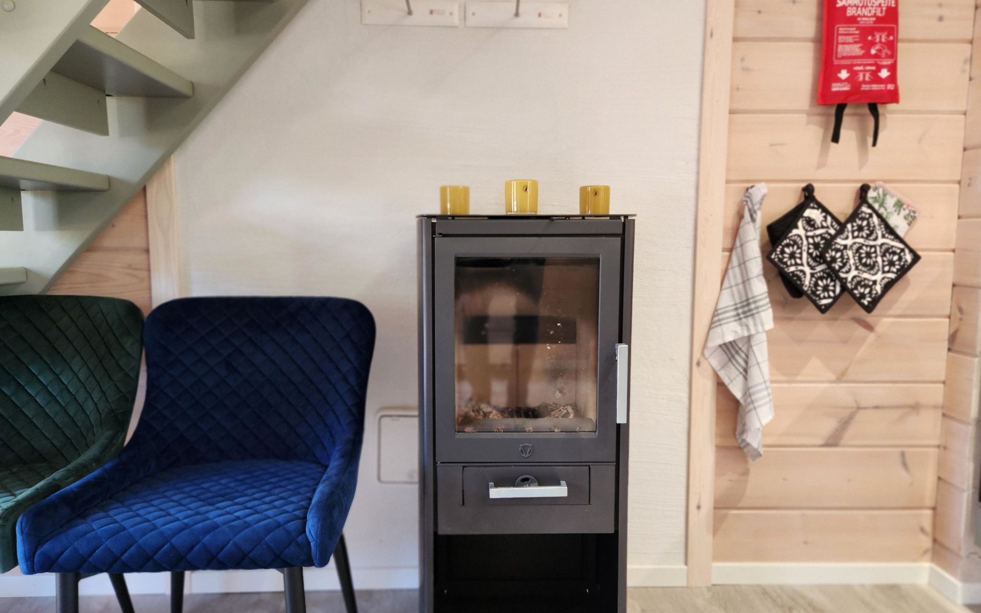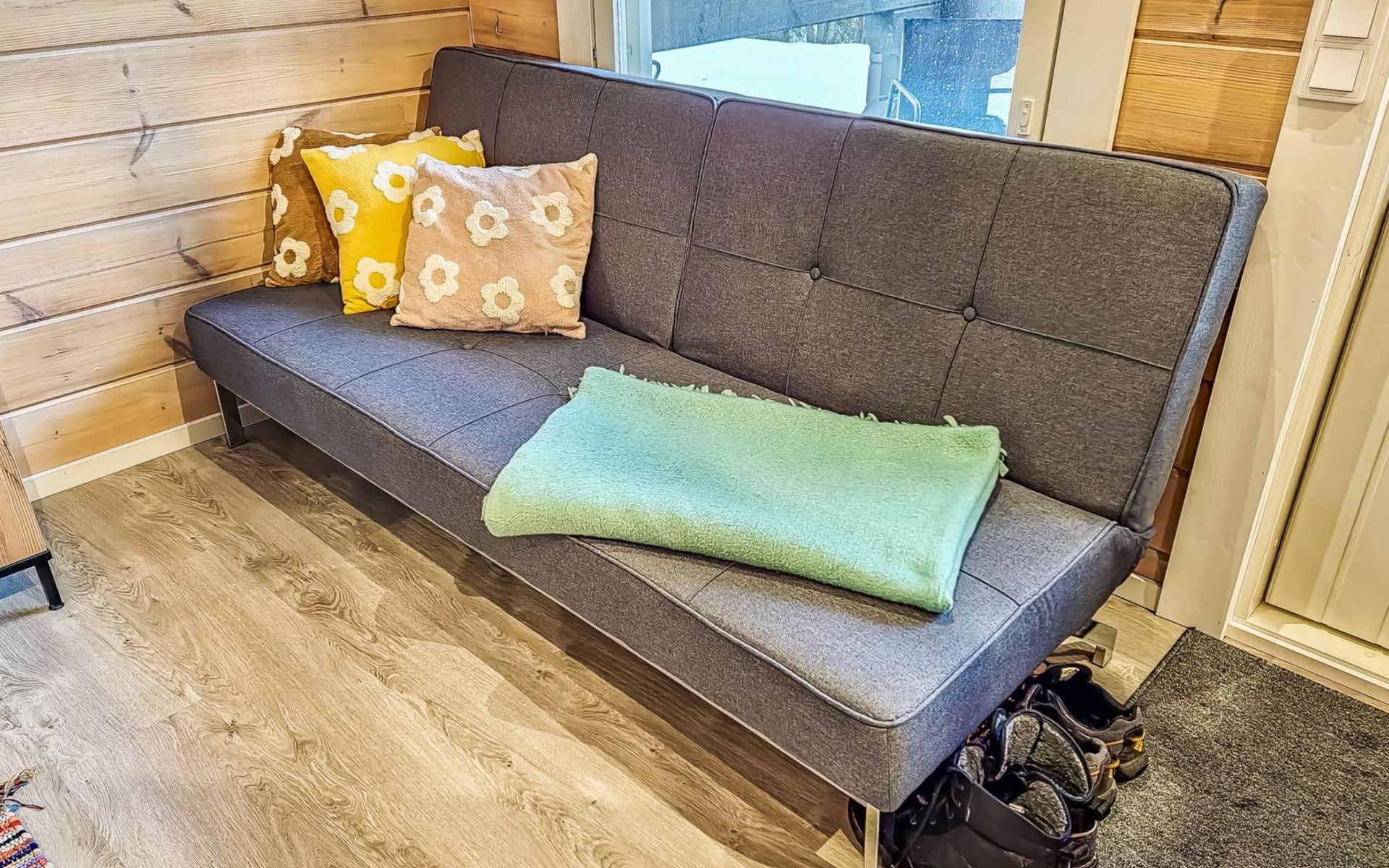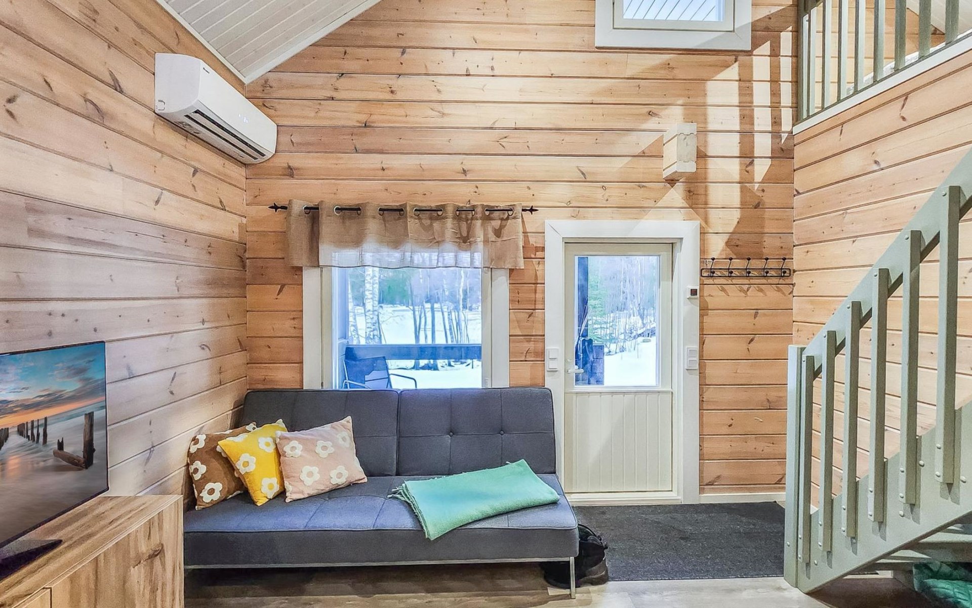 The cabin features two bedrooms, one on the ground floor and another on the upper floor, both furnished with double beds. The living room/kitchen includes a sofa bed that accommodates two guests. Additionally, the loft has a 140 cm wide mattress. However, the cabin is rented out for a maximum of 6 guests. The wood-heated sauna provides a soothing and relaxing steam experience. The dressing room includes a WC and a washing machine.