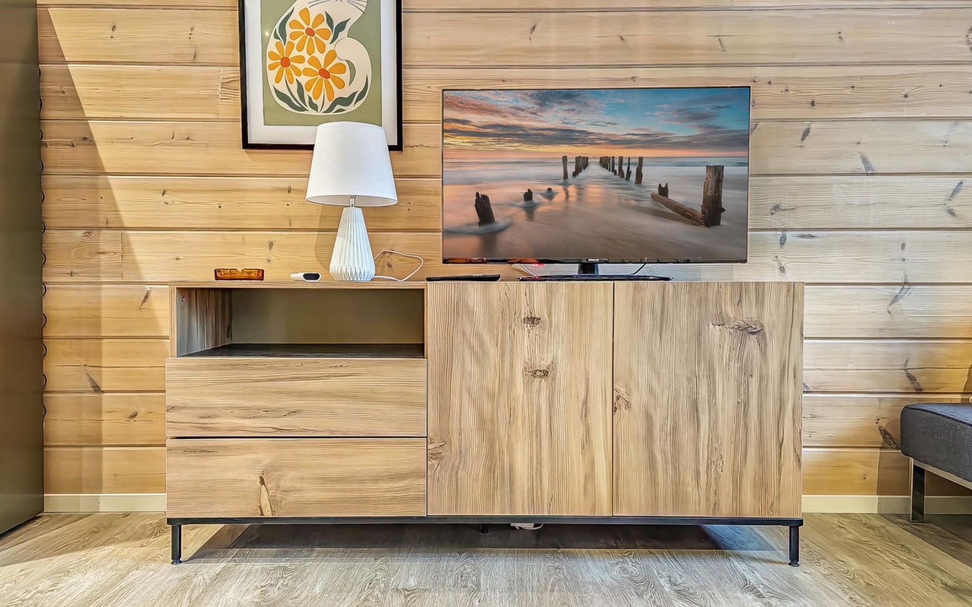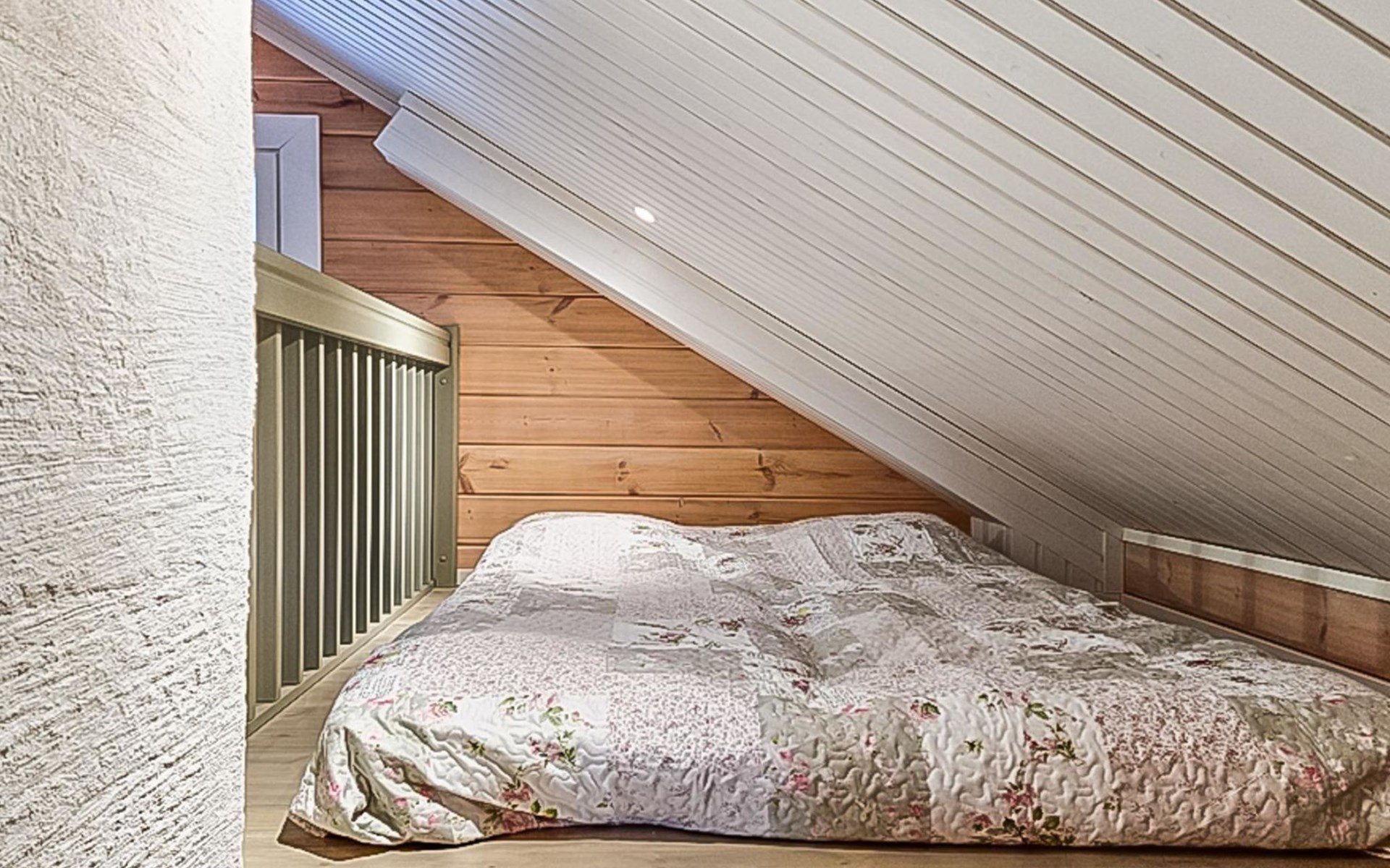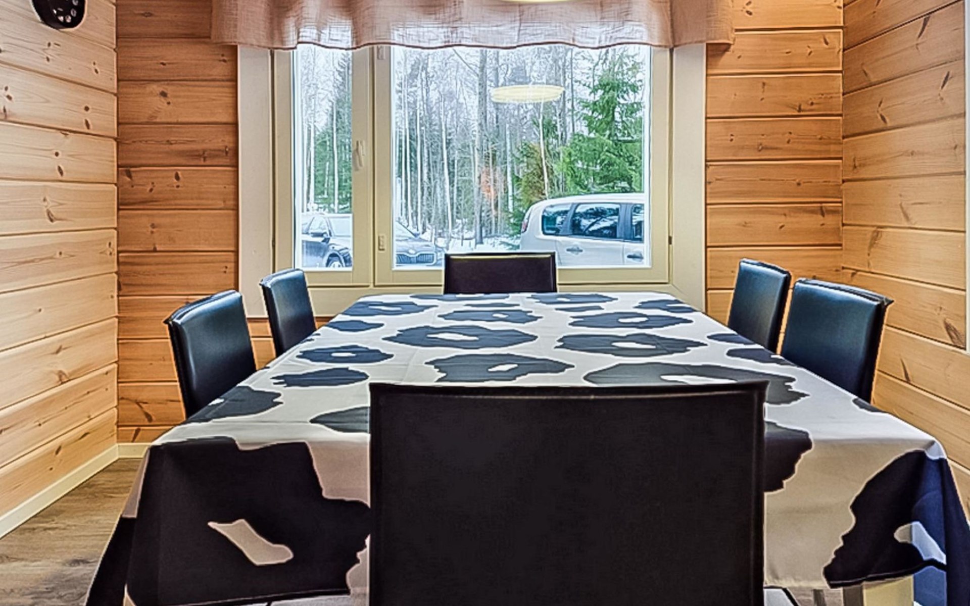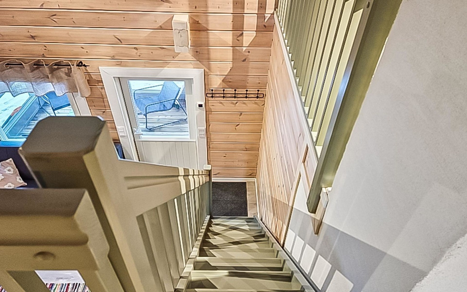 The cabin features two bedrooms, one on the ground floor and another on the upper floor, both furnished with double beds. The living room/kitchen includes a sofa bed that accommodates two guests. Additionally, the loft has a 140 cm wide mattress. However, the cabin is rented out for a maximum of 6 guests. The wood-heated sauna provides a soothing and relaxing steam experience. The dressing room includes a WC and a washing machine.