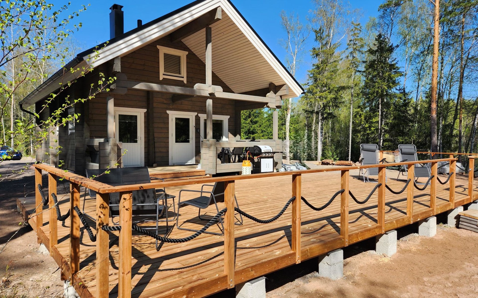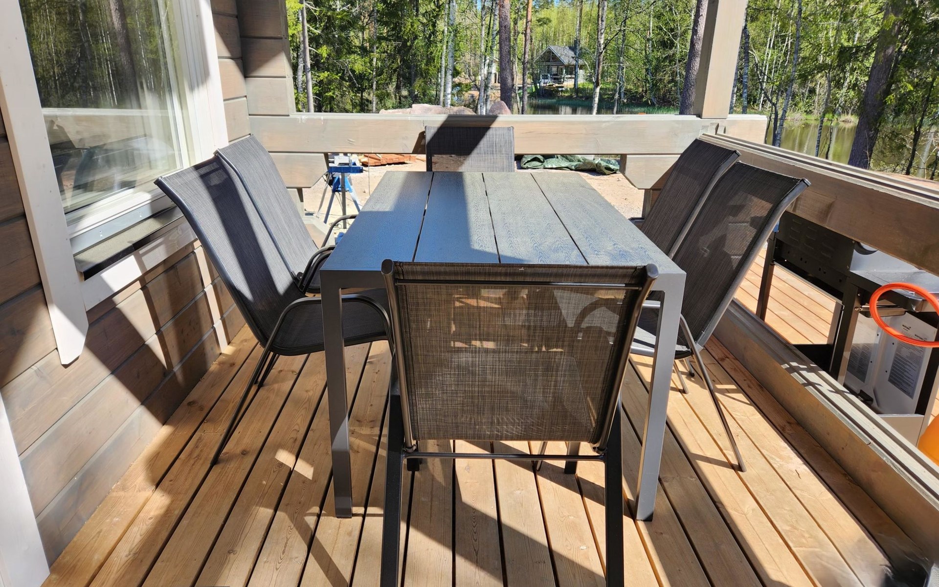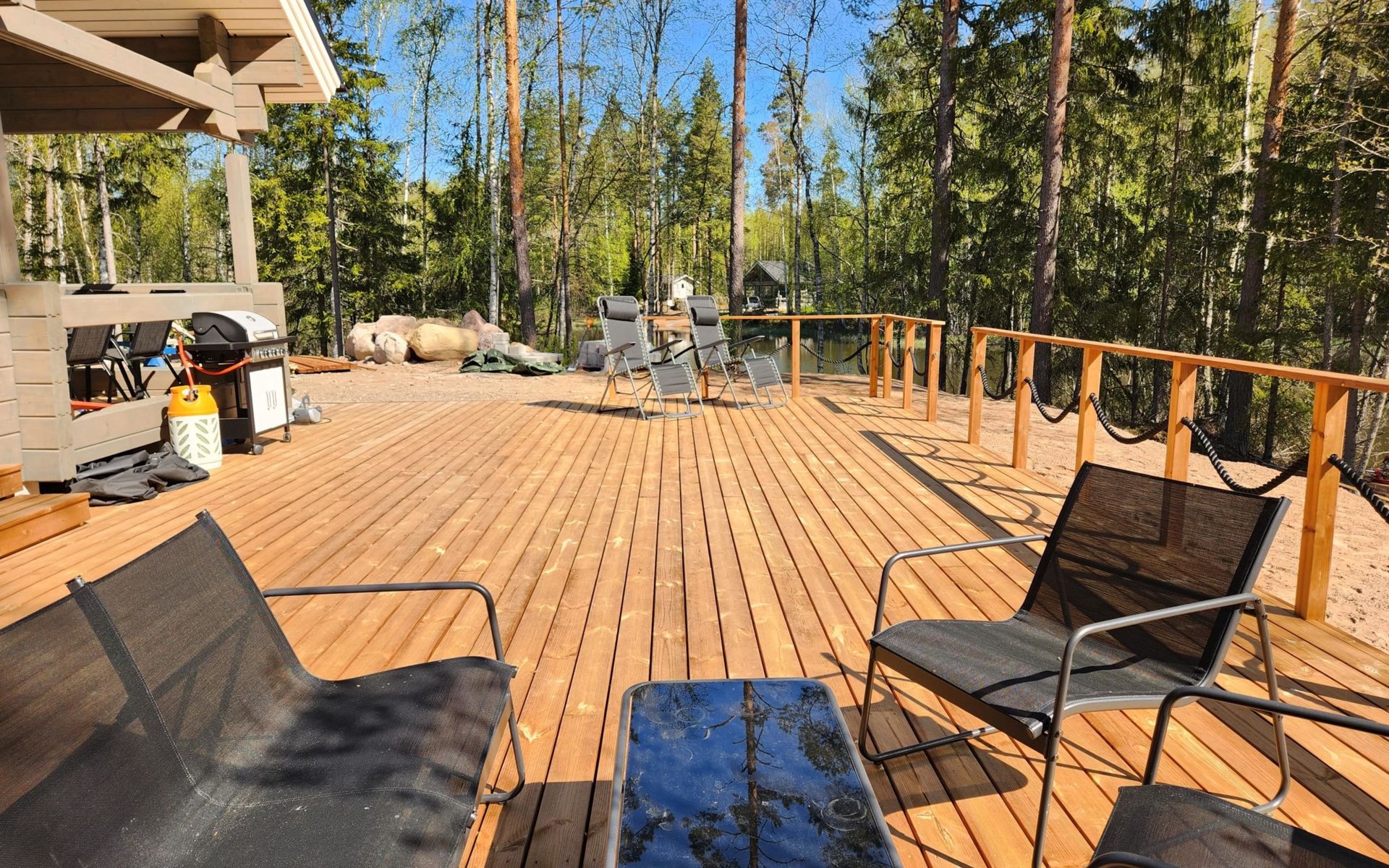 The terrace features a gas grill, perfect for preparing meals such as post-sauna snacks. You can also take a refreshing dip in the Kymi River. The swimming area has a soft, gently deepening bottom, and you can access the water from the dock. A public beach on the opposite side of the river is accessible by boat (approx. 600 m) or car (3–4 km).