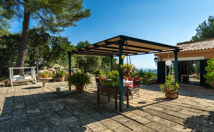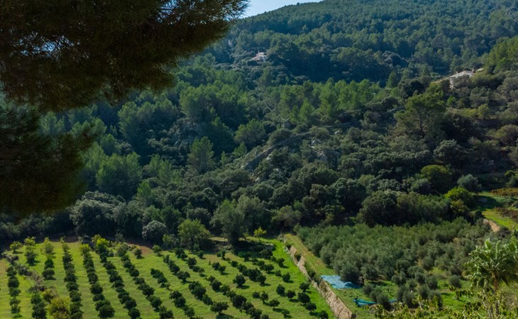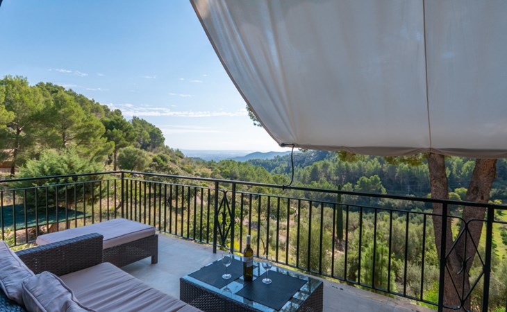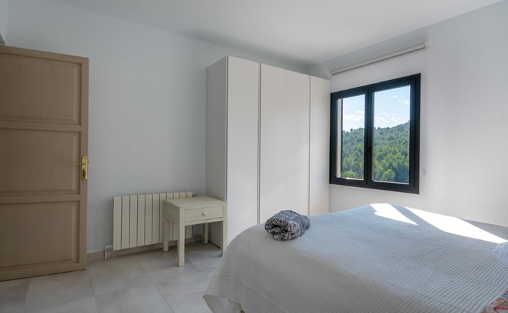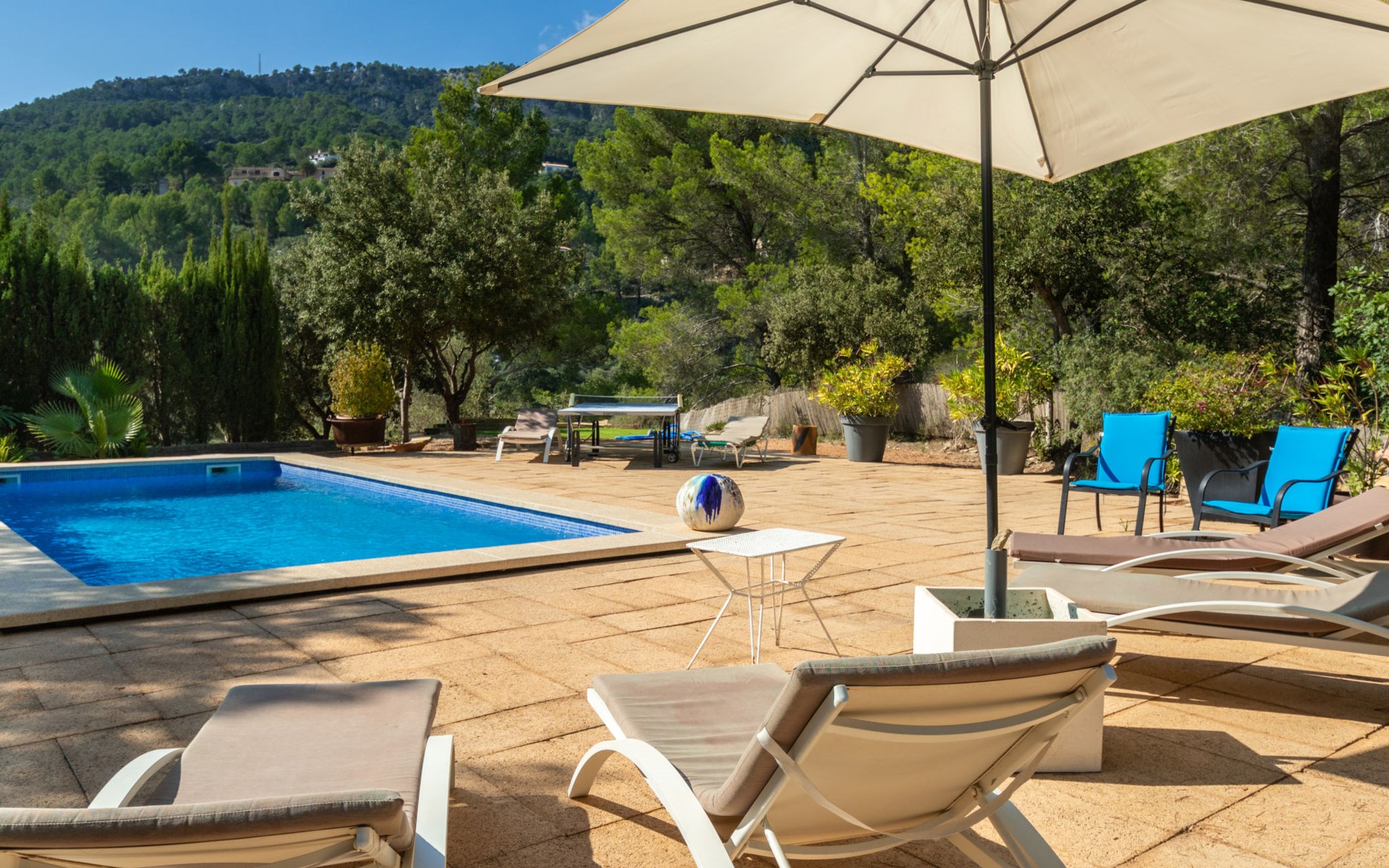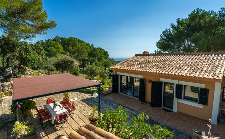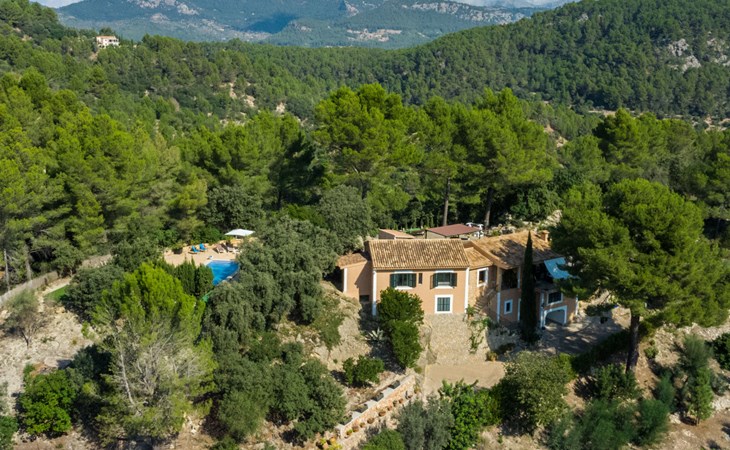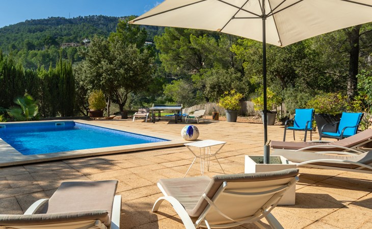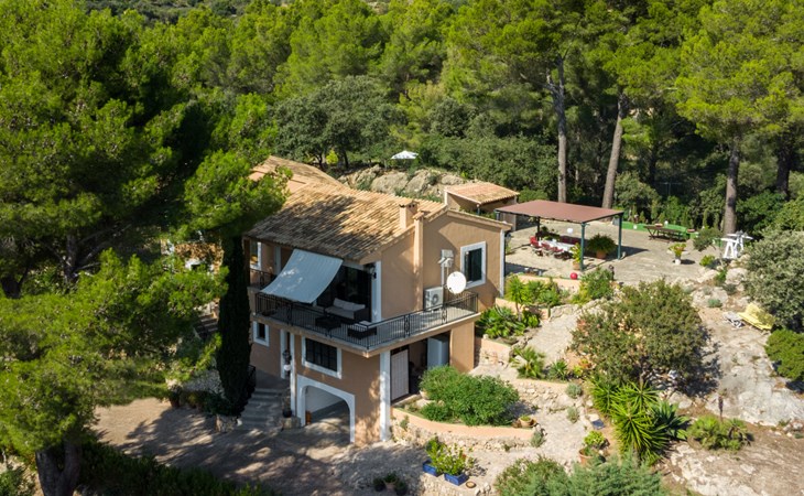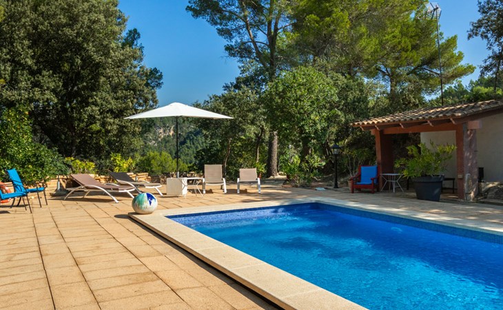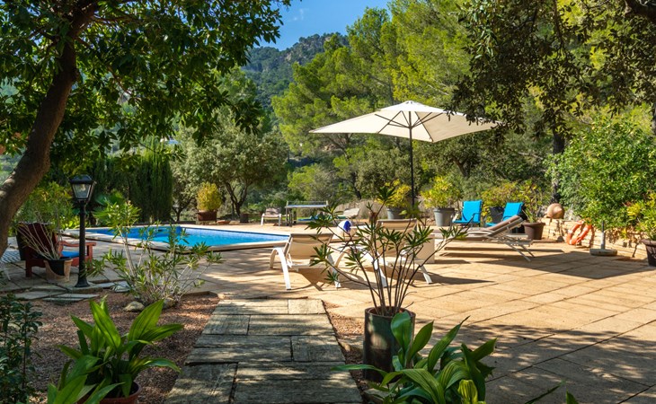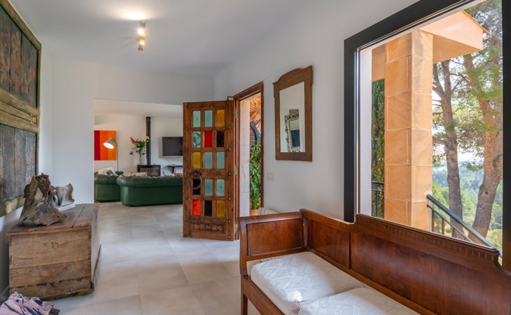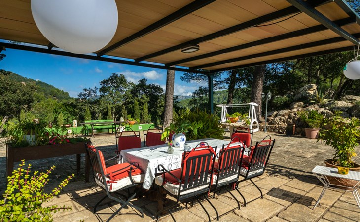 Farm estate "Short des Verger", detached. Above Esporles 3.5 km from the centre of Esporles, 19 km from the centre of Valldemossa, 26 km from the centre of Palma, on a slope, 13 km from the sea. Private: property 15'000 m2, garden (not fenced) wildlife garden and trees, natural garden, swimming pool (10 x 4 m, seasonal availability: 01.Jan. - 31.Dec.) with salt-electrolysis pool-cleaning system. Outdoor shower, table tennis. In the house: central heating system, air conditioning. Parking on the premises. Shop 4.5 km, restaurant 4.5 km, bus stop "S'esgleita" 6 km, sandy beach "Playa de Palma" 28 km pebble beach "Port de's Canonge" 13 km. Hiking paths: Camà des Correu 4.5 km. Please note: car recommended.