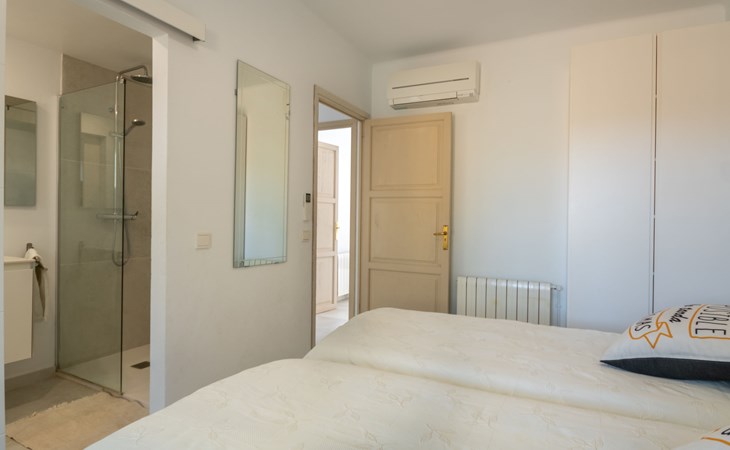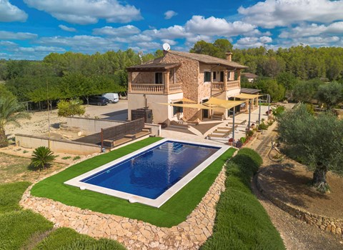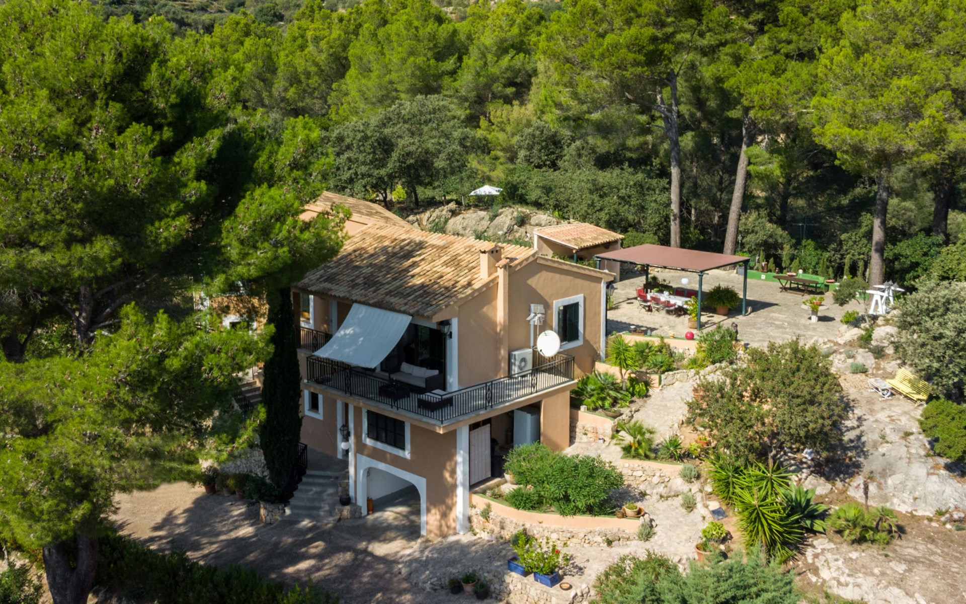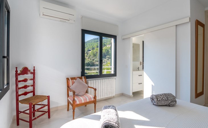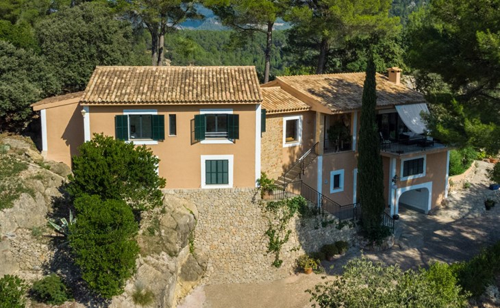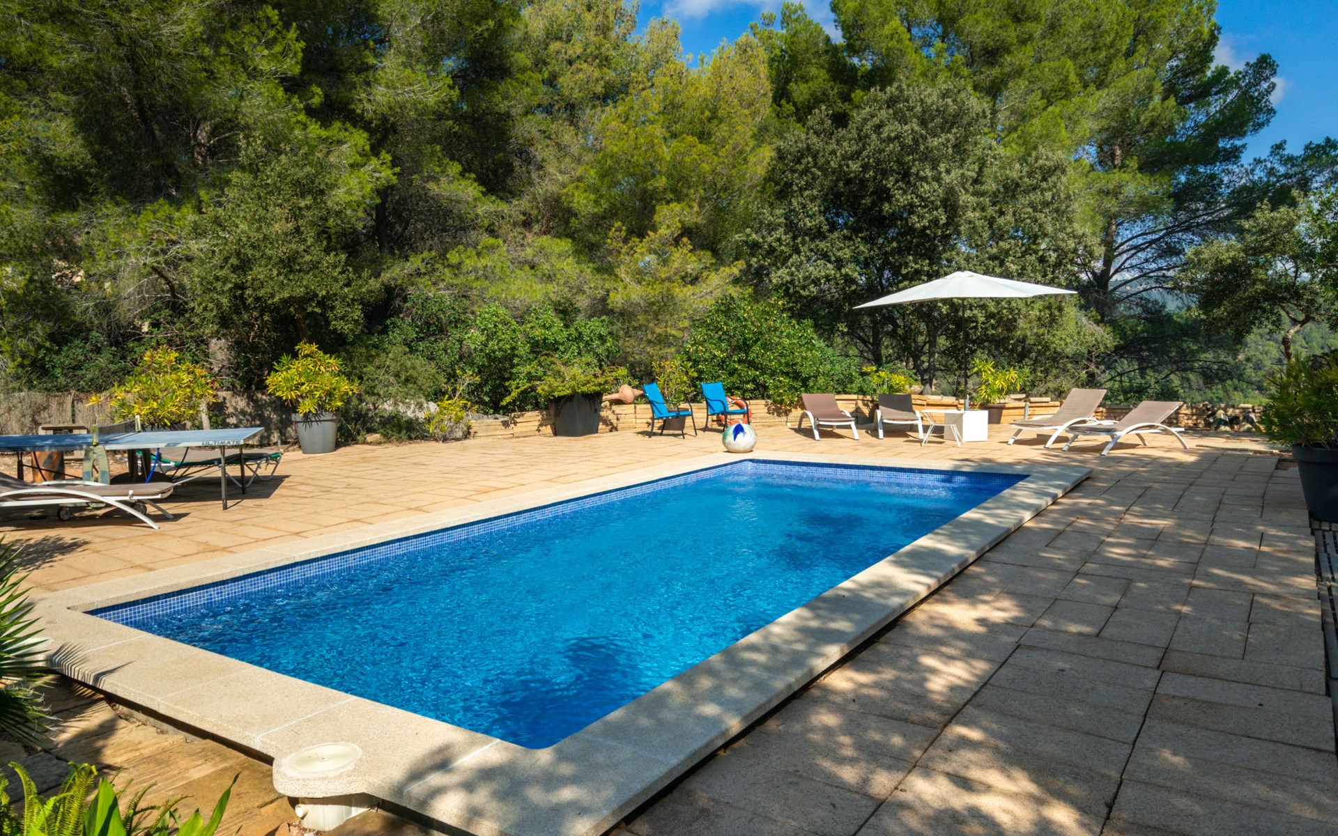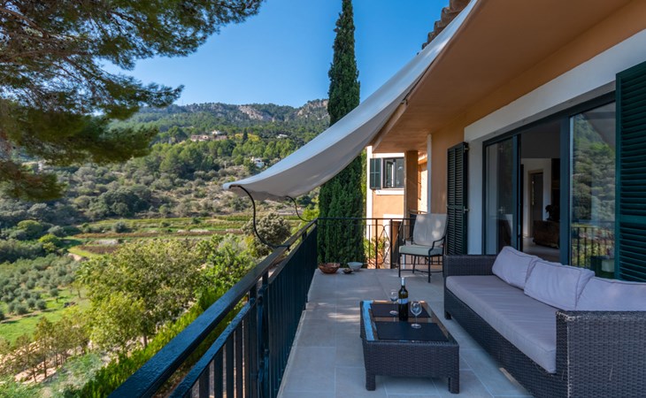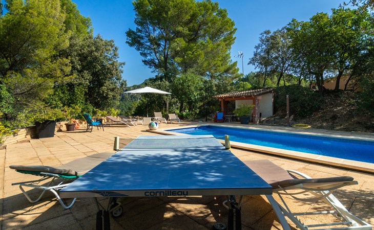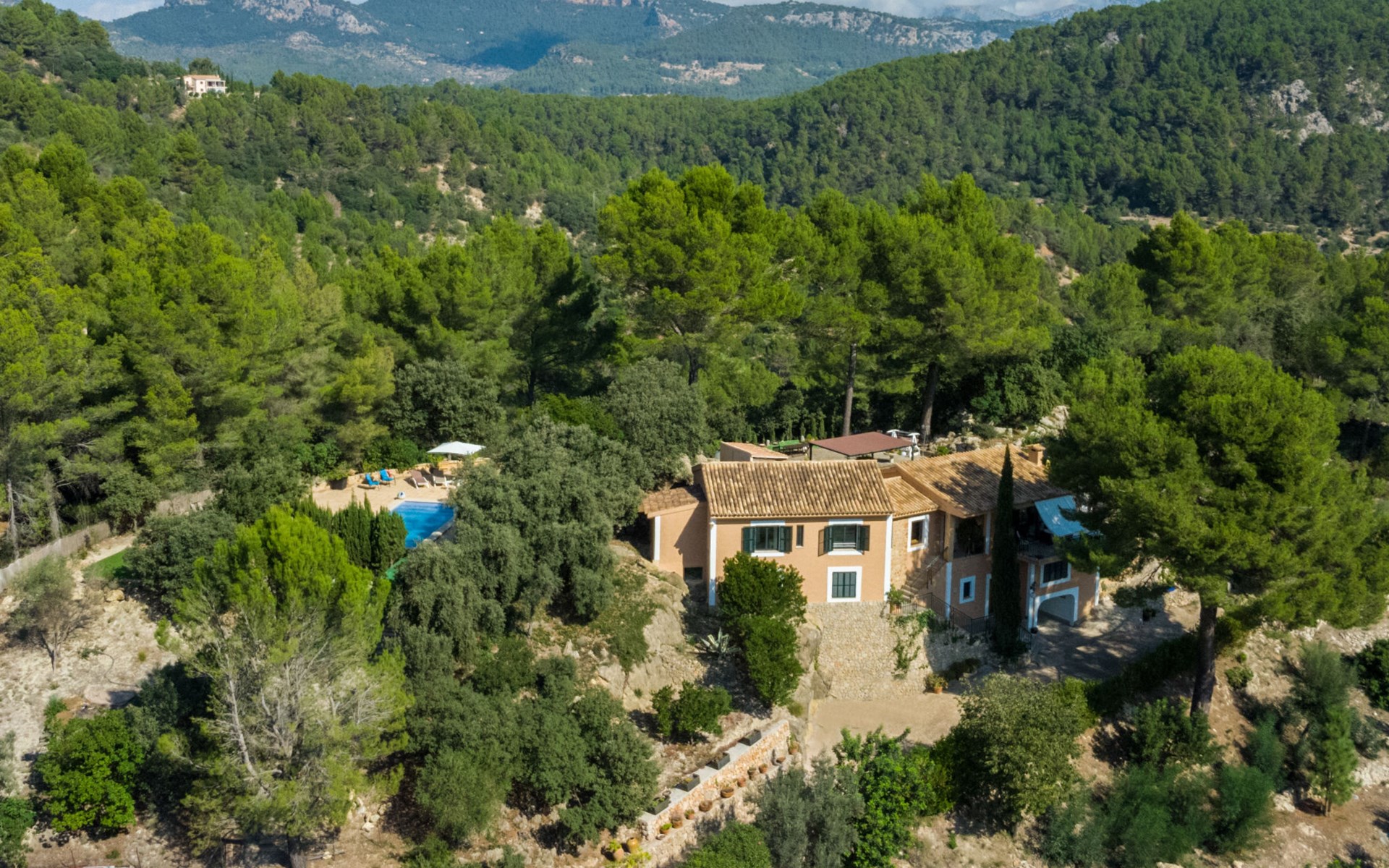 Farm estate "Short des Verger", detached. Above Esporles 3.5 km from the centre of Esporles, 19 km from the centre of Valldemossa, 26 km from the centre of Palma, on a slope, 13 km from the sea. Private: property 15'000 m2, garden (not fenced) wildlife garden and trees, natural garden, swimming pool (10 x 4 m, seasonal availability: 01.Jan. - 31.Dec.) with salt-electrolysis pool-cleaning system. Outdoor shower, table tennis. In the house: central heating system, air conditioning. Parking on the premises. Shop 4.5 km, restaurant 4.5 km, bus stop "S'esgleita" 6 km, sandy beach "Playa de Palma" 28 km pebble beach "Port de's Canonge" 13 km. Hiking paths: Camà des Correu 4.5 km. Please note: car recommended.