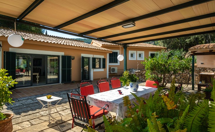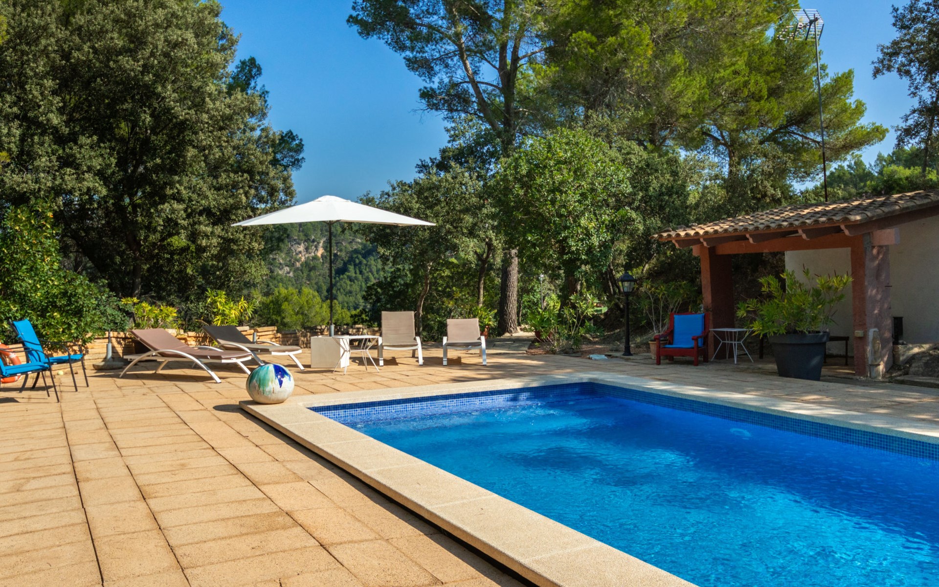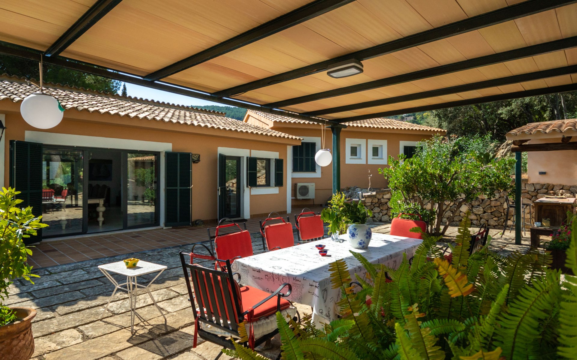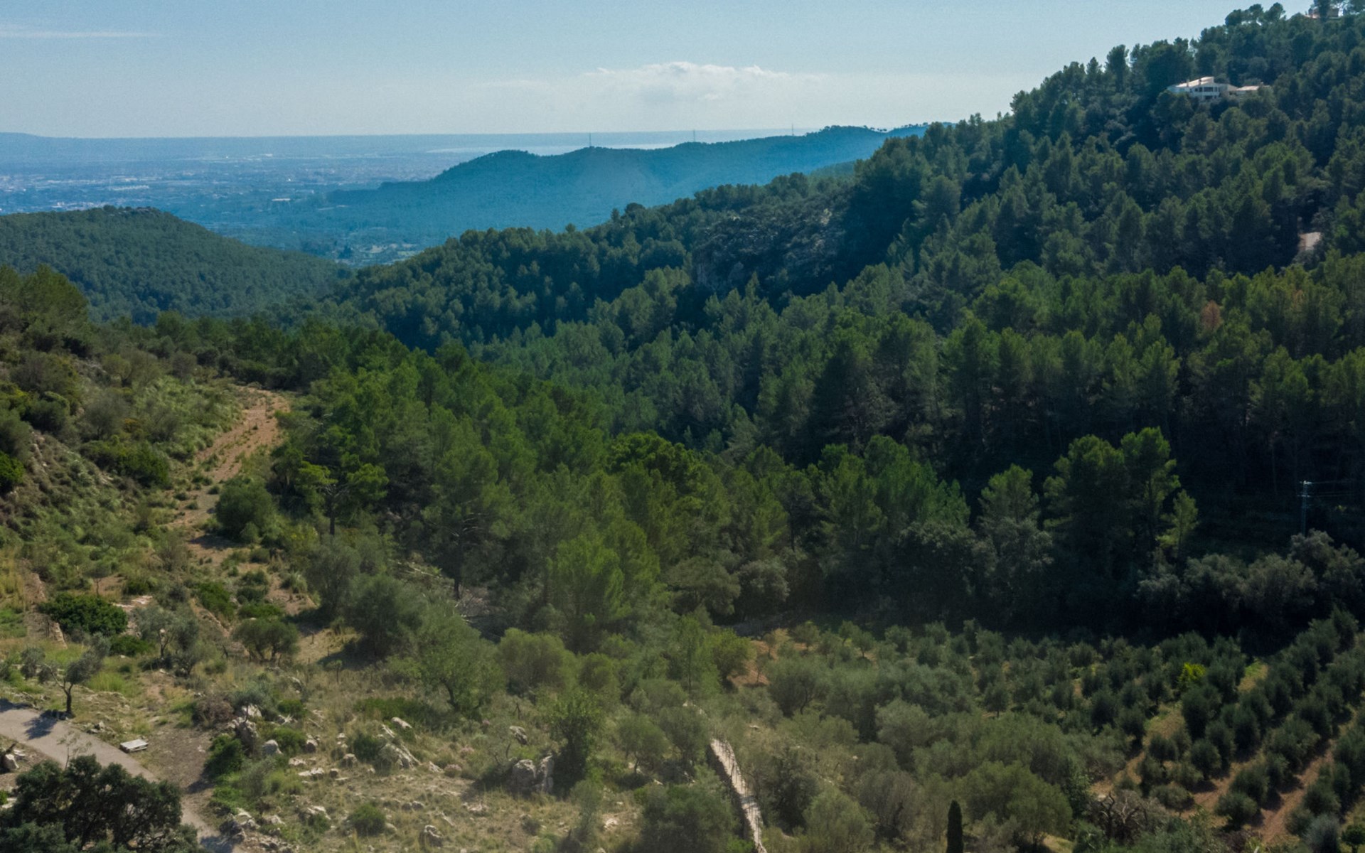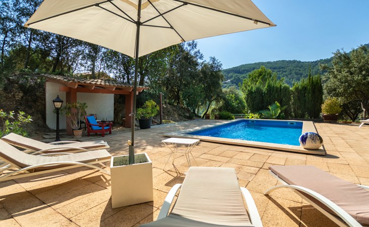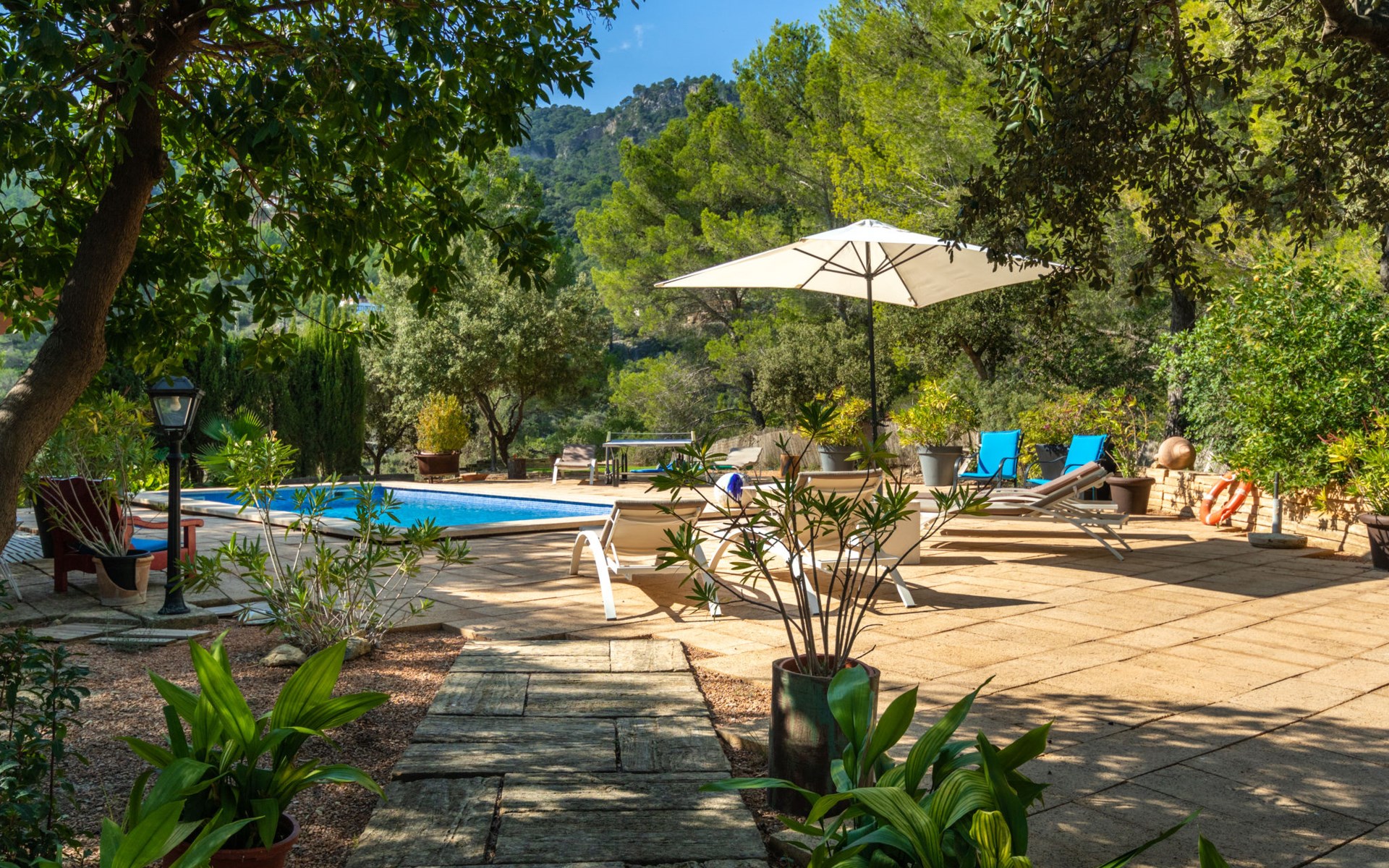 Farm estate "Short des Verger", detached. Above Esporles 3.5 km from the centre of Esporles, 19 km from the centre of Valldemossa, 26 km from the centre of Palma, on a slope, 13 km from the sea. Private: property 15'000 m2, garden (not fenced) wildlife garden and trees, natural garden, swimming pool (10 x 4 m, seasonal availability: 01.Jan. - 31.Dec.) with salt-electrolysis pool-cleaning system. Outdoor shower, table tennis. In the house: central heating system, air conditioning. Parking on the premises. Shop 4.5 km, restaurant 4.5 km, bus stop "S'esgleita" 6 km, sandy beach "Playa de Palma" 28 km pebble beach "Port de's Canonge" 13 km. Hiking paths: Camà des Correu 4.5 km. Please note: car recommended.