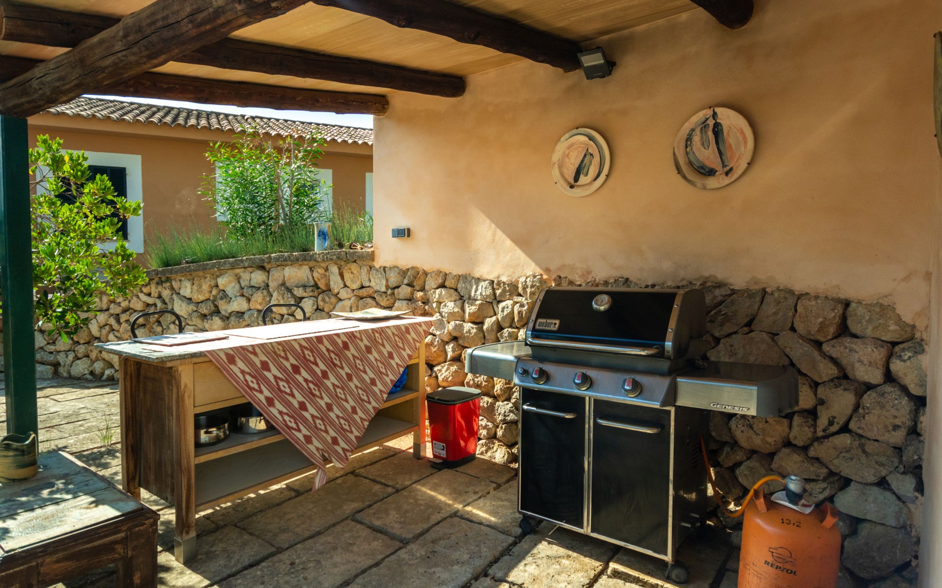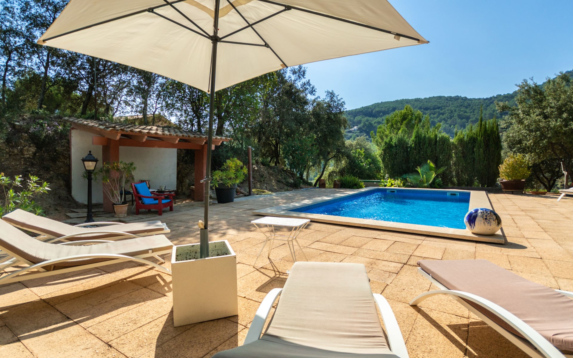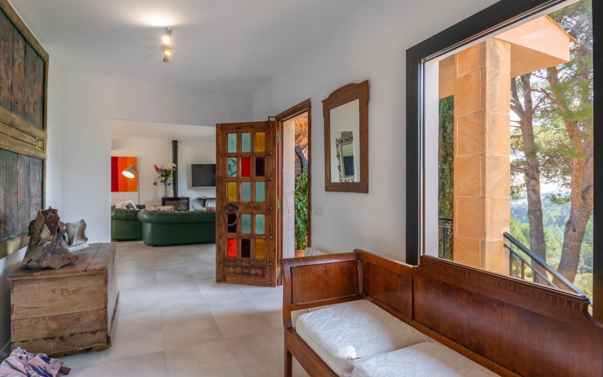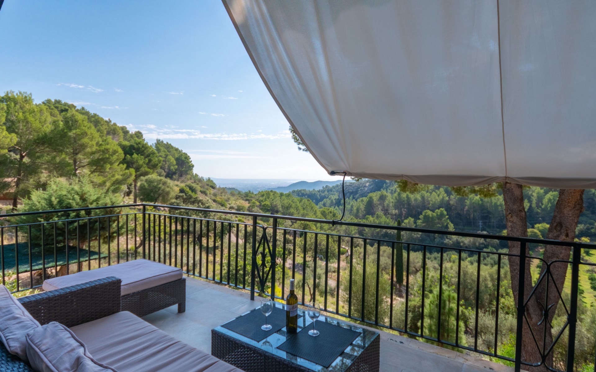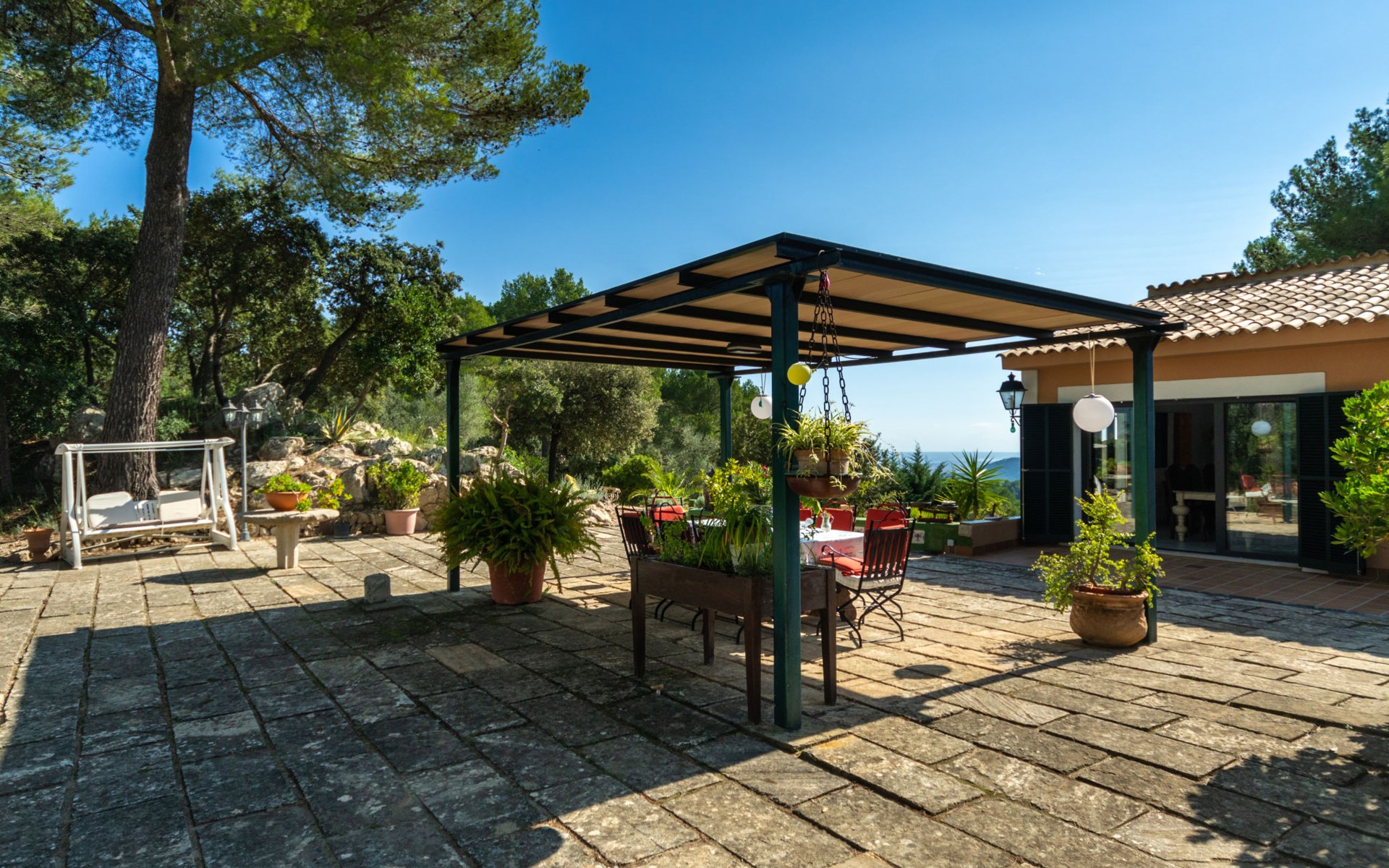Farm estate "Short des Verger", detached. Above Esporles 3.5 km from the centre of Esporles, 19 km from the centre of Valldemossa, 26 km from the centre of Palma, on a slope, 13 km from the sea. Private: property 15'000 m2, garden (not fenced) wildlife garden and trees, natural garden, swimming pool (10 x 4 m, seasonal availability: 01.Jan. - 31.Dec.) with salt-electrolysis pool-cleaning system. Outdoor shower, table tennis. In the house: central heating system, air conditioning. Parking on the premises. Shop 4.5 km, restaurant 4.5 km, bus stop "S'esgleita" 6 km, sandy beach "Playa de Palma" 28 km pebble beach "Port de's Canonge" 13 km. Hiking paths: Camà des Correu 4.5 km. Please note: car recommended.