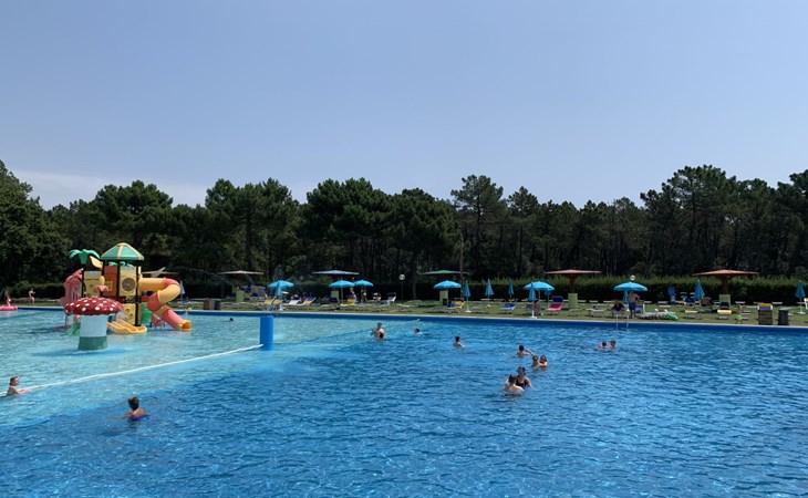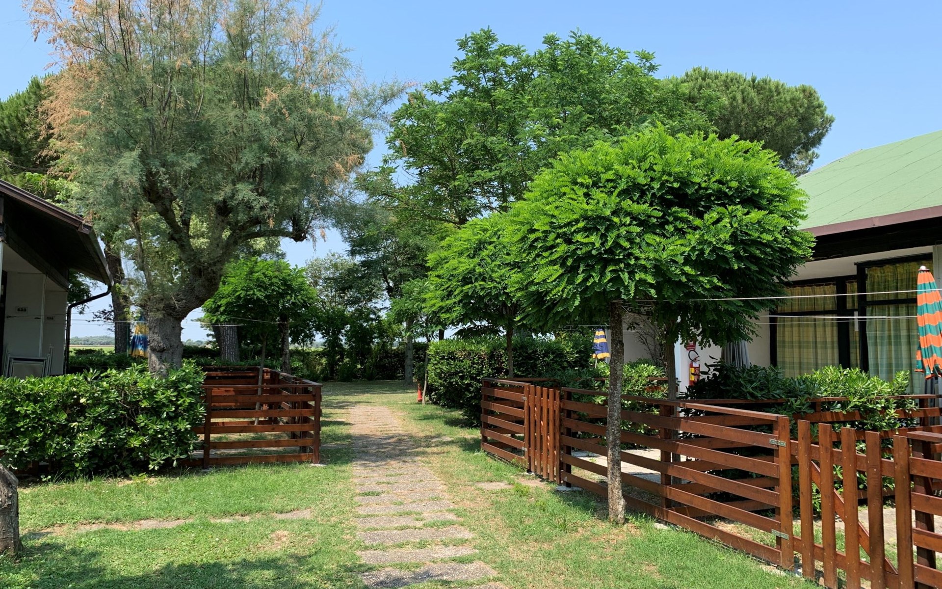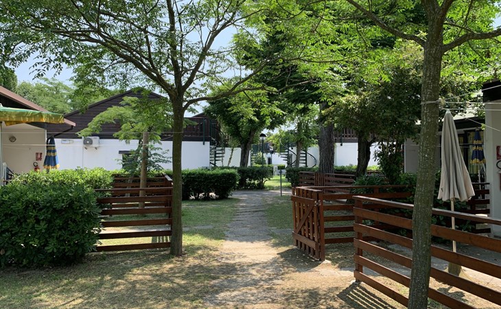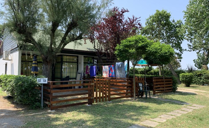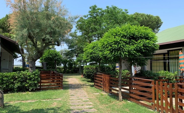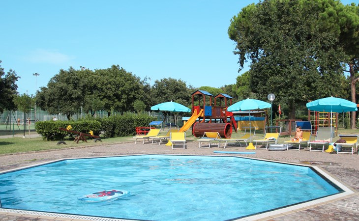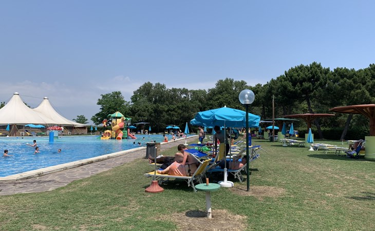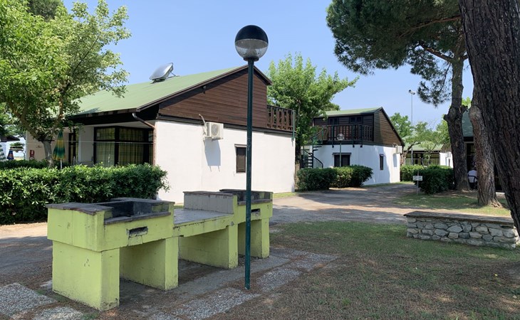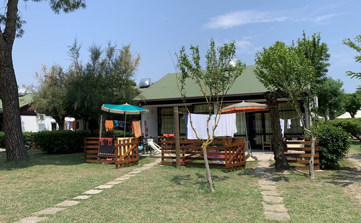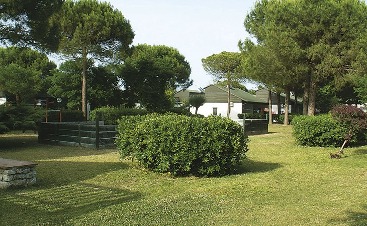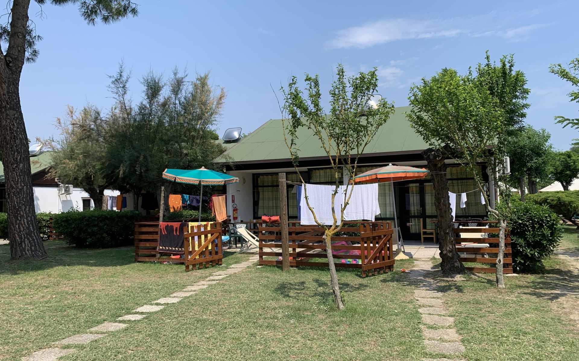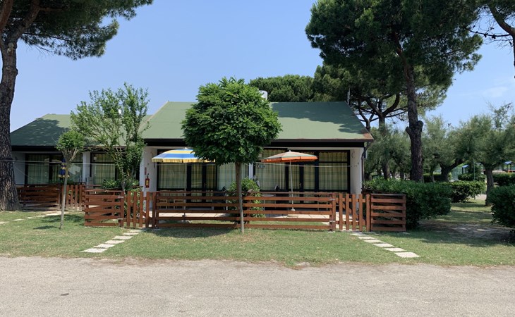 Large, child friendly resort "Mare Pineta". 210 apartments in the residence. 800 m from the centre of Casal Borsetti, on the outskirts, 200 m from the sea, 200 m from the beach, in the countryside. For shared use: property 12 ha (fenced) with lawn and trees, 2 swimming pools (seasonal availability: 15.May. - 15.Sep.). Children's pool, tennis (2 x hard court), boccia, volleyball, children's playground. In the complex: reception, restaurant, bar, WiFi, shopping facilities, washing machine, tumble dryer (for shared use, extra), bicycle rental. Full board on request (extra). Central parking spaces. Bus stop 1.2 km. Nearby attractions: Ravenna 15 km, Comacchio 20 km, Abbazia di Pomposa 35 km, Ferrara 71 km, Venezia 120 km. Hiking paths: Bosco Mesola 42 km. Please note: car-free holiday complex. Entertainment in the season. Suitable for families, baby equipment on request (extra). Access to the vicinity of the houses is possible only on Saturdays for loading and unloading, from Sunday to Friday only up to the central parking lot. The Baby's Bungalows are located near the swimming pool, the Dog's Bungalows are located on the edge of the campsite and have a small enclosed garden.