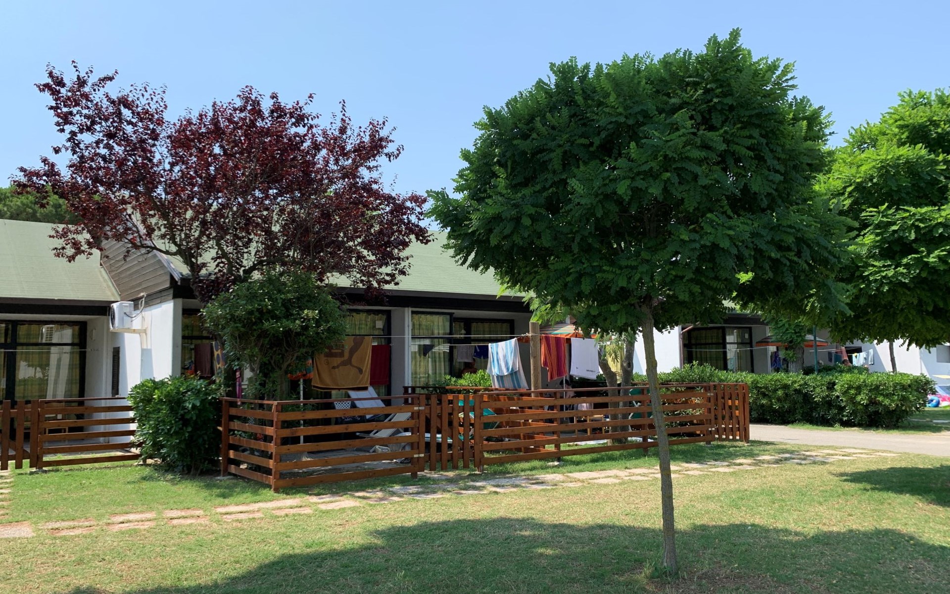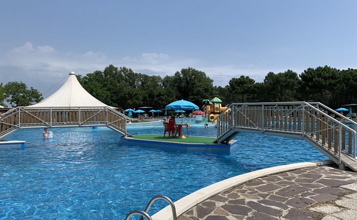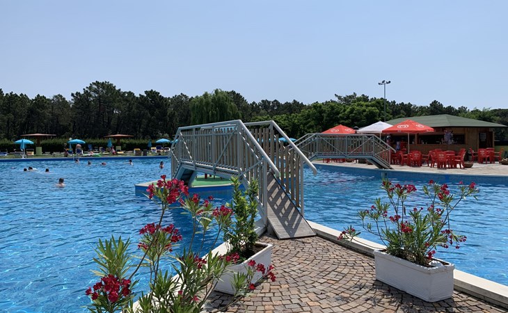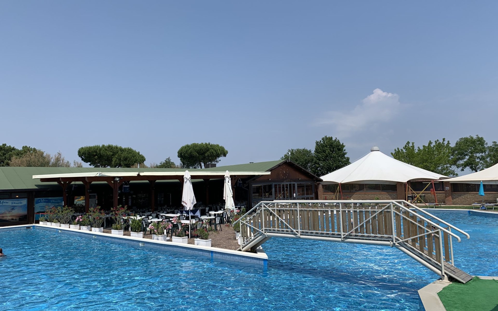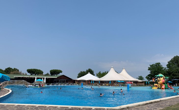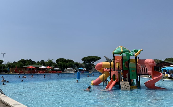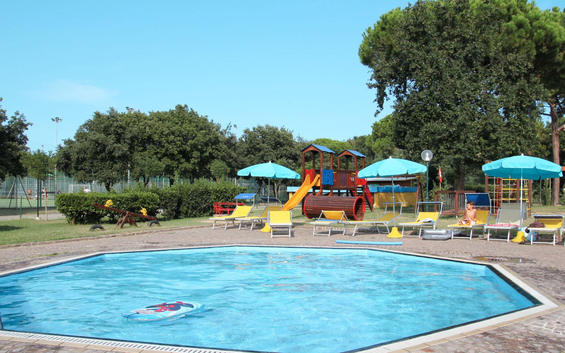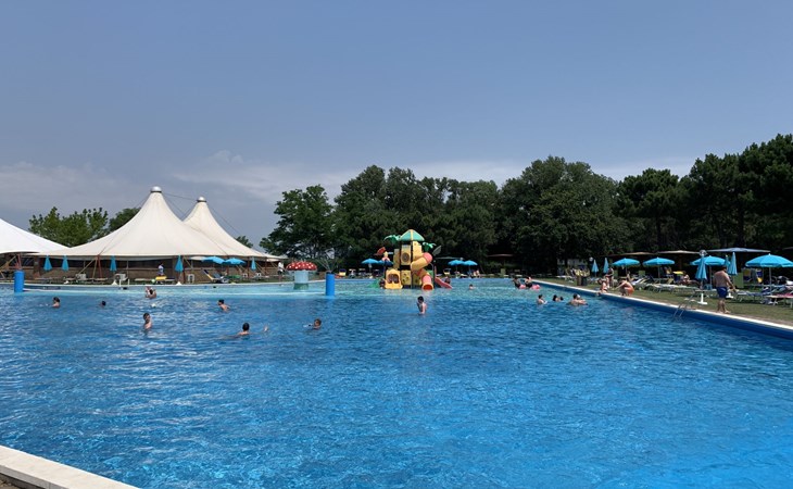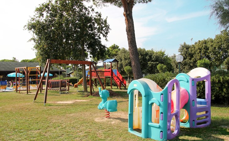 Large, child friendly resort "Mare Pineta". 210 apartments in the residence. 800 m from the centre of Casal Borsetti, on the outskirts, 200 m from the sea, 200 m from the beach, in the countryside. For shared use: property 12 ha (fenced) with lawn and trees, 2 swimming pools (seasonal availability: 15.May. - 15.Sep.). Children's pool, tennis (2 x hard court), boccia, volleyball, children's playground. In the complex: reception, restaurant, bar, WiFi, shopping facilities, washing machine, tumble dryer (for shared use, extra), bicycle rental. Full board on request (extra). Central parking spaces. Bus stop 1.2 km. Nearby attractions: Ravenna 15 km, Comacchio 20 km, Abbazia di Pomposa 35 km, Ferrara 71 km, Venezia 120 km. Hiking paths: Bosco Mesola 42 km. Please note: car-free holiday complex. Entertainment in the season. Suitable for families, baby equipment on request (extra). Access to the vicinity of the houses is possible only on Saturdays for loading and unloading, from Sunday to Friday only up to the central parking lot. The Baby's Bungalows are located near the swimming pool, the Dog's Bungalows are located on the edge of the campsite and have a small enclosed garden.