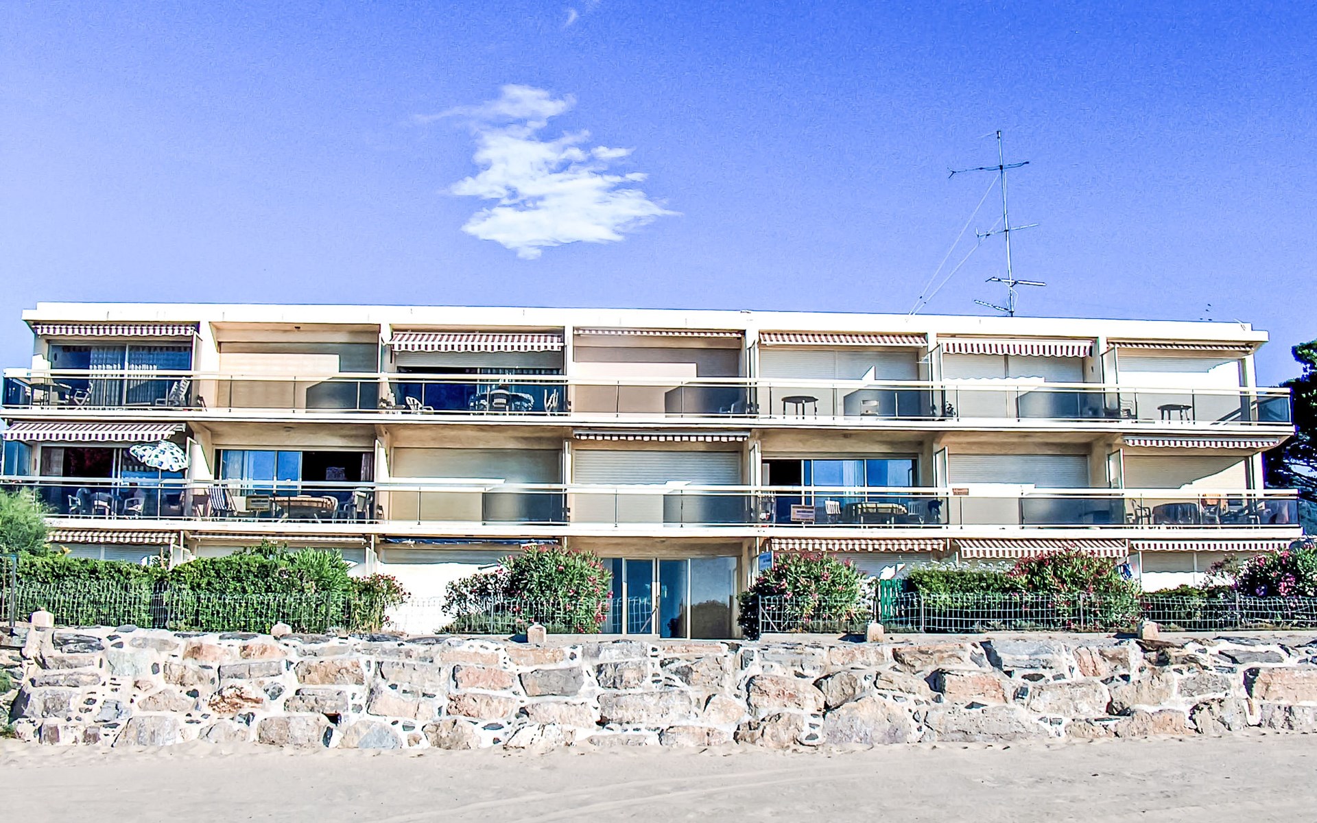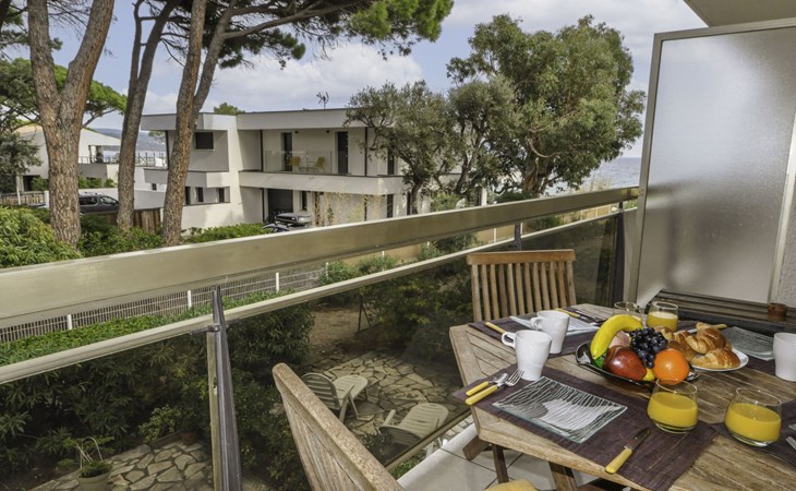 Residence "De la Plage". In the resort 800 m from the centre of Cavalaire sur Mer, on a slope, 10 m from the sea, 10 m from the beach, direct access to the beach, south facing position. Public parking 50 m on the road. Shop 300 m, grocery 100 m, supermarket 500 m, shopping centre 10 km, restaurant, bar, bakery 100 m, bus stop "place du parc" 450 m, park "Aqualand" 24 km, diving center 800 m. Sports harbour 800 m, sailing school, minigolf 12 km, cycle lane 10 m. Nearby attractions: Azur Park, Paint-ball 12 km, Bowling à Port-Grimaud 13 km, St-Tropez 17 km, Ste-Maxime 24 km. Hiking paths: Sentier du Fenouillet 3 km, Sentier du littoral 7 km, Toulon 60 km. Please note: the keys‘ handover takes place by the agency Interhome in Cavalaire. Main road close by.
