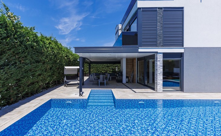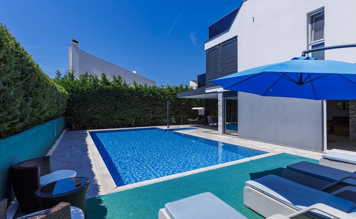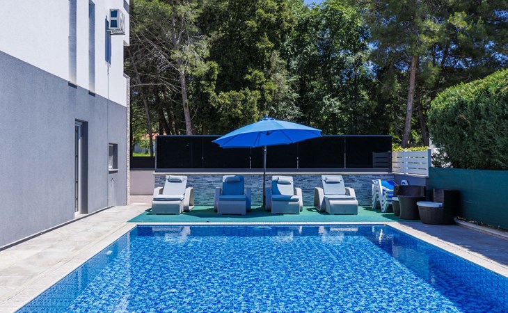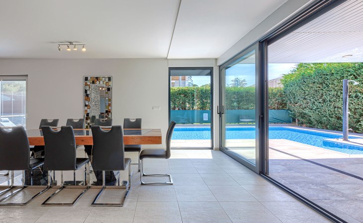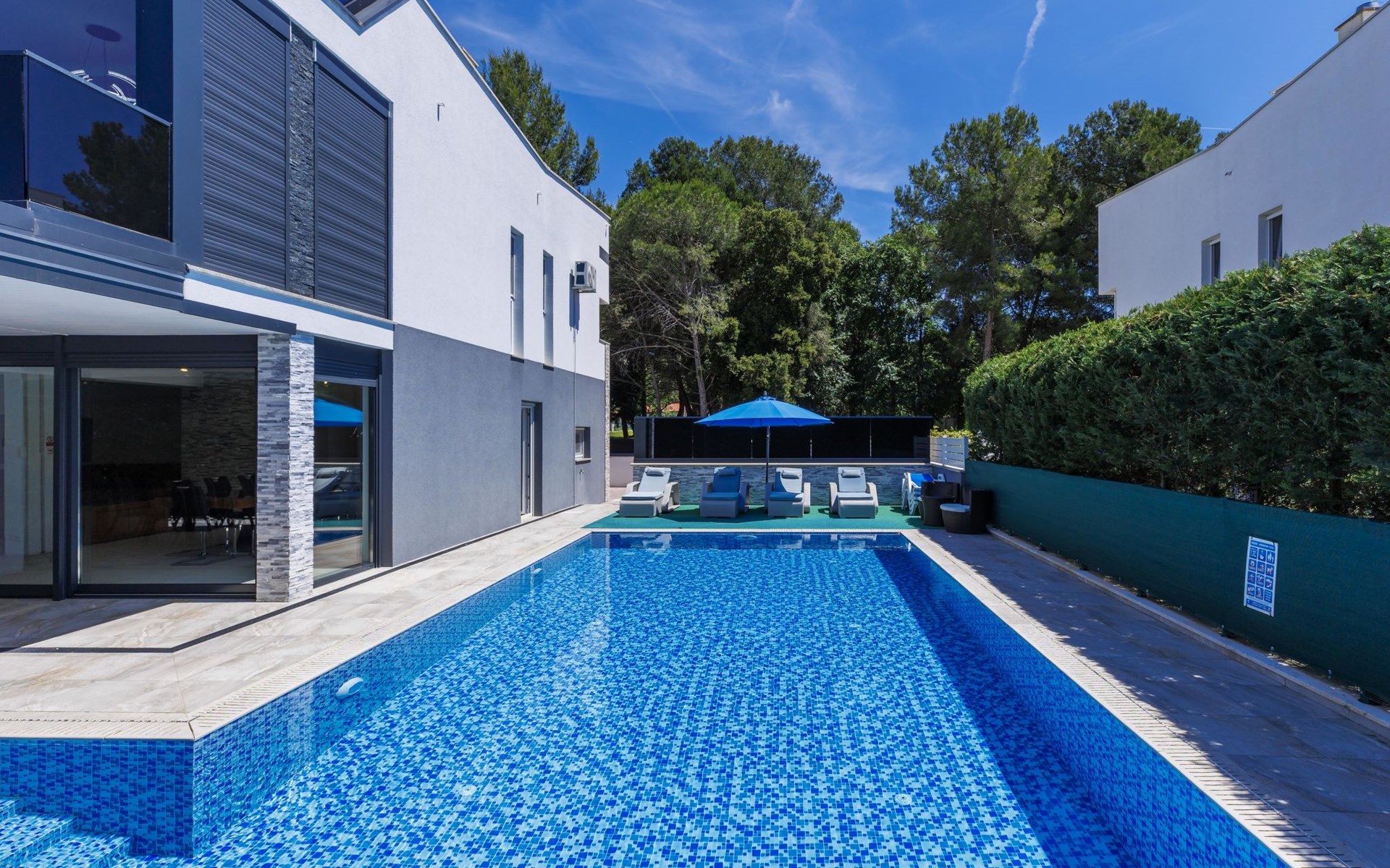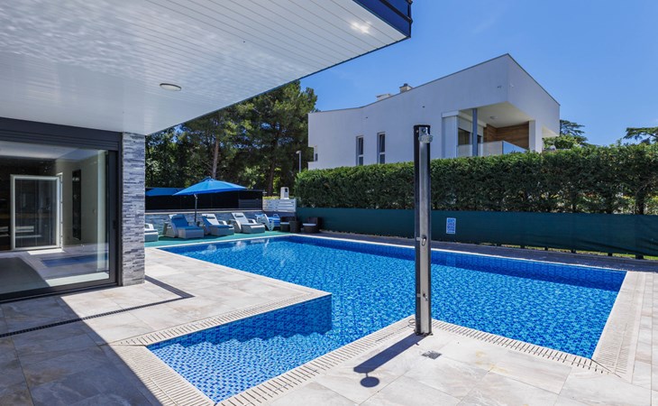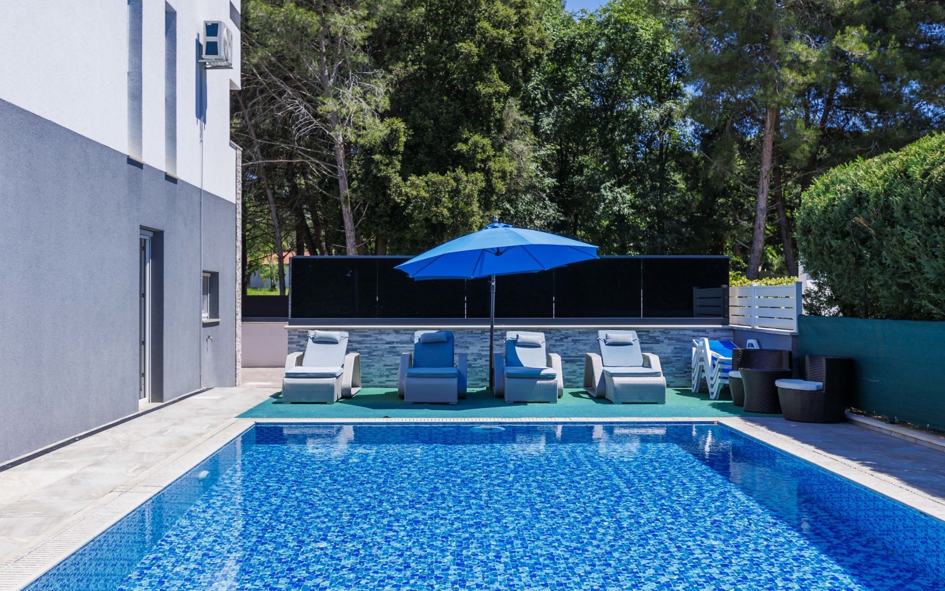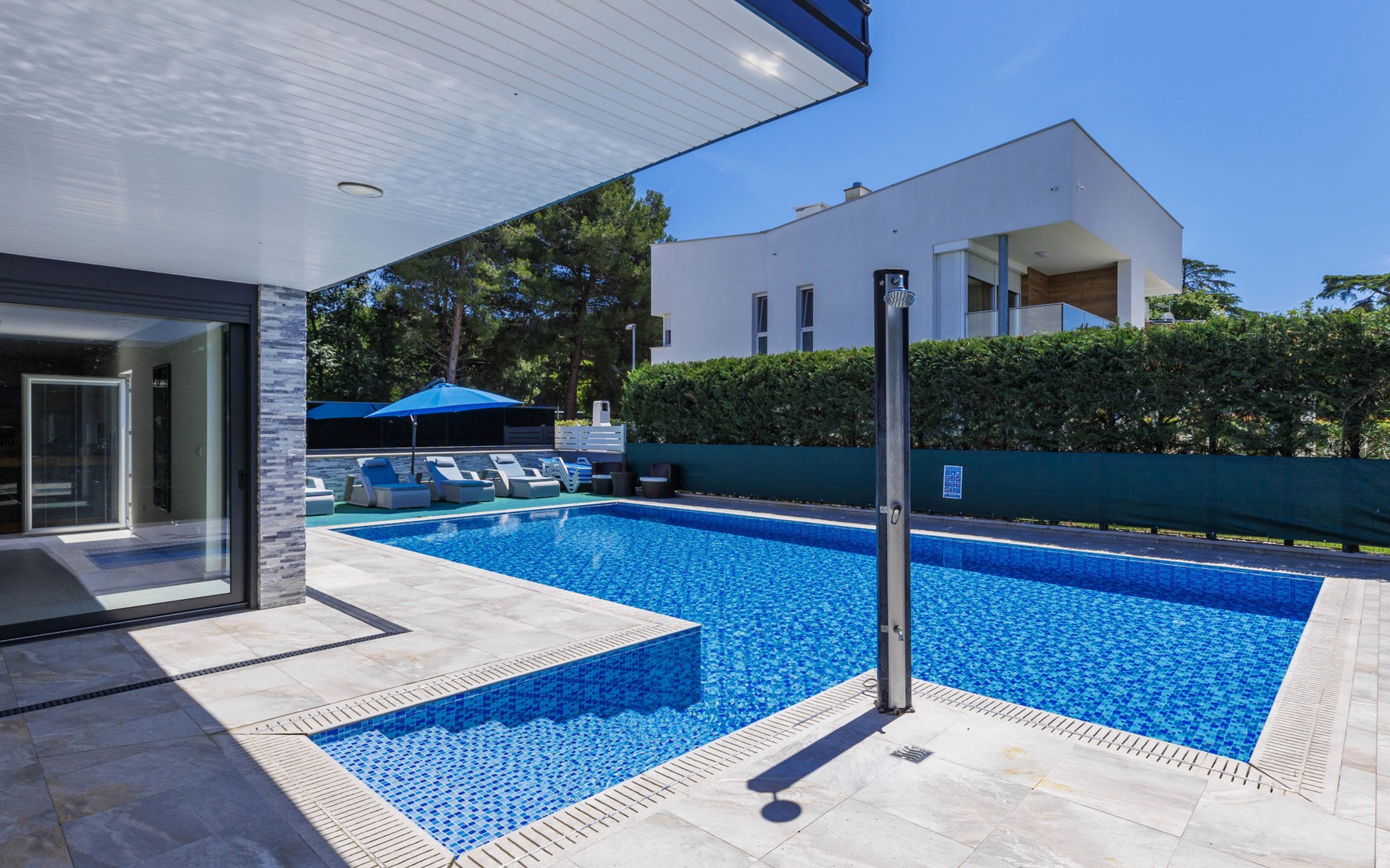 Villa "Rial 2", 2 storeys. 500 m from the centre of Fažana, 250 m from the sea, 250 m from the beach. Private: property 400 m2 (fenced), swimming pool (11 x 5 m, 60 m2, depth 140 cm, seasonal availability: 01.May. - 01.Oct.) with internal staircase. Outdoor shower, garden furniture. In the house: internet access, washing machine. Parking (for 4 cars) at the house on the premises. Shop 250 m, restaurant 300 m, bus stop 550 m, pebble beach 250 m. Object suitable for 8 adults + 2 children. Please note: airfield 10 km from the property.