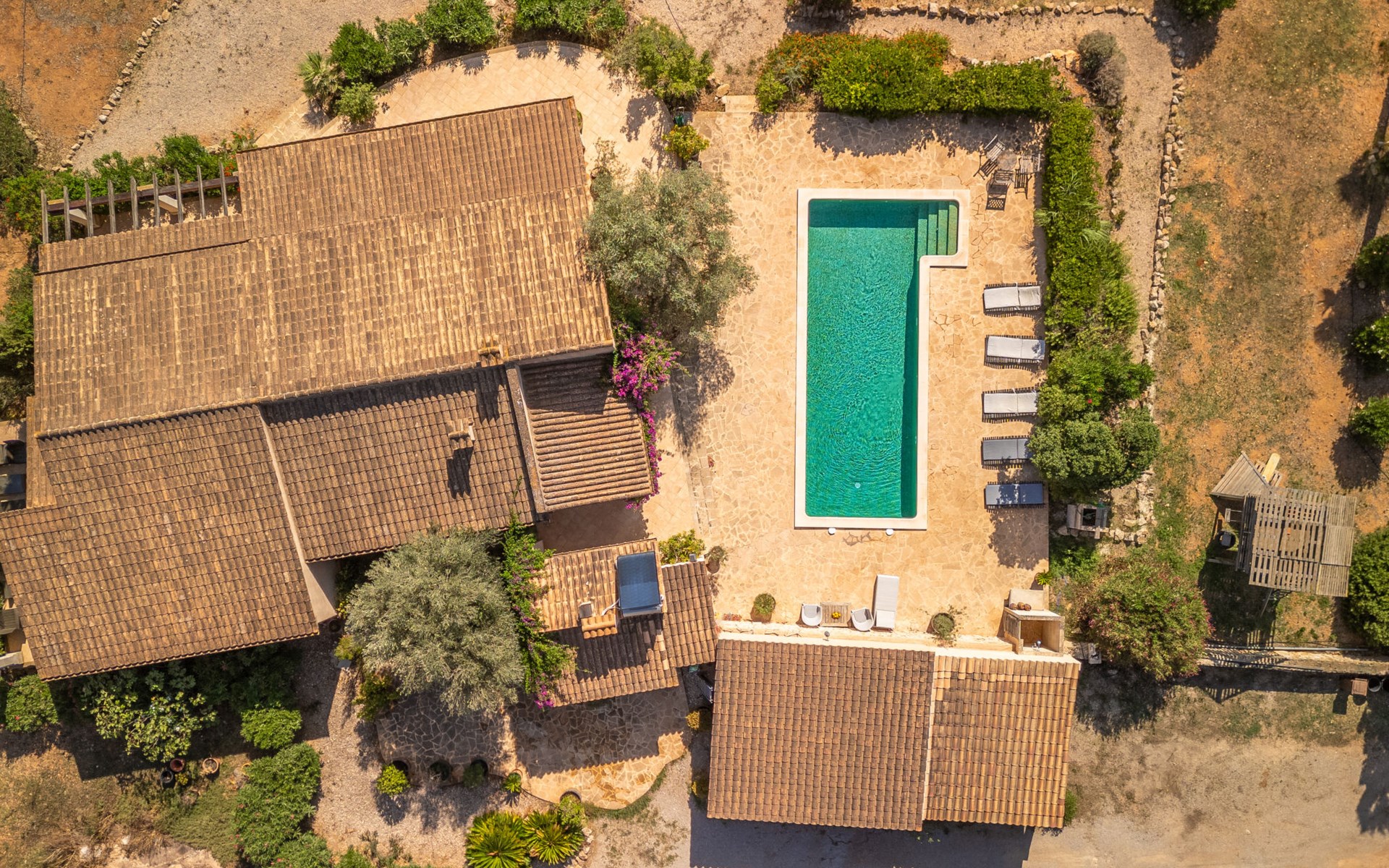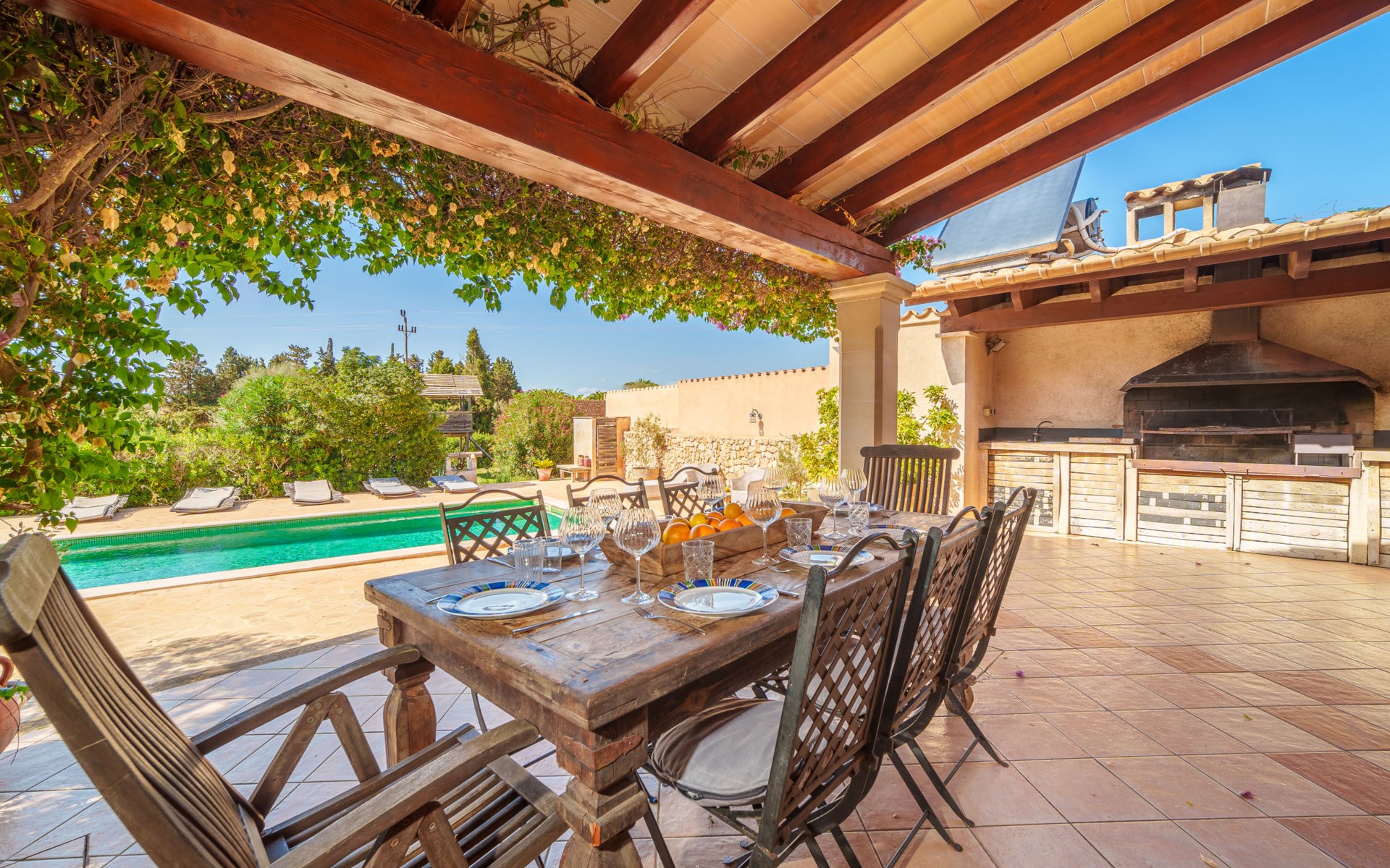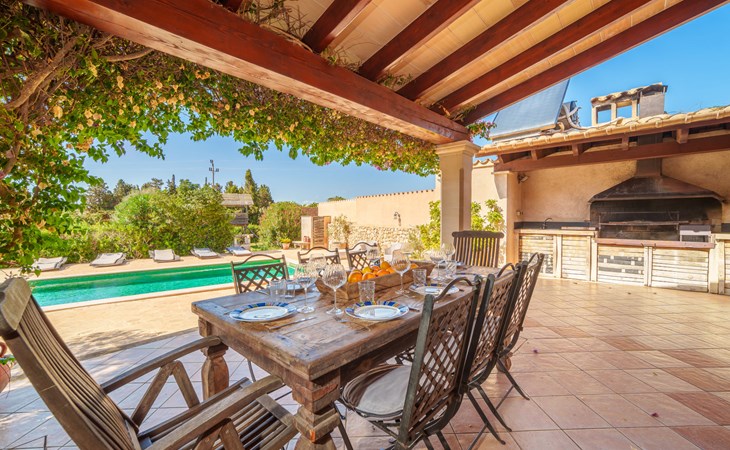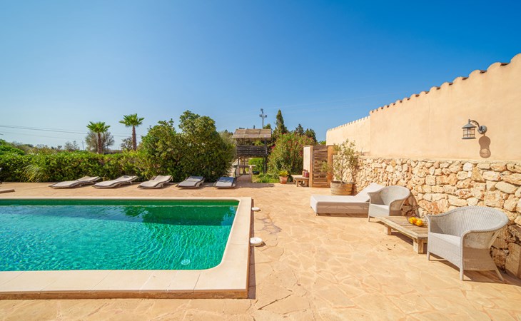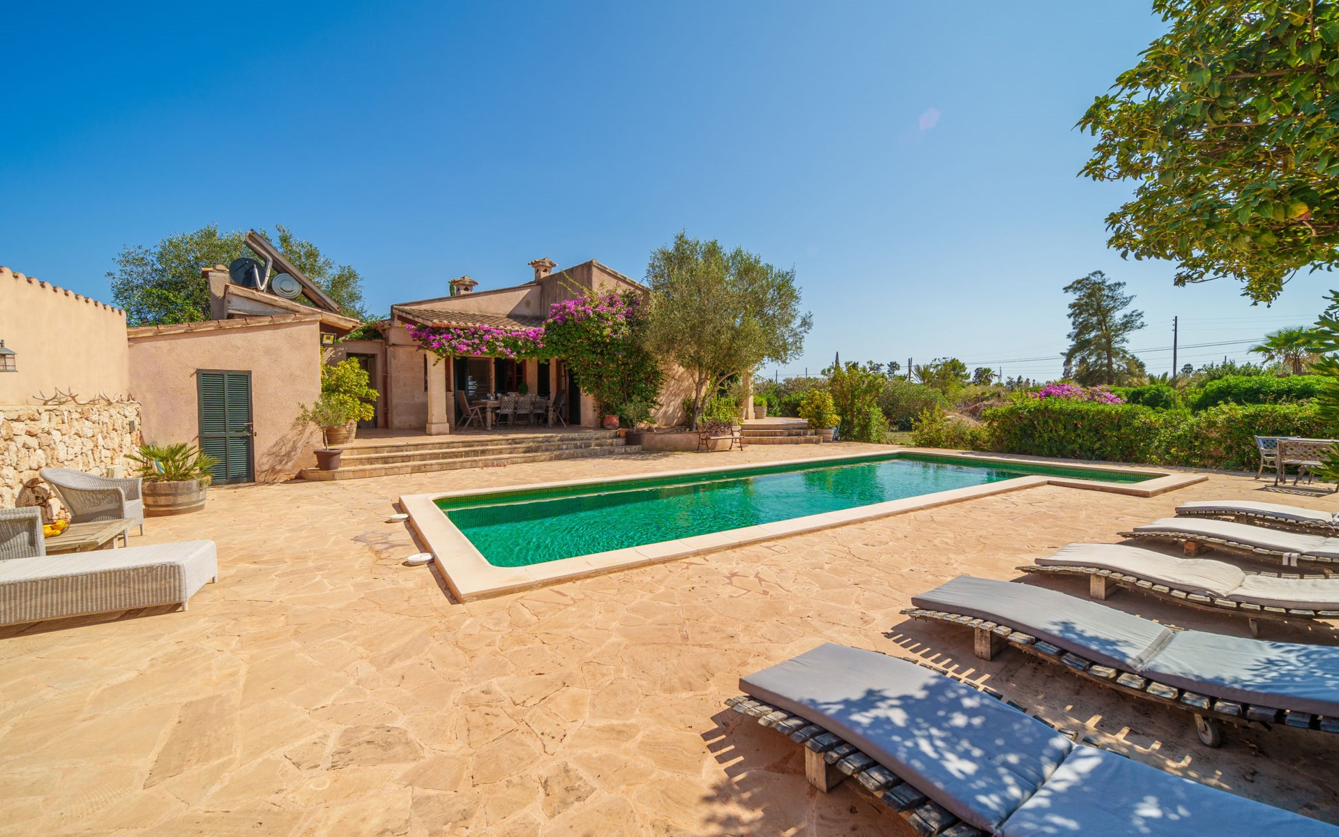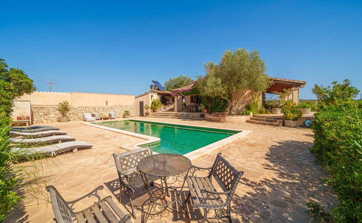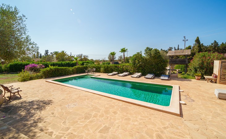 San Blai 3 km from Campos: Large, cosy, comfortable villa "San Blai Llum de Sal", surrounded by trees. 3 km from the edge of the forest, 13 km from the sea, 13 km from the beach. Private: natural garden, swimming pool (8 x 4 m, depth 250 - 250 cm, seasonal availability: 01.Mar. - 31.Oct.). Patio, pergola, garden furniture, barbecue, pool maintenance by the owner/gardener. In the house: WiFi, washing machine, heating to be paid on the spot (01.Nov. - 31.Mar.). Roofed, parking. Shop 3 km, grocery 3 km, supermarket 3 km, shopping centre 3 km, restaurant 3 km, bar 3 km, bakery 3 km, café 3 km, pedestrian zone 3 km, bus stop "Campos" 3 km, railway station "Manacor" 27 km, sandy beach "Sa Rápita" 13 km. Sports harbour 13 km, marina 13 km, golf course (18 hole) 20 km, sailing school 13 km. Nearby attractions: Platja d’es Trenc 13 km, Sa Plasa de Campos 3 km, Santanyi 10 km. Please note: car recommended. Baby equipment on request (included). The owner does not accept any youth groups. Loading and unloading of baggage is possible at the holiday house. Airfield 30 km from the property.