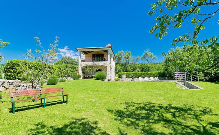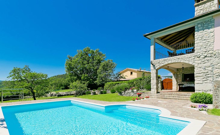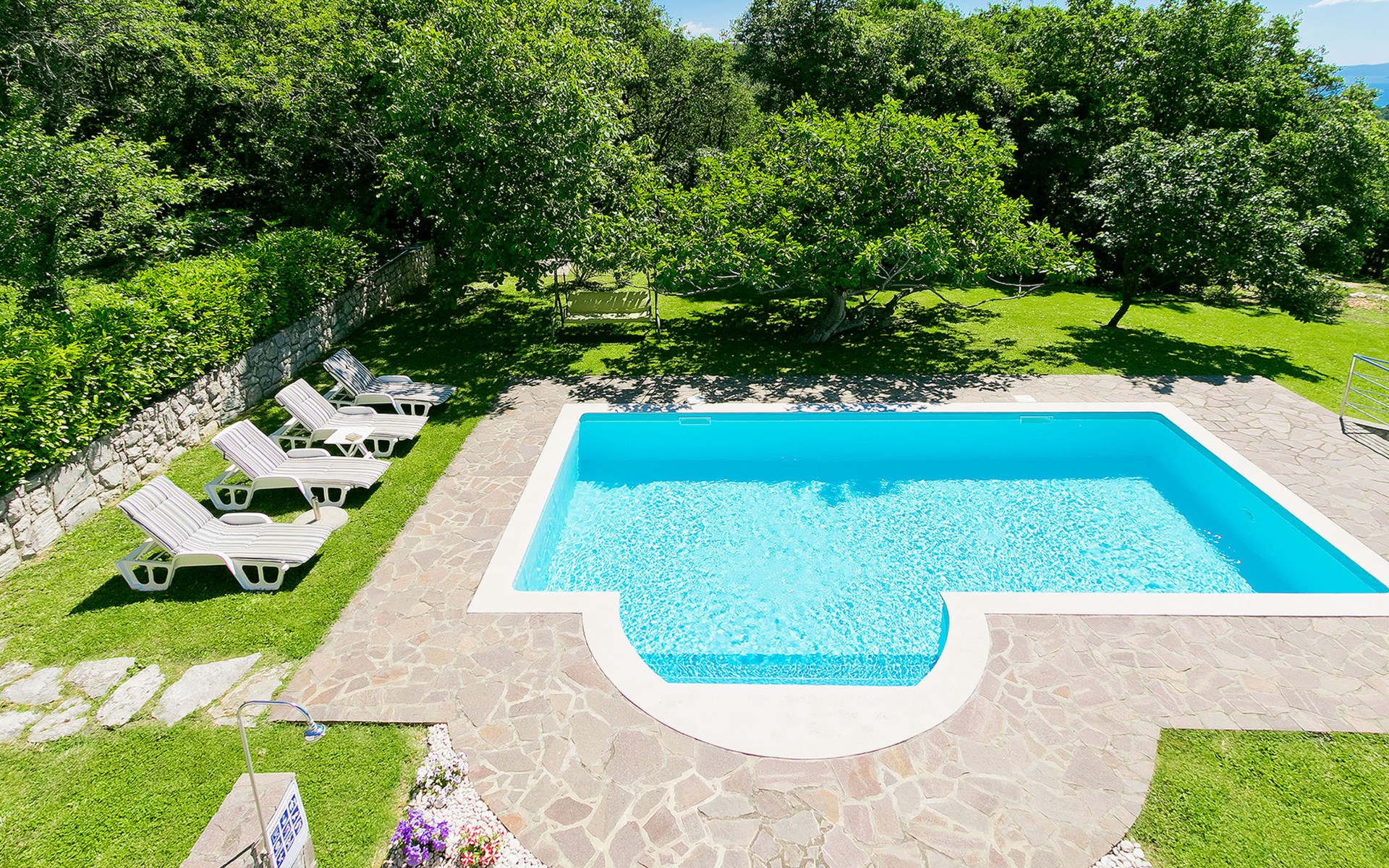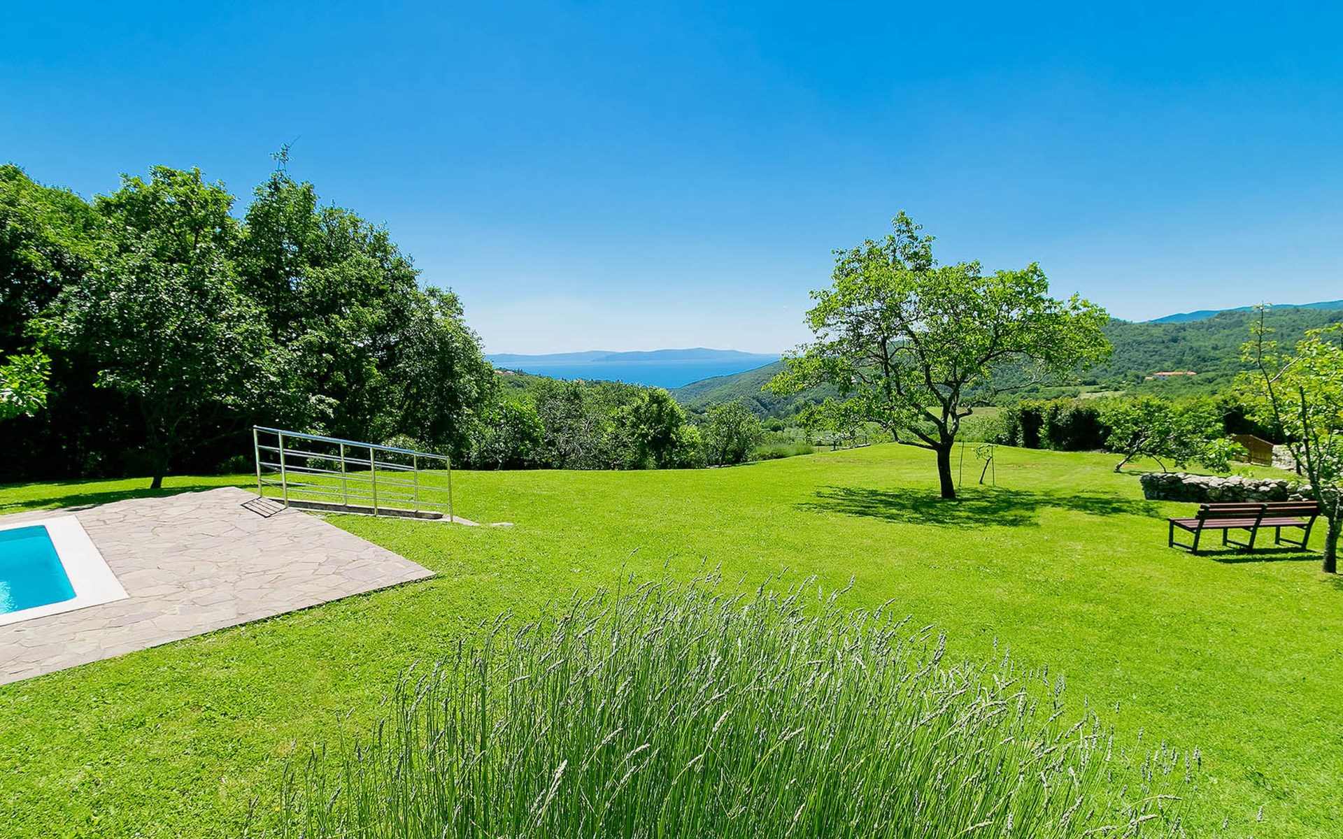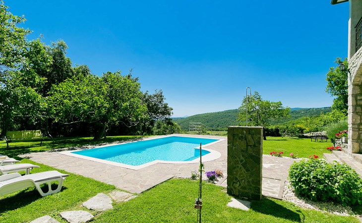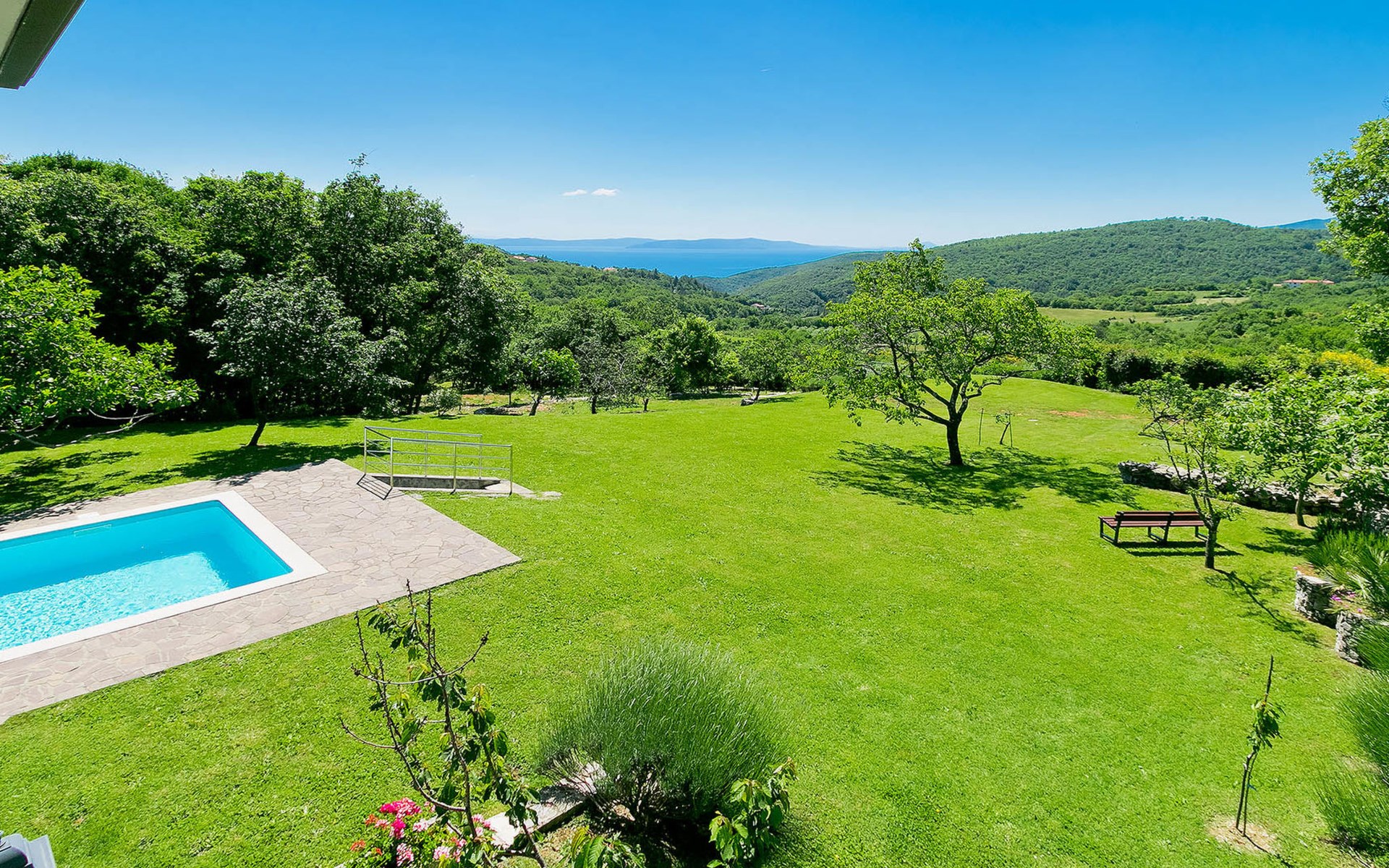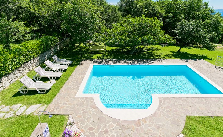 Beautiful single-family house "Panorama 2", 2 storeys. In the district of Čekadi 700 m from the centre of Labin, in a quiet, sunny, elevated position, 5 km from the sea, in the countryside. Private: property 7'000 m2, beautiful garden with lawn, swimming pool angular (8 x 4 m, depth 140 cm, seasonal availability: 21.Mar. - 01.Nov.) with internal staircase. Outdoor shower, pool maintenance by the owner/gardener. In the house: internet access, sauna (extra). Hot tub (extra). Relaxation room, spa area in 50 m (extra), washing machine. Parking at the house on the premises. Shop 300 m, supermarket 1.2 km, restaurant 1.2 km, bus stop 1.1 km, pebble beach 5 km. Riding stable 3 km, walking paths from the house 100 m, cycle lane 150 m.