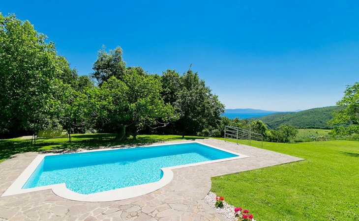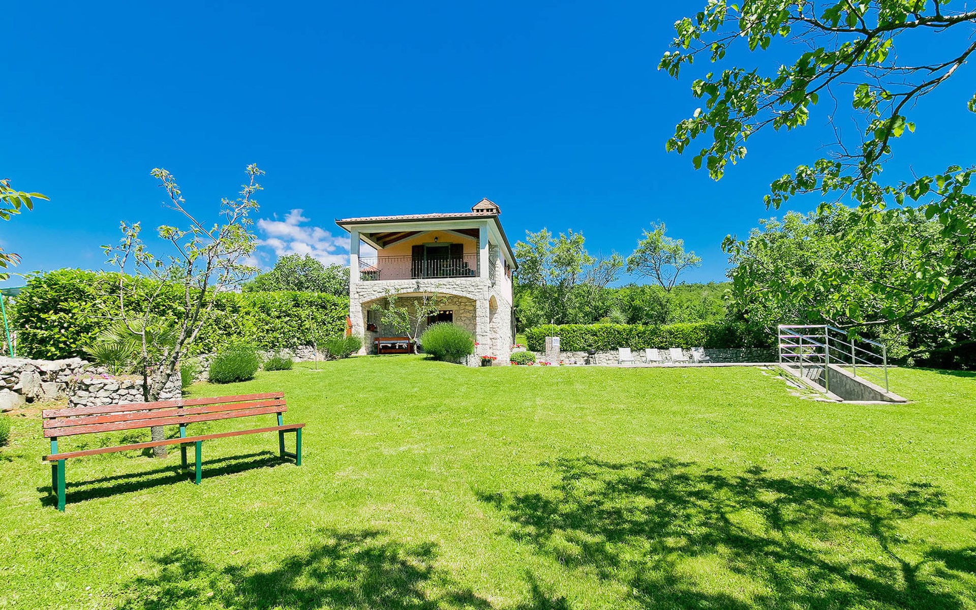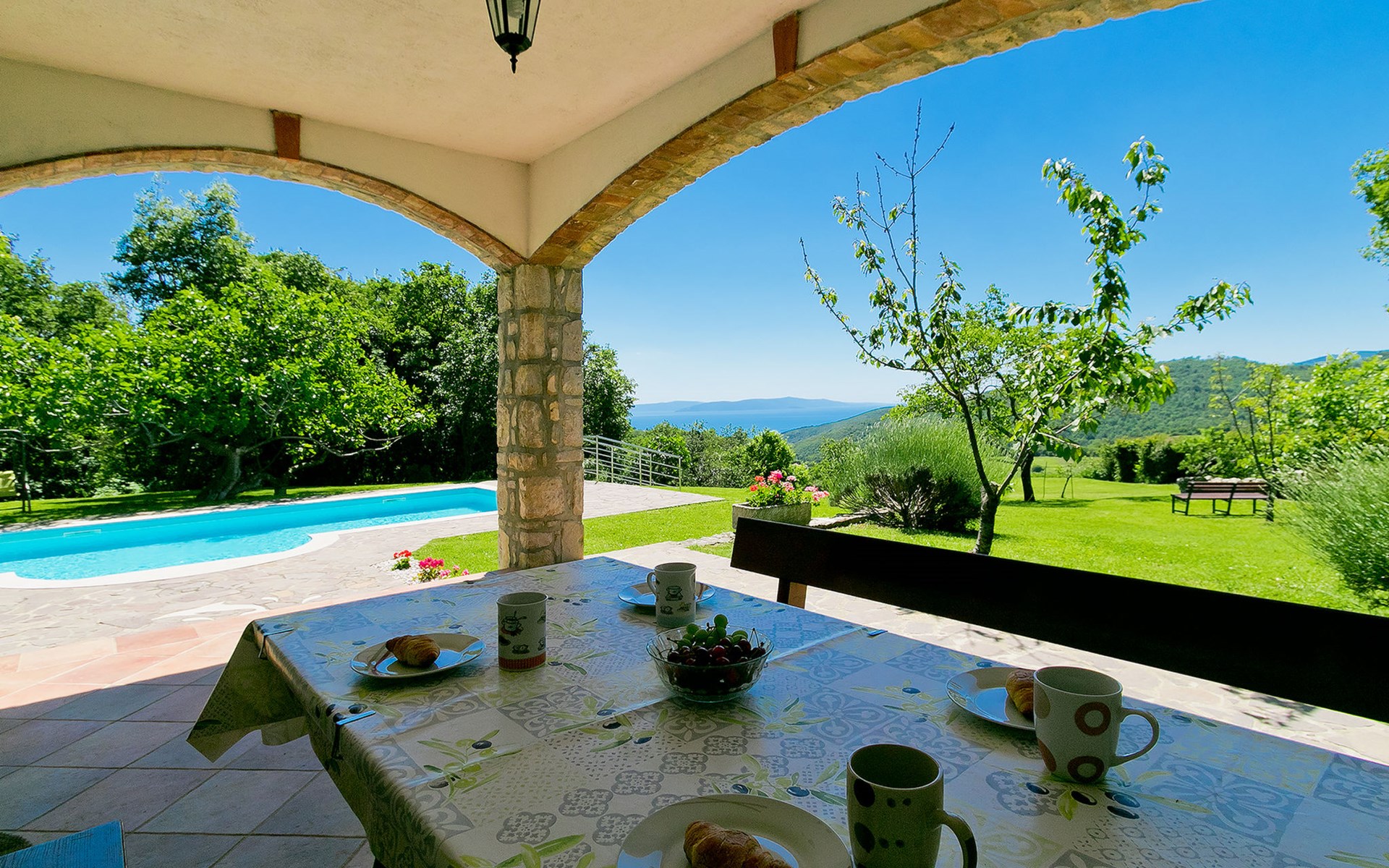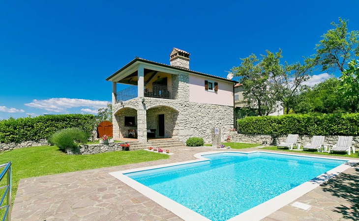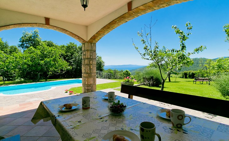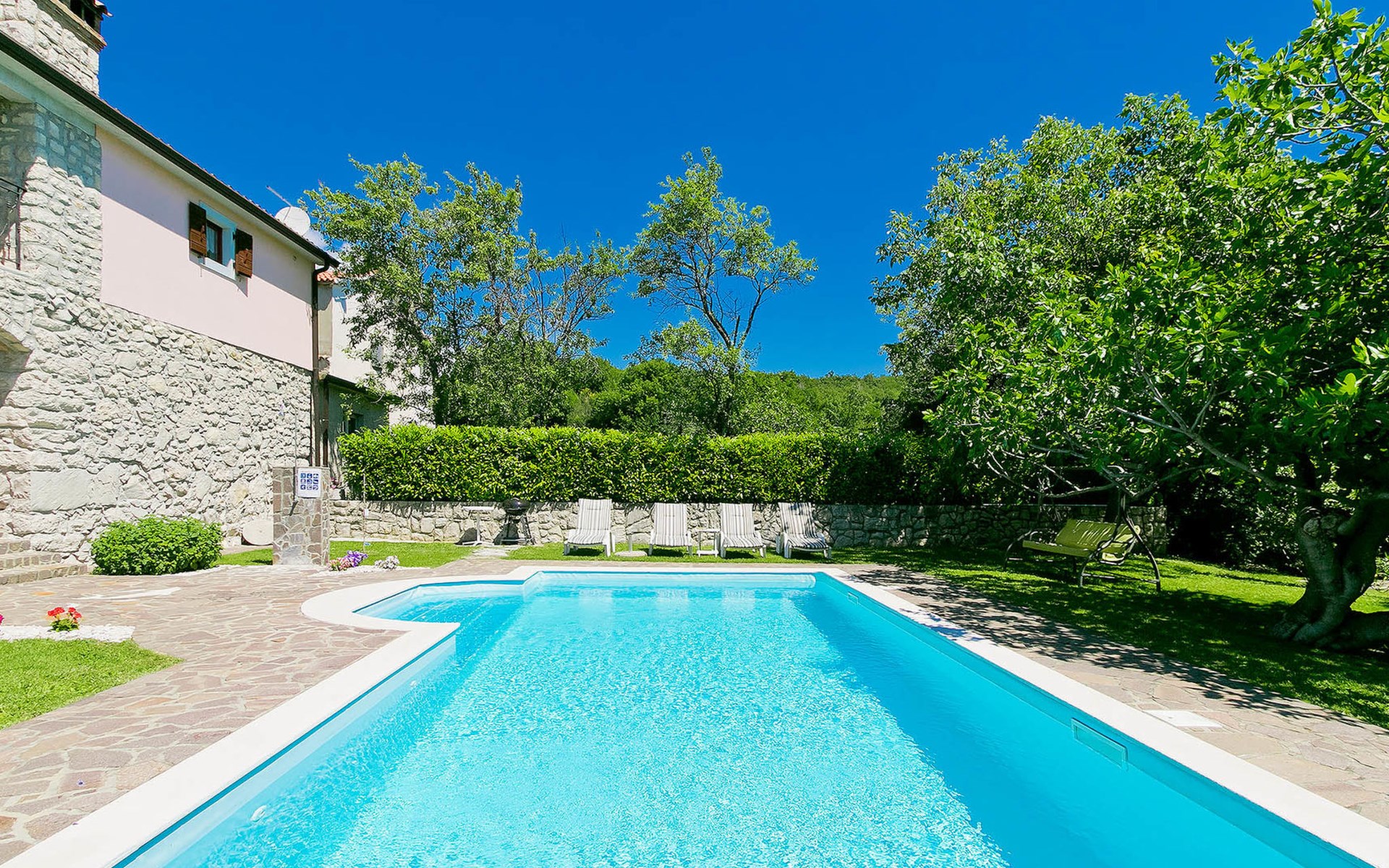 Beautiful single-family house "Panorama 2", 2 storeys. In the district of Čekadi 700 m from the centre of Labin, in a quiet, sunny, elevated position, 5 km from the sea, in the countryside. Private: property 7'000 m2, beautiful garden with lawn, swimming pool angular (8 x 4 m, depth 140 cm, seasonal availability: 21.Mar. - 01.Nov.) with internal staircase. Outdoor shower, pool maintenance by the owner/gardener. In the house: internet access, sauna (extra). Hot tub (extra). Relaxation room, spa area in 50 m (extra), washing machine. Parking at the house on the premises. Shop 300 m, supermarket 1.2 km, restaurant 1.2 km, bus stop 1.1 km, pebble beach 5 km. Riding stable 3 km, walking paths from the house 100 m, cycle lane 150 m.