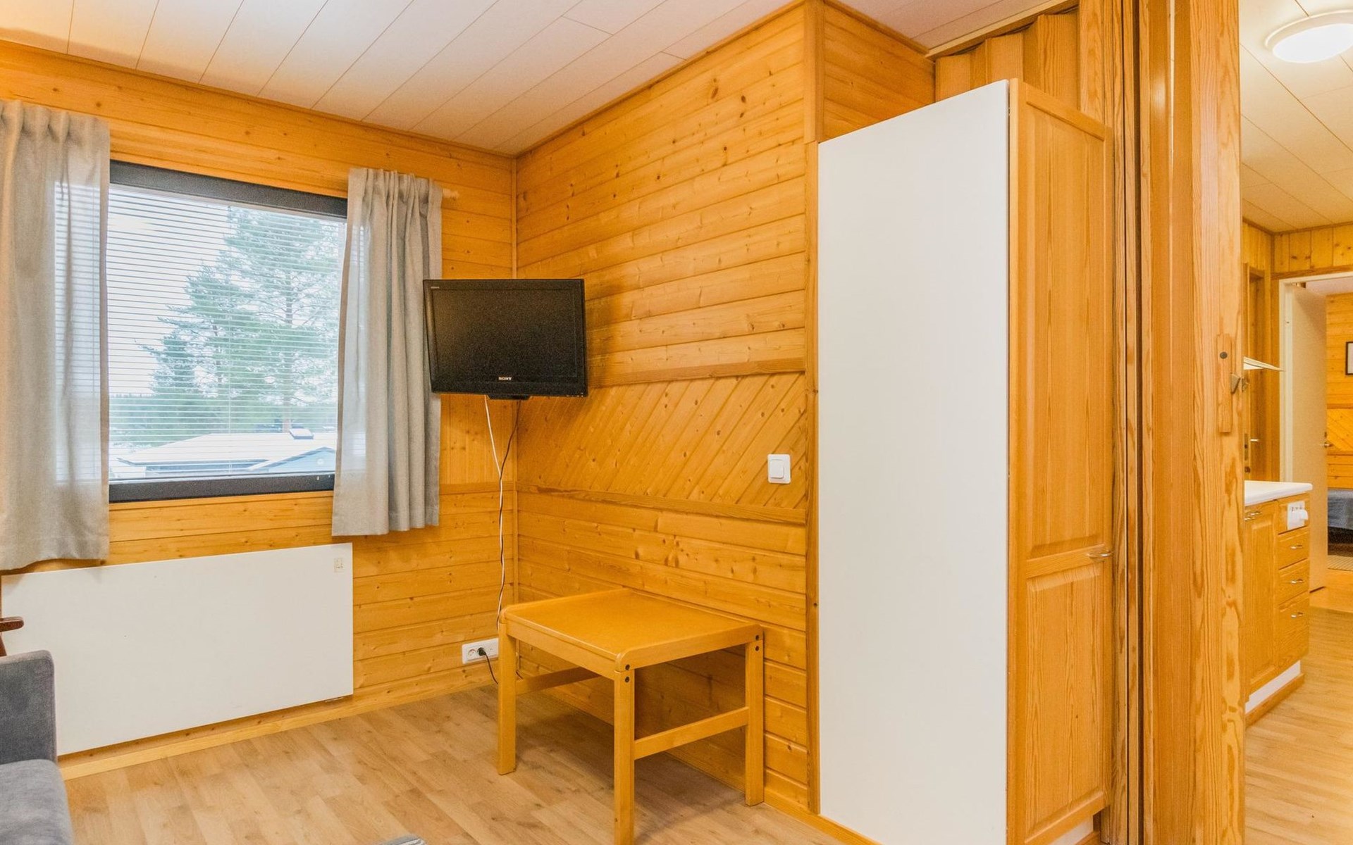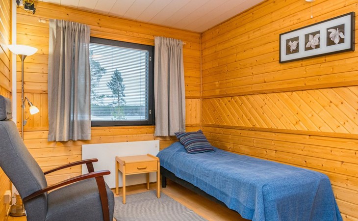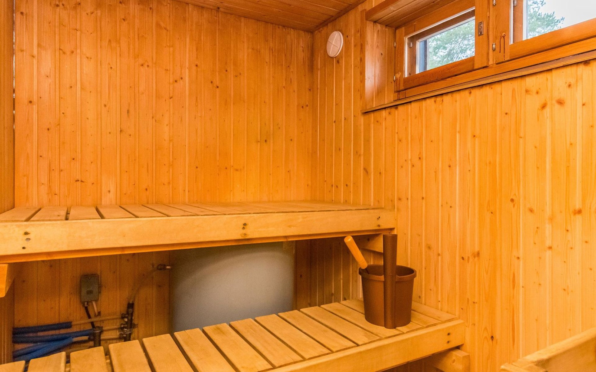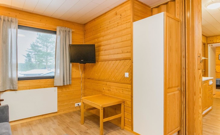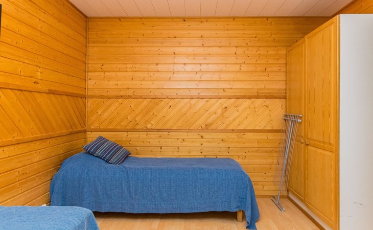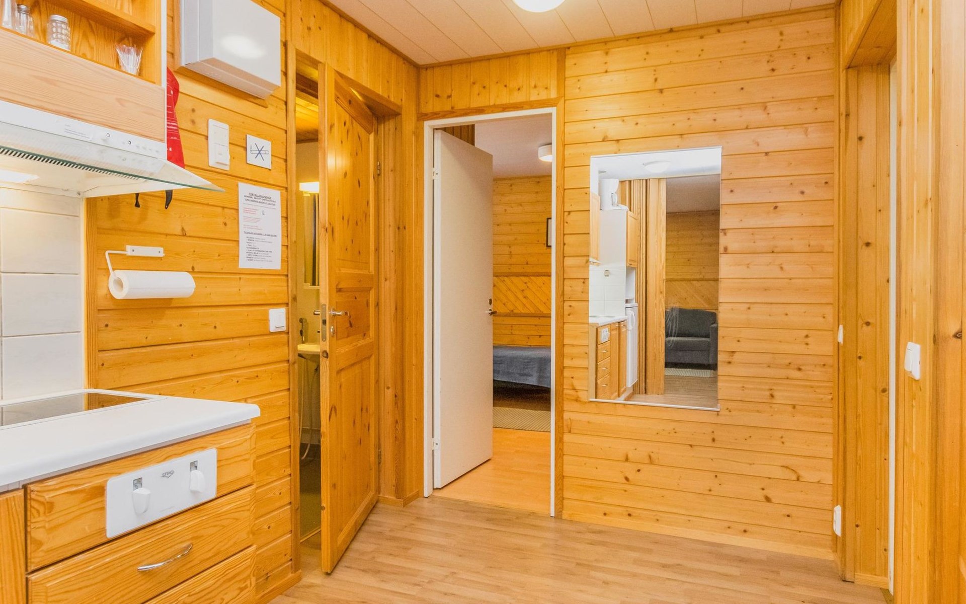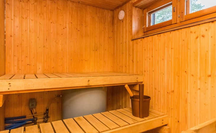 Wooden cabin with boarded outer walls, built in 1985, and refurbished in 2024. A kitchen with two hot plates but no oven, a living room with a sofa bed for two, and a bedroom with two single beds. The washroom features a shower and a WC, and the sauna is equipped with an electric stove.