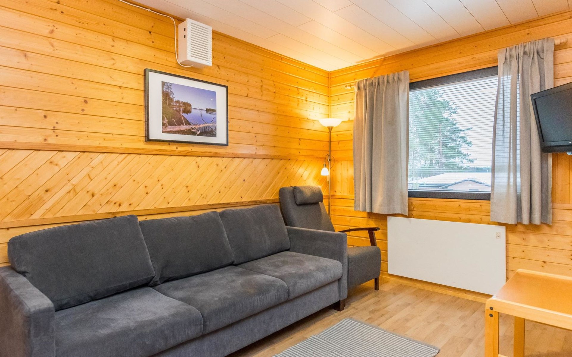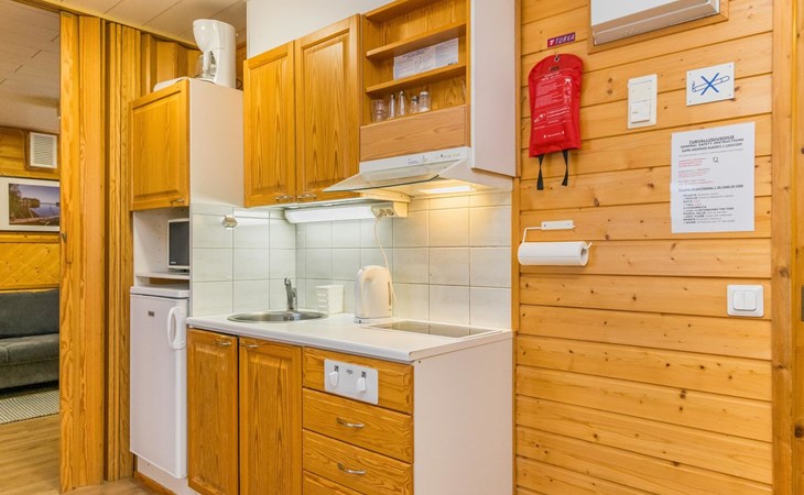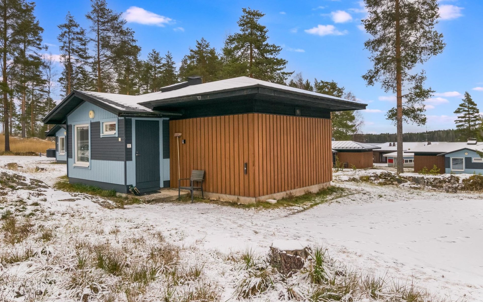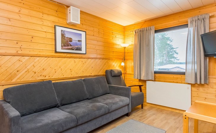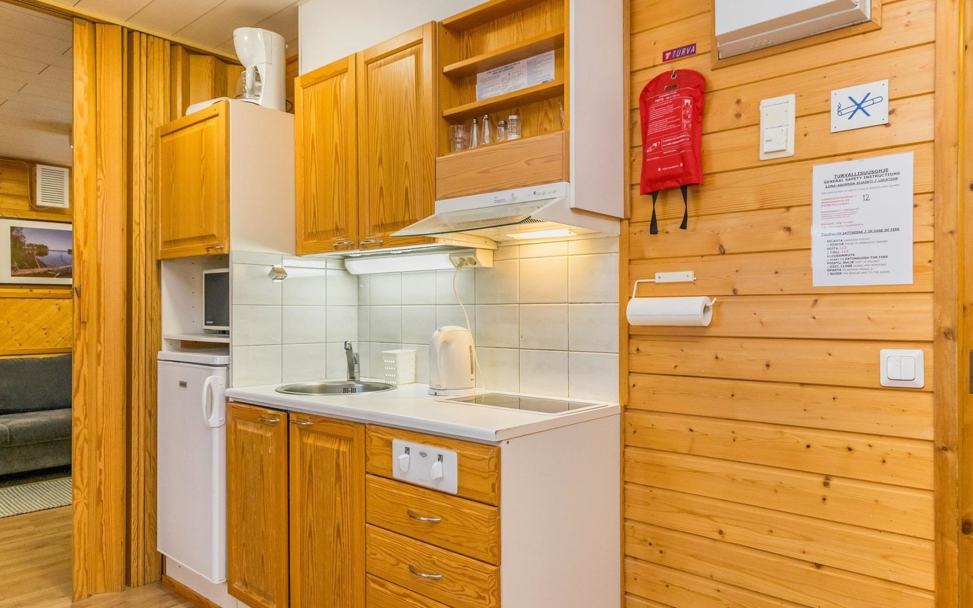 Wooden cabin with boarded outer walls, built in 1985, and refurbished in 2024. A kitchen with two hot plates but no oven, a living room with a sofa bed for two, and a bedroom with two single beds. The washroom features a shower and a WC, and the sauna is equipped with an electric stove.