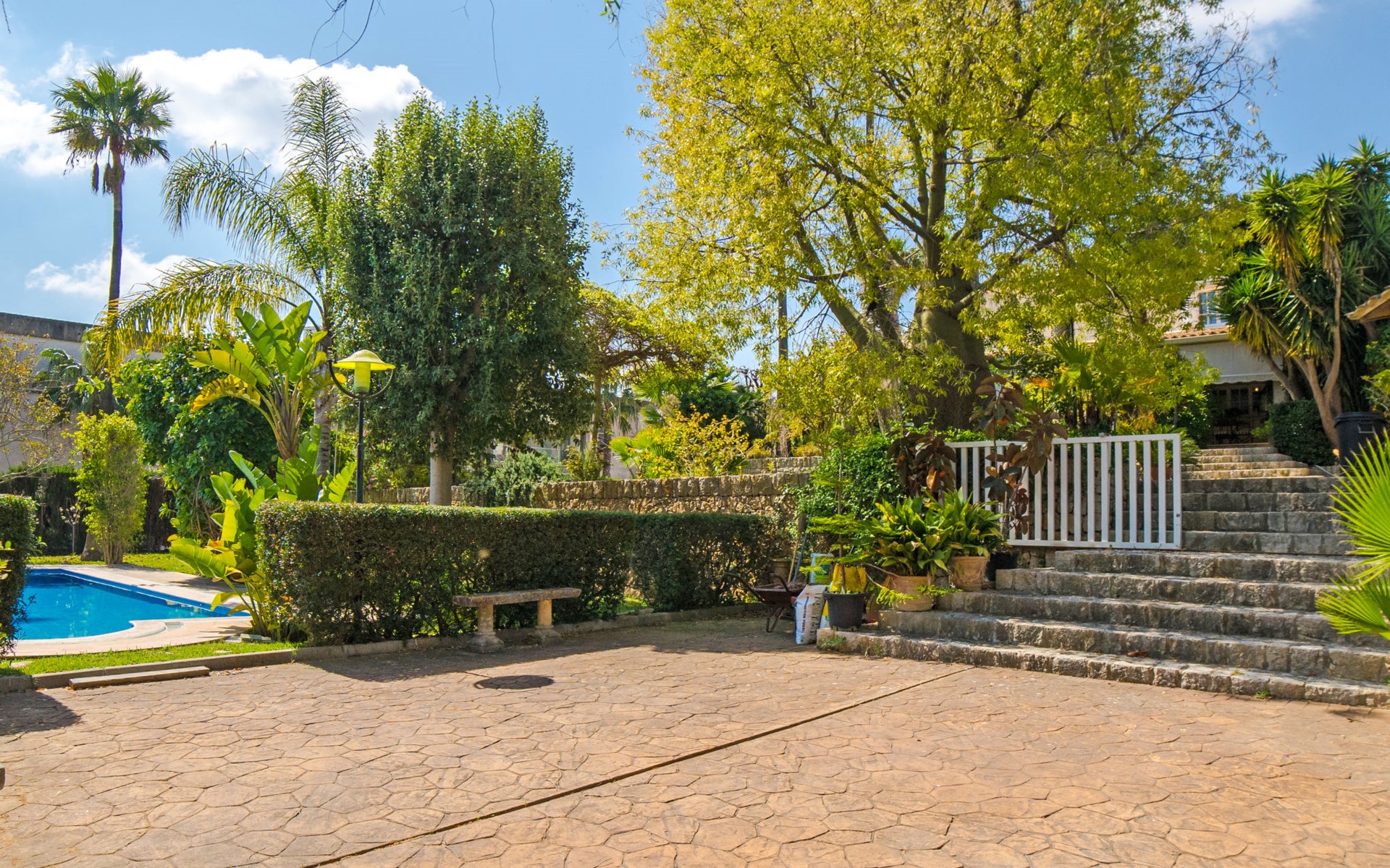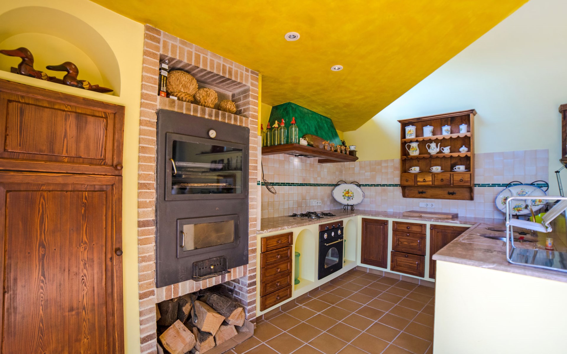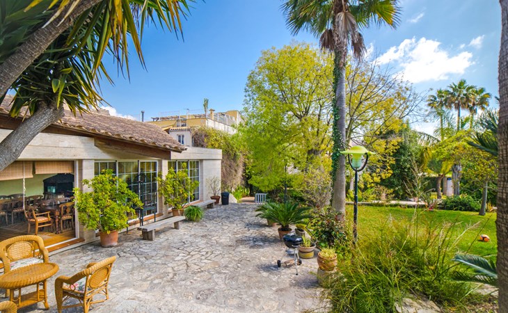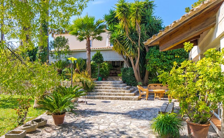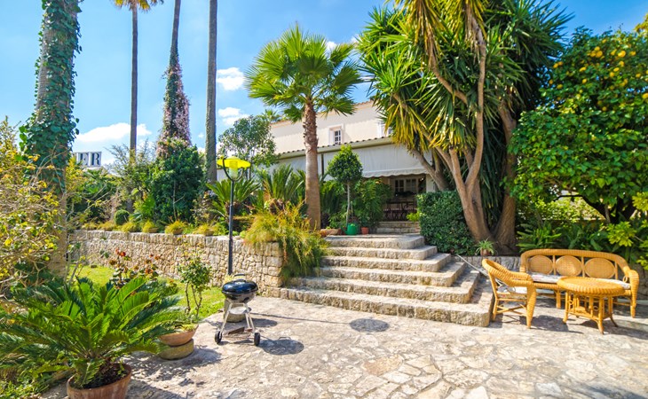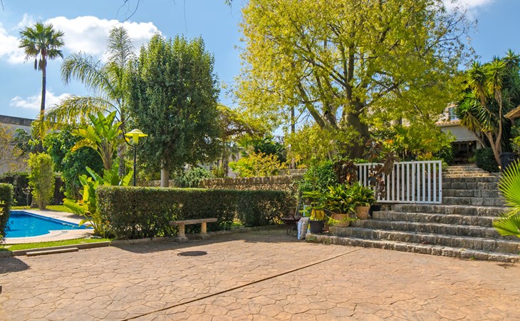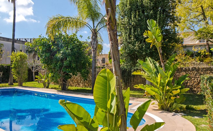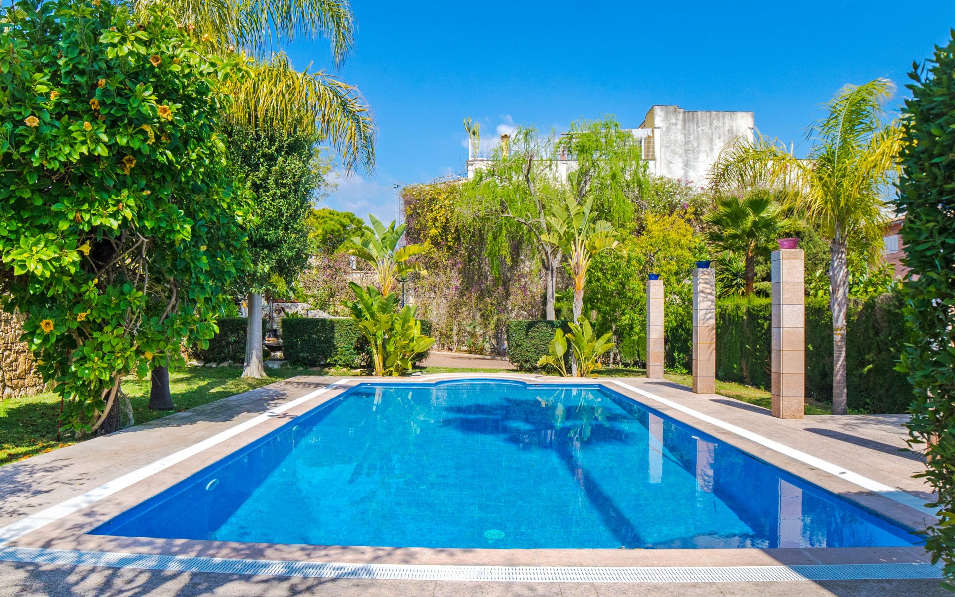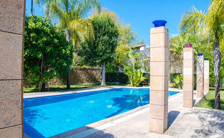 Inca: Very large, beautiful, luxurious villa "Villa Can Mandol", 2 storeys. In the resort Inca, in a sunny position, 22 km from the sea, 22 km from the beach. Private: large, beautiful, well-kept garden with lawn and trees, swimming pool angular (10 x 5 m, depth 200 cm, seasonal availability: 01.Jan. - 31.Dec.). Outdoor shower, pool house with fridge, shower, WC and cooking stove, patio, arbour, pergola, garden furniture, barbecue, barbecue house. In the house: internet access, WiFi, central heating system, air conditioning, washing machine. Parking at the house on the premises. Shop, grocery, supermarket 500 m, restaurant, bar 10 m, bakery 200 m, café, internet café, pub garden 10 m, bus stop "Inca" 2 km, railway station "Inca" 2 km, sandy beach "Port Alcúdia" 25 km, shingle beach "Alcanada Alcúdia" 27 km. Sports harbour 25 km, marina 25 km, golf course (18 hole) 27 km. Please note: suitable for families, suitable for seniors. Object suitable for 8 adults groups of teenagers on request only. Loading and unloading of baggage is possible at the holiday house. Airfield 40 km from the property.