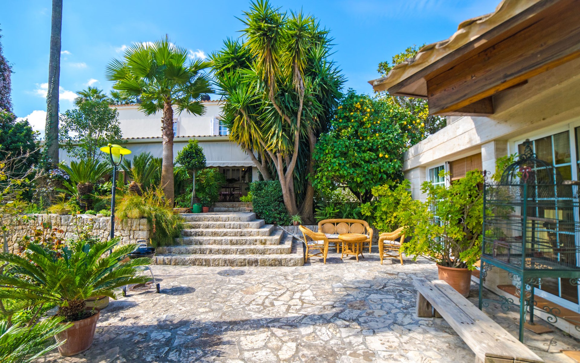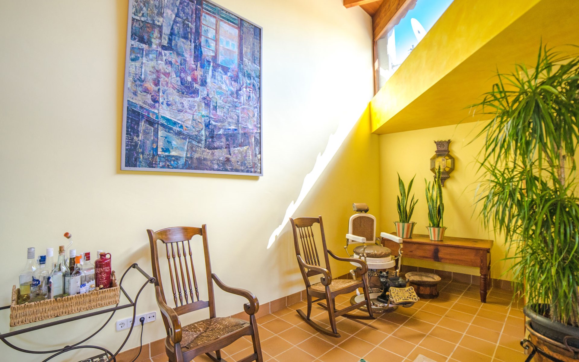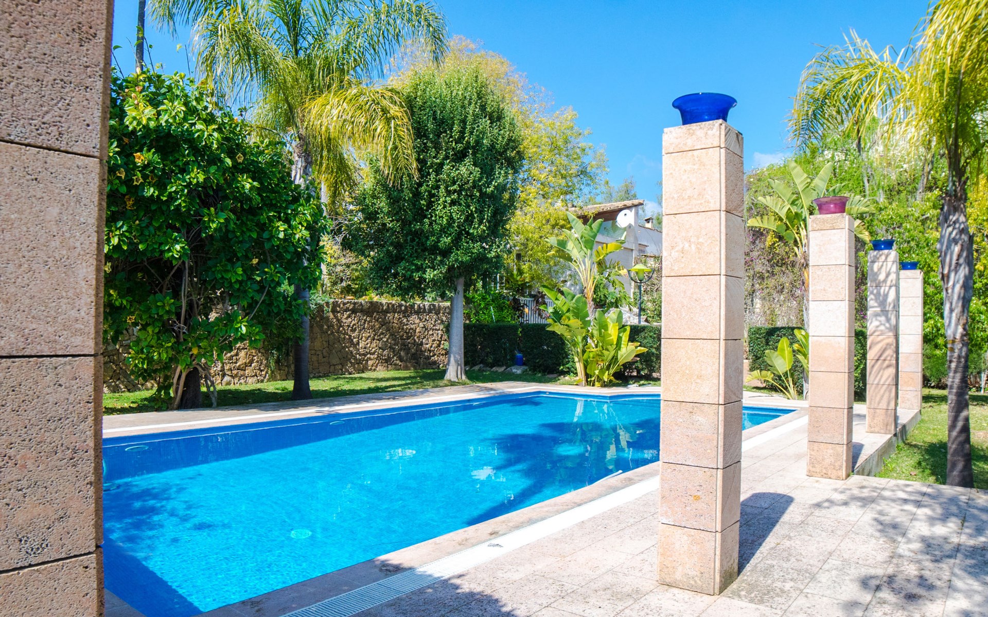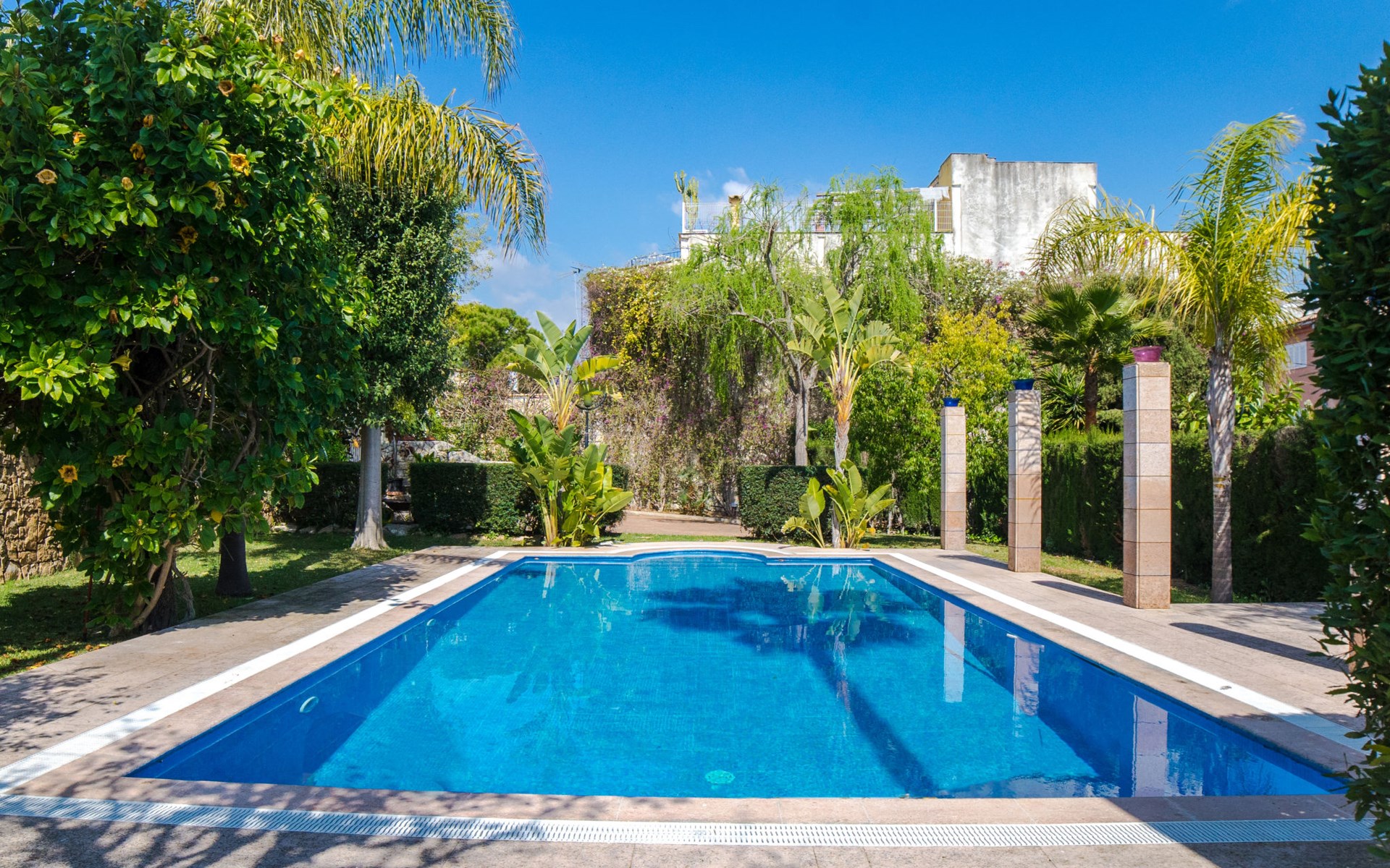 Inca: Very large, beautiful, luxurious villa "Villa Can Mandol", 2 storeys. In the resort Inca, in a sunny position, 22 km from the sea, 22 km from the beach. Private: large, beautiful, well-kept garden with lawn and trees, swimming pool angular (10 x 5 m, depth 200 cm, seasonal availability: 01.Jan. - 31.Dec.). Outdoor shower, pool house with fridge, shower, WC and cooking stove, patio, arbour, pergola, garden furniture, barbecue, barbecue house. In the house: internet access, WiFi, central heating system, air conditioning, washing machine. Parking at the house on the premises. Shop, grocery, supermarket 500 m, restaurant, bar 10 m, bakery 200 m, café, internet café, pub garden 10 m, bus stop "Inca" 2 km, railway station "Inca" 2 km, sandy beach "Port Alcúdia" 25 km, shingle beach "Alcanada Alcúdia" 27 km. Sports harbour 25 km, marina 25 km, golf course (18 hole) 27 km. Please note: suitable for families, suitable for seniors. Object suitable for 8 adults groups of teenagers on request only. Loading and unloading of baggage is possible at the holiday house. Airfield 40 km from the property.
