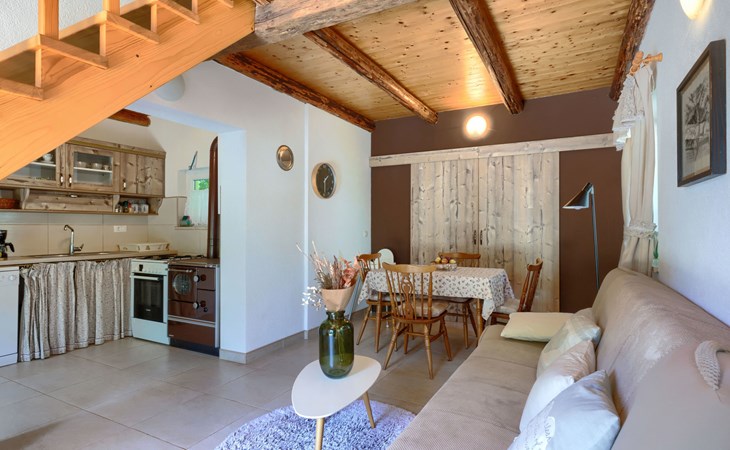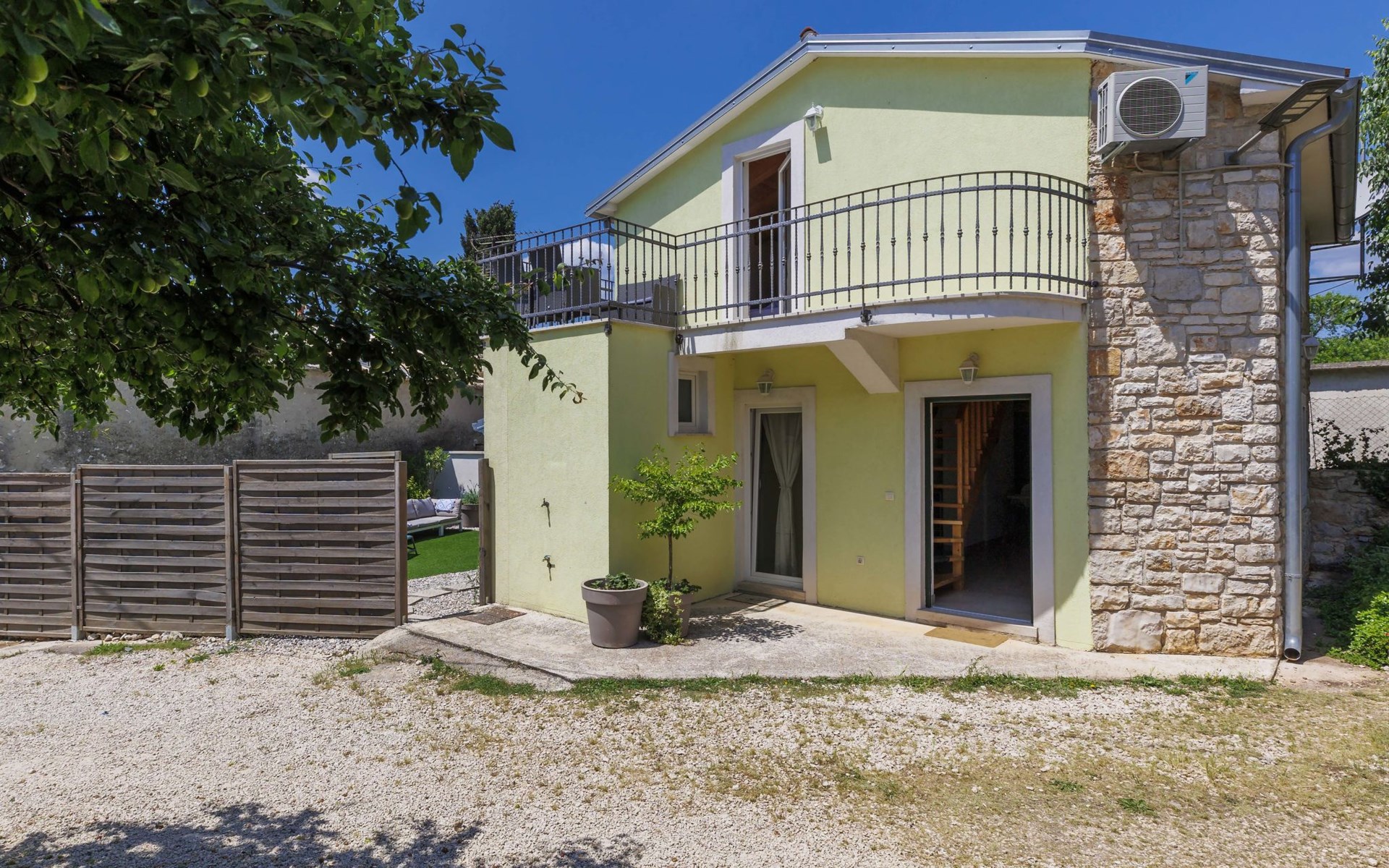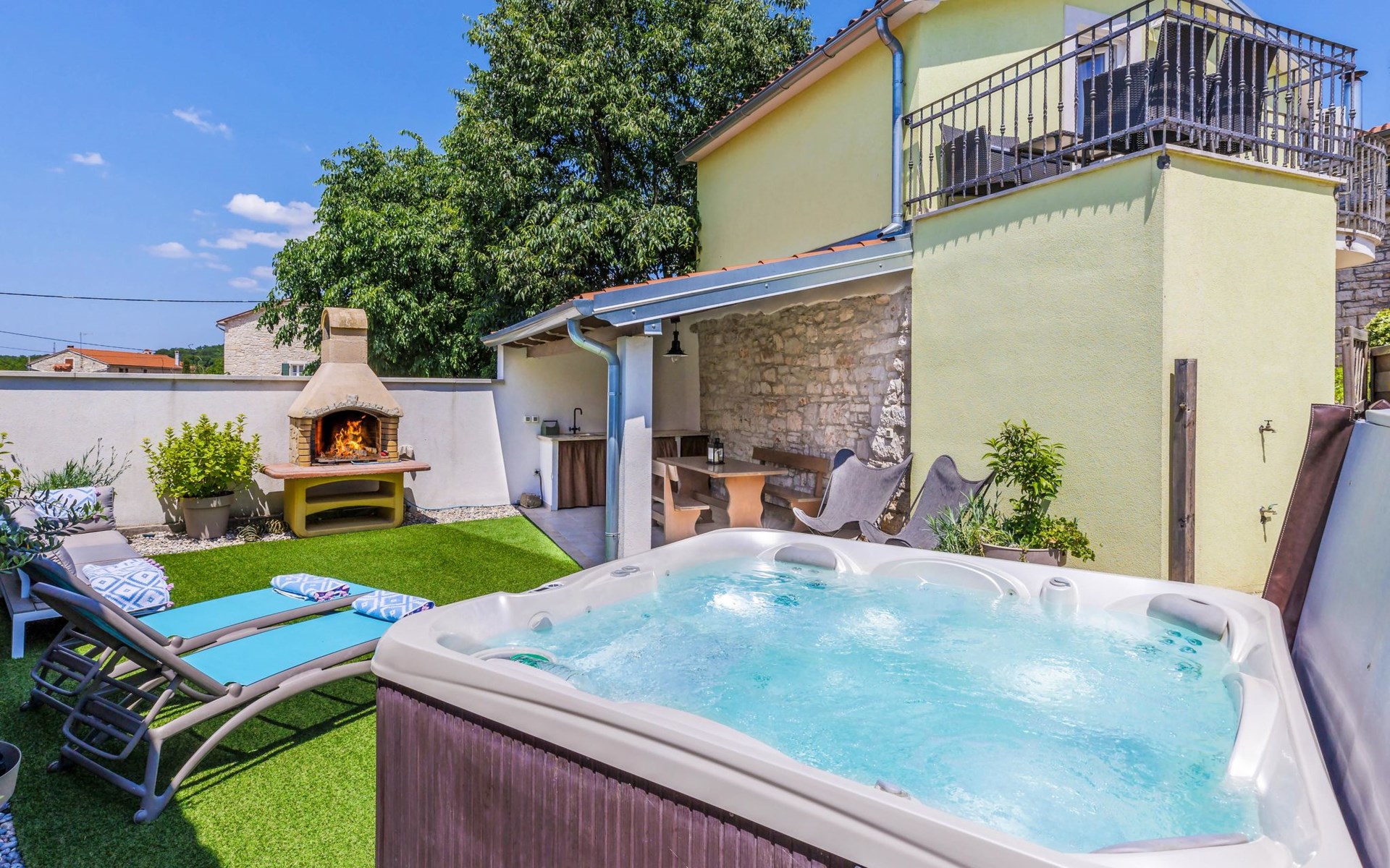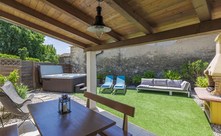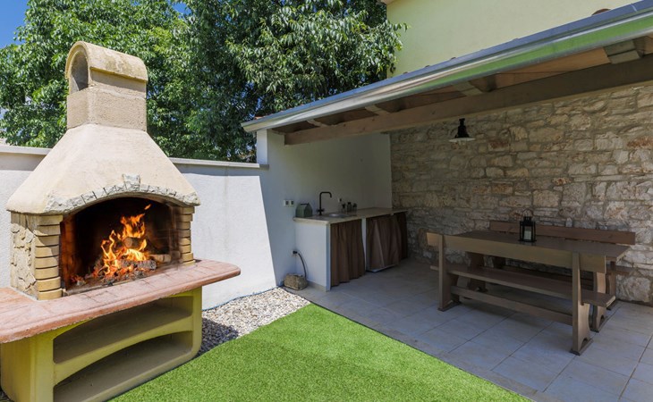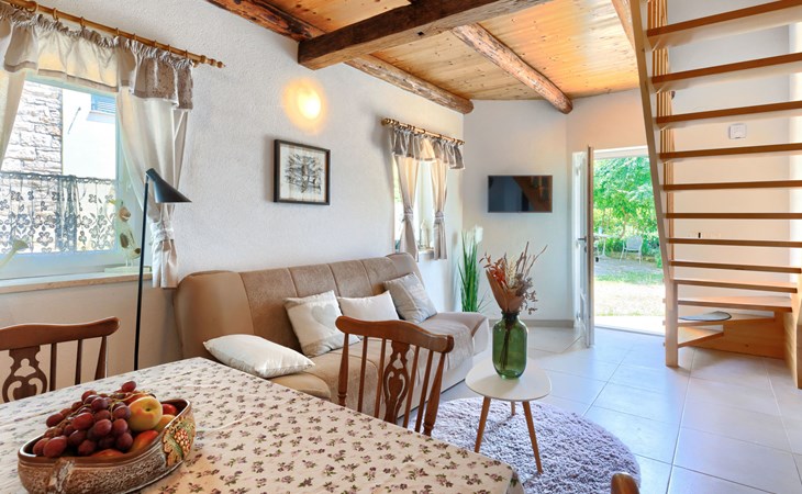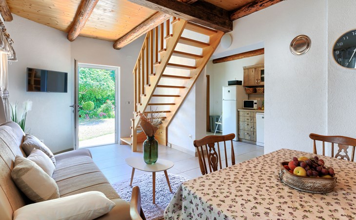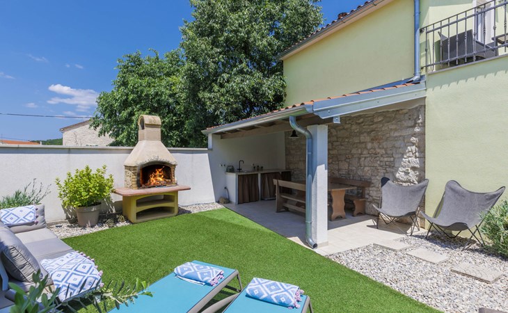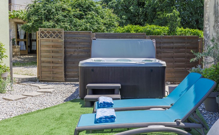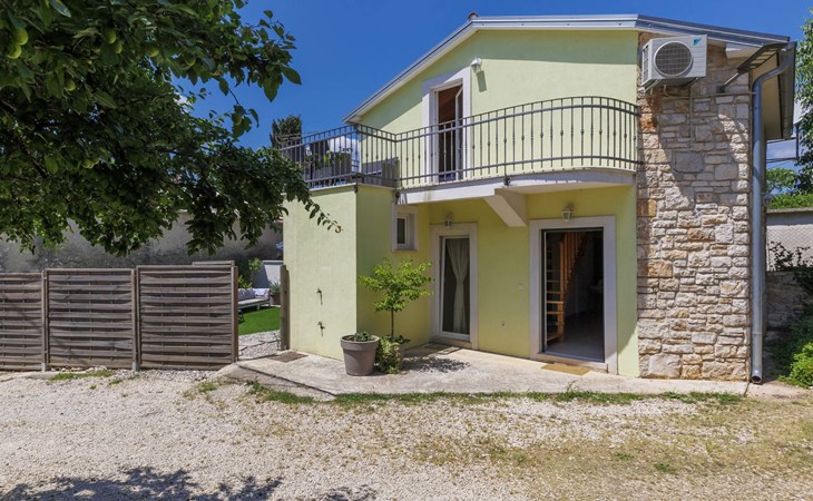 Rovinjsko Selo 6 km from Rovinj: Single-family house "Ana", 2 storeys. In the hamlet Bubani 5.6 km from the centre of Rovinjsko Selo, 9 km from the centre of Kanfanar, in a quiet, sunny position, 4.5 km from the sea. Private: property 25 m2 (fenced). In the house: internet access, hot tub, washing machine. Parking (for 2 cars) at the house on the premises. Shop 5 km, supermarket 9.5 km, restaurant 1 km, bus stop 650 m, pebble beach 4.5 km, rocky beach 4.5 km. Walking paths from the house 200 m, cycle lane 250 m. Please note: animals in the neighbourhood.