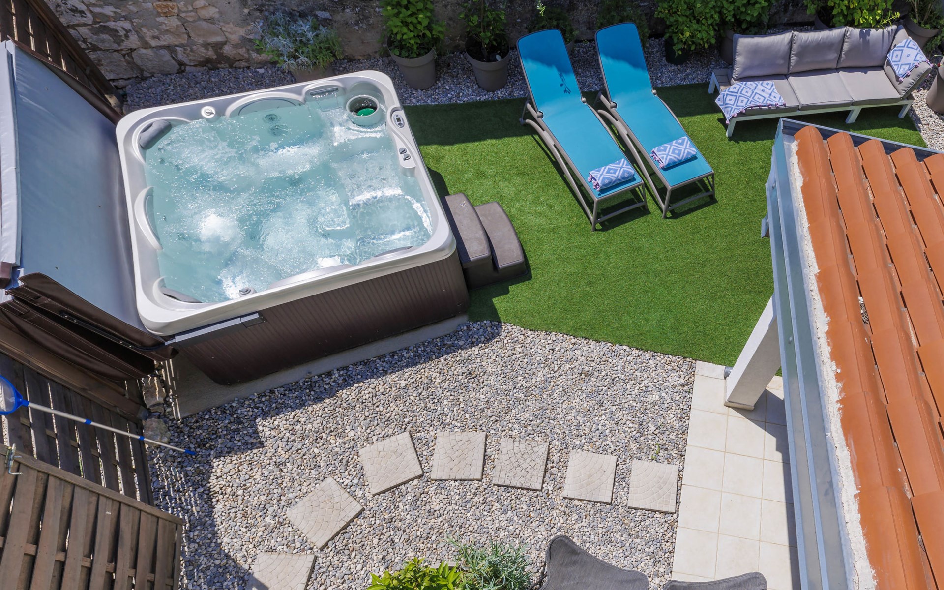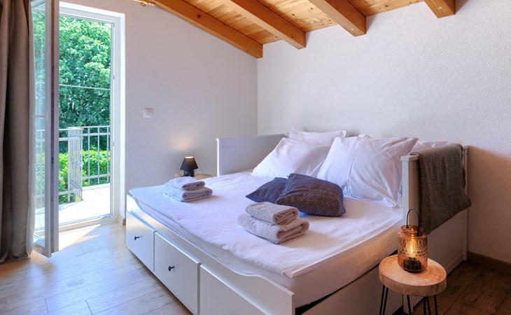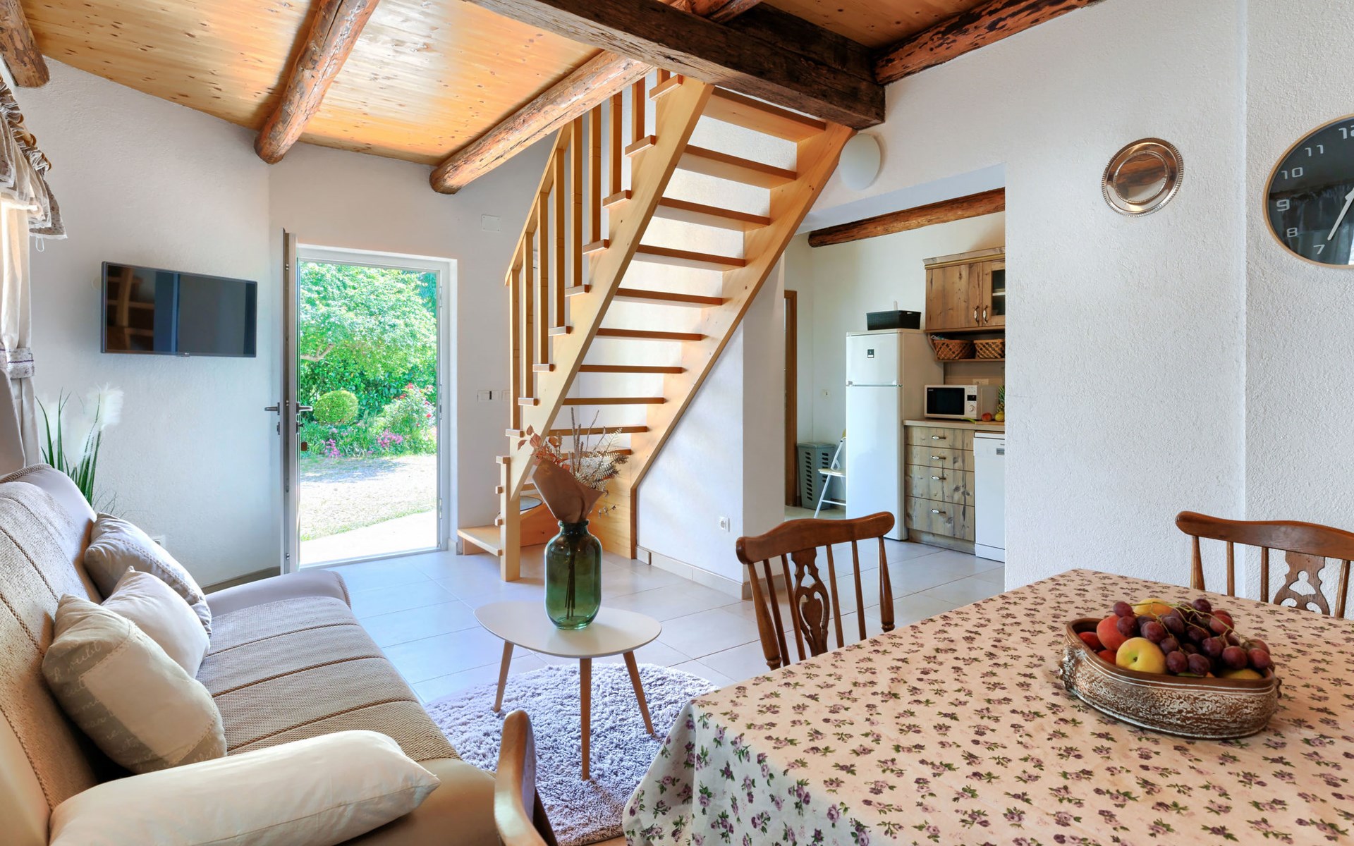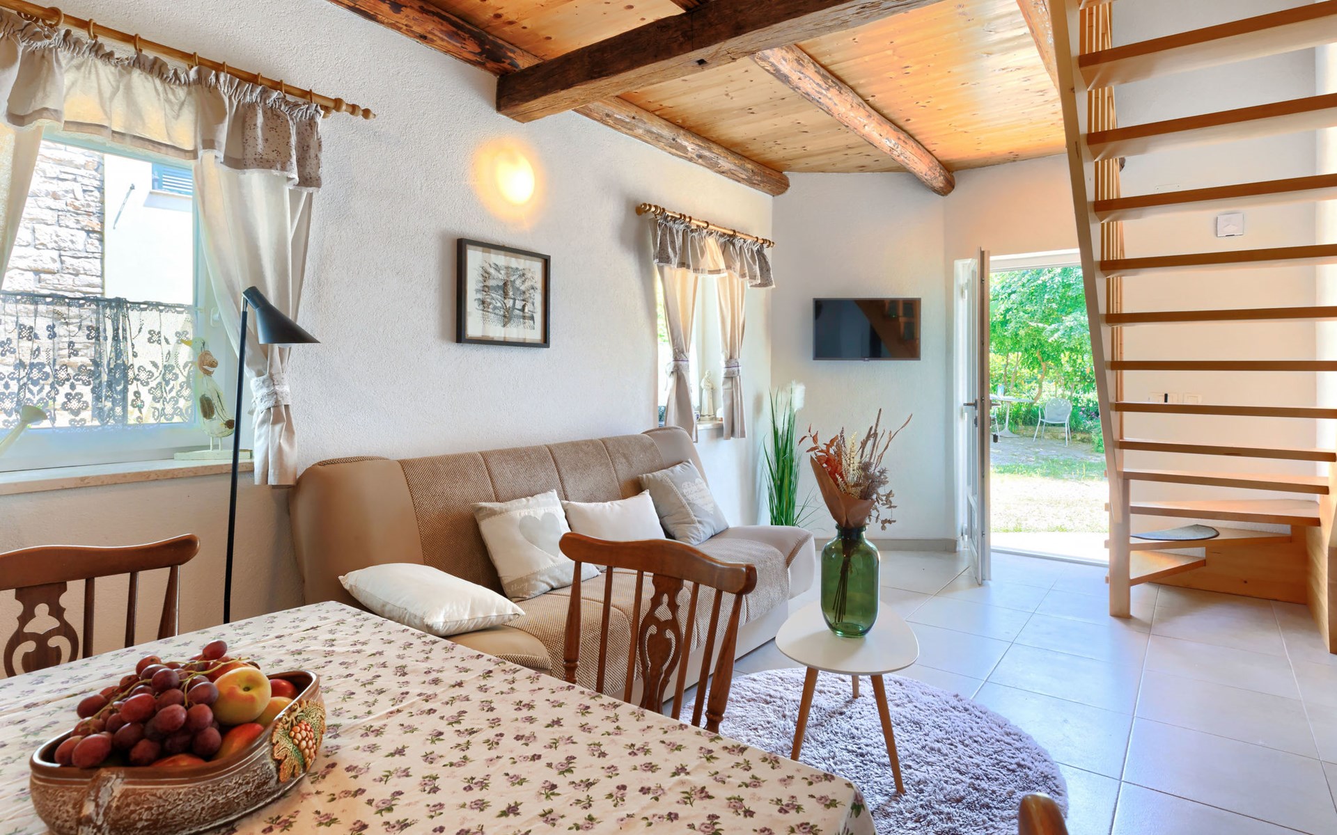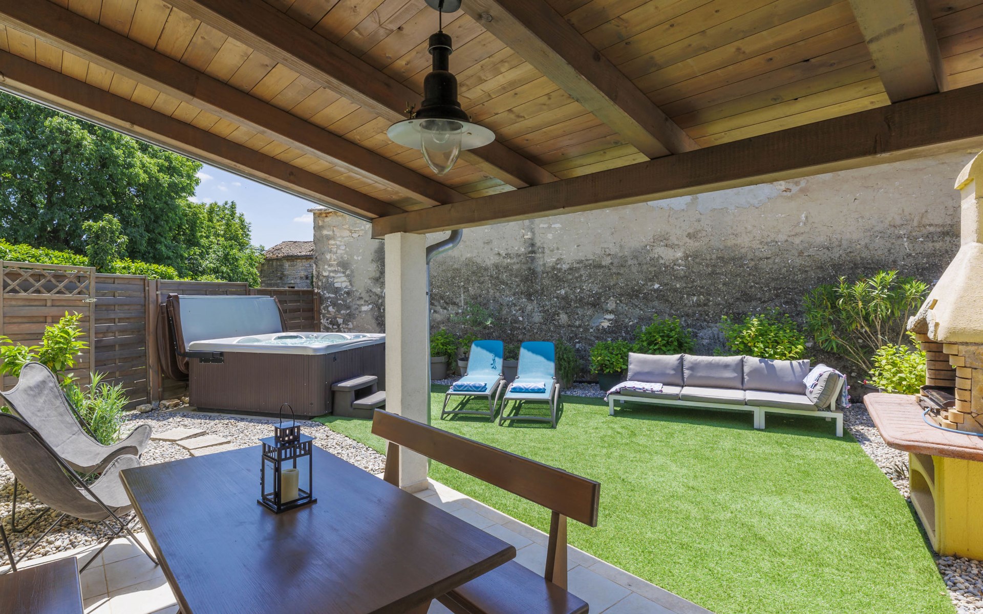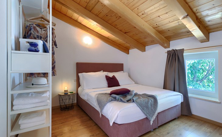 Rovinjsko Selo 6 km from Rovinj: Single-family house "Ana", 2 storeys. In the hamlet Bubani 5.6 km from the centre of Rovinjsko Selo, 9 km from the centre of Kanfanar, in a quiet, sunny position, 4.5 km from the sea. Private: property 25 m2 (fenced). In the house: internet access, hot tub, washing machine. Parking (for 2 cars) at the house on the premises. Shop 5 km, supermarket 9.5 km, restaurant 1 km, bus stop 650 m, pebble beach 4.5 km, rocky beach 4.5 km. Walking paths from the house 200 m, cycle lane 250 m. Please note: animals in the neighbourhood.