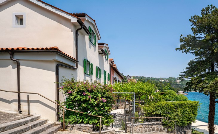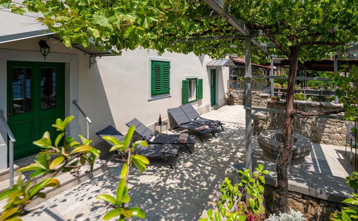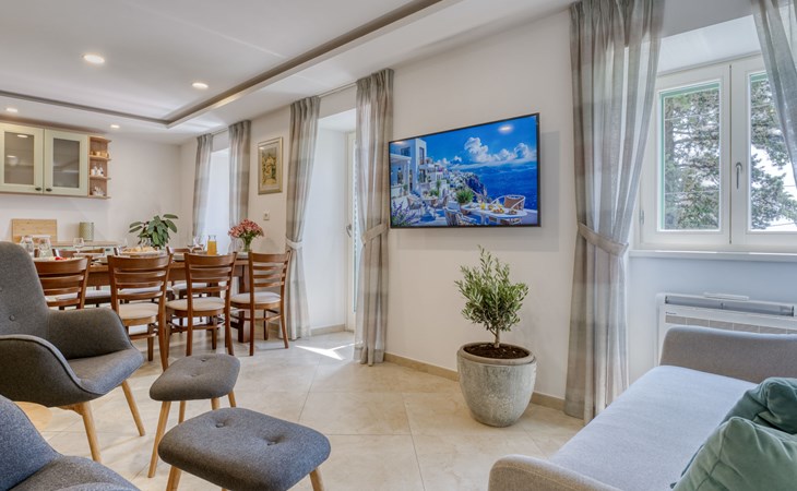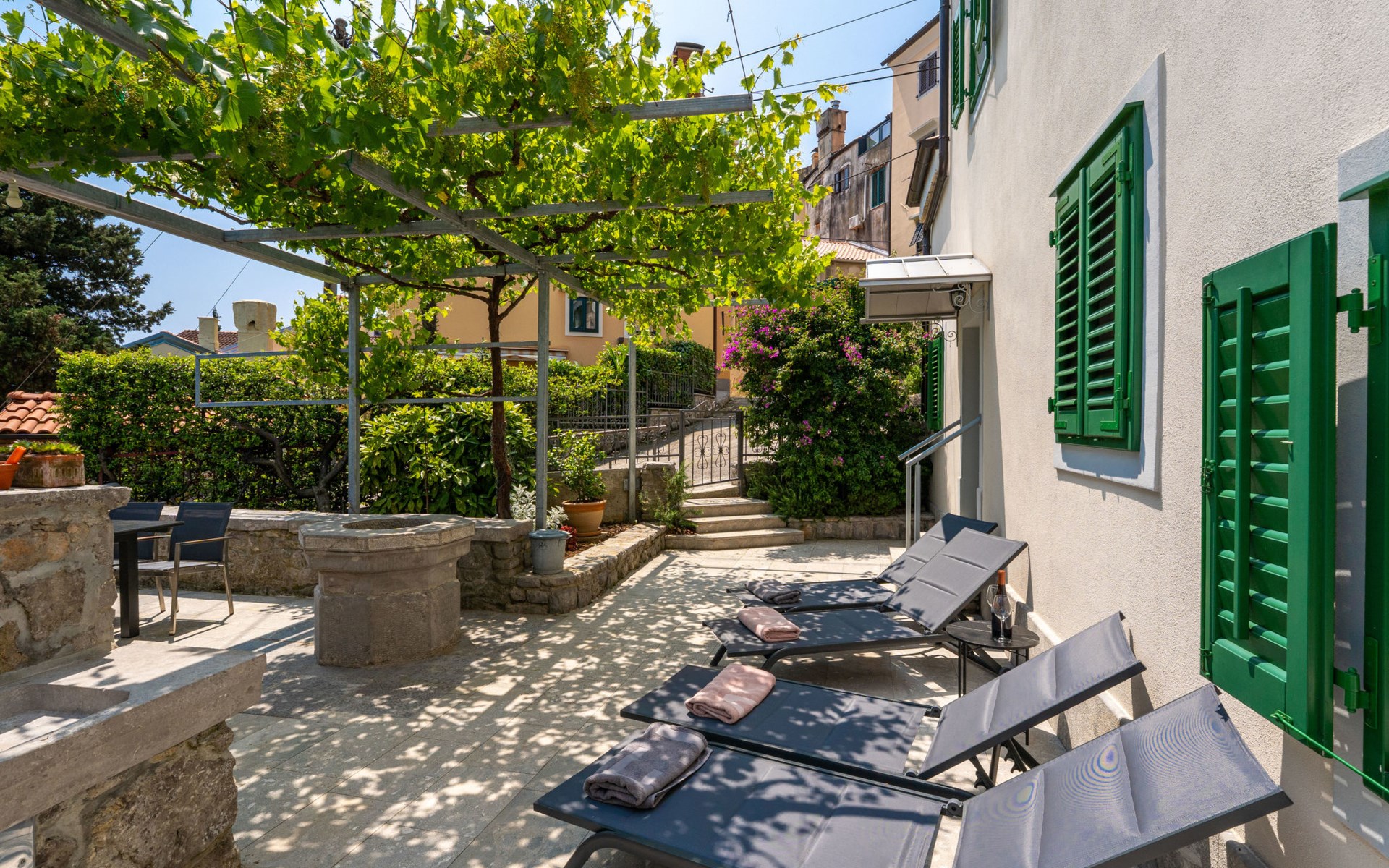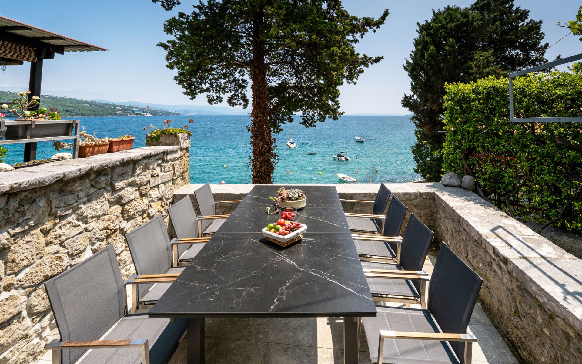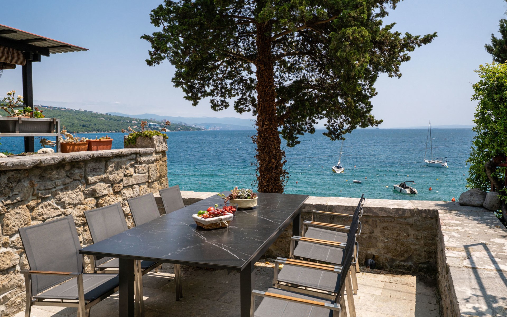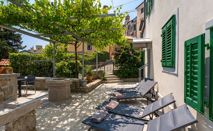Volosko: Semi-detached house "Conrad", 3 storeys. In the centre of Volosko 1.5 km from the centre of Opatija, in a sunny position, 30 m from the sea, 50 m from the beach. Private: outdoor shower, terrace (45 m2), garden furniture. In the house: internet access, air conditioning. Stepped path (30 steps) to the house. Public parking on the road. Shop 200 m, supermarket 500 m, restaurant 30 m, bar 20 m, bus stop 200 m, pebble beach, concrete beach 50 m. Surf school, walking paths from the house 150 m, children's playground 20 m. Groups of teenagers on request only. Part of the house is closed and unoccupied.