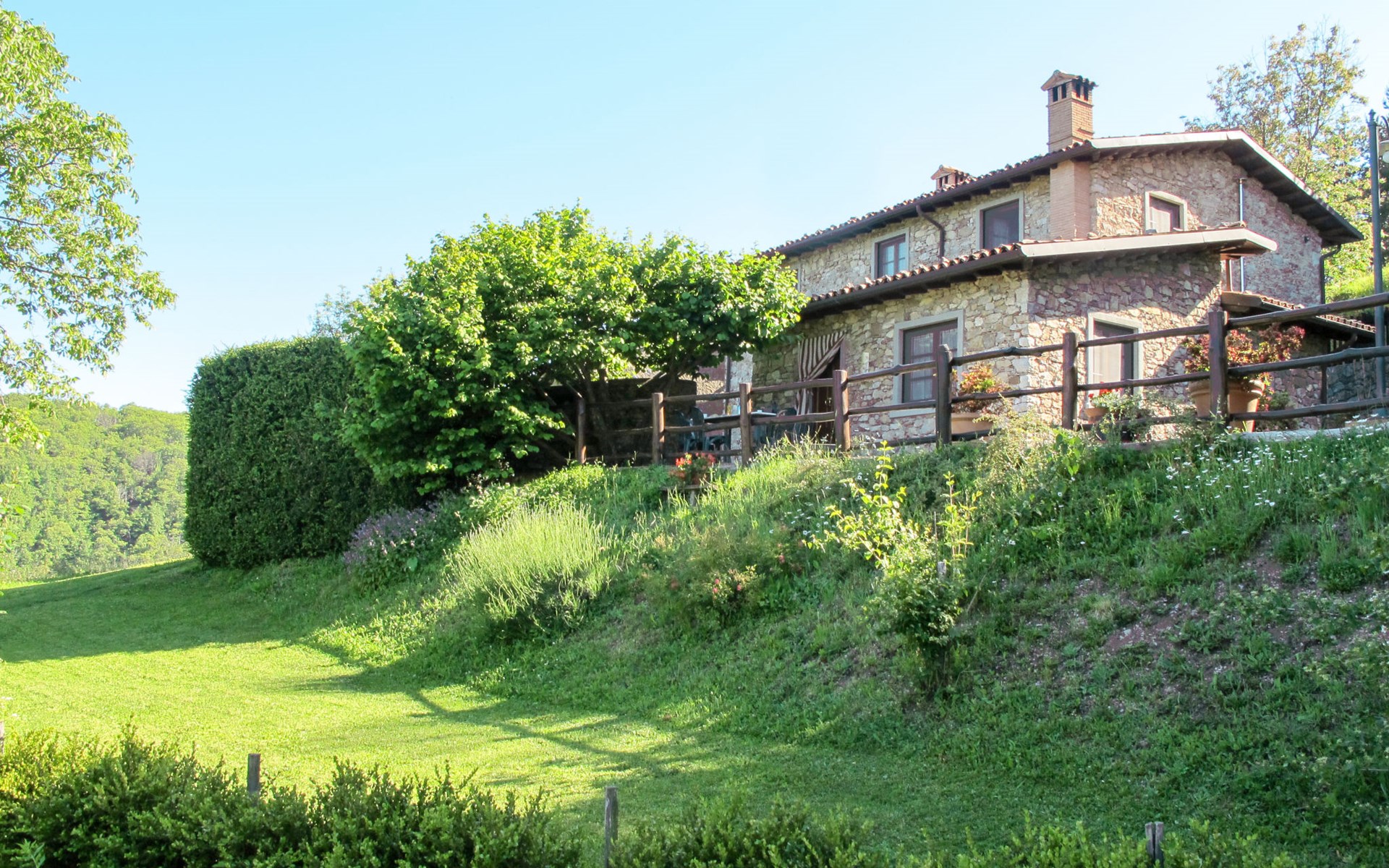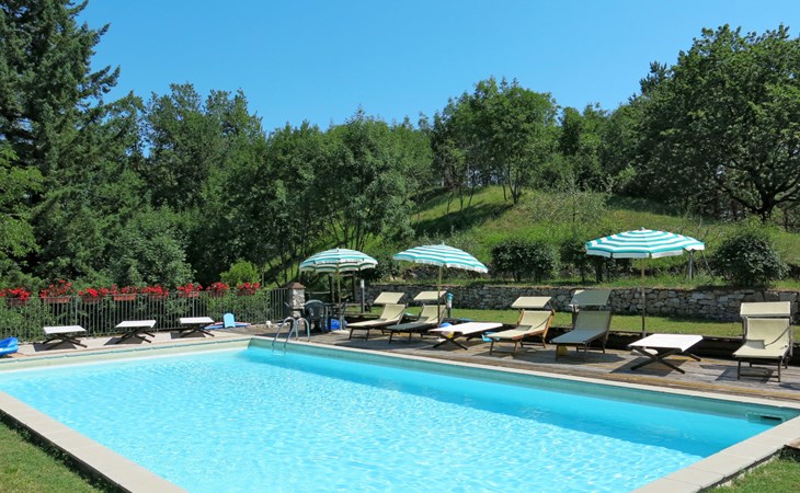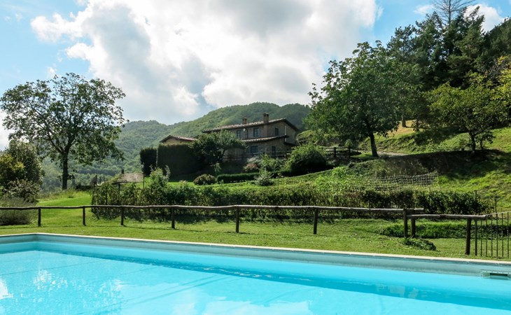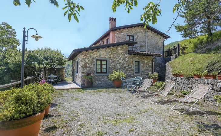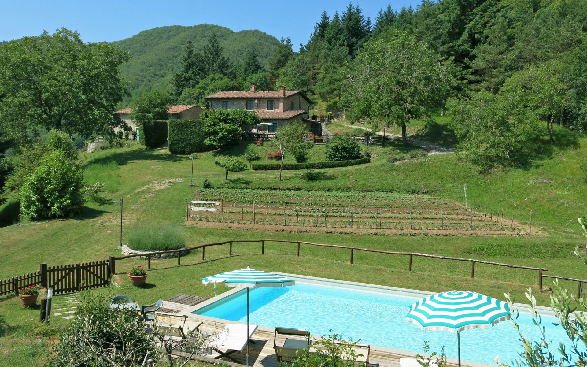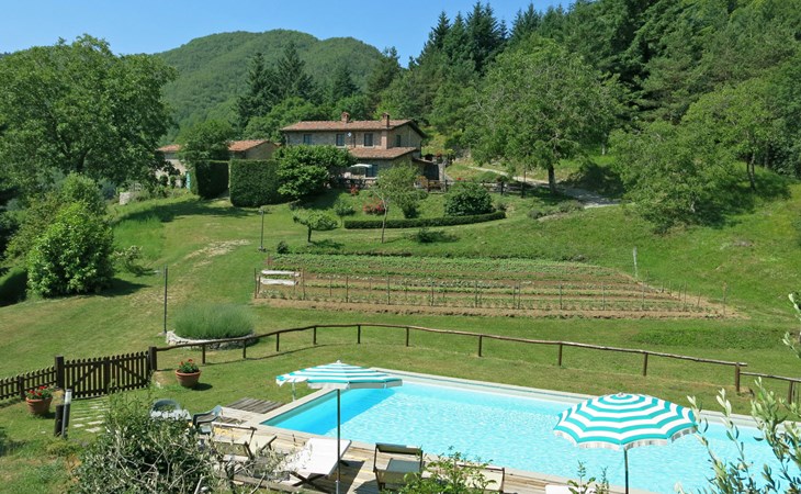 Molazzana 8 km from Casteln. di Garfagnana: Country house "Le Bore", 700 m a.s.l., surrounded by trees and meadows. 2 houses in the resort. 8 km from the centre of Castelnuovo di Garfagnana, 47 km from the centre of Lucca, 64 km from the centre of Pisa, in a secluded, quiet position on a slope, 74 km from the sea, in the countryside. For shared use: property 50'000 m2 (fenced), small garden with lawn and plants, natural garden, meadow, swimming pool (12 x 6 m, seasonal availability: 01.May. - 01.Oct.). Shower/WC in the pool area, outdoor shower, barbecue. In the house: washing machine (for shared use). 600 m long narrow motor access (mountain road). Parking on the premises. Shop 5 km, supermarket 8 km, bus stop 500 m, sandy beach "Lido di Camaiore" 74 km. The owner does not accept any youth groups. Local sale of farm products.