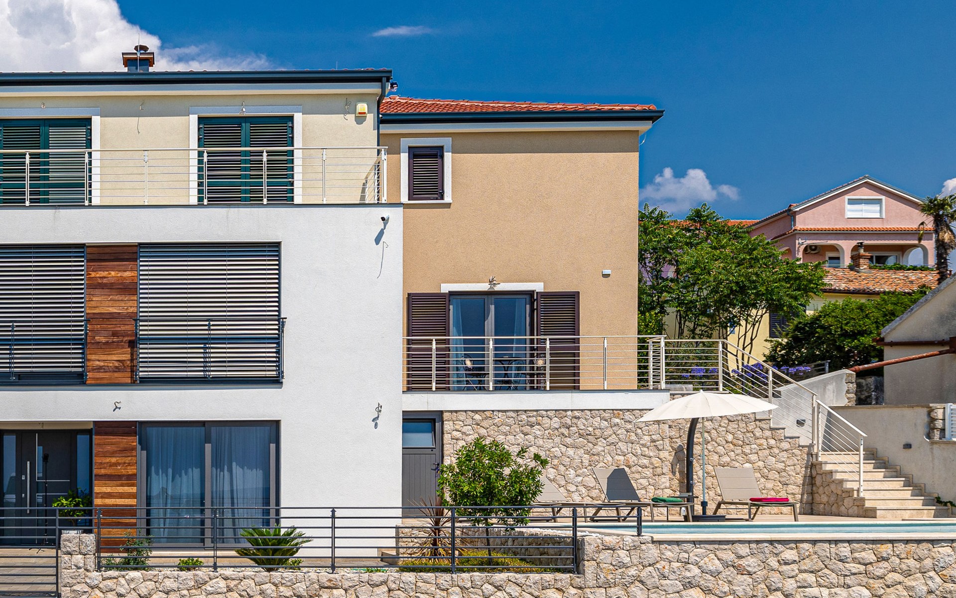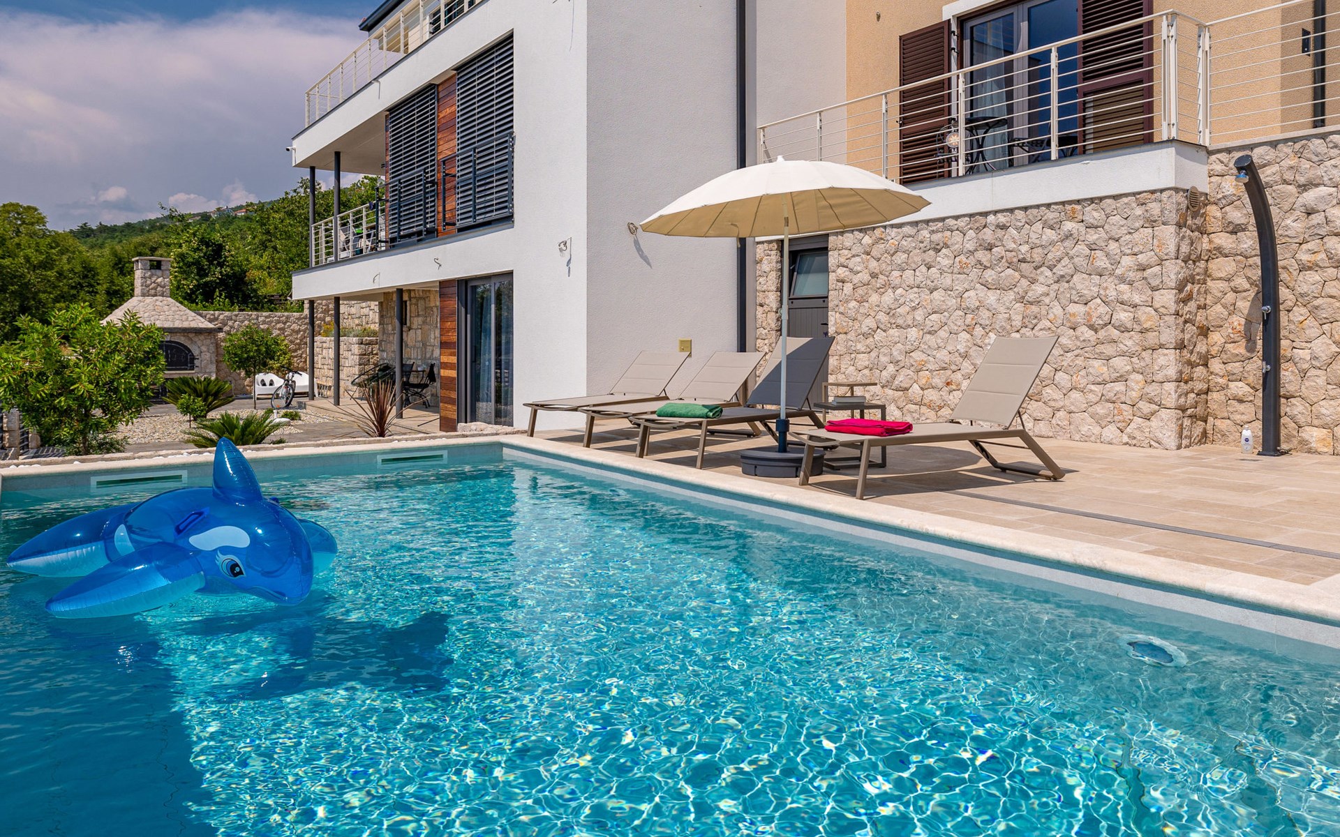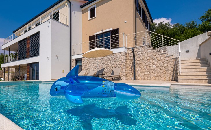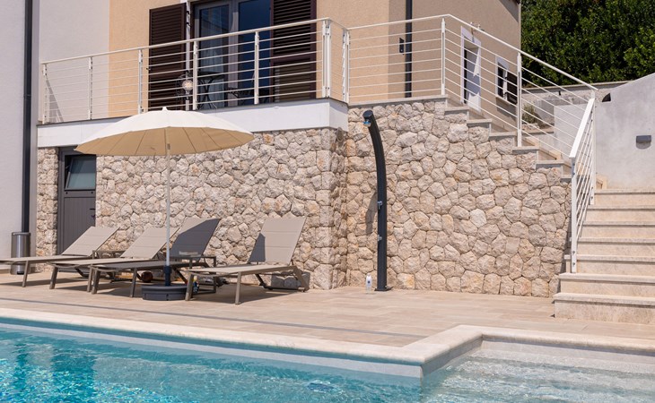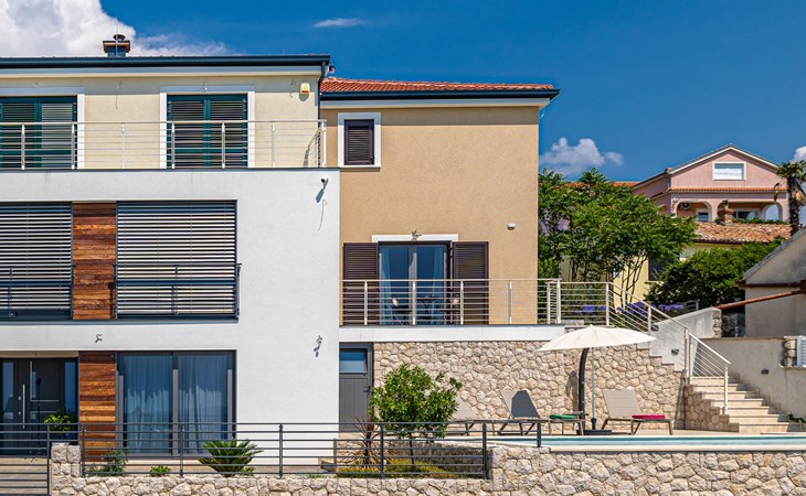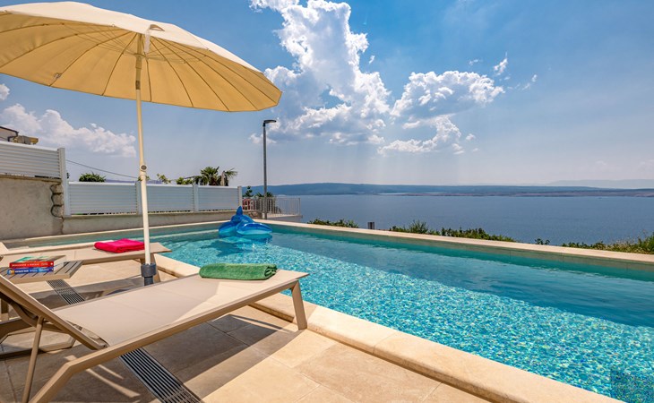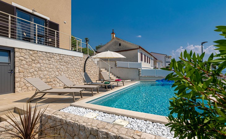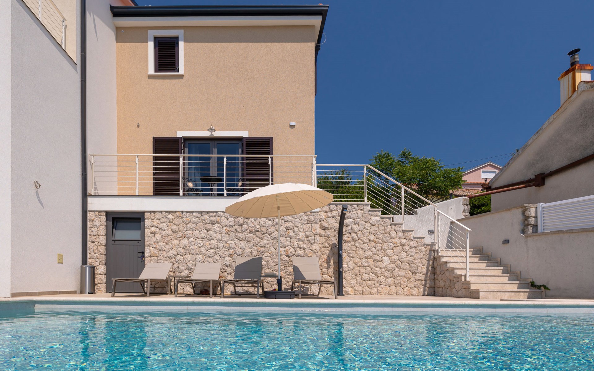 Dramalj 4 km from Crikvenica: Modern, comfortable semi-detached house "Marika", 2 storeys. 650 m from the centre of Dramalj, in a quiet, sunny position, 500 m from the sea, 500 m from the beach. Private: property 200 m2 (fenced), swimming pool angular (24 m2, depth 140 cm, seasonal availability: 01.May. - 31.Oct.) with internal staircase. Outdoor shower, pool maintenance by the owner/gardener. In the house: internet access, washing machine. Parking (for 3 cars) at the house on the premises. Shop 650 m, supermarket 2.2 km, restaurant 600 m, bus stop 1.3 km, pebble beach, concrete beach 500 m. The owner does not accept any youth groups.