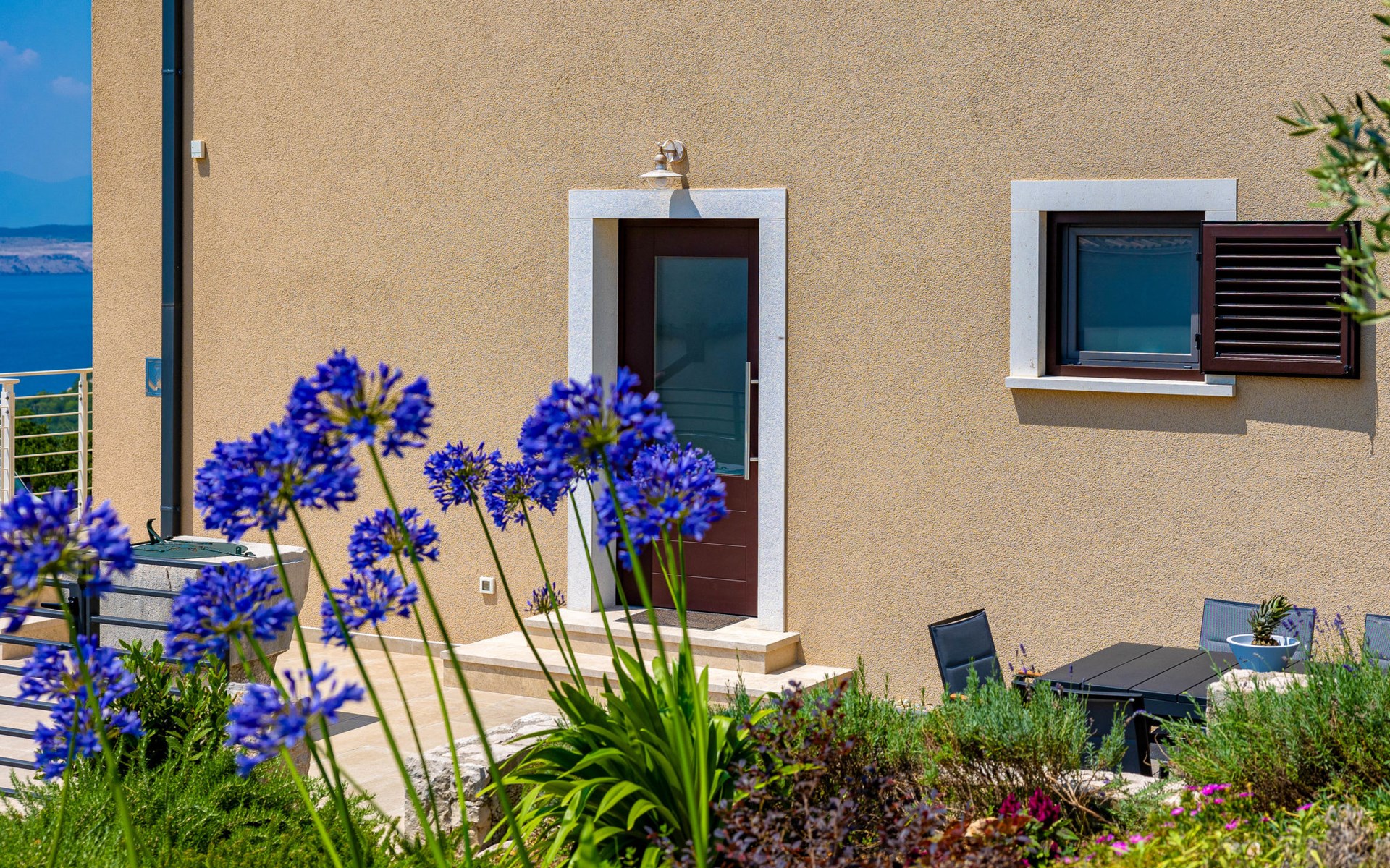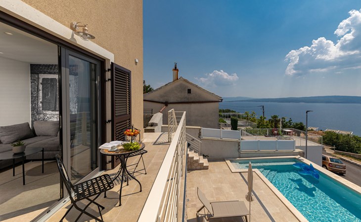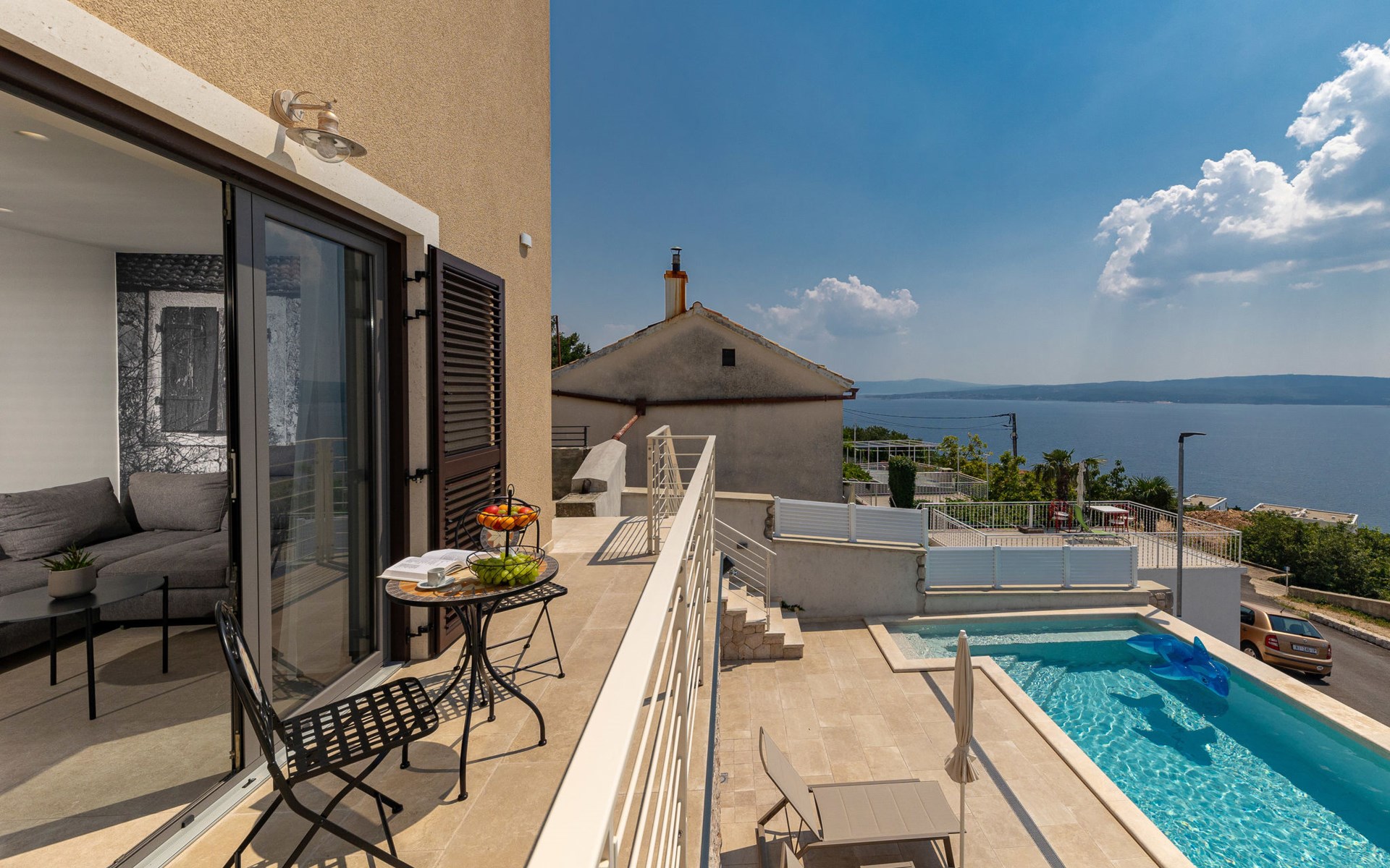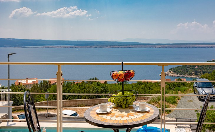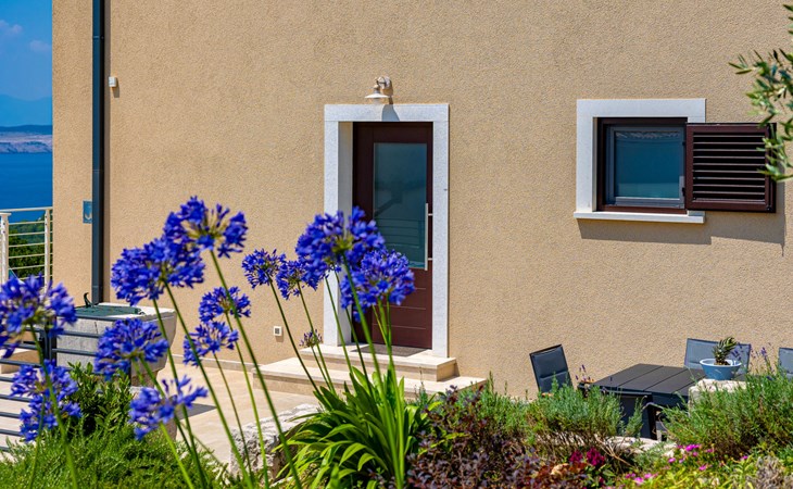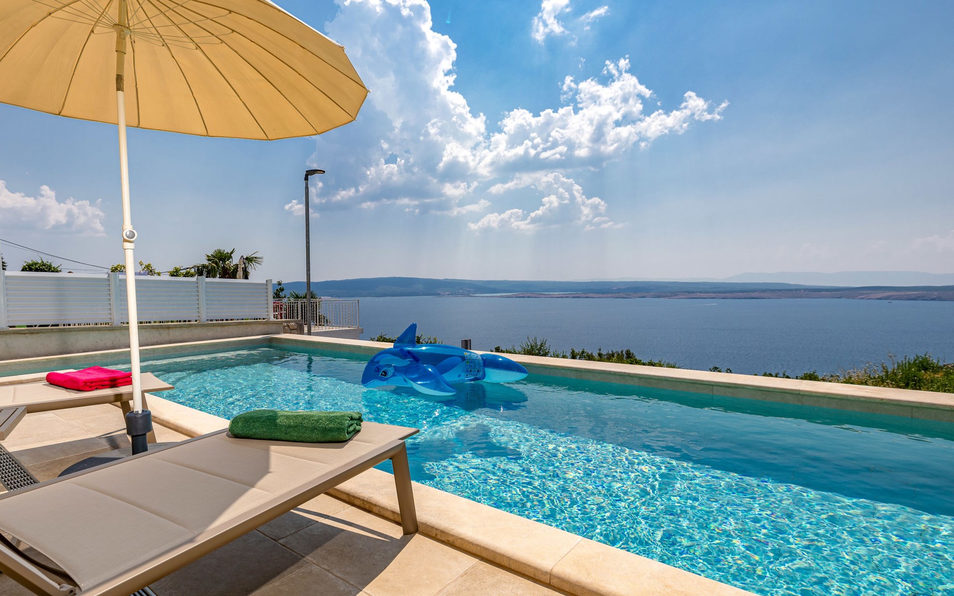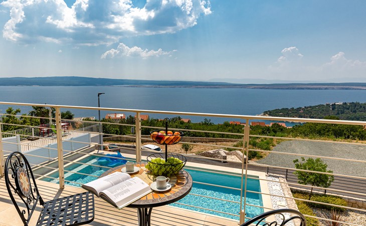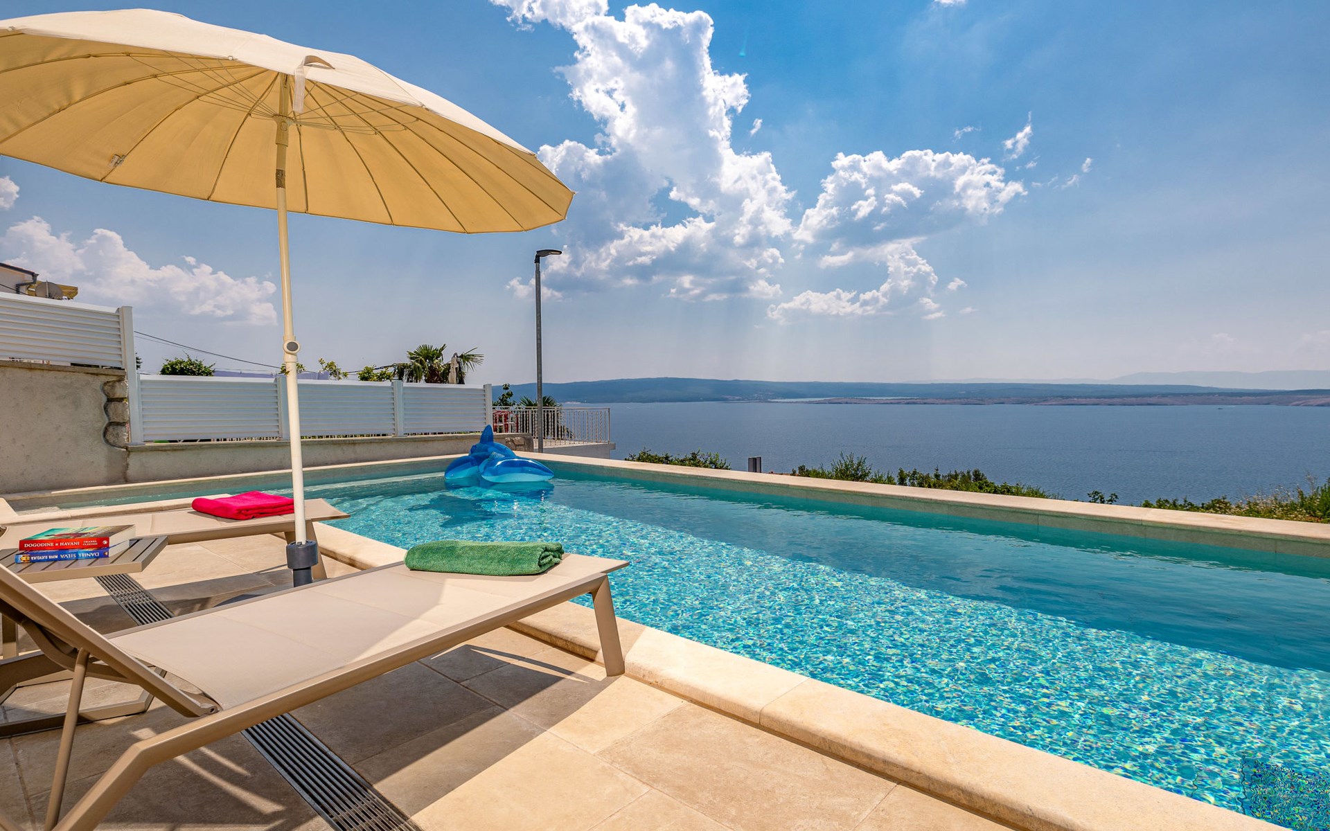 Dramalj 4 km from Crikvenica: Modern, comfortable semi-detached house "Marika", 2 storeys. 650 m from the centre of Dramalj, in a quiet, sunny position, 500 m from the sea, 500 m from the beach. Private: property 200 m2 (fenced), swimming pool angular (24 m2, depth 140 cm, seasonal availability: 01.May. - 31.Oct.) with internal staircase. Outdoor shower, pool maintenance by the owner/gardener. In the house: internet access, washing machine. Parking (for 3 cars) at the house on the premises. Shop 650 m, supermarket 2.2 km, restaurant 600 m, bus stop 1.3 km, pebble beach, concrete beach 500 m. The owner does not accept any youth groups.