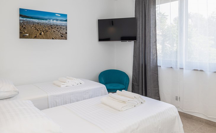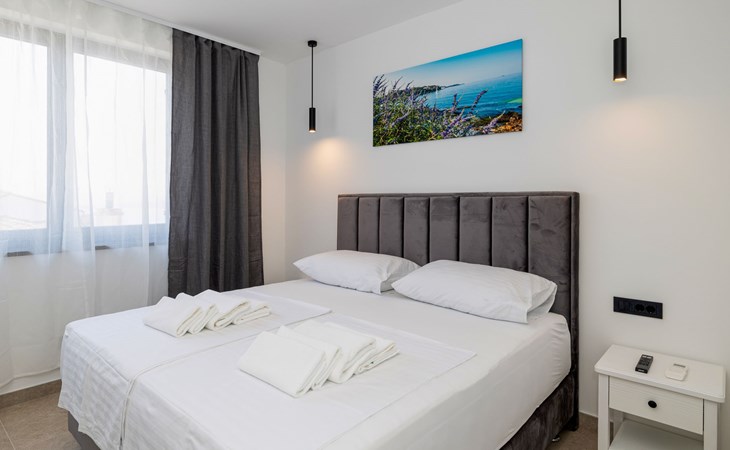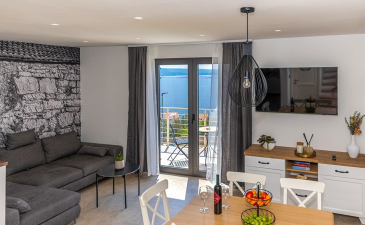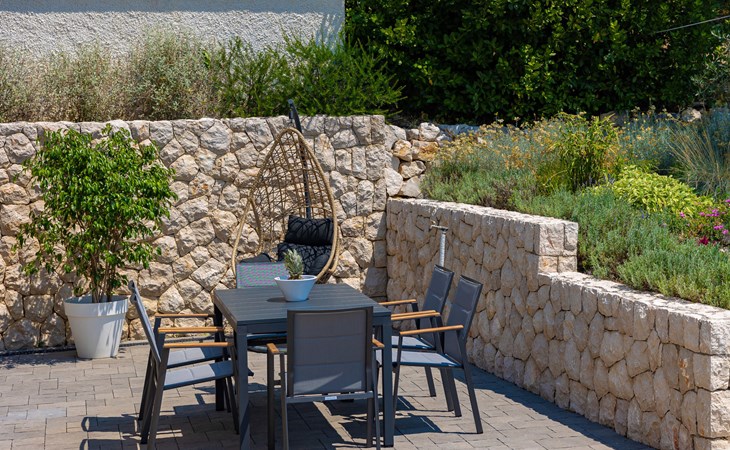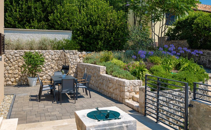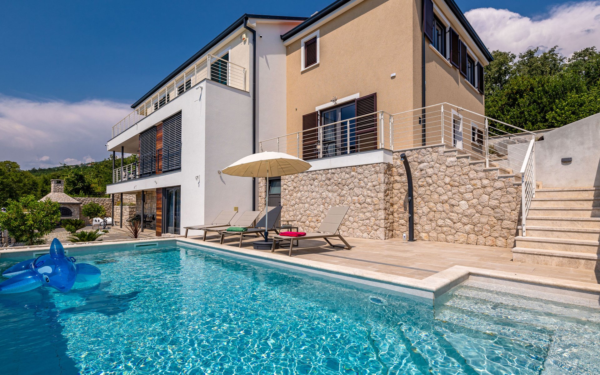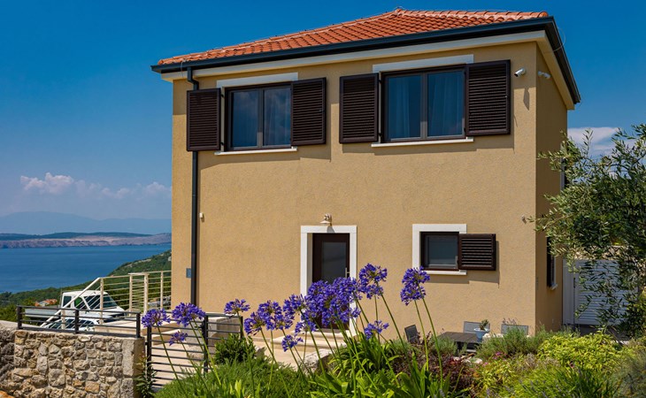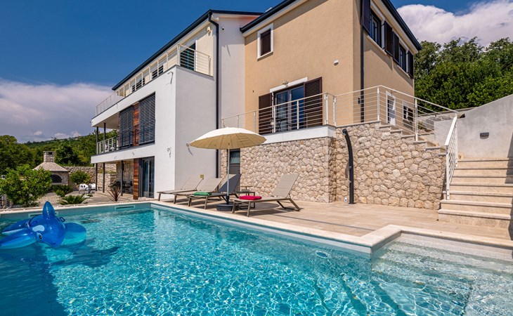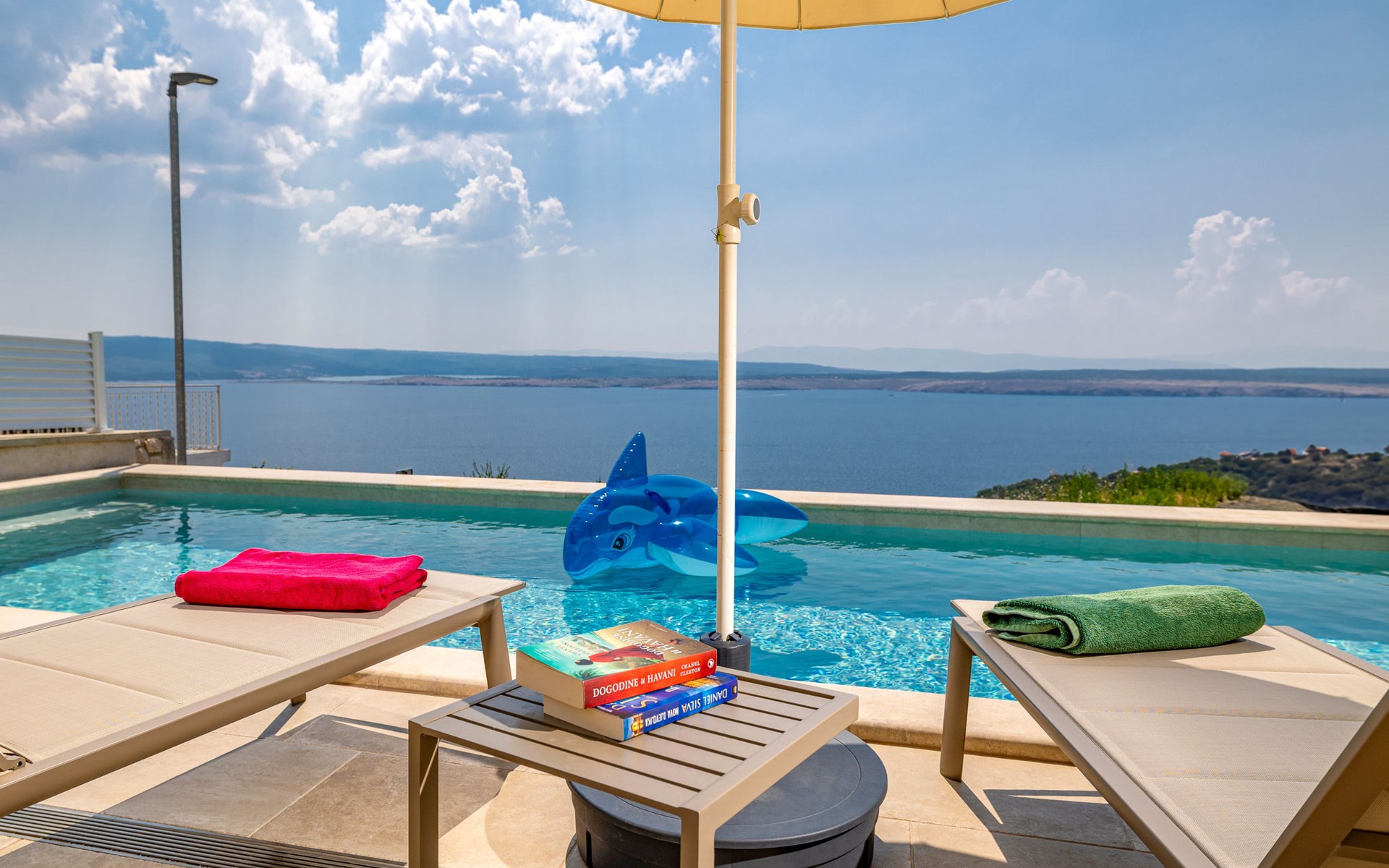 Dramalj 4 km from Crikvenica: Modern, comfortable semi-detached house "Marika", 2 storeys. 650 m from the centre of Dramalj, in a quiet, sunny position, 500 m from the sea, 500 m from the beach. Private: property 200 m2 (fenced), swimming pool angular (24 m2, depth 140 cm, seasonal availability: 01.May. - 31.Oct.) with internal staircase. Outdoor shower, pool maintenance by the owner/gardener. In the house: internet access, washing machine. Parking (for 3 cars) at the house on the premises. Shop 650 m, supermarket 2.2 km, restaurant 600 m, bus stop 1.3 km, pebble beach, concrete beach 500 m. The owner does not accept any youth groups.